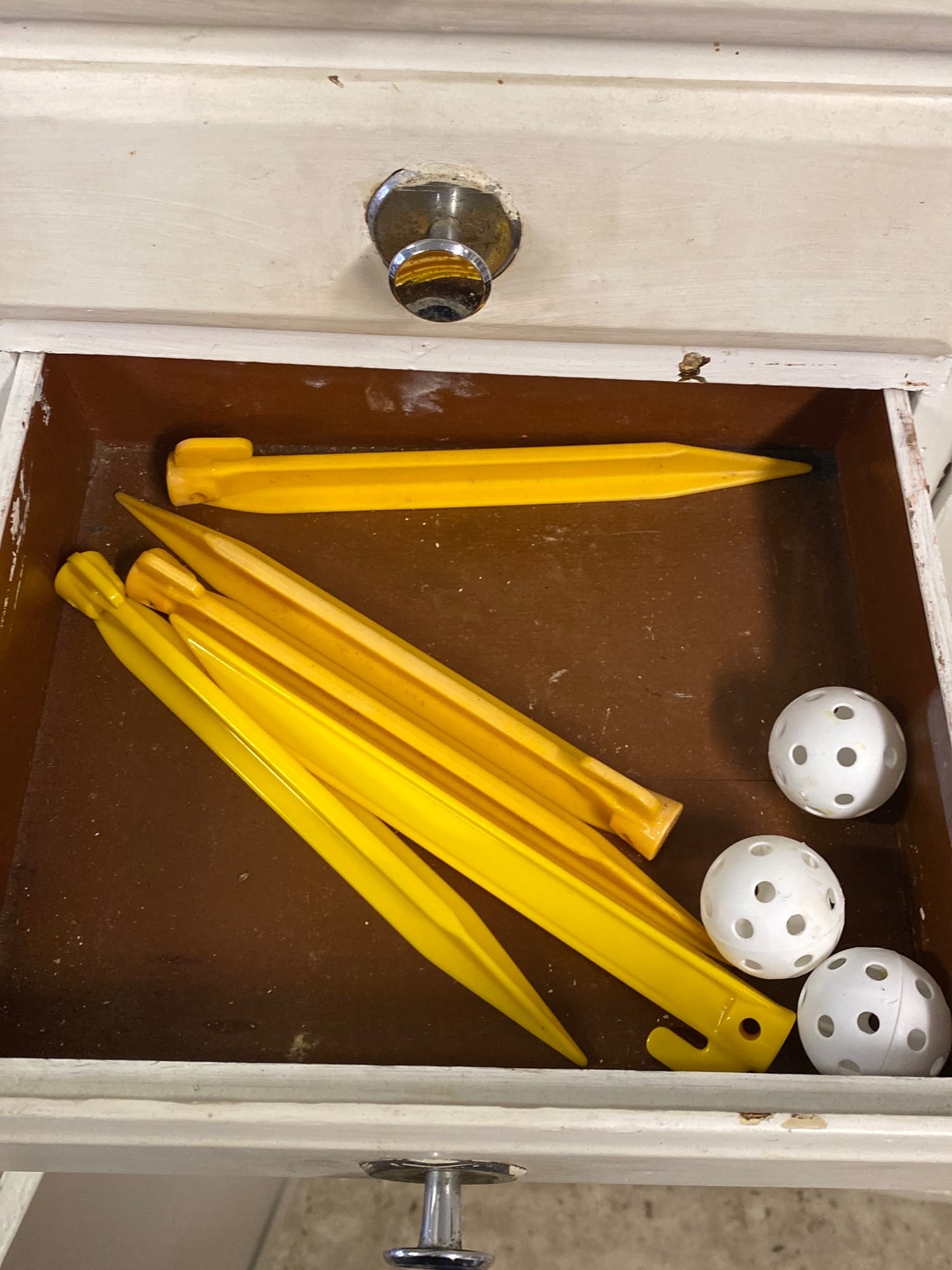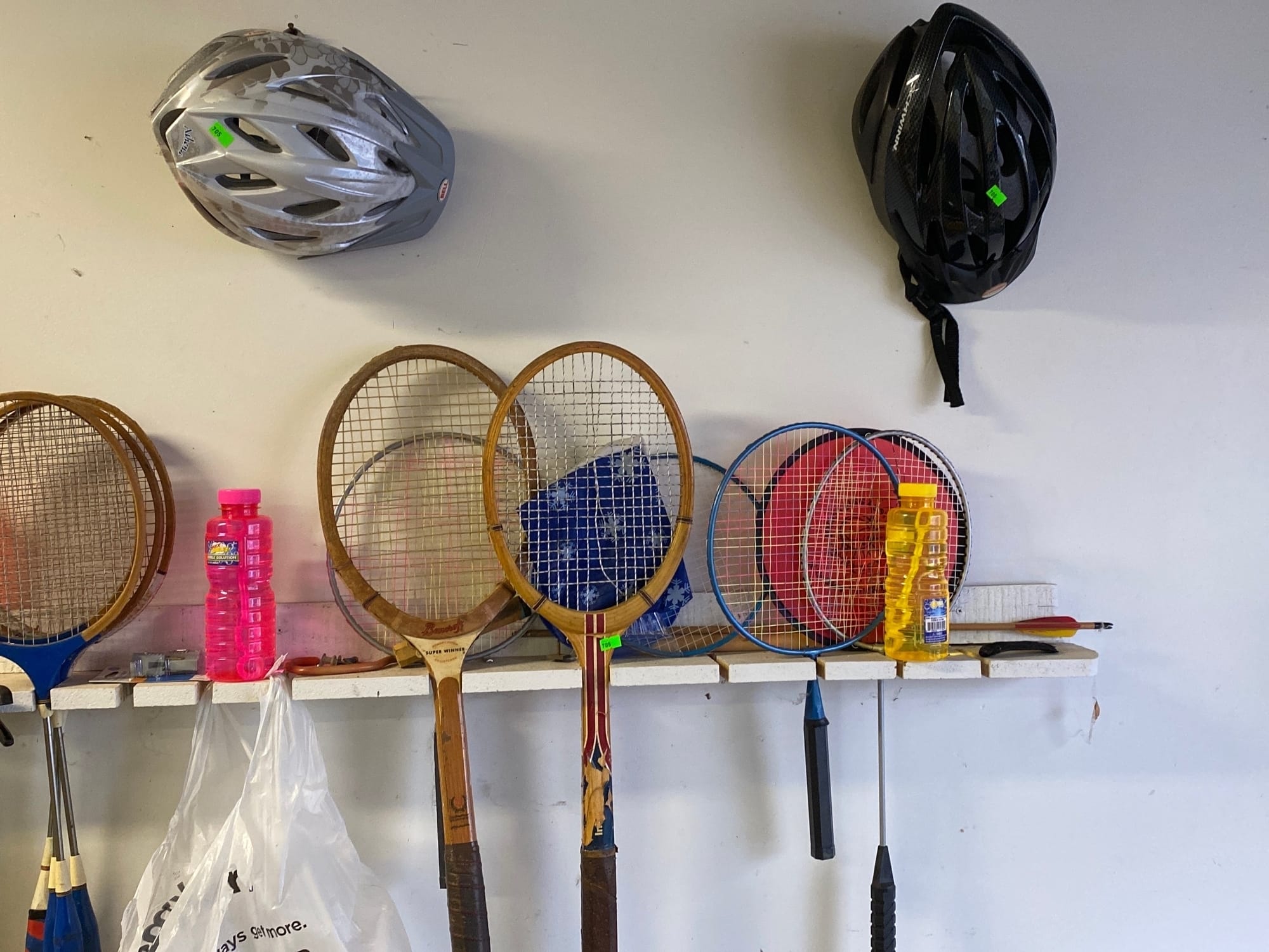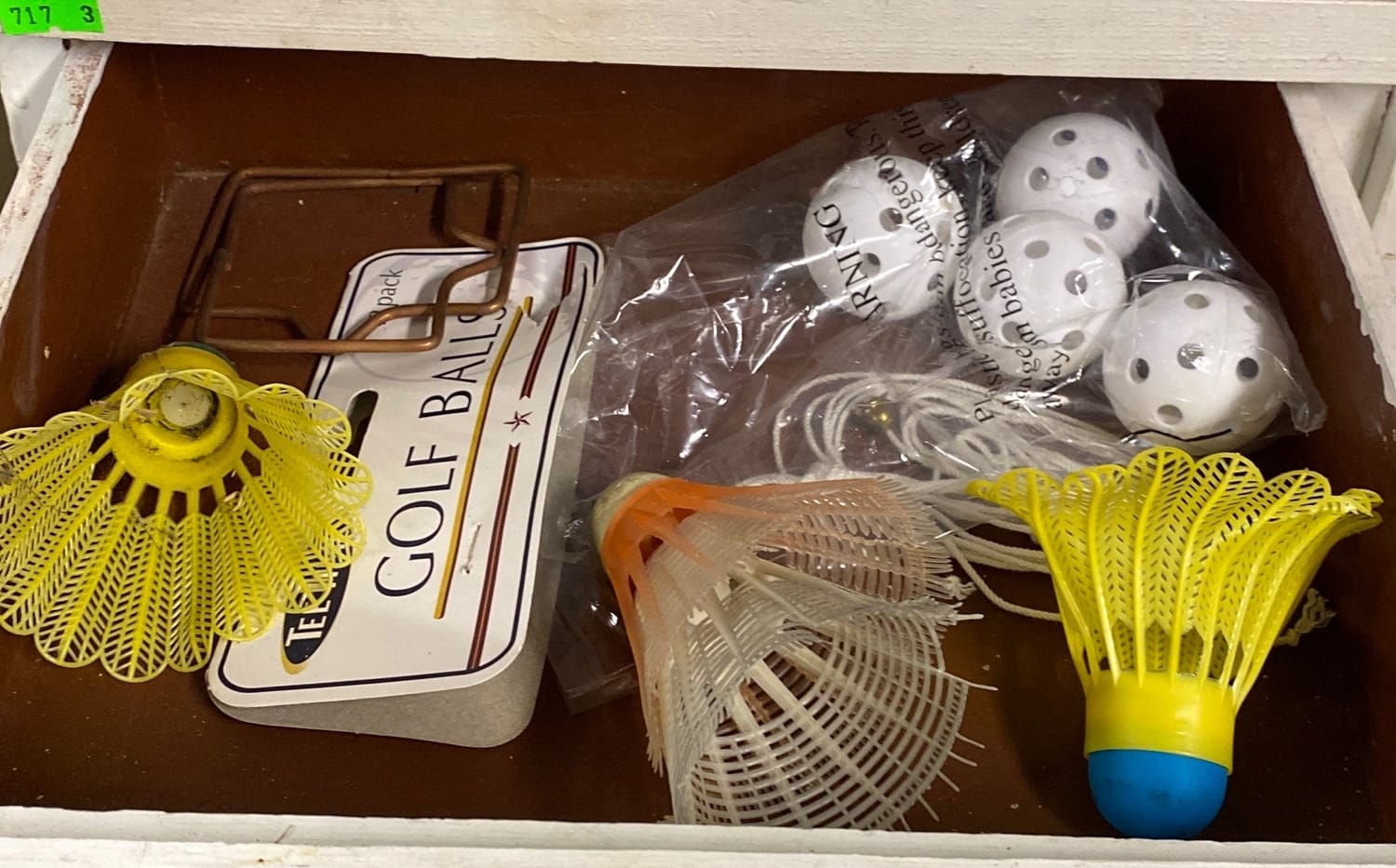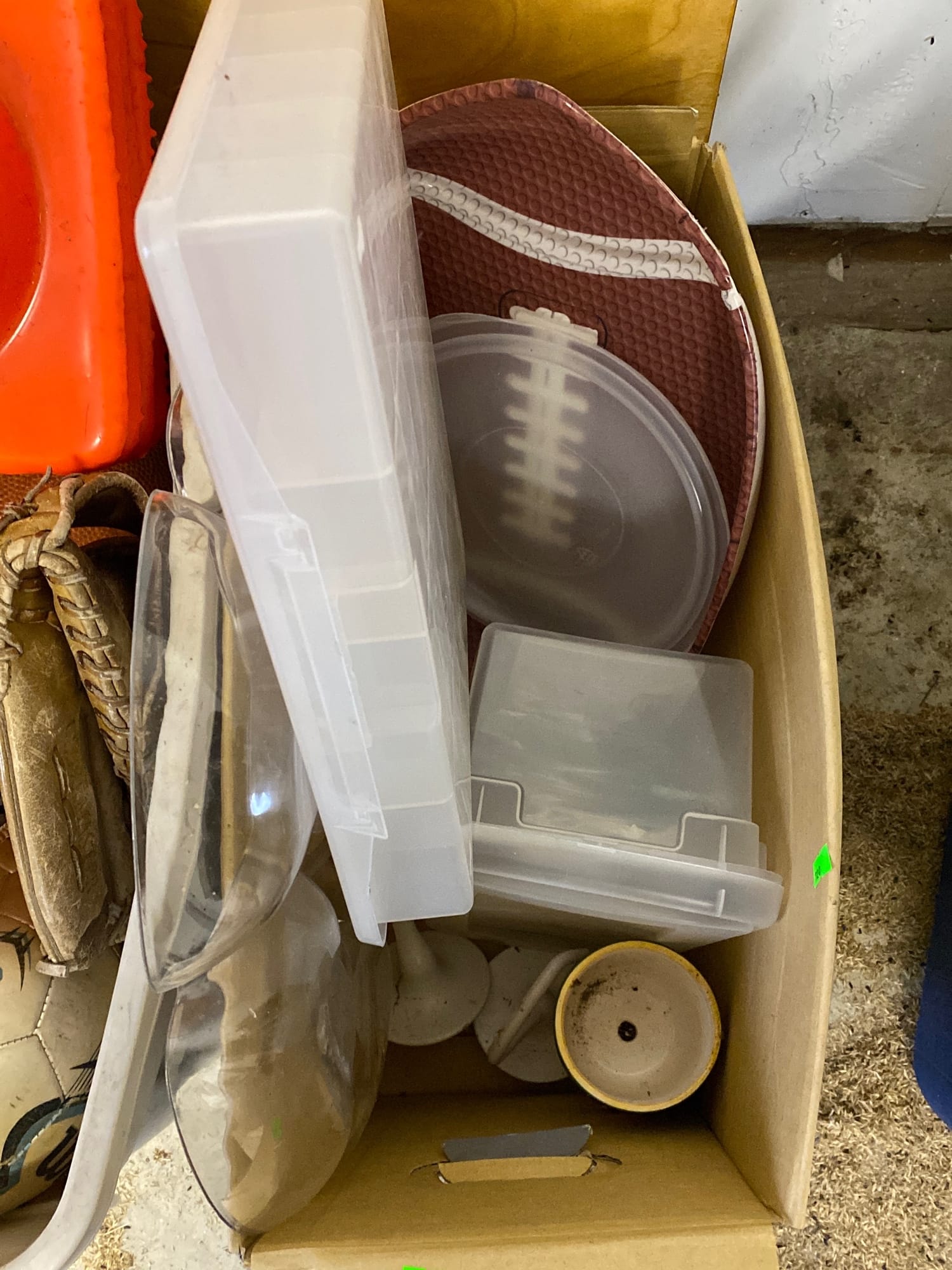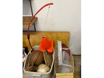 720 Sports equipment, bow, cones, plastic containers, misc.