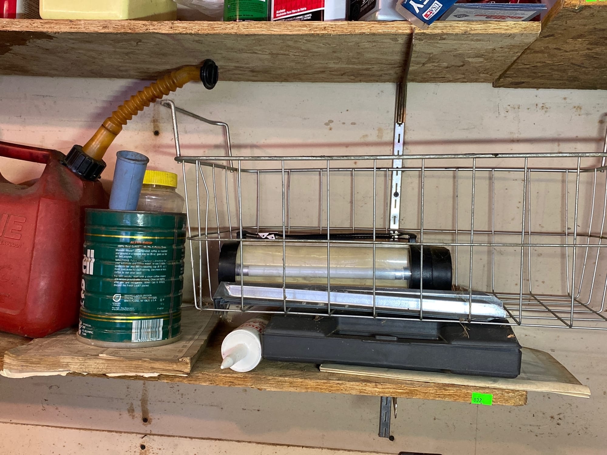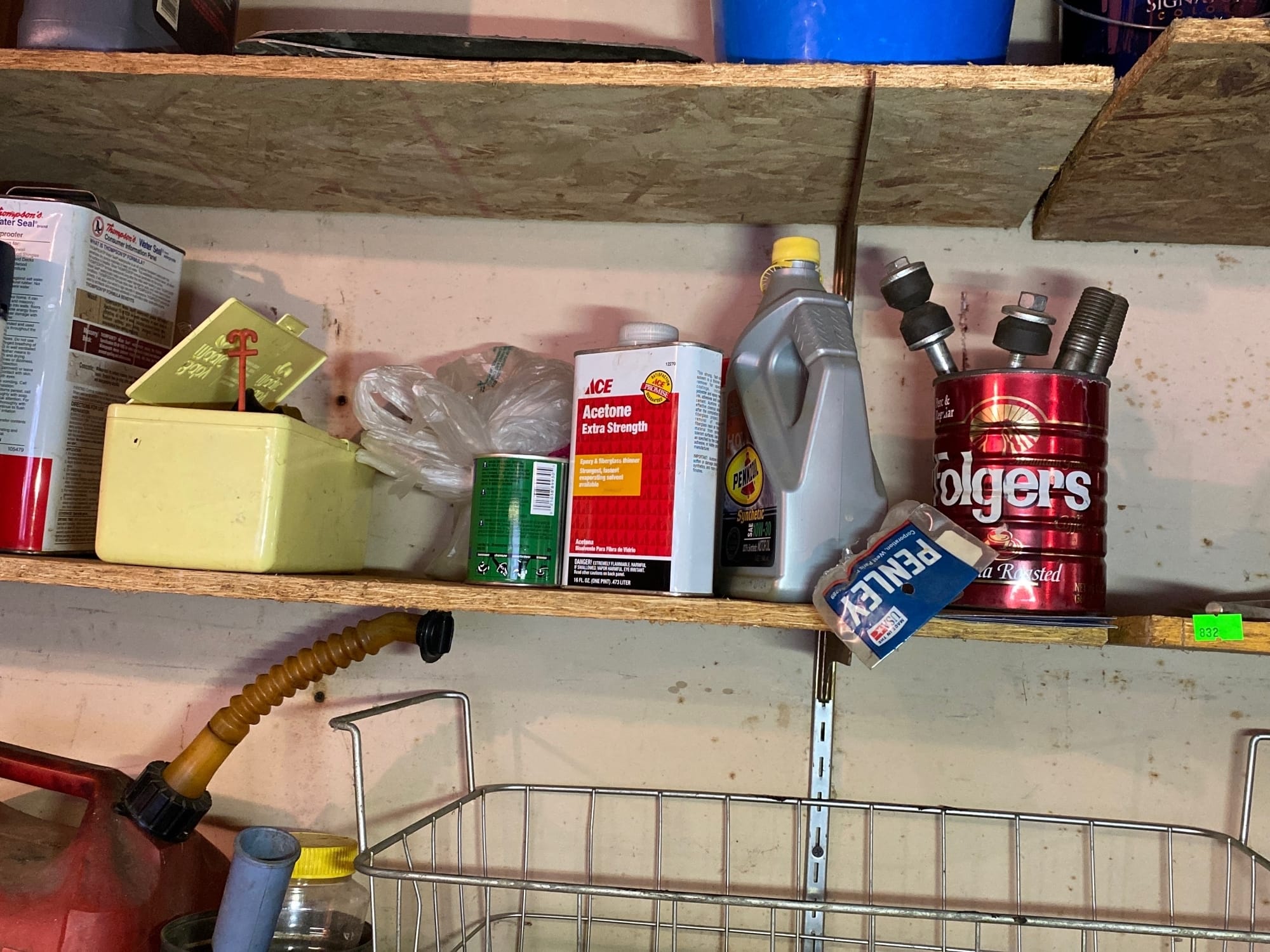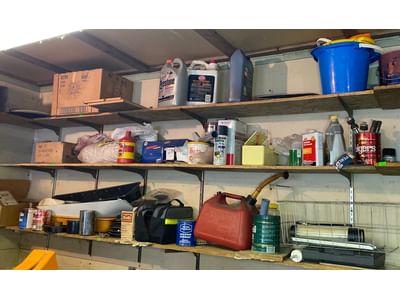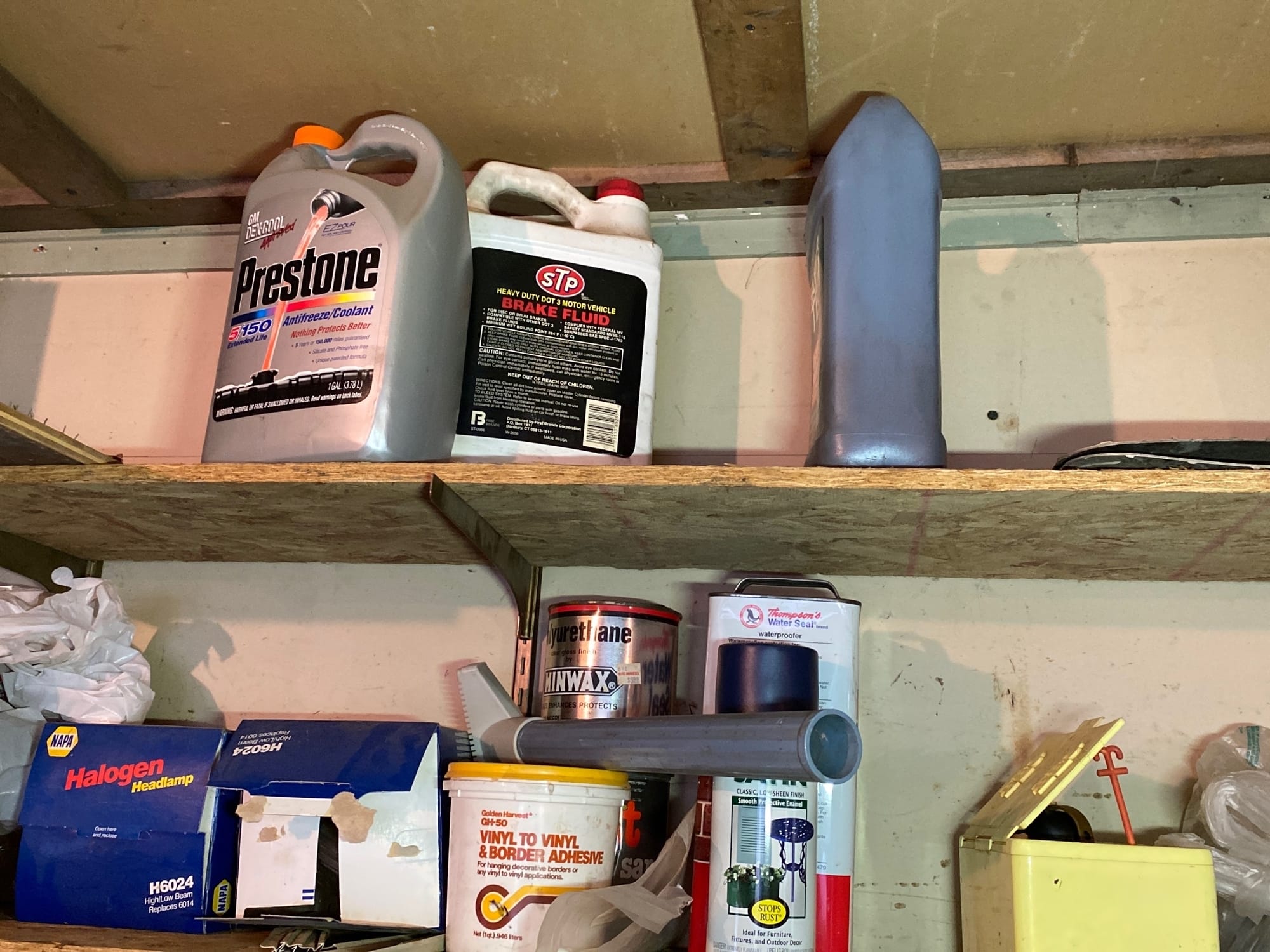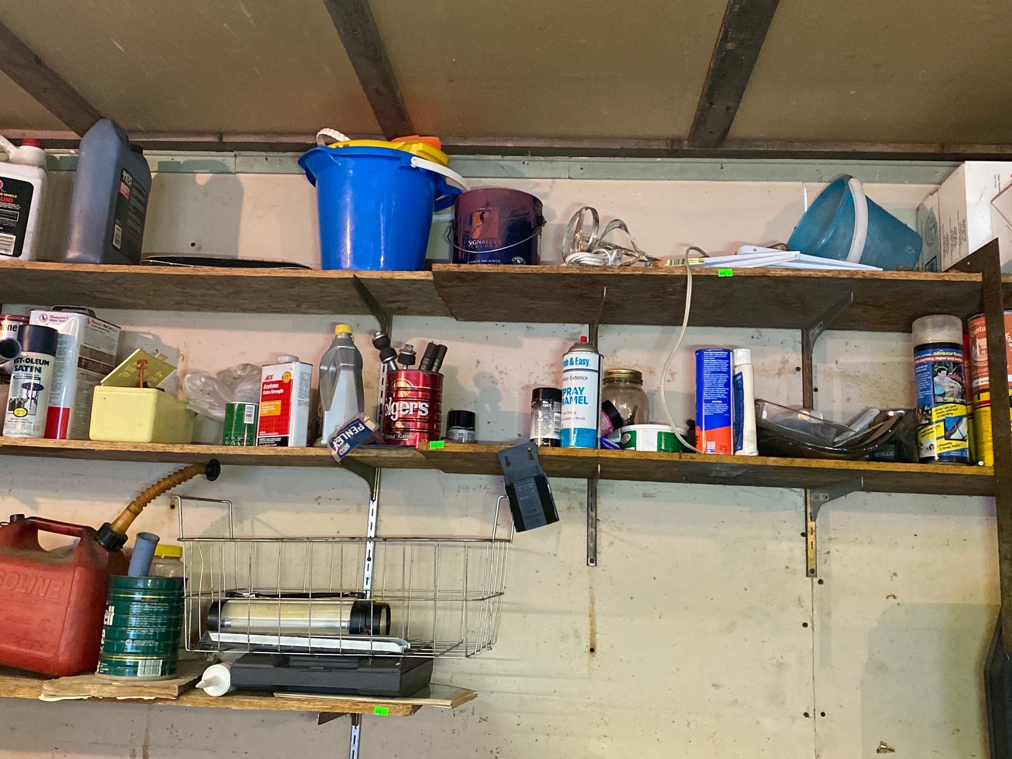 832 Automotive and household chemicals, misc car parts, plastic buckets, gas can, organizers, misc. contents of shelves as shown in pictures