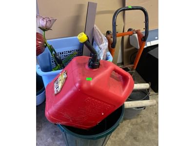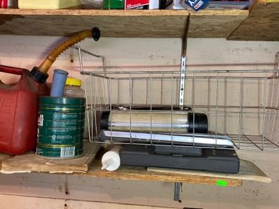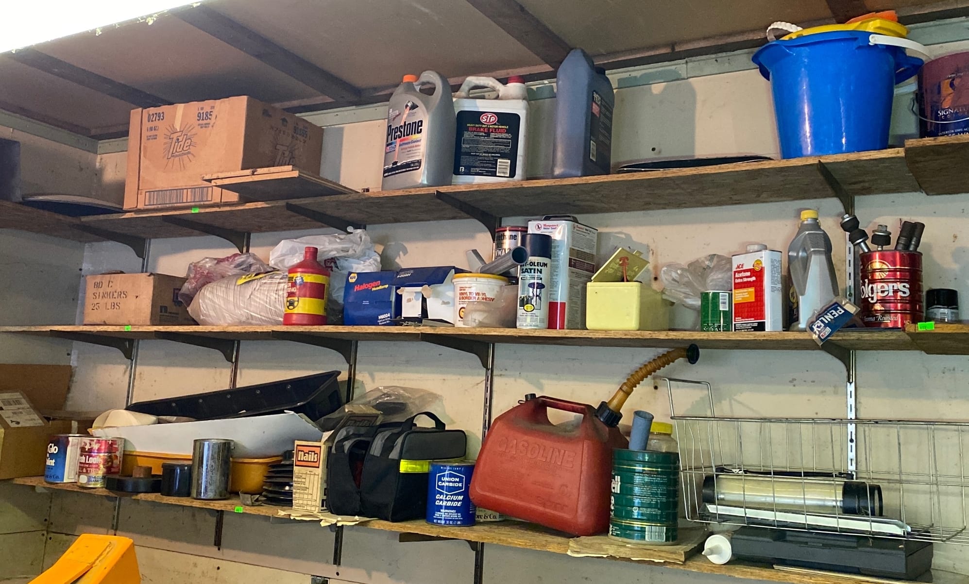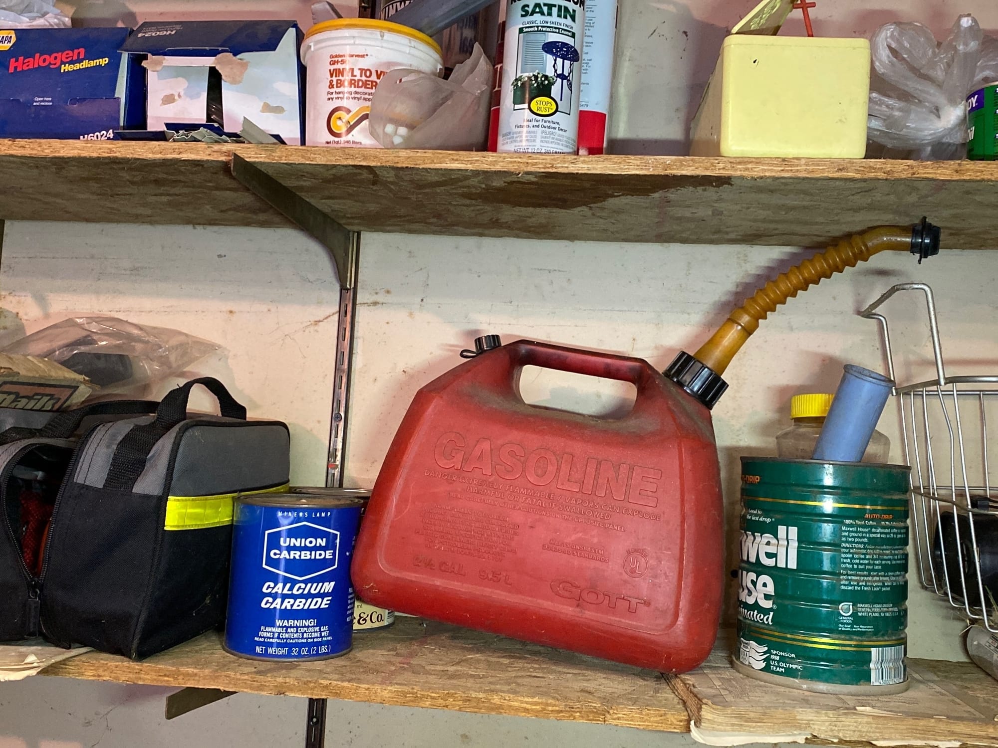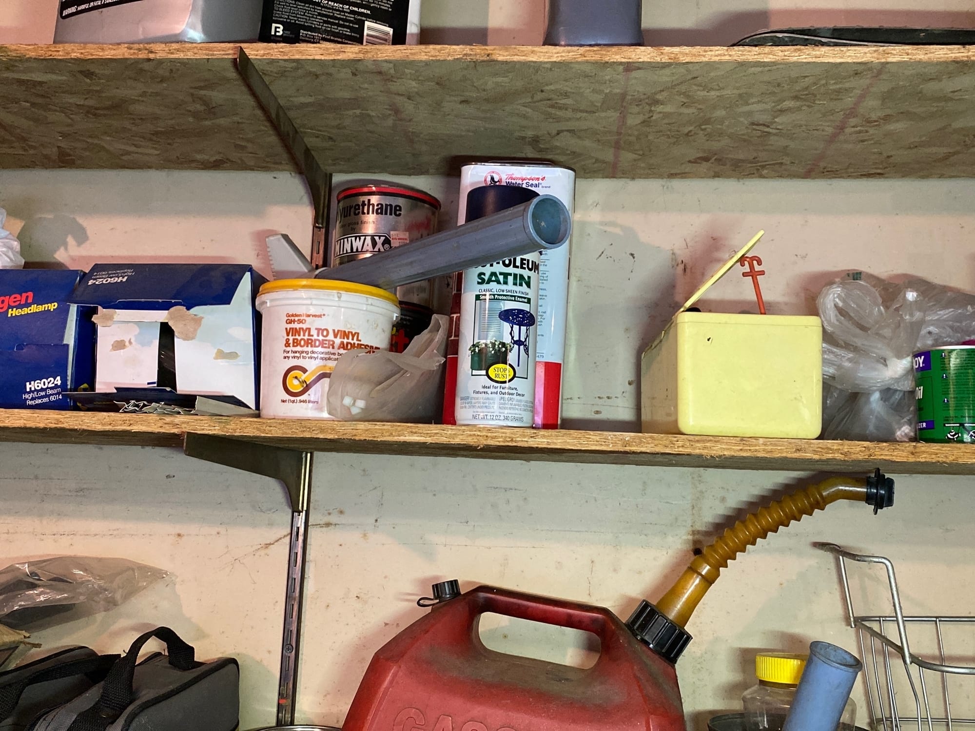 832 Automotive and household chemicals, misc car parts, plastic buckets, gas can, organizers, misc. contents of shelves as shown in pictures