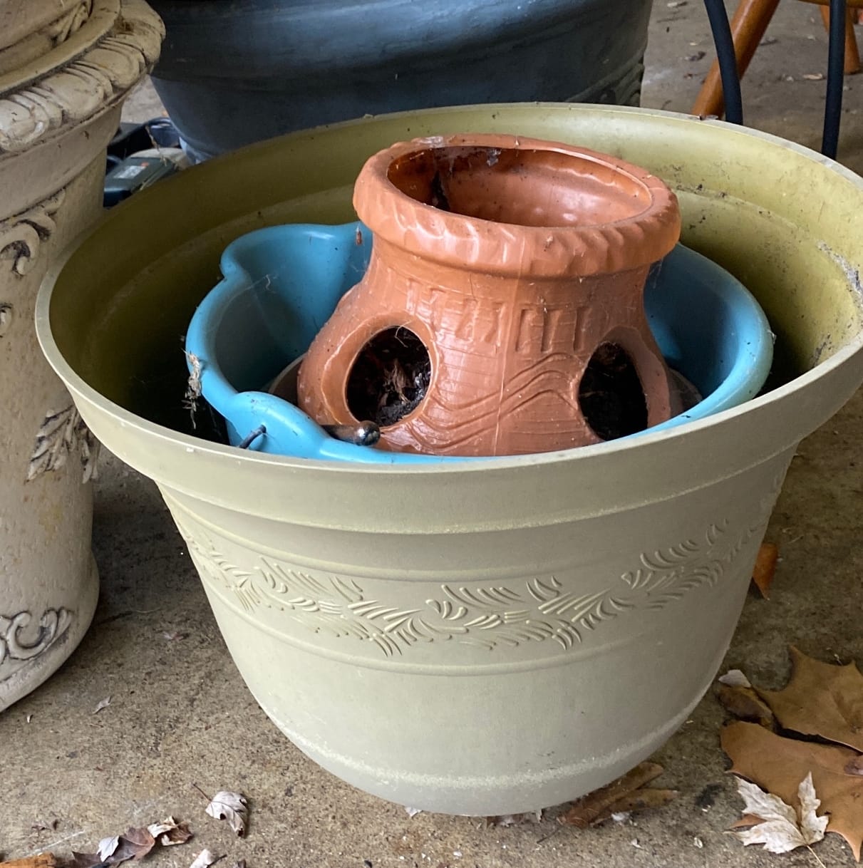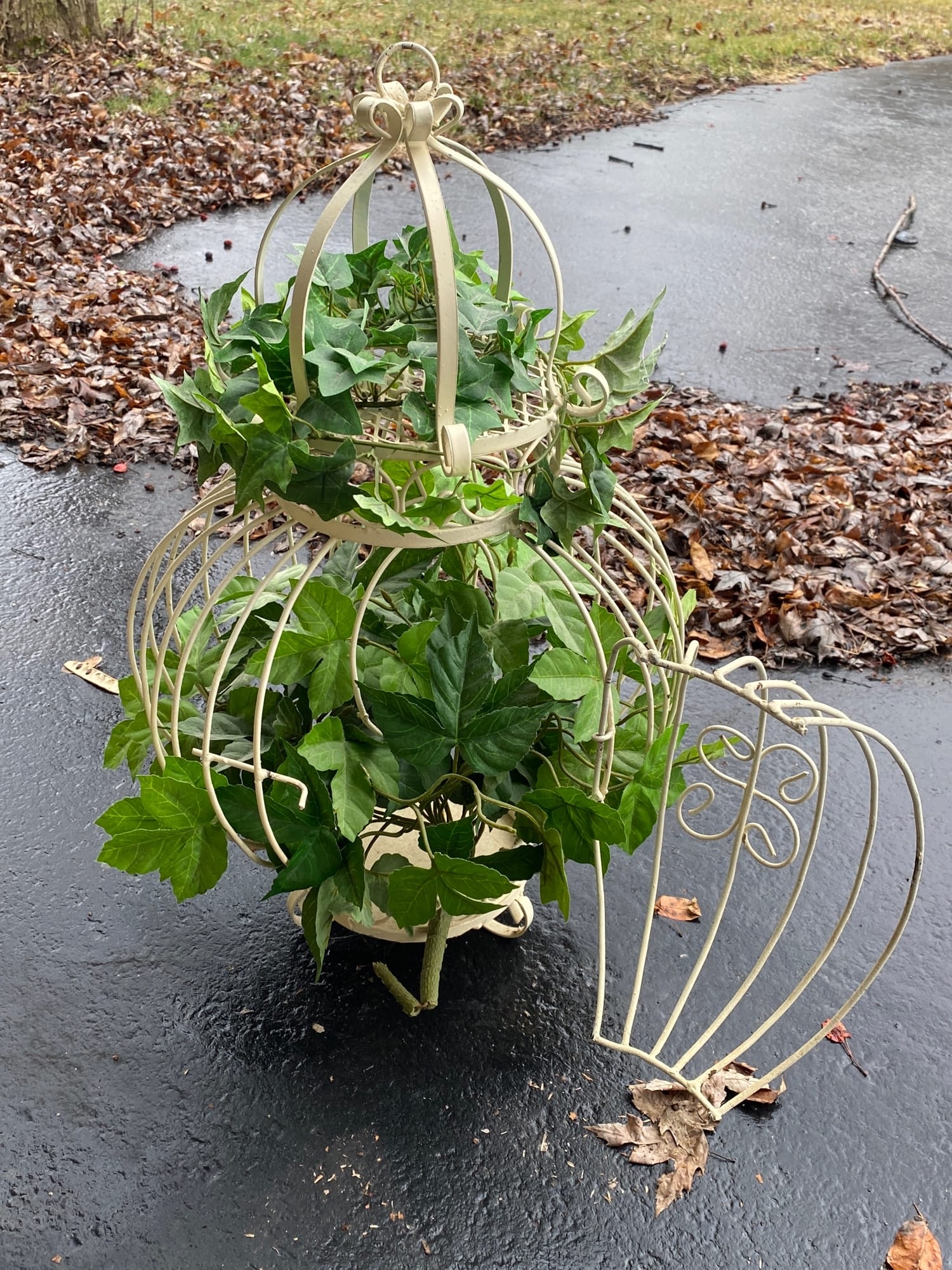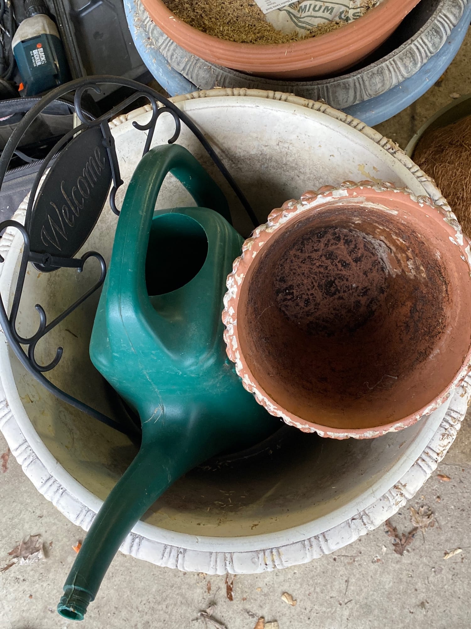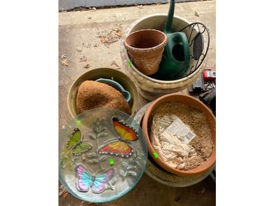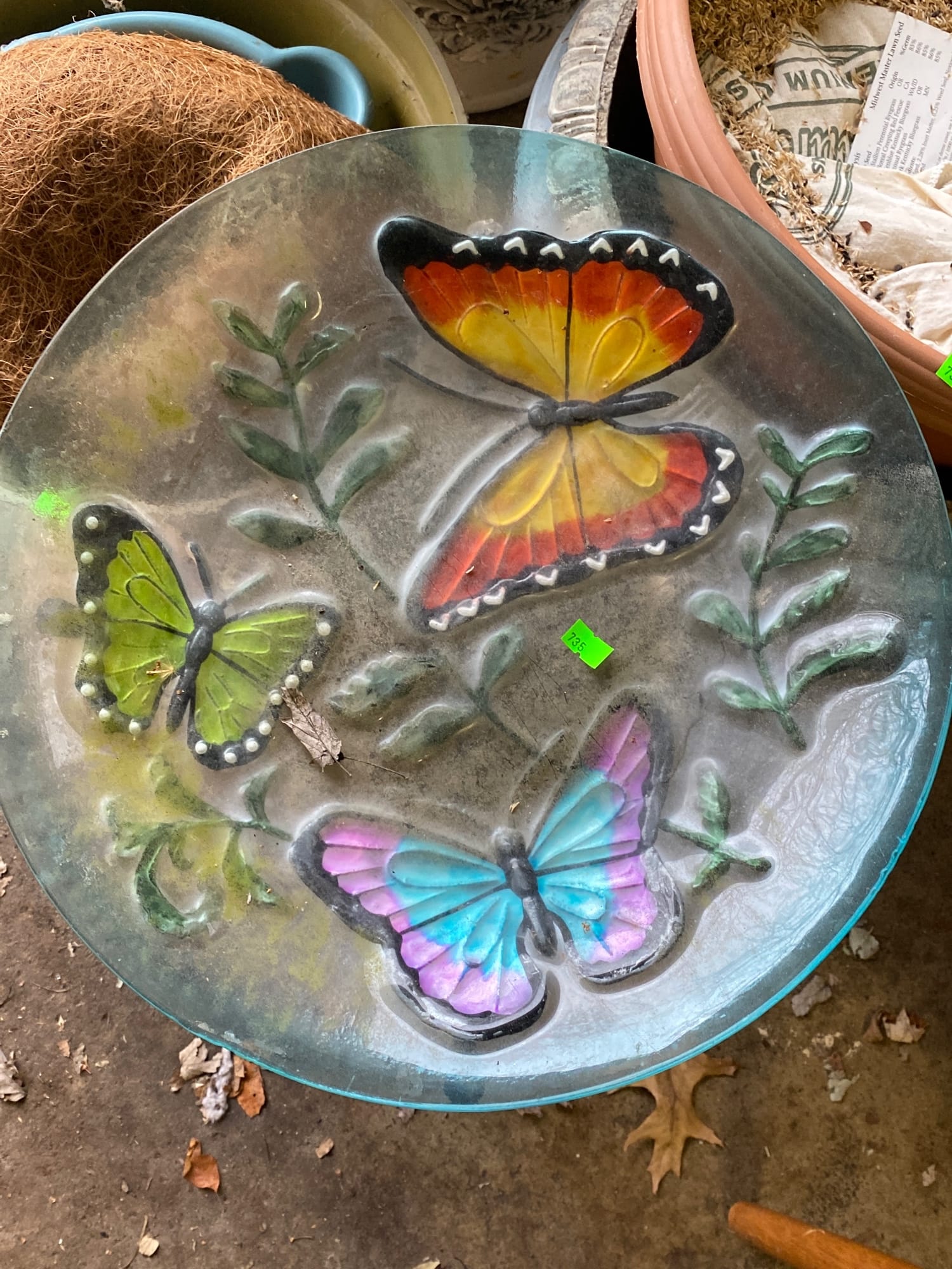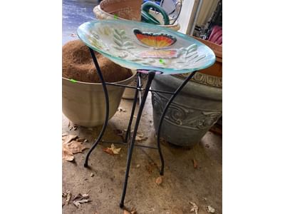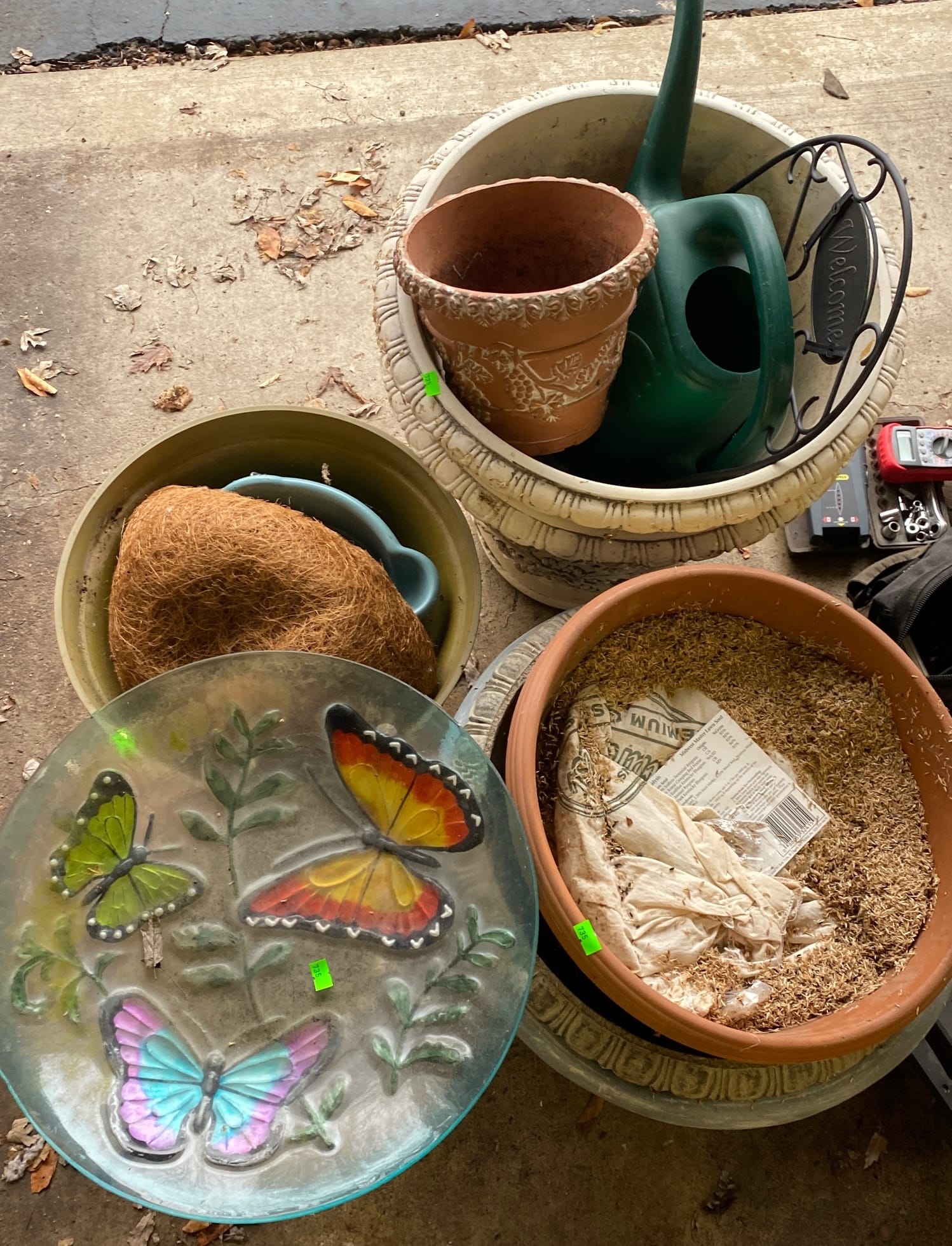 735 Glass birdbath with stand 15x21, plastic planter assortment, watering can, garden decor, misc.