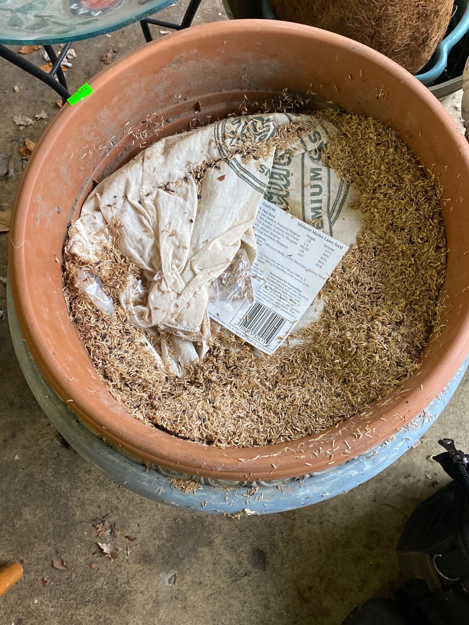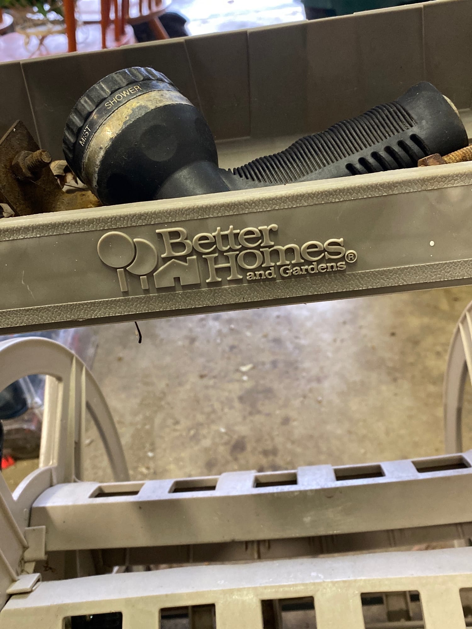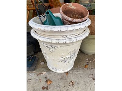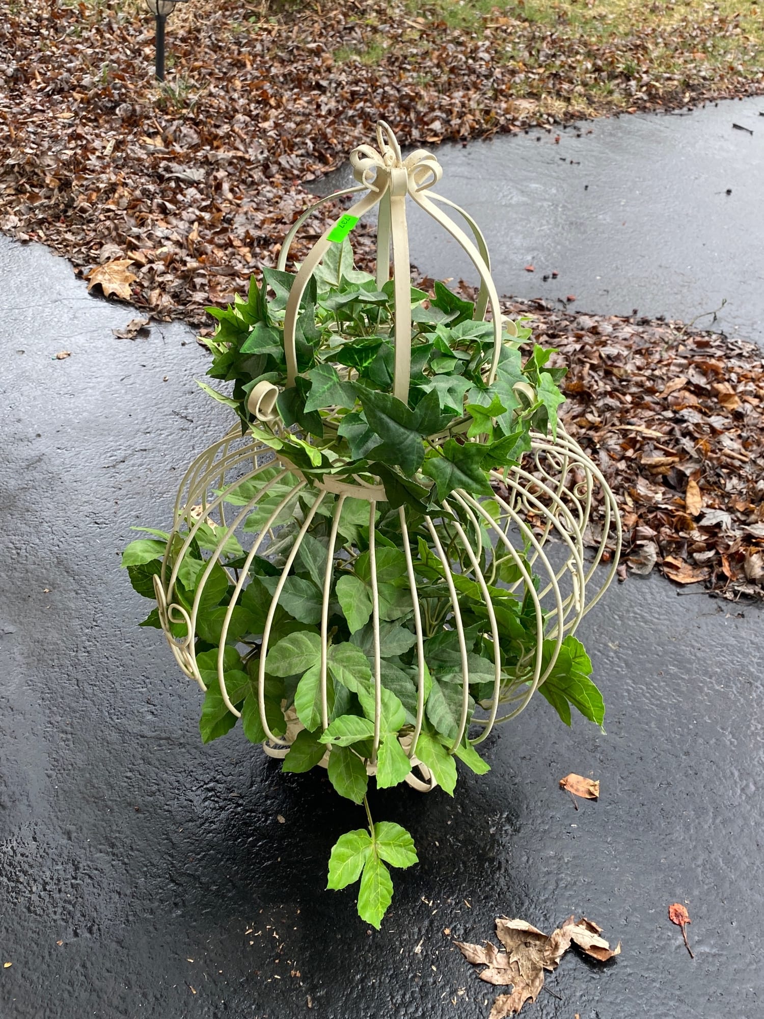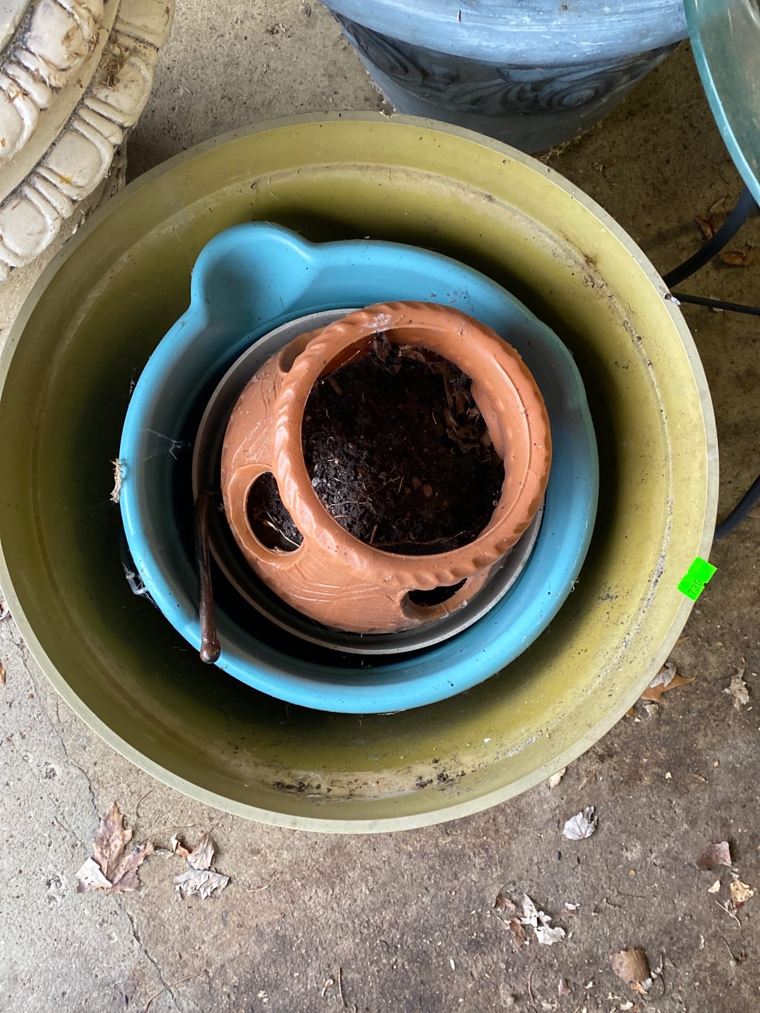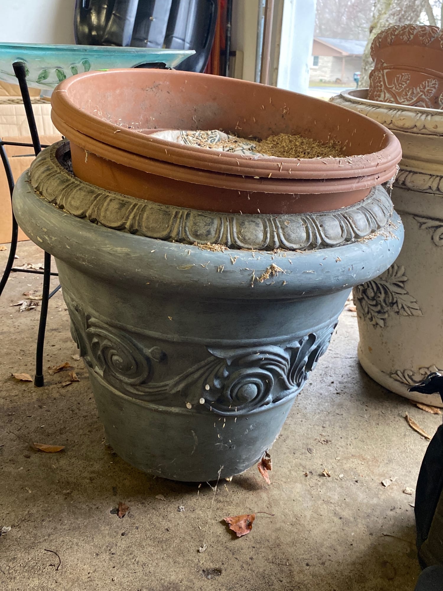 735 Glass birdbath with stand 15x21, plastic planter assortment, watering can, garden decor, misc.