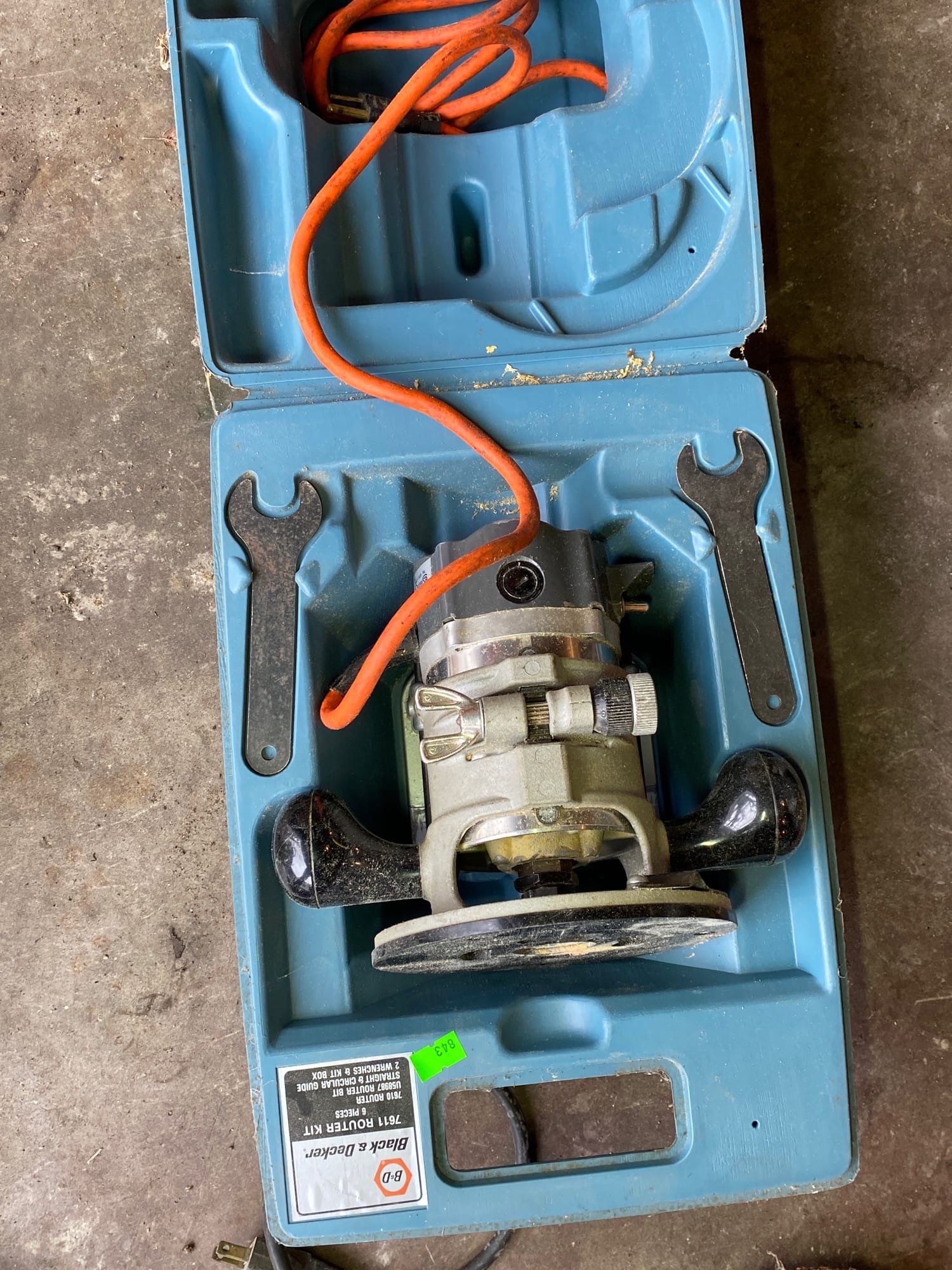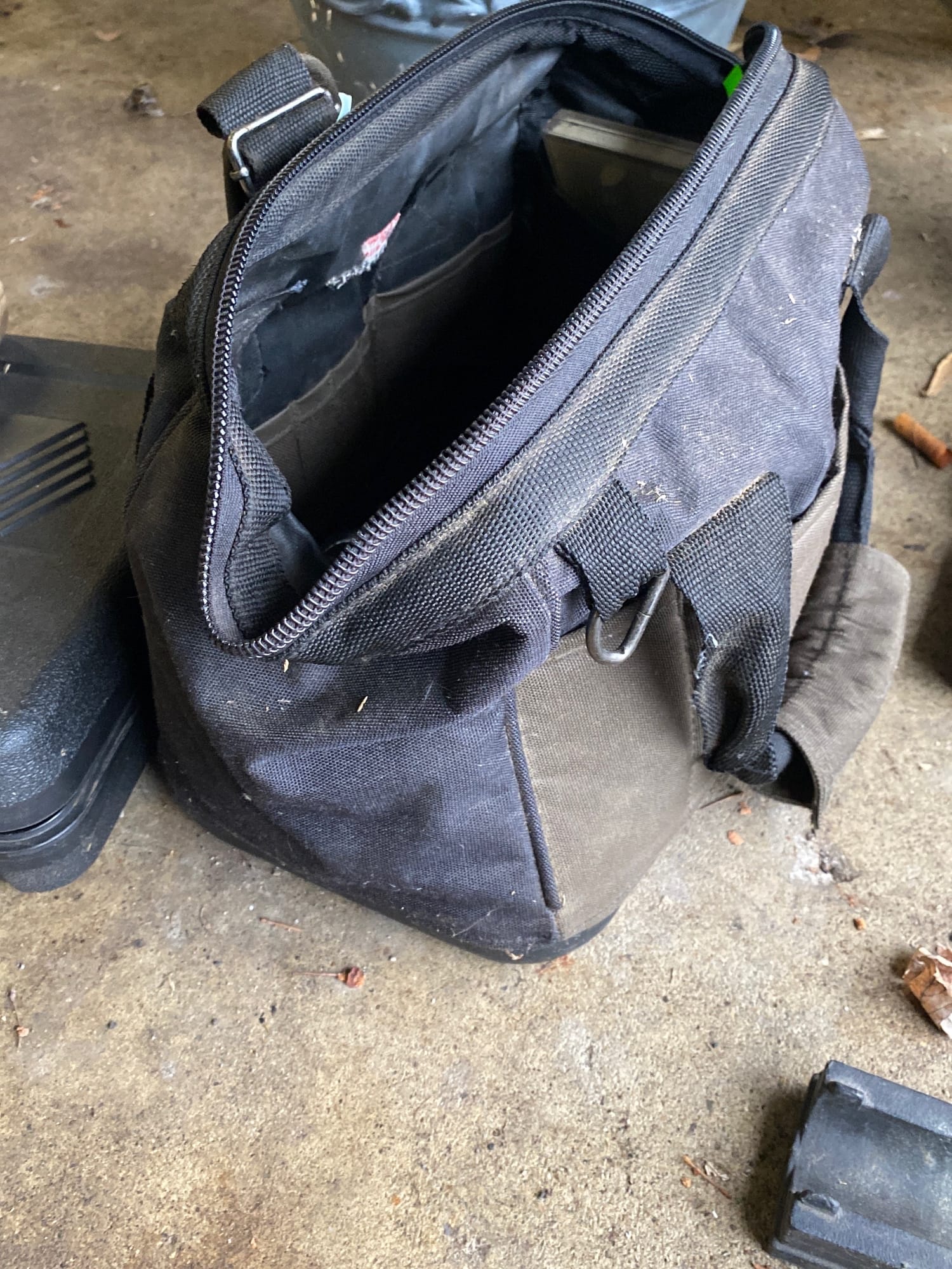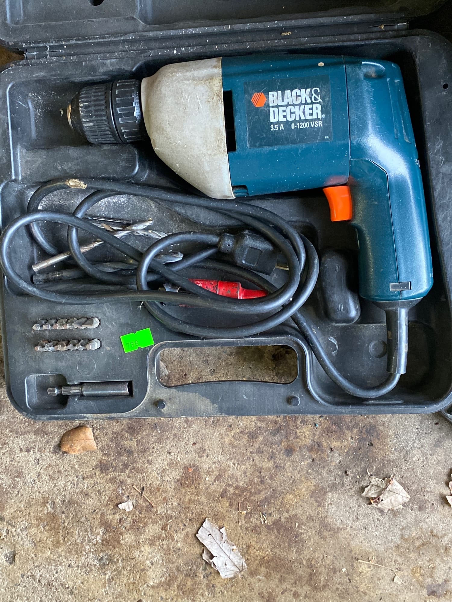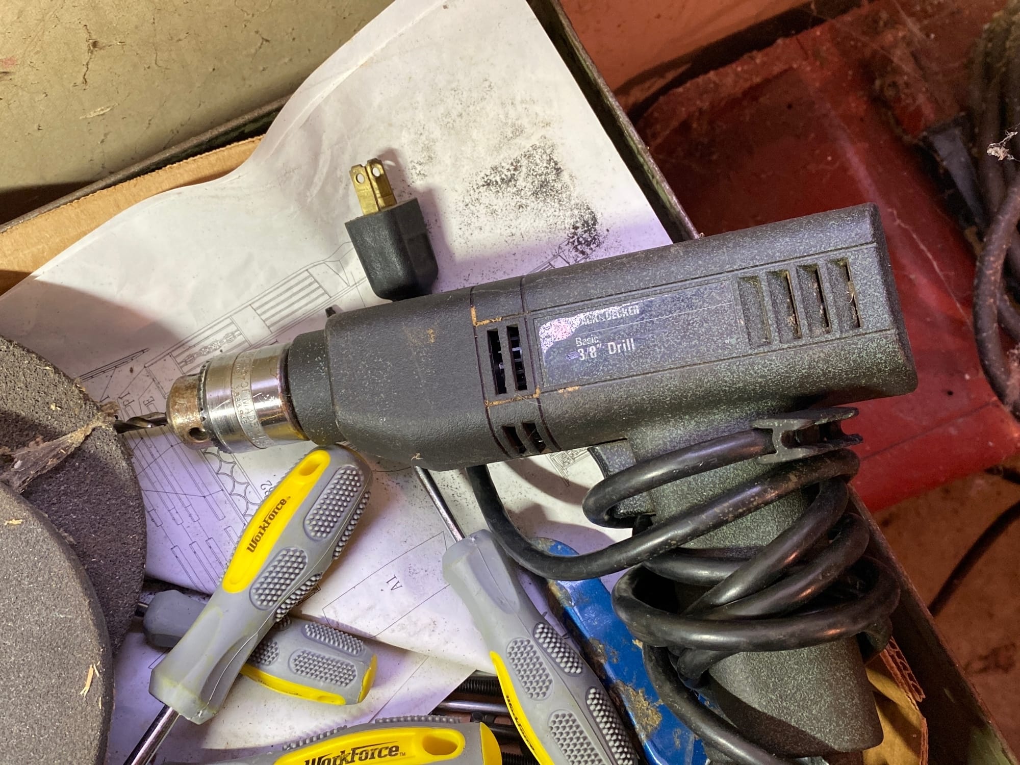 736 Black & decker drill, tool bag with misc. tools, Craftsman tester, driver, assorted tools and brushes