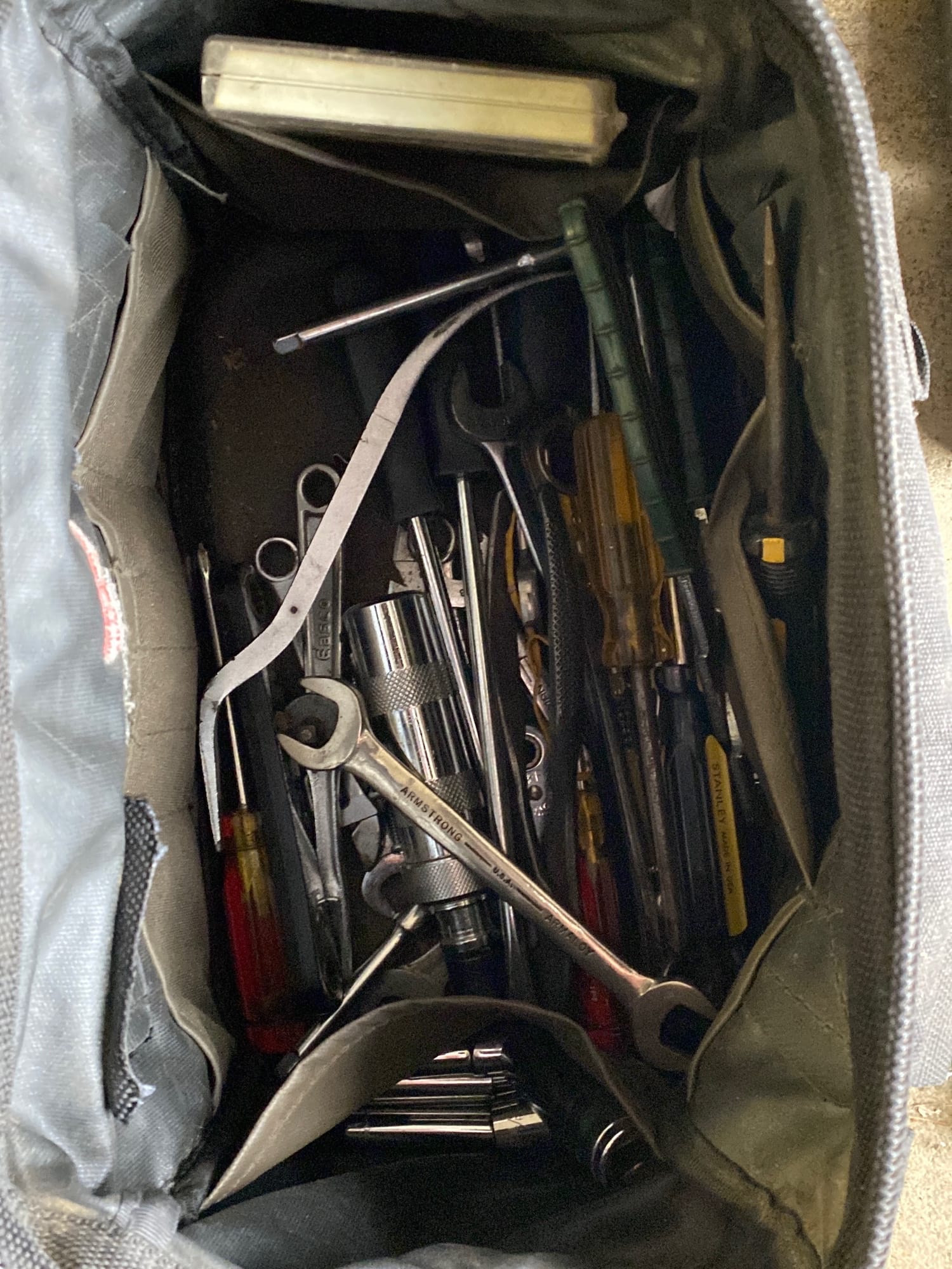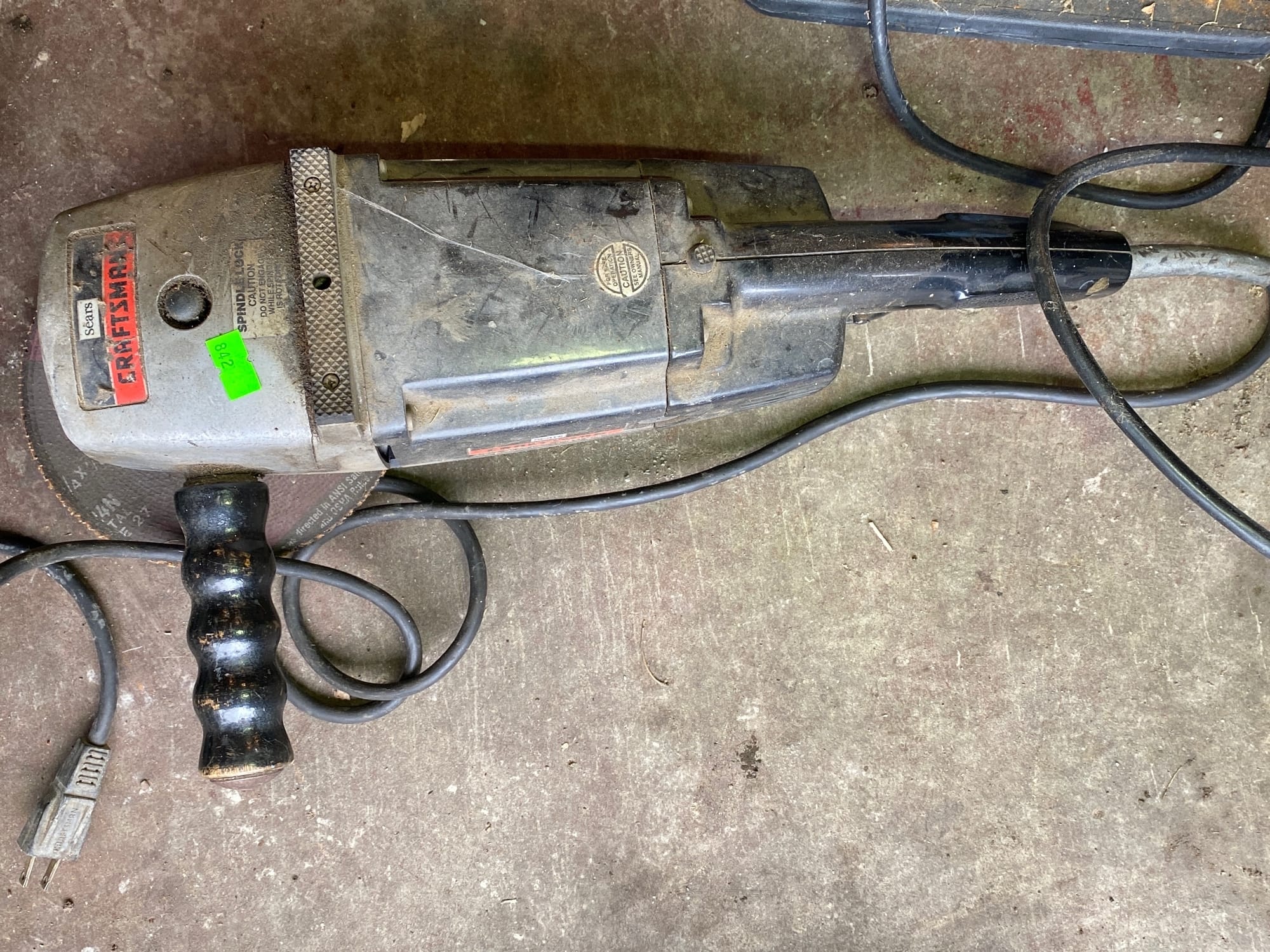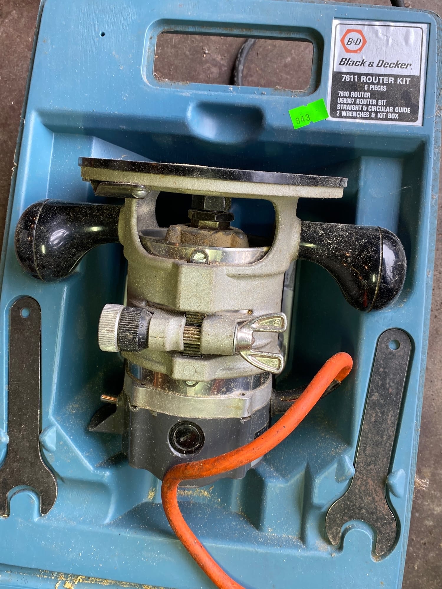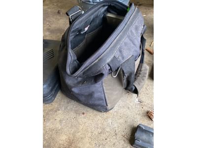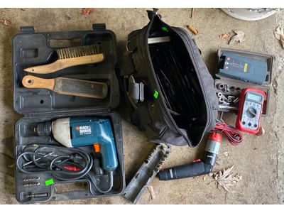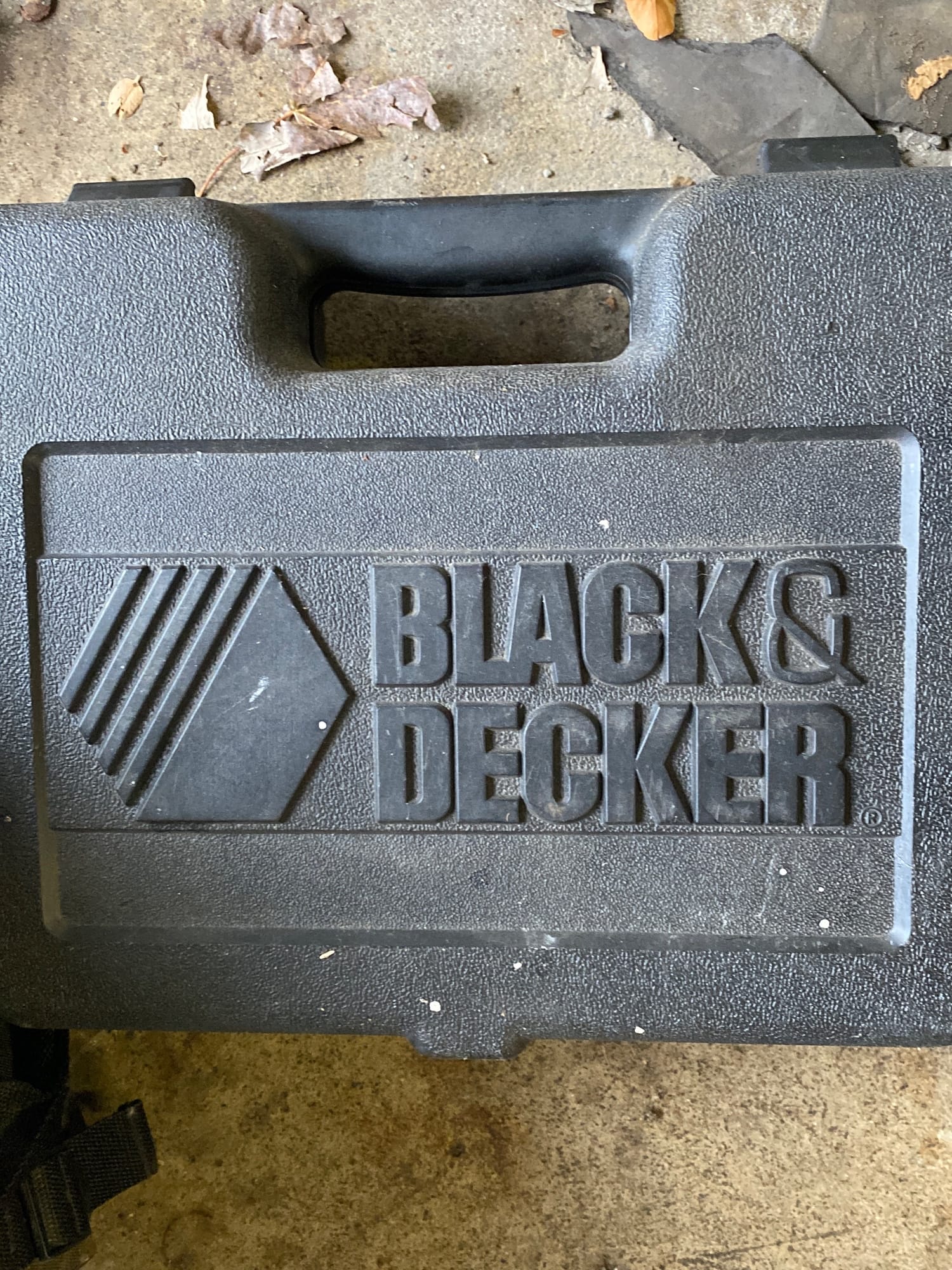 736 Black & decker drill, tool bag with misc. tools, Craftsman tester, driver, assorted tools and brushes
