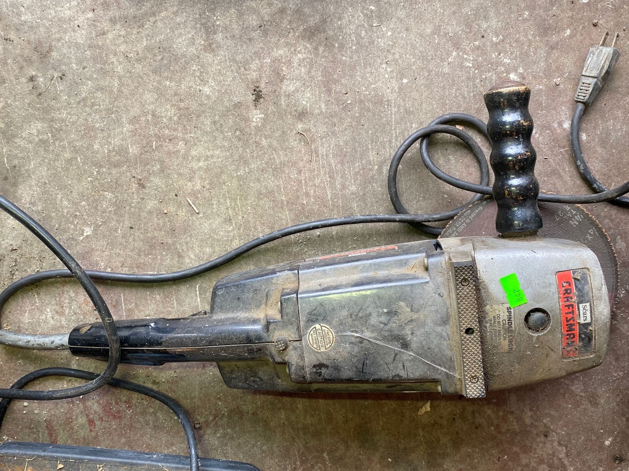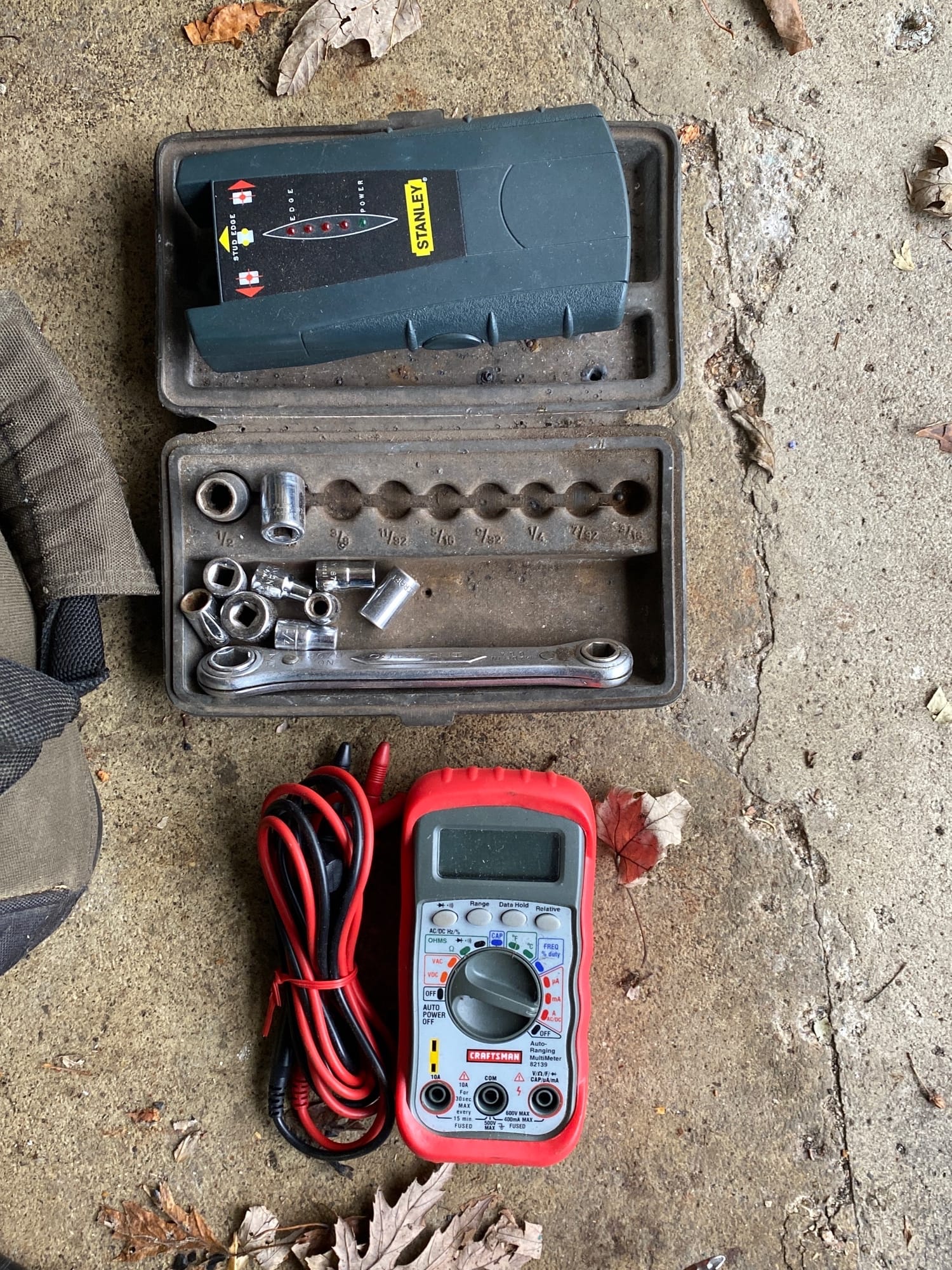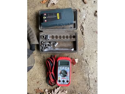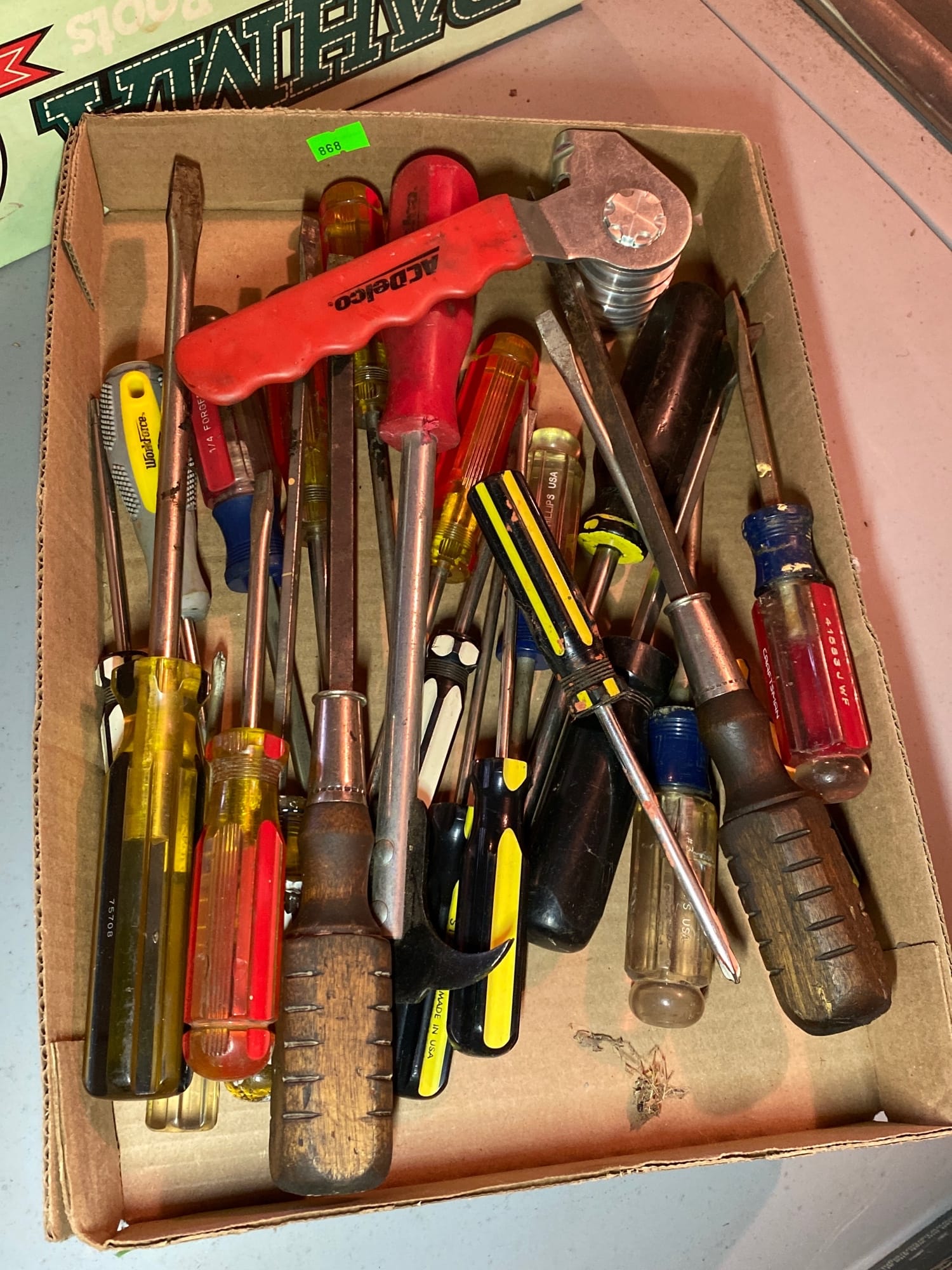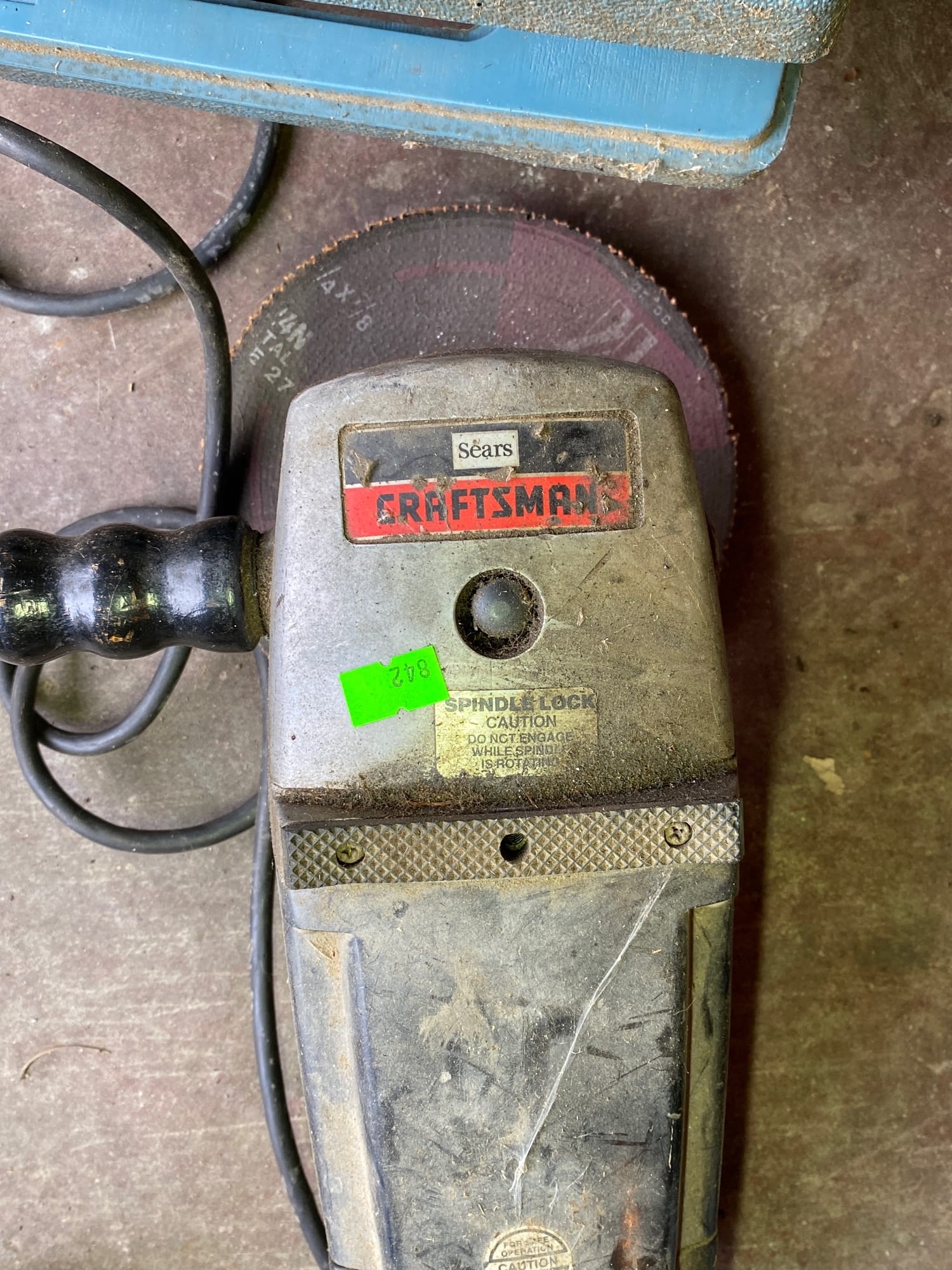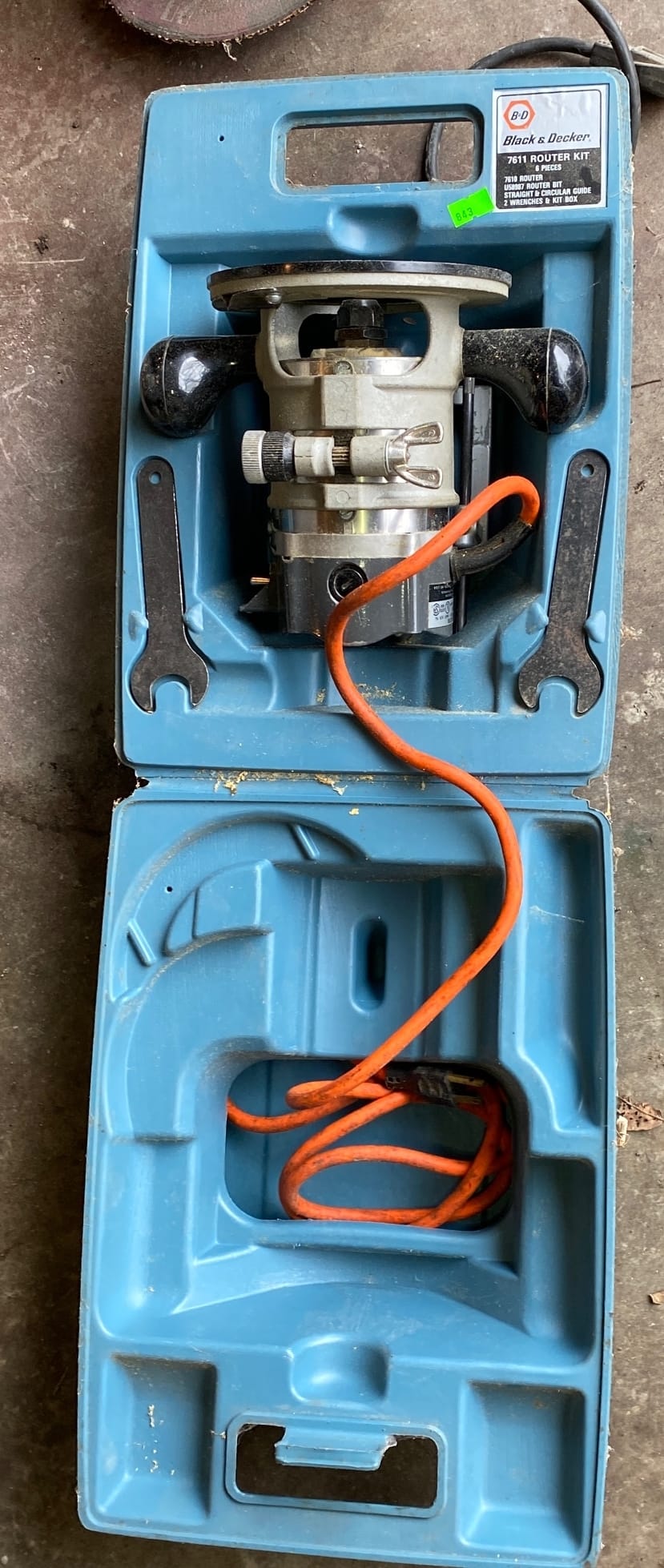 736 Black & decker drill, tool bag with misc. tools, Craftsman tester, driver, assorted tools and brushes