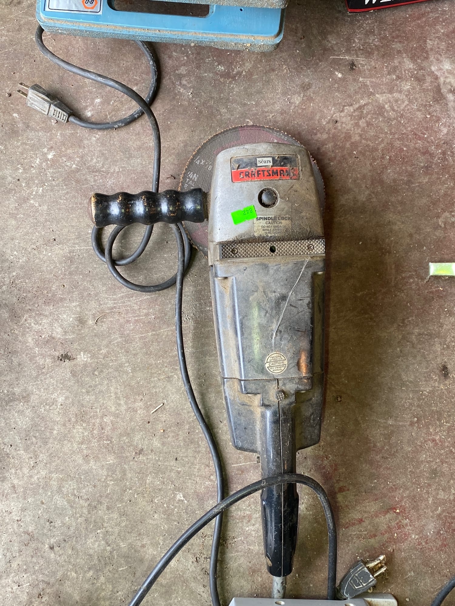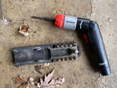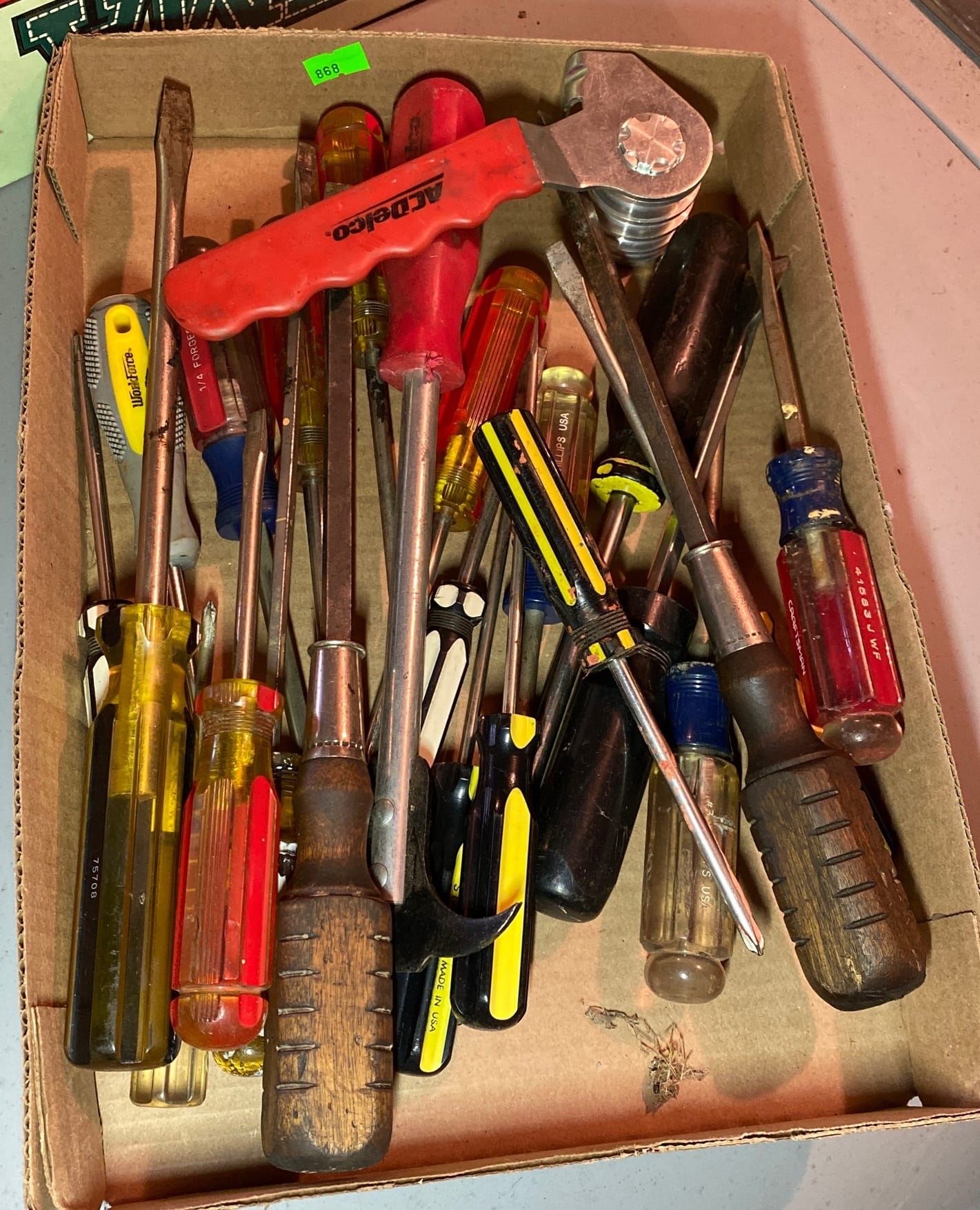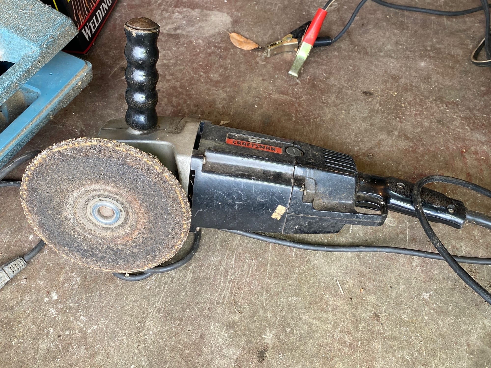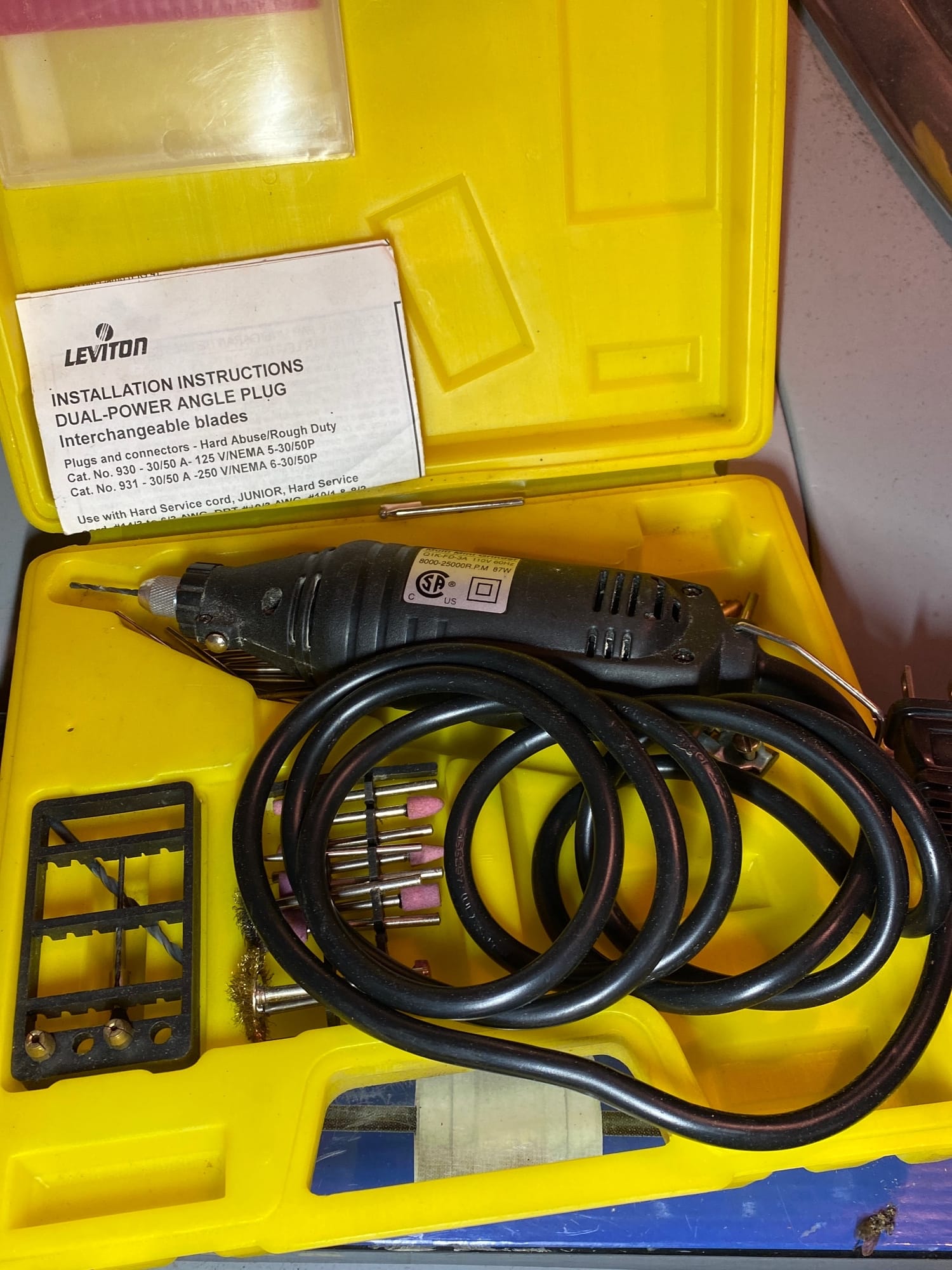 736 Black & decker drill, tool bag with misc. tools, Craftsman tester, driver, assorted tools and brushes