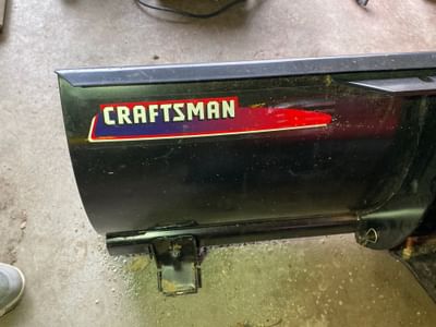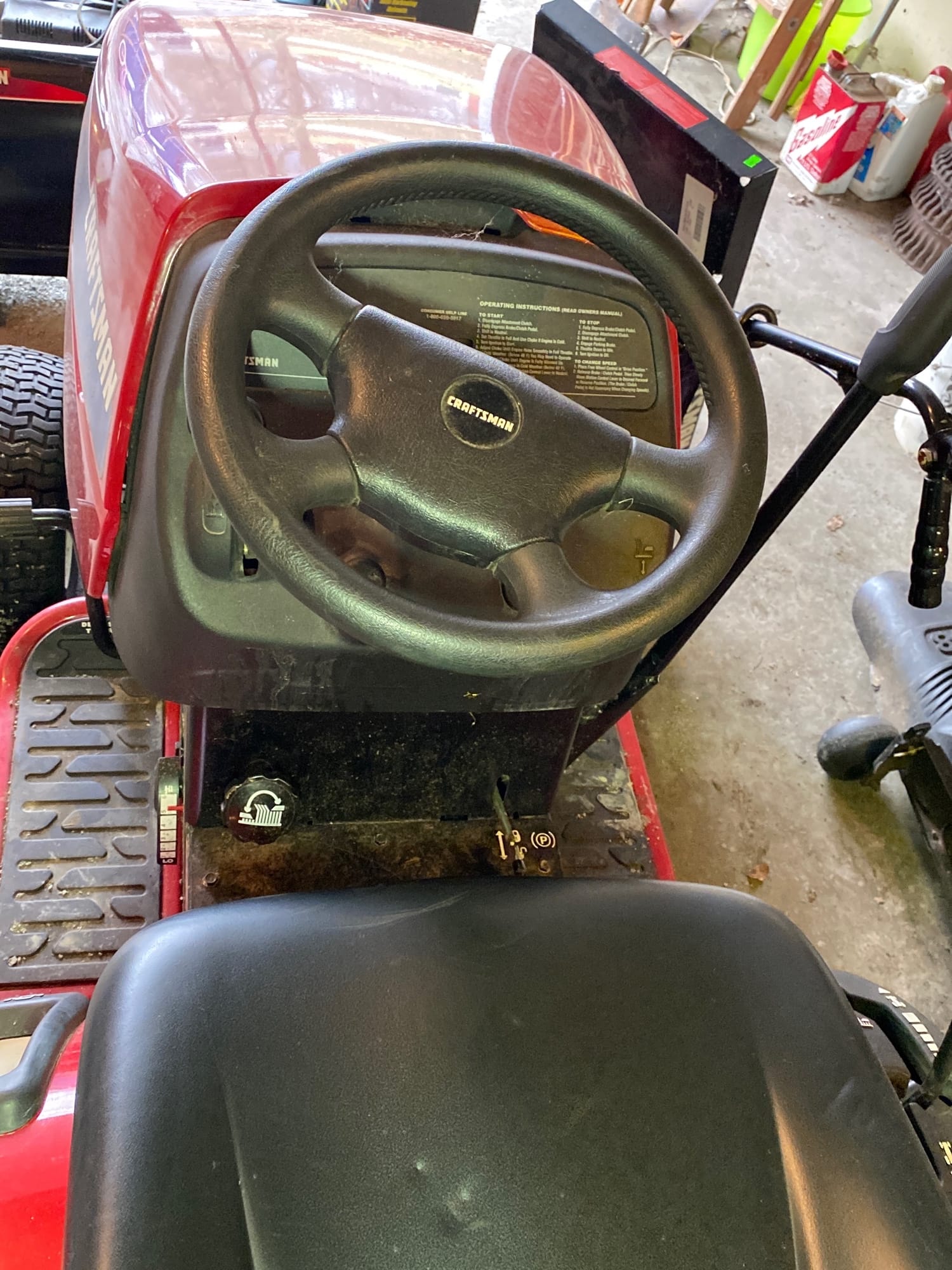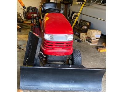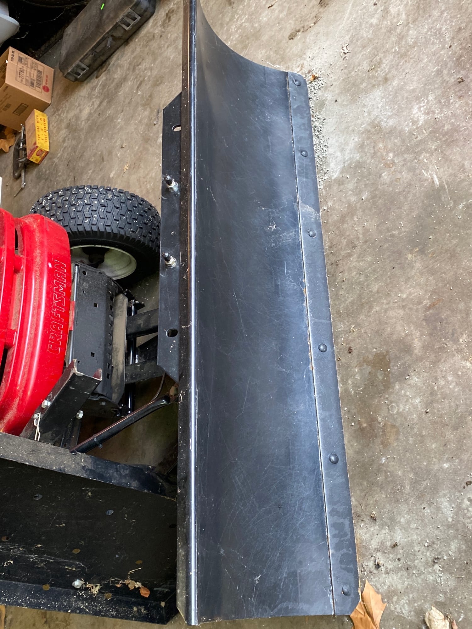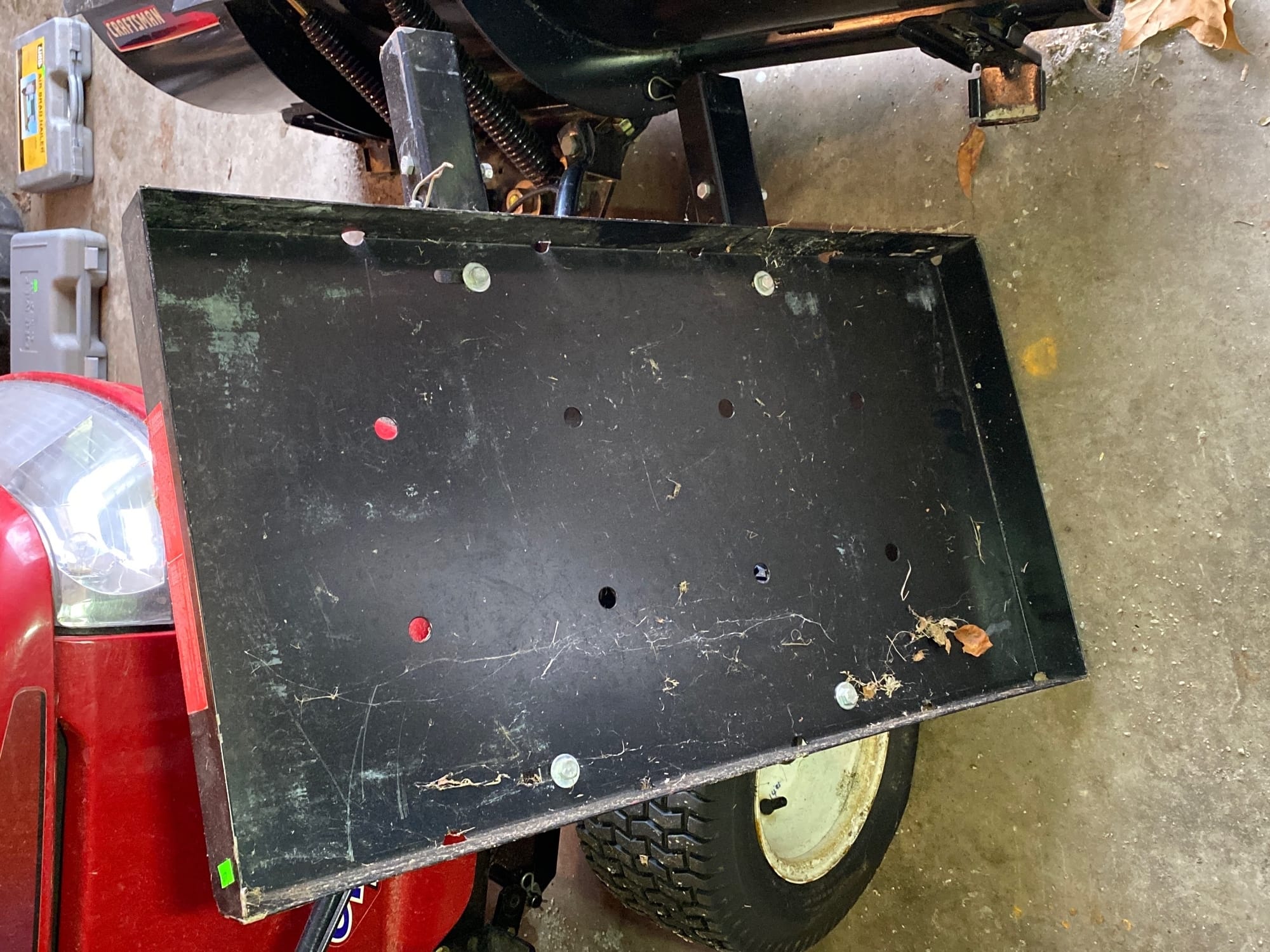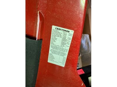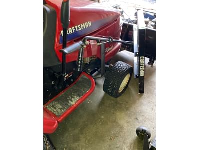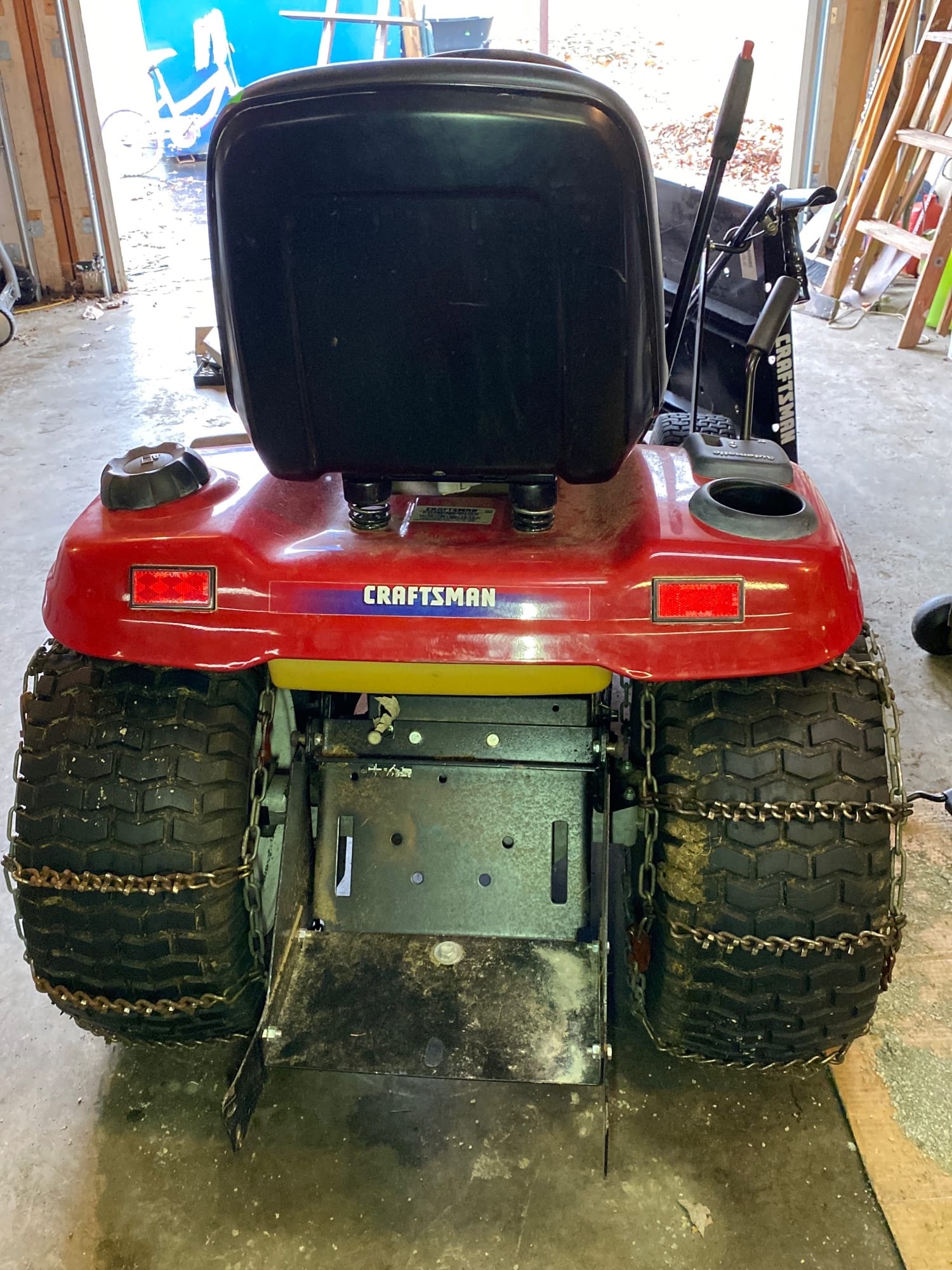 837 Craftsman GT5000 riding mower with 48in deck, 48in front blade manual lift, rear wt. platform, rear tire chains, Kohler 25hp engine, no hour meter, Battery is dead