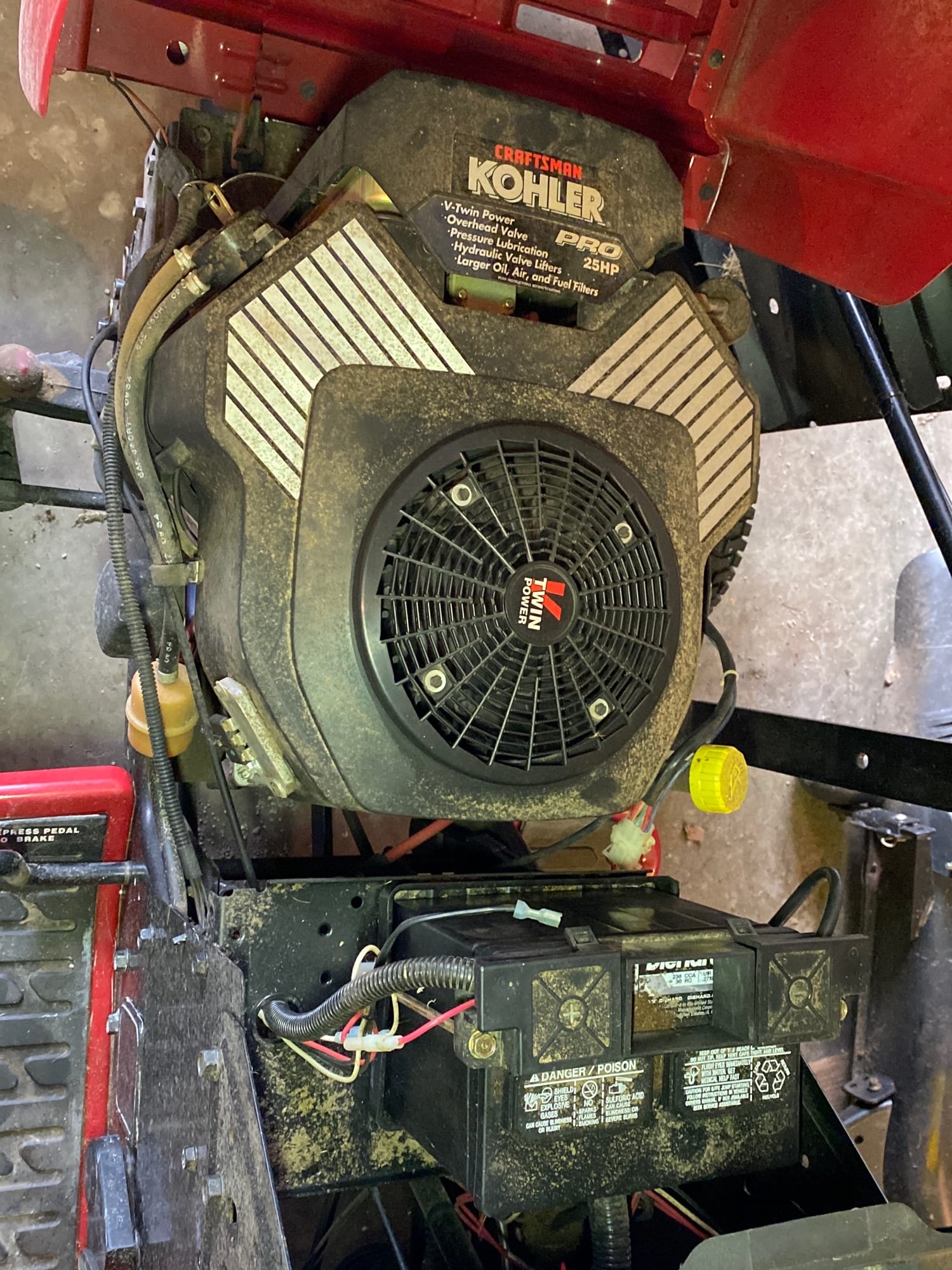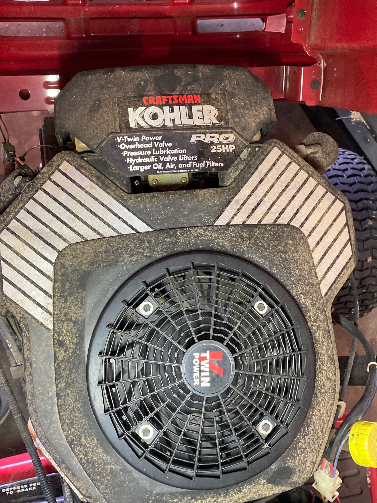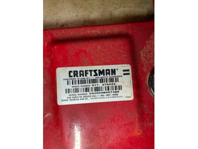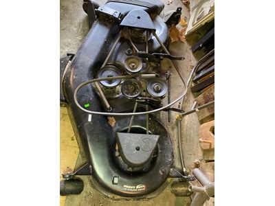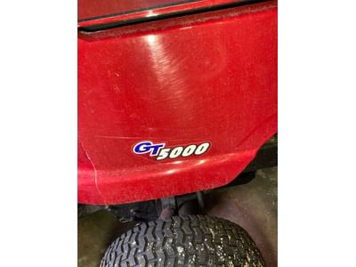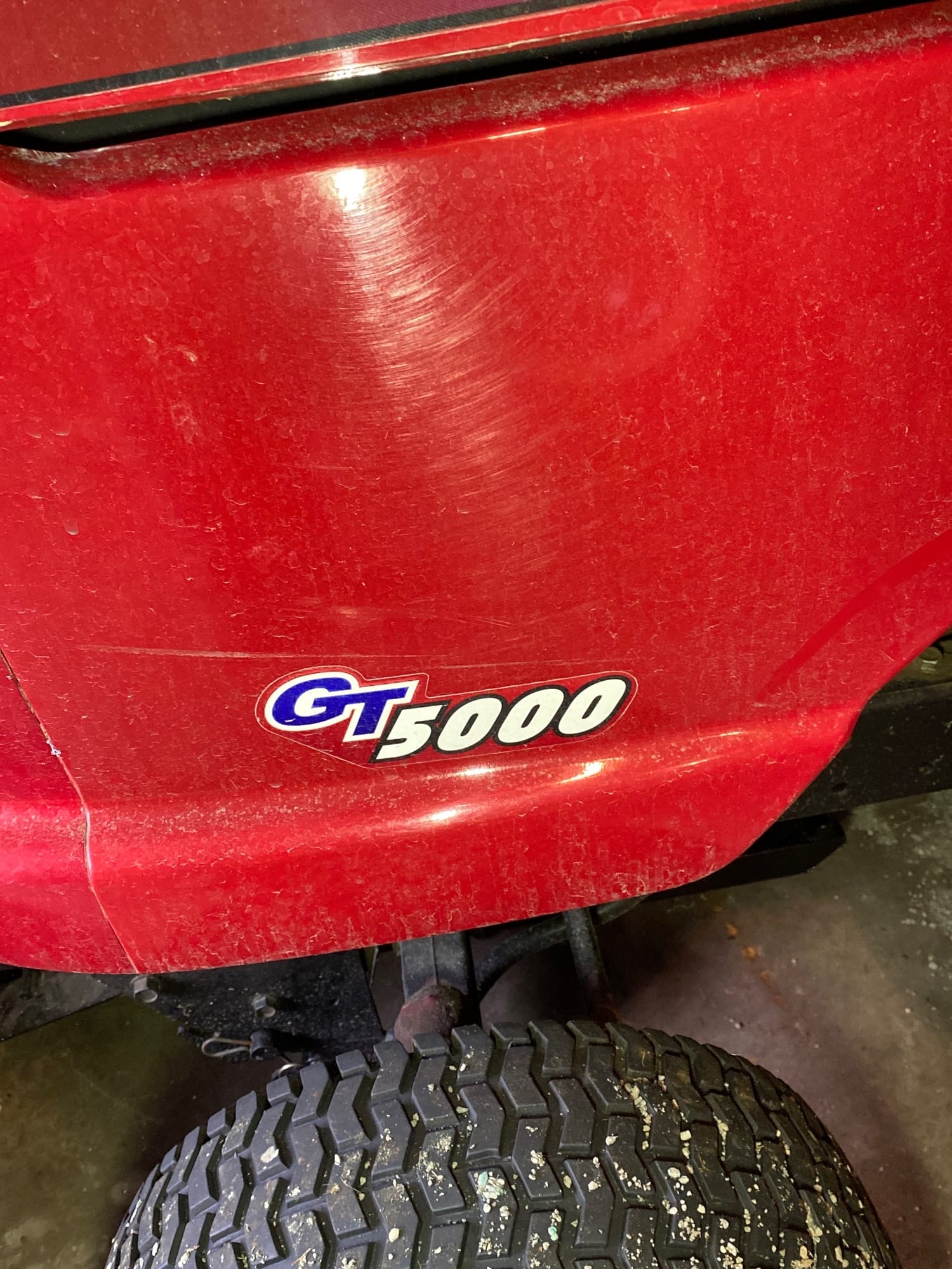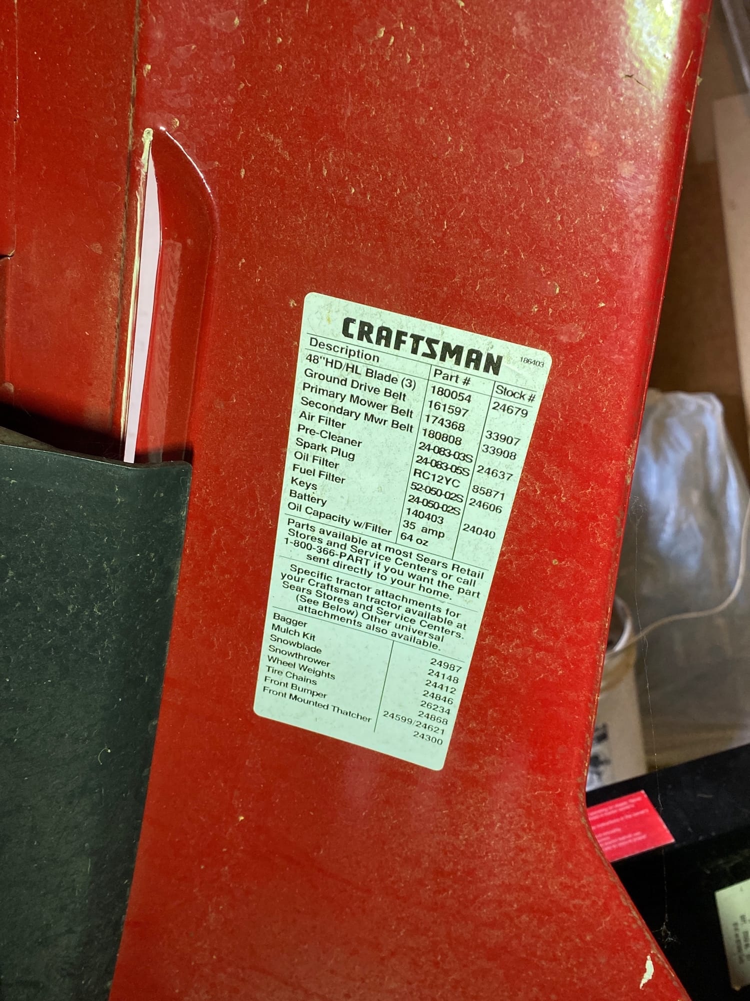 837 Craftsman GT5000 riding mower with 48in deck, 48in front blade manual lift, rear wt. platform, rear tire chains, Kohler 25hp engine, no hour meter, Battery is dead