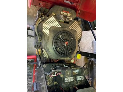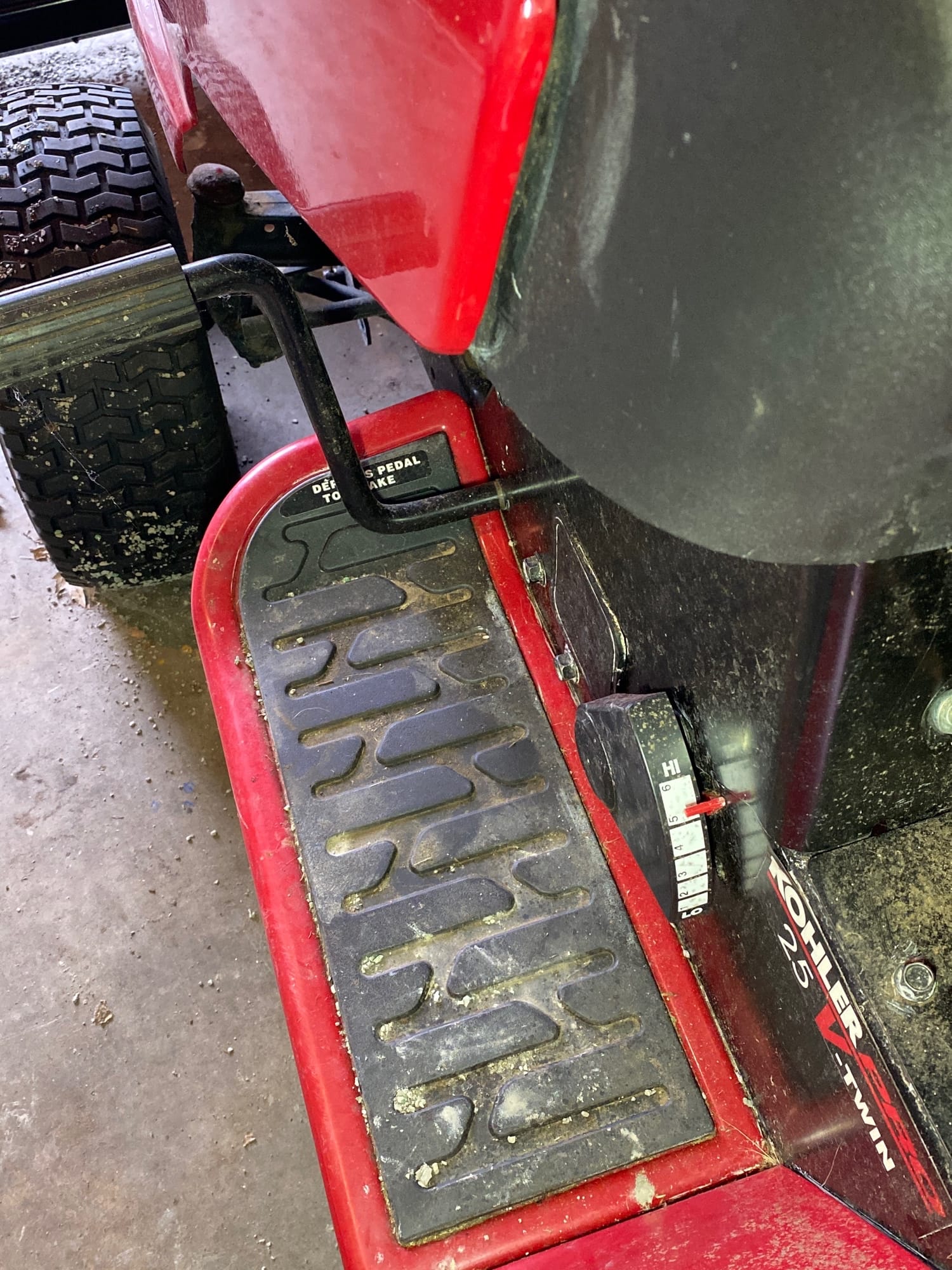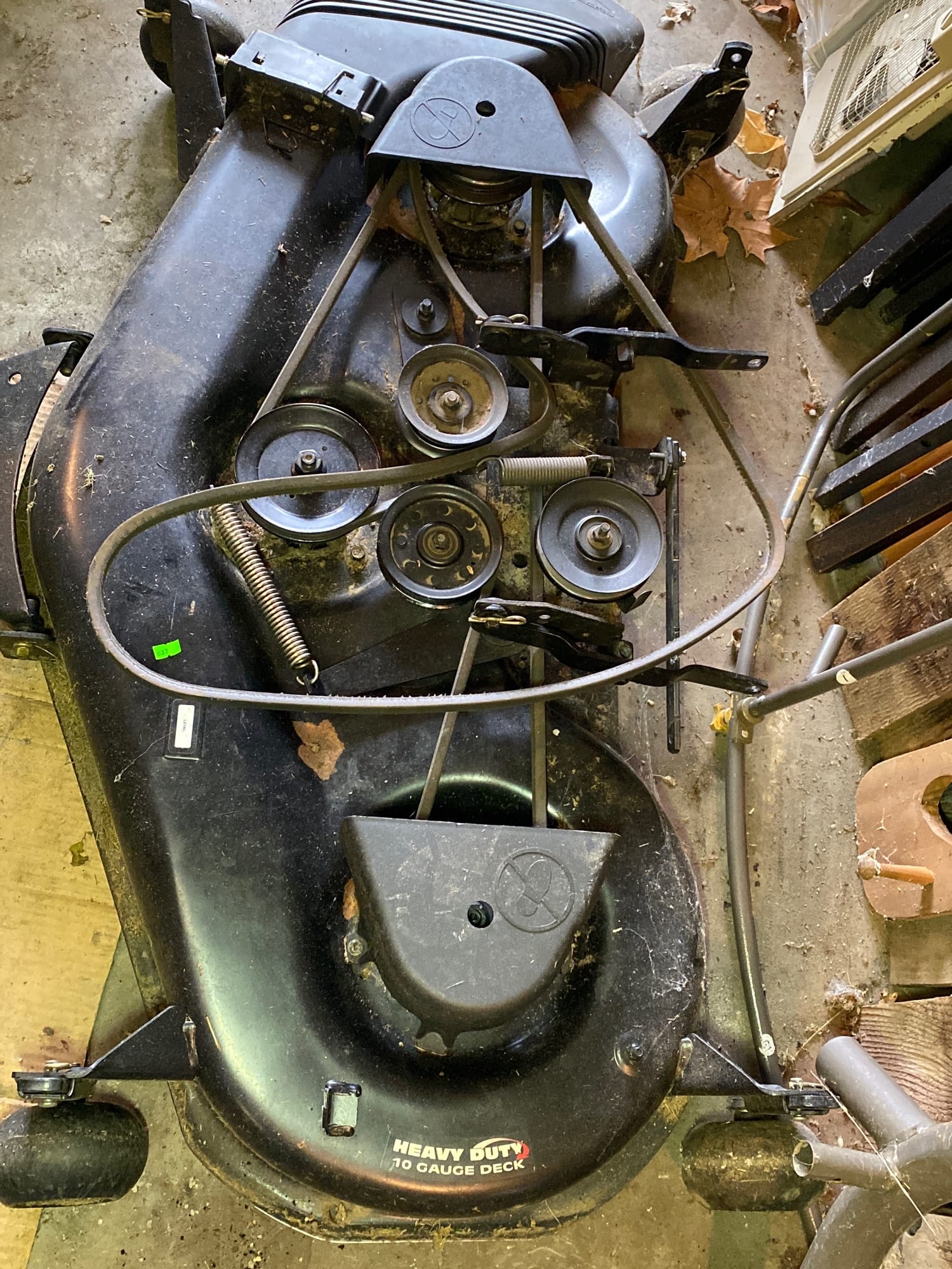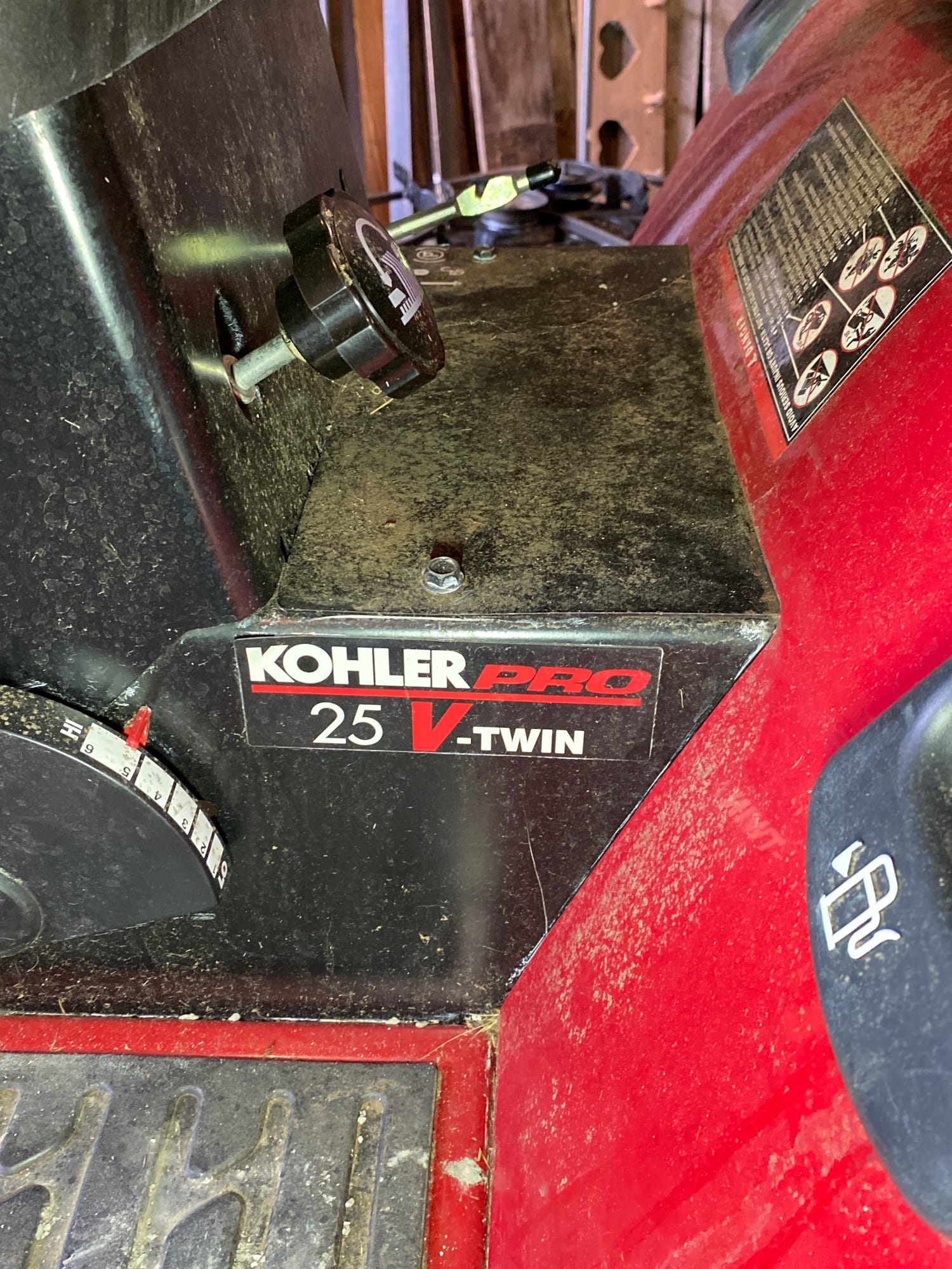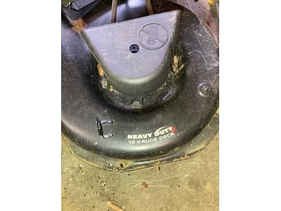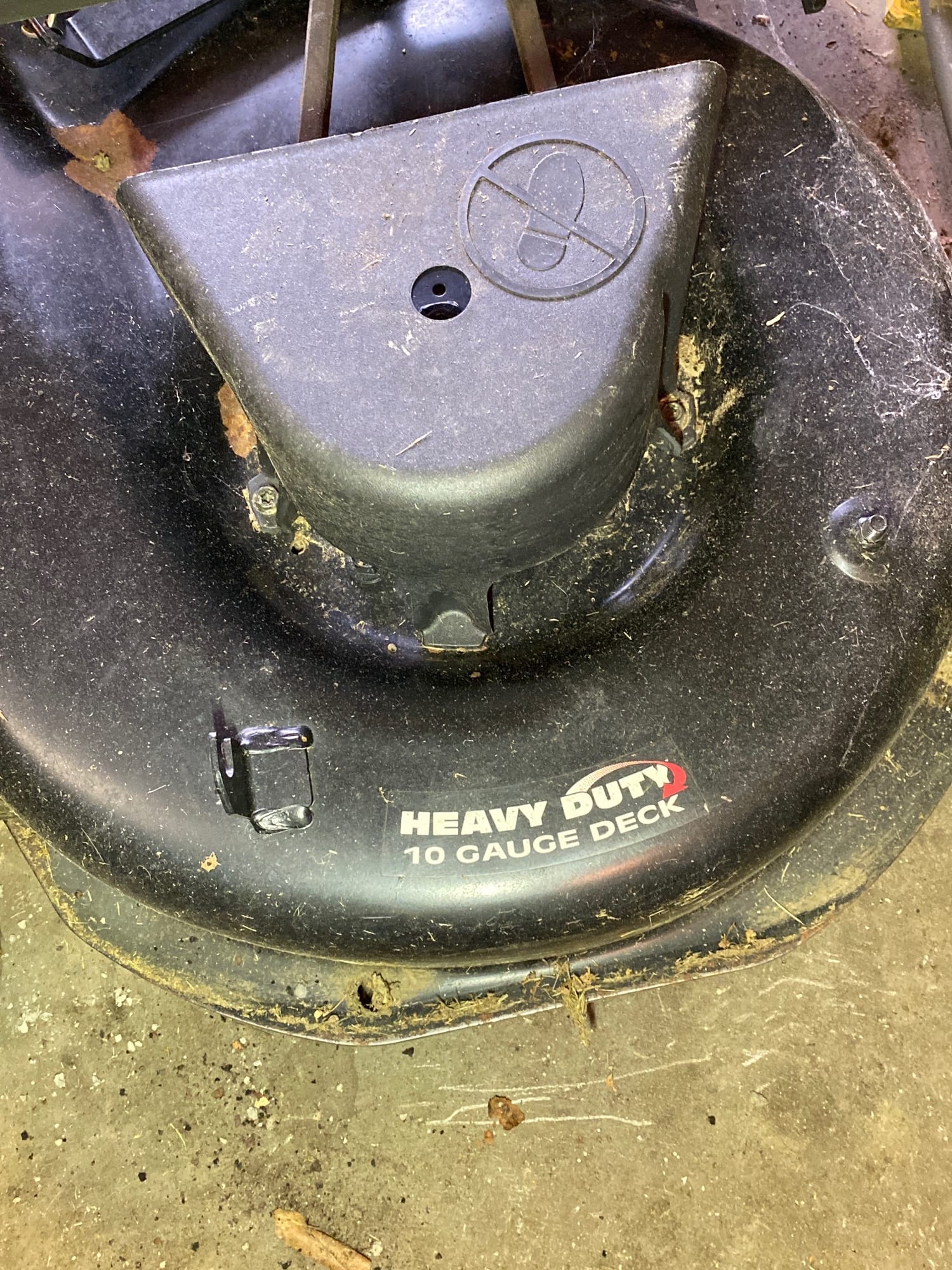 837 Craftsman GT5000 riding mower with 48in deck, 48in front blade manual lift, rear wt. platform, rear tire chains, Kohler 25hp engine, no hour meter, Battery is dead