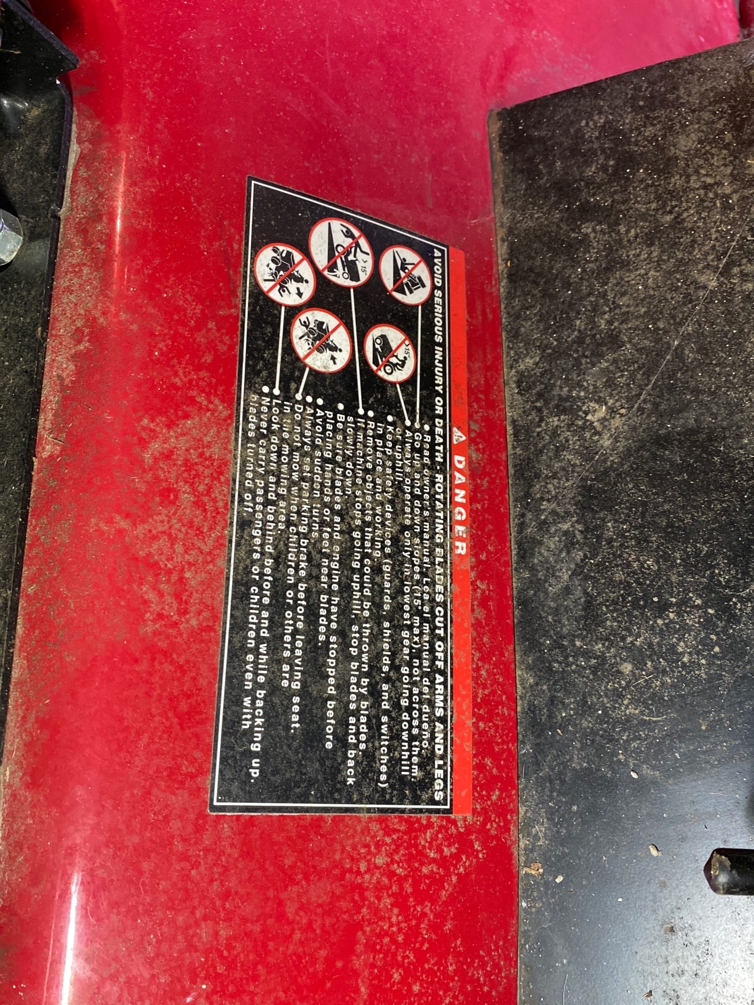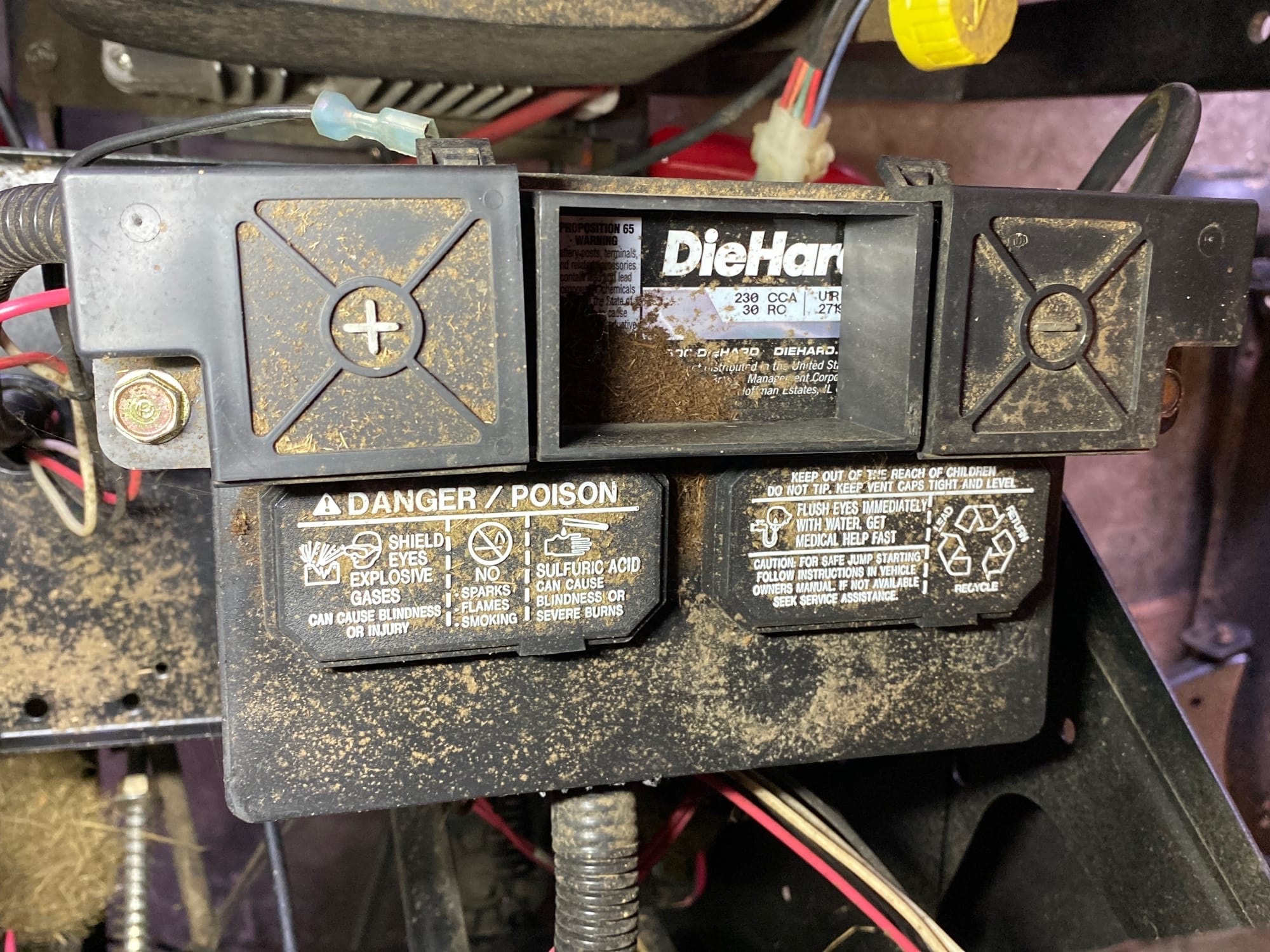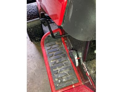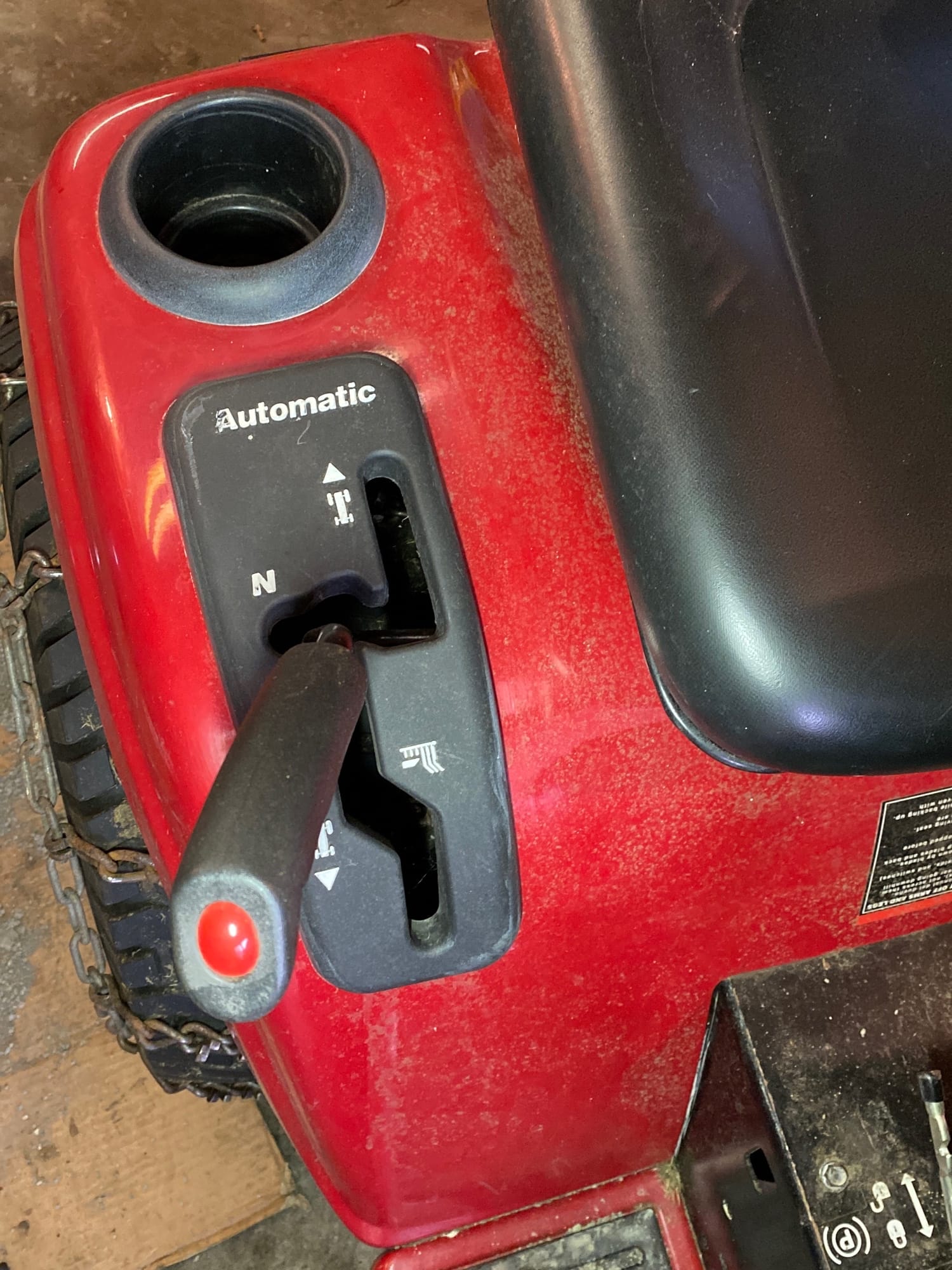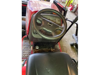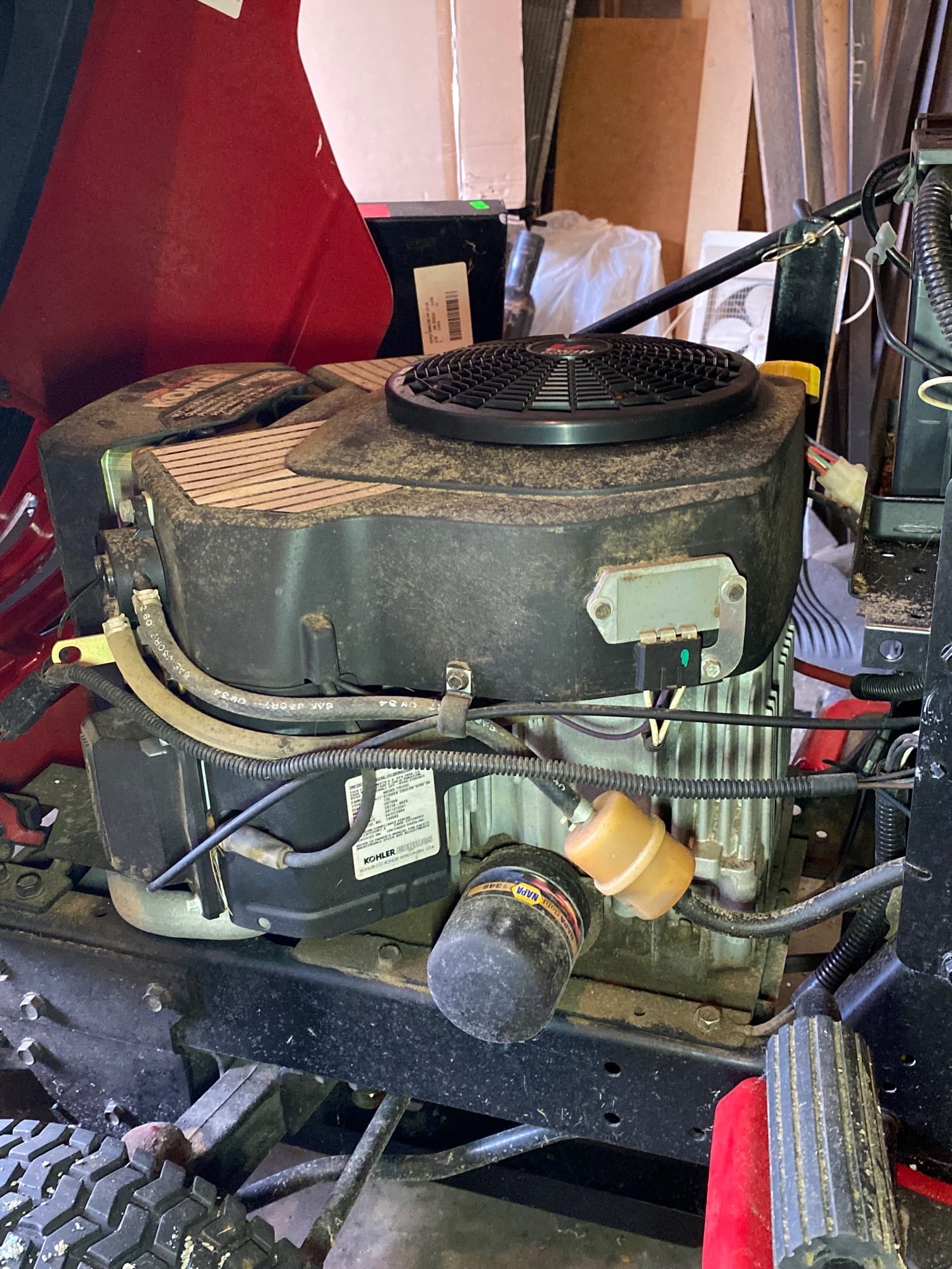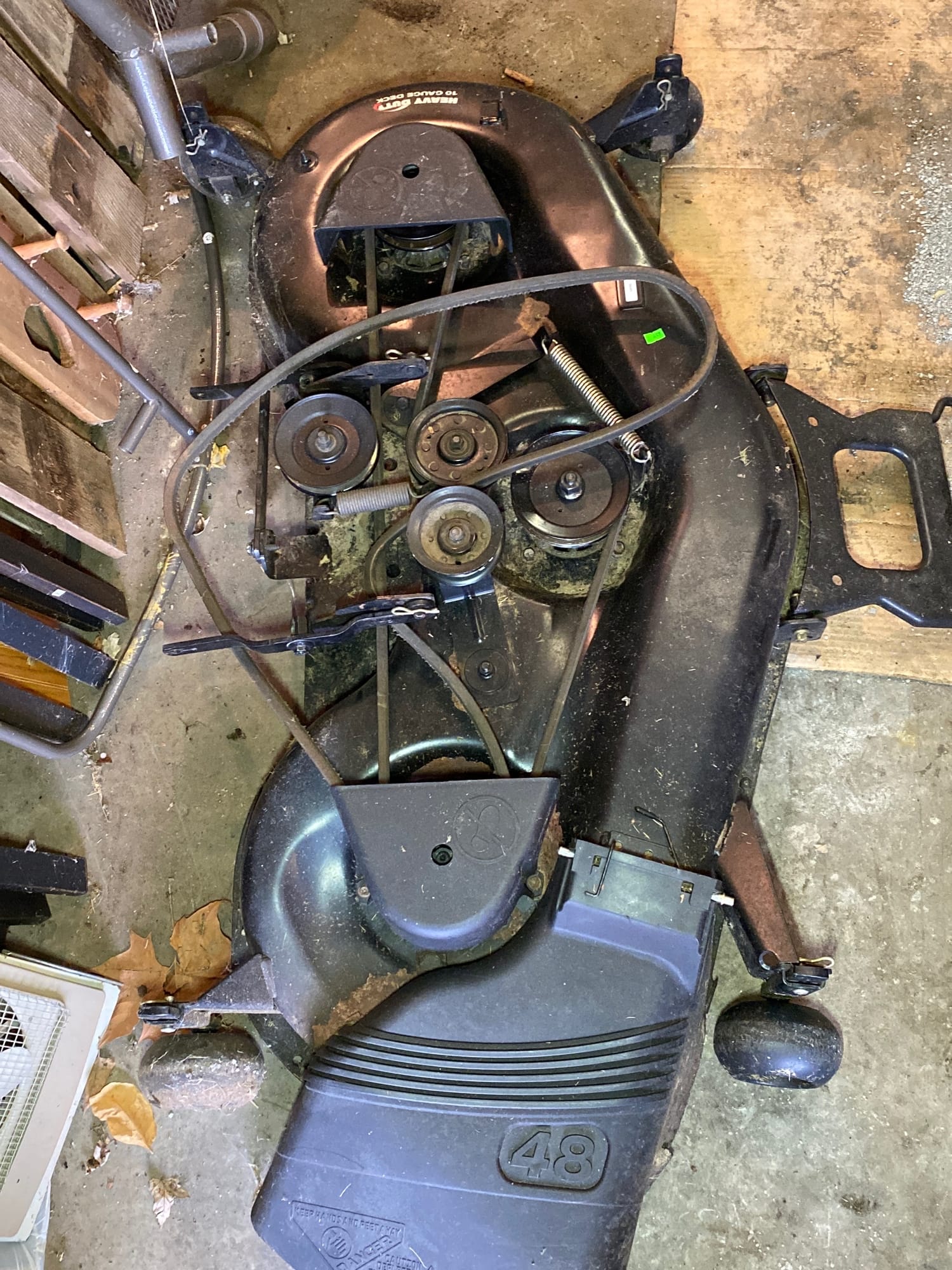 837 Craftsman GT5000 riding mower with 48in deck, 48in front blade manual lift, rear wt. platform, rear tire chains, Kohler 25hp engine, no hour meter, Battery is dead