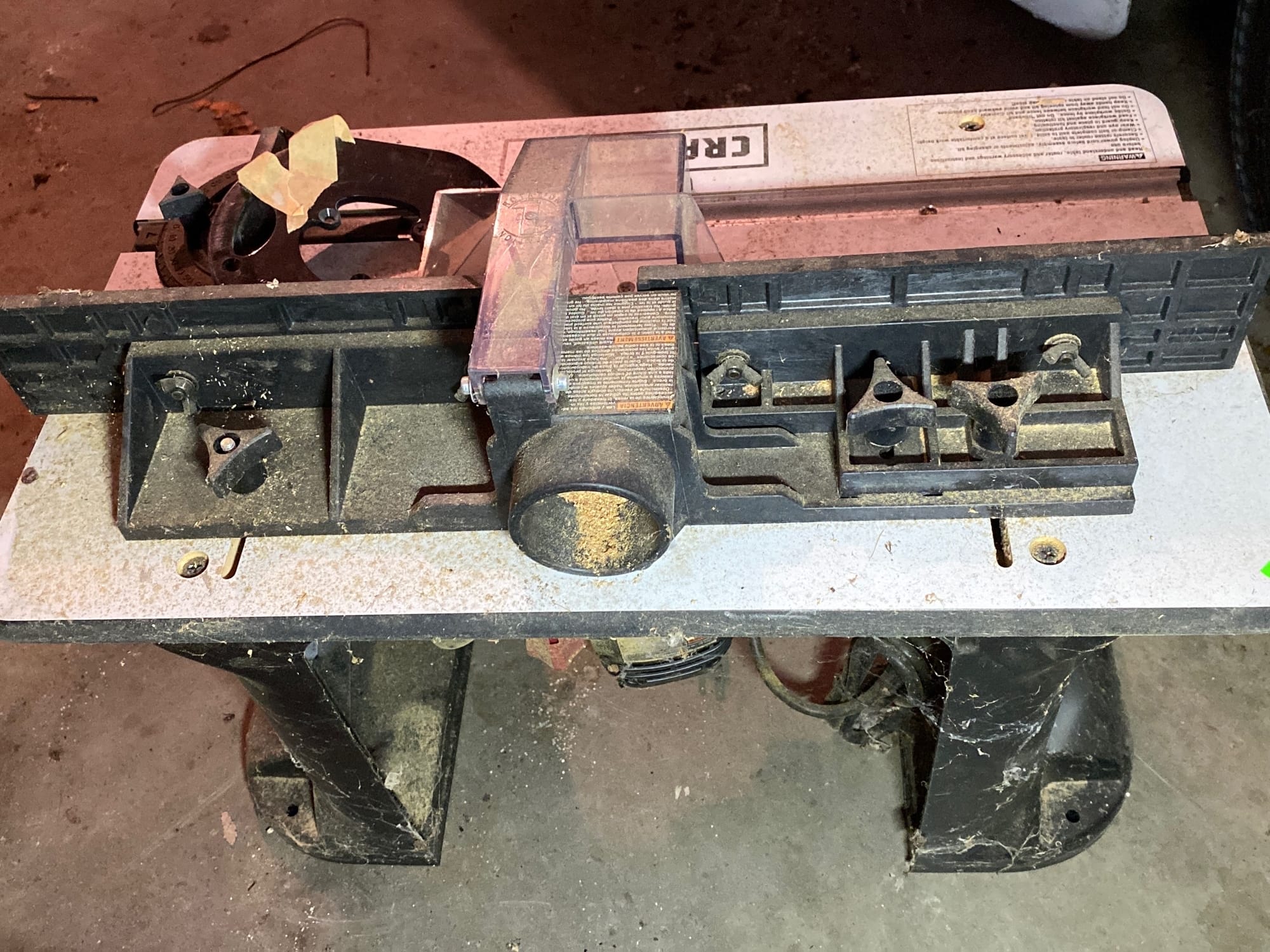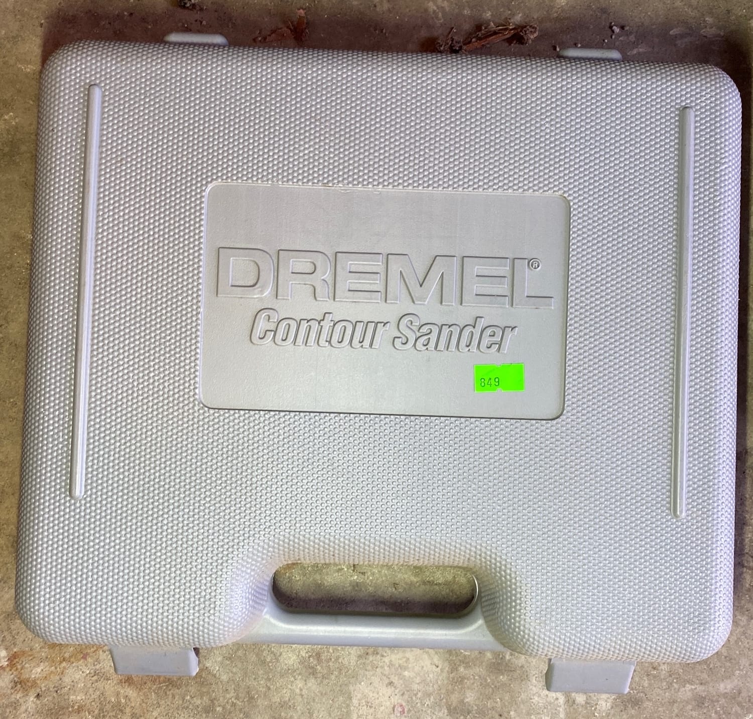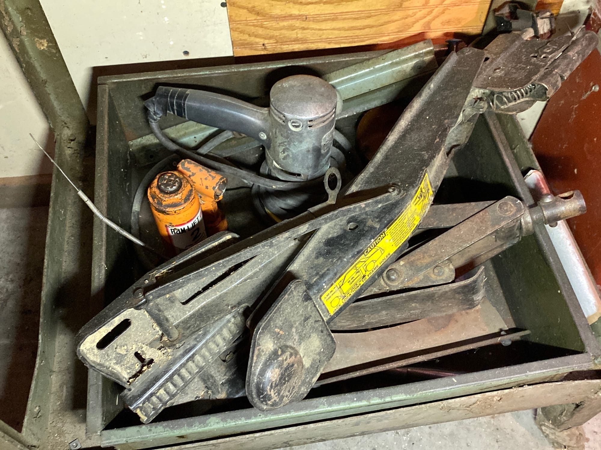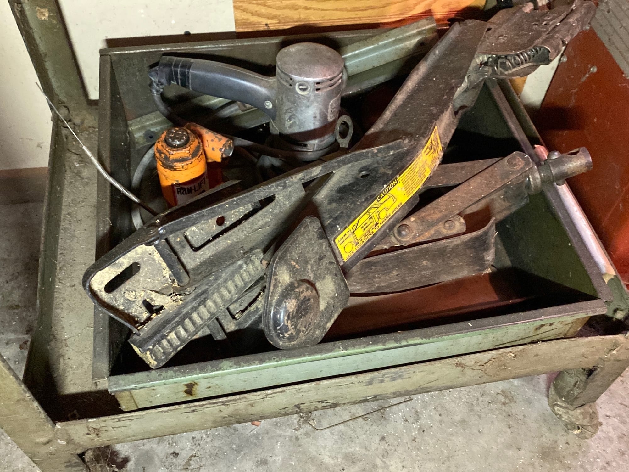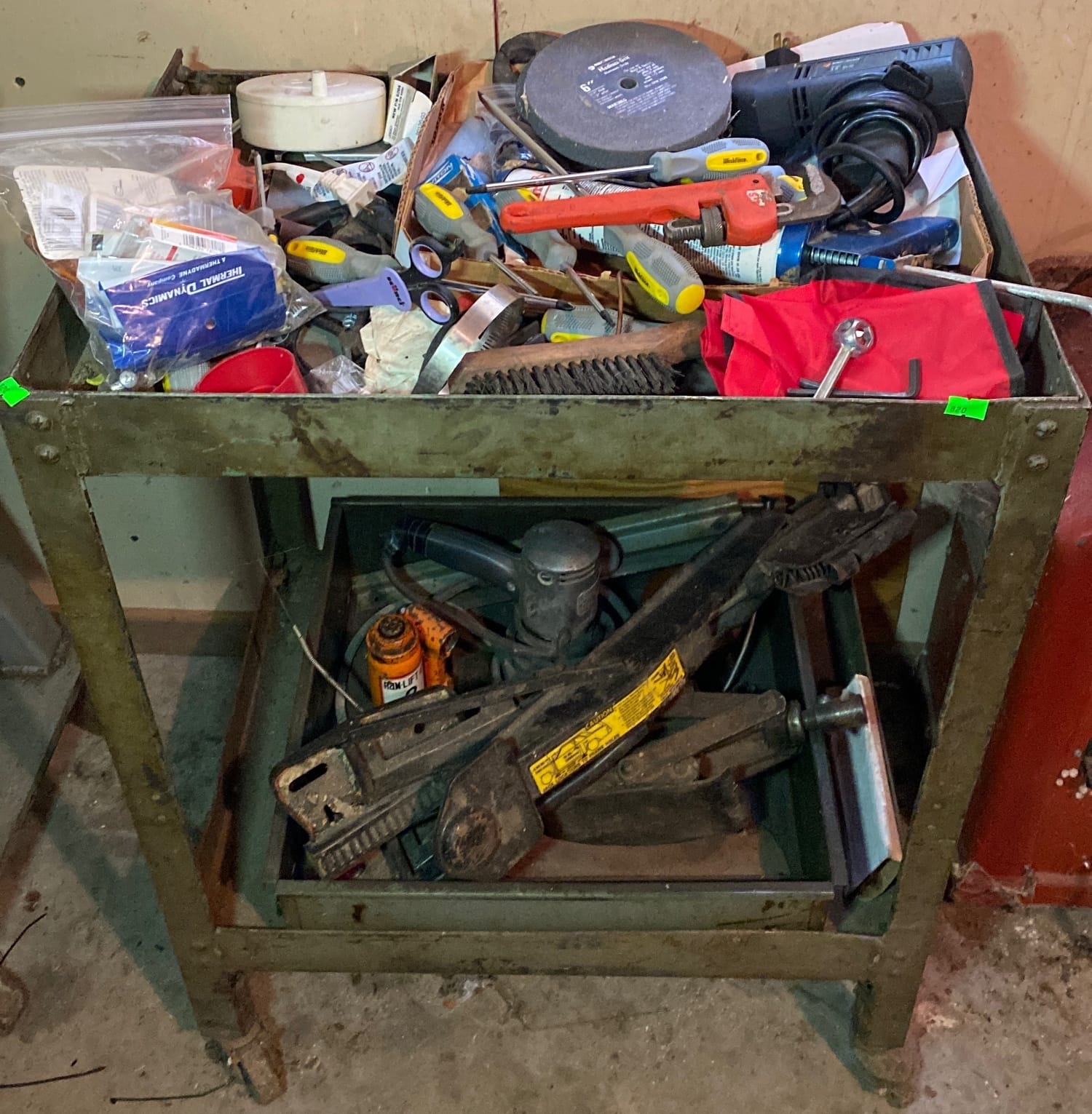 820 Metal tool cart and contents inc. Black & Decker drill, tools, jacks, sander, brushes, misc. 24x18x32