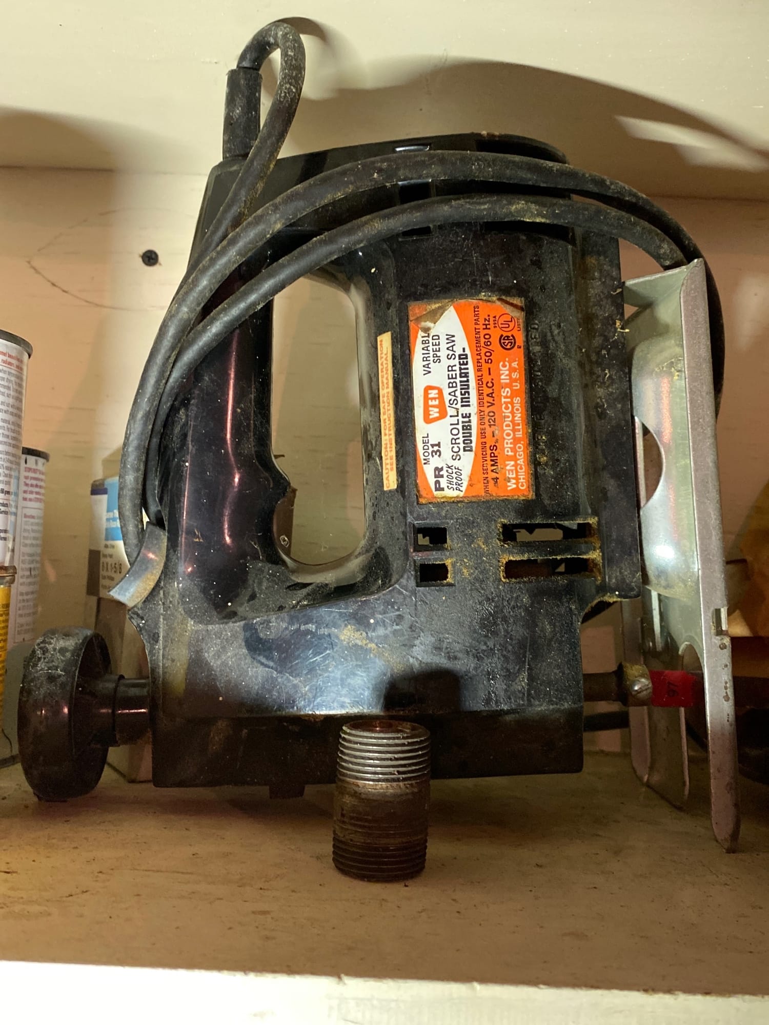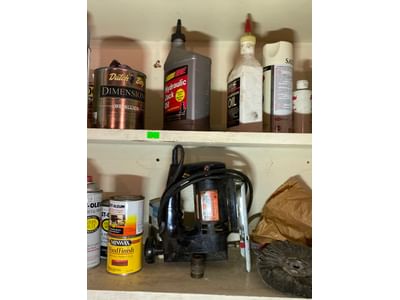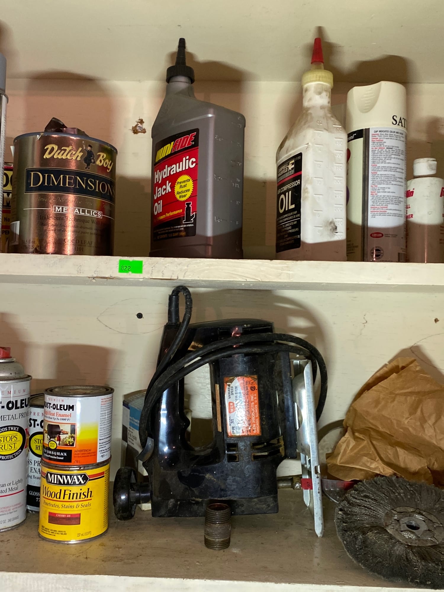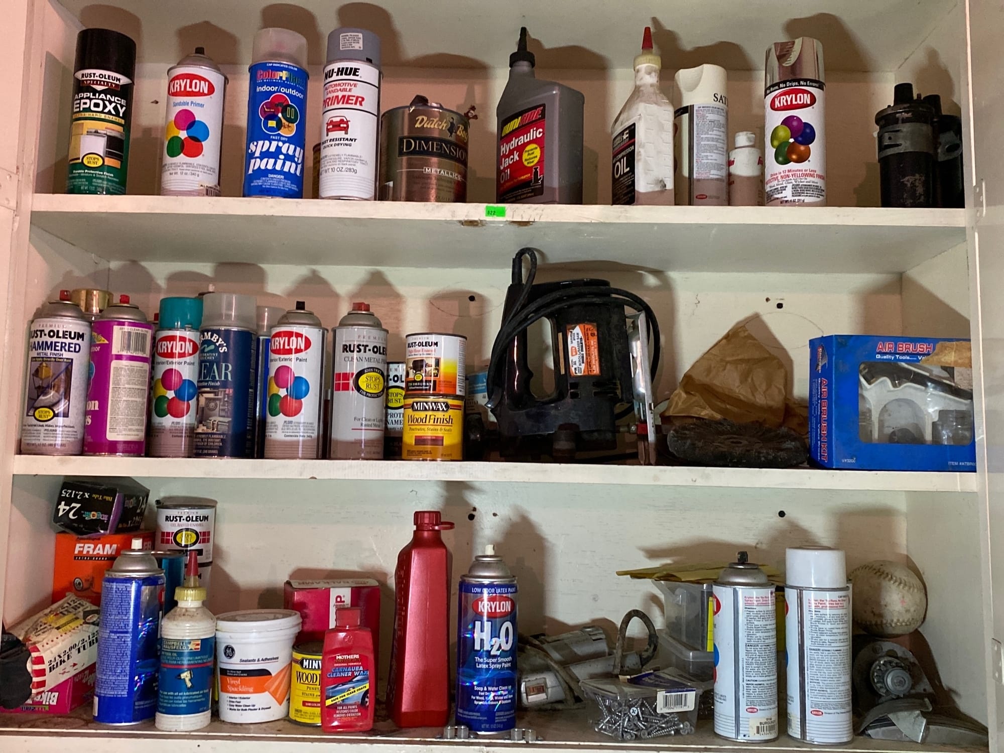 822 Automotive chemicals, paints, wen scroll saw, hardware, misc., contents of shelves as shown in pictures