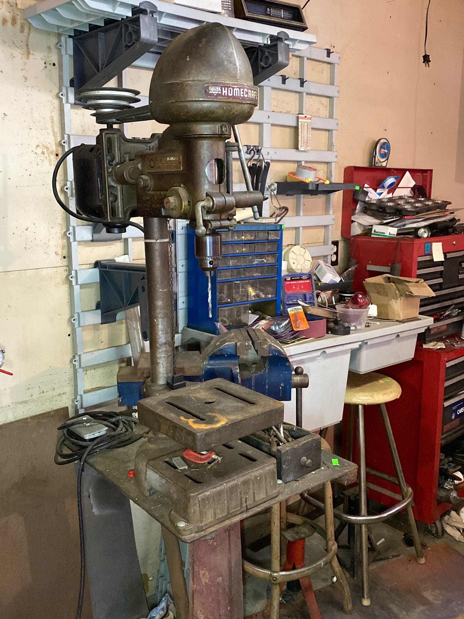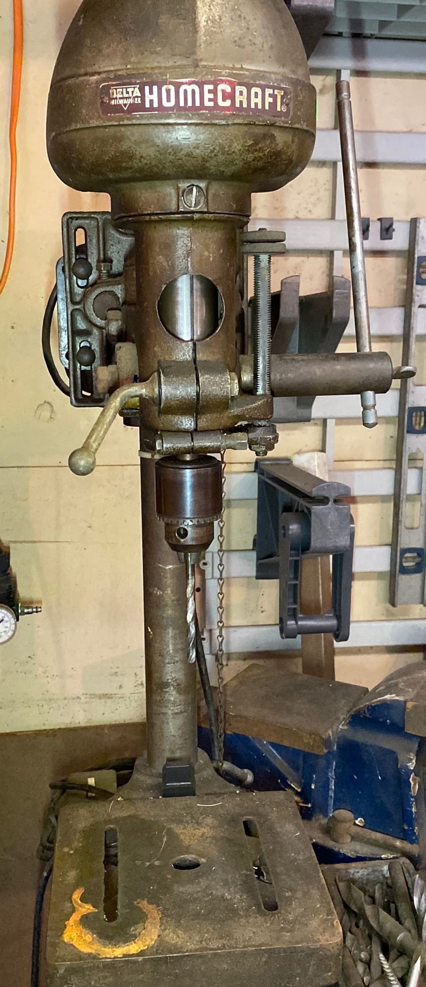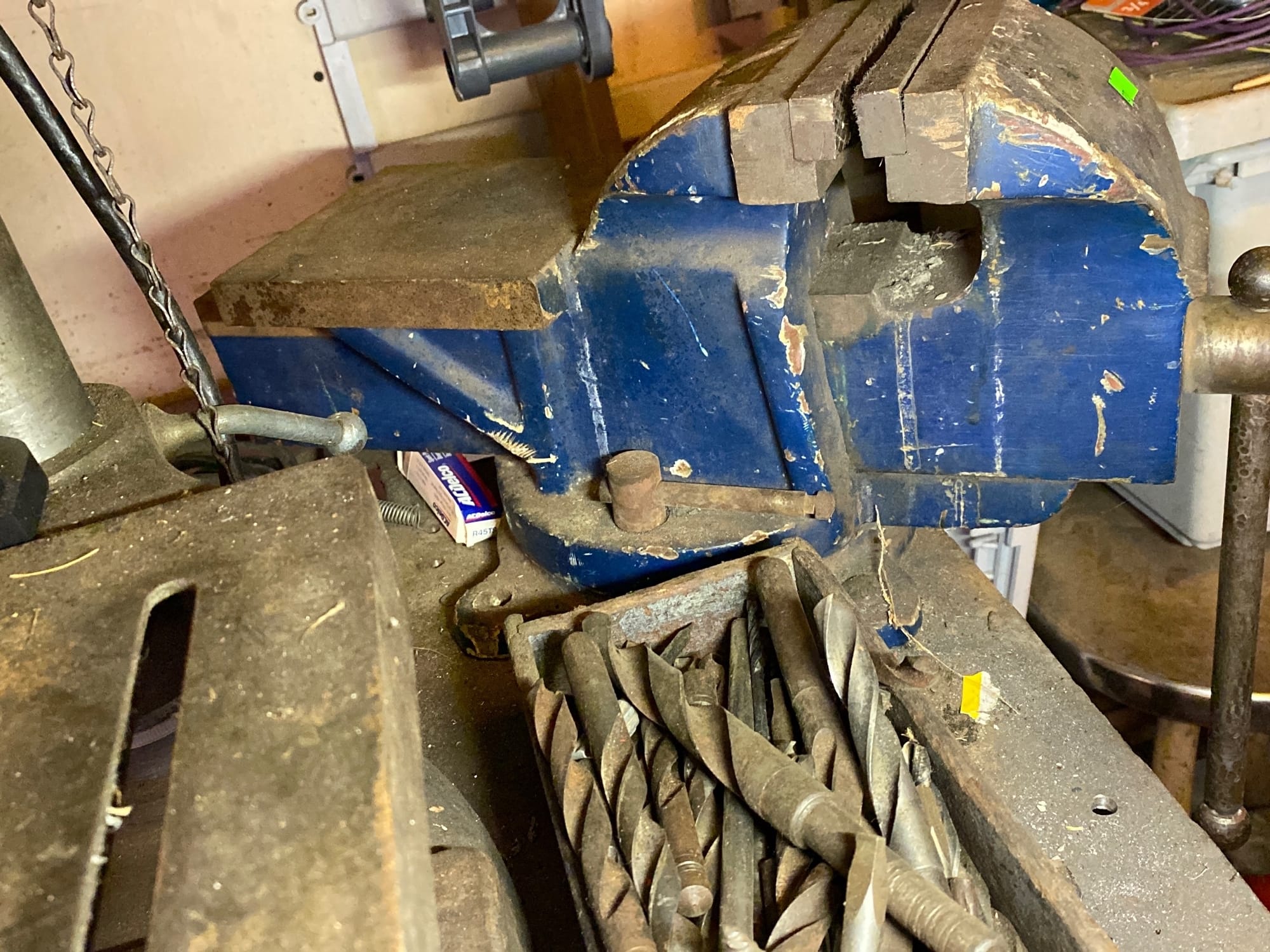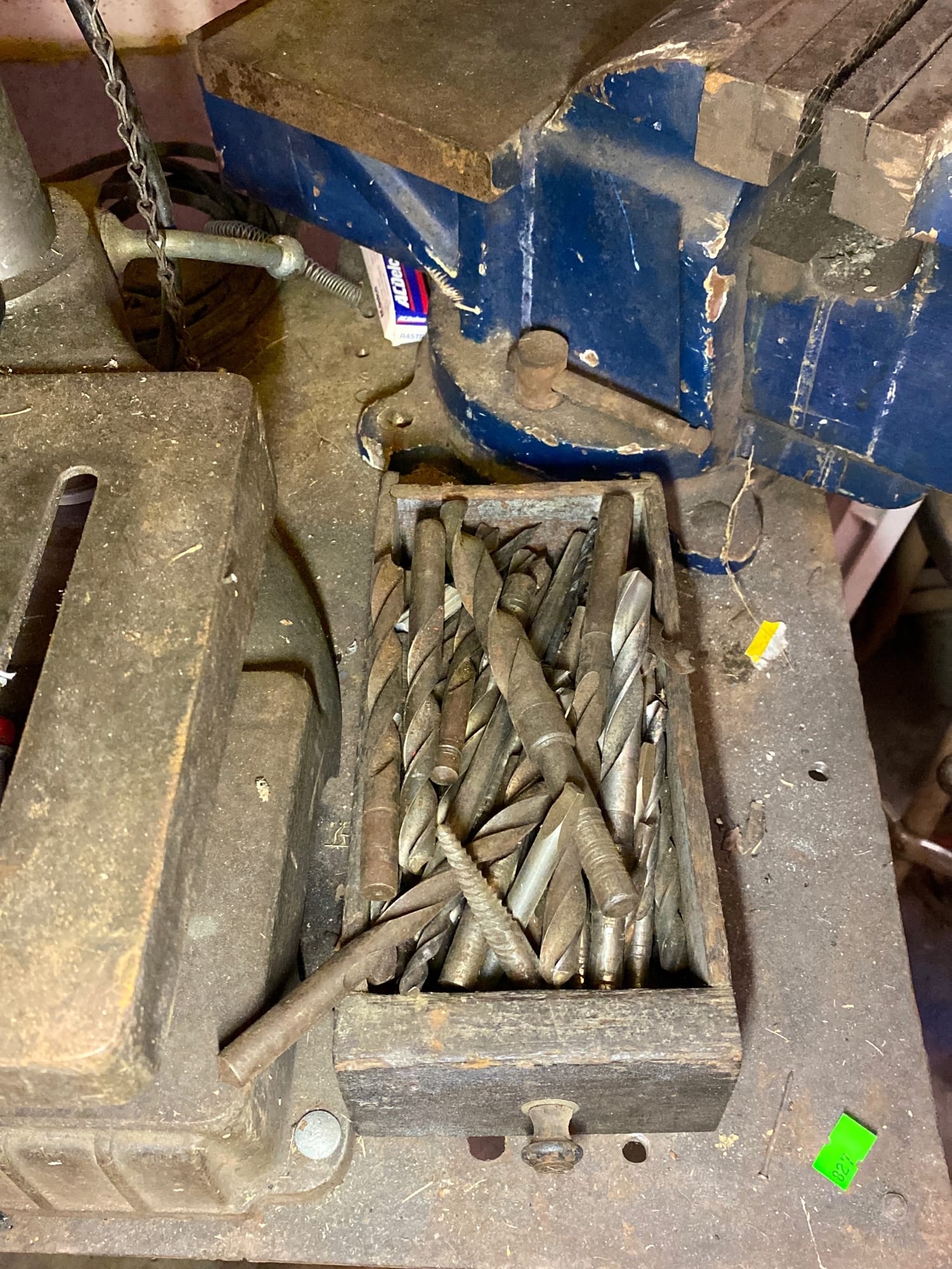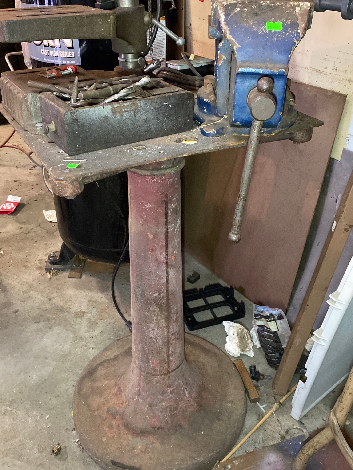 827 Drill bits, Delta homecraft drill press benchtop 33in and China 6in vise mounted on cast iron pedestal 34in tall