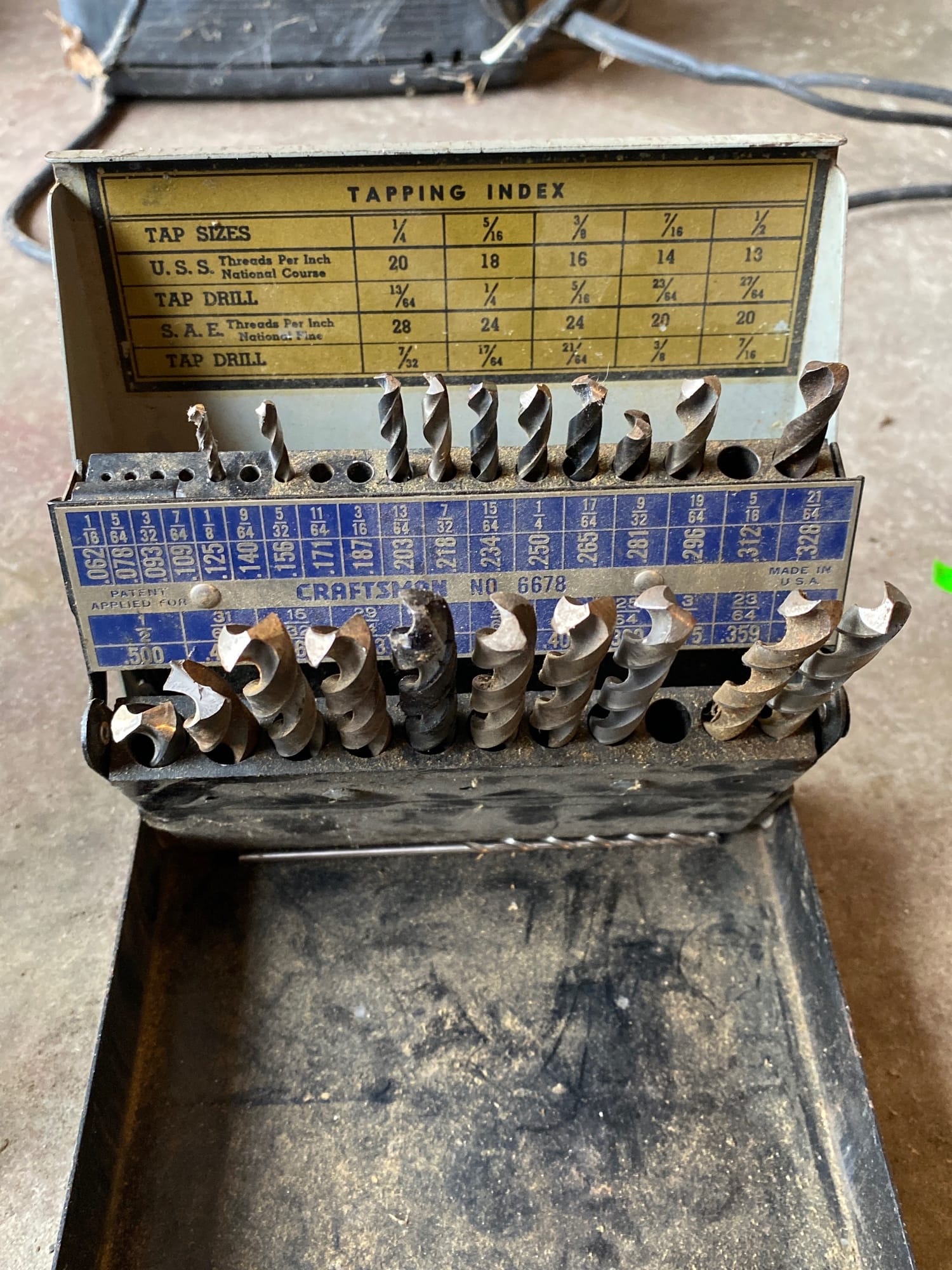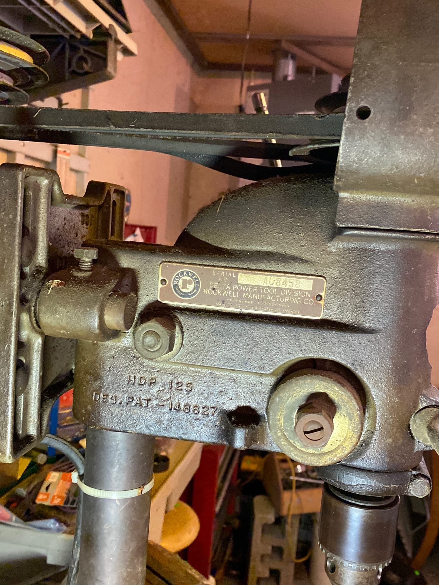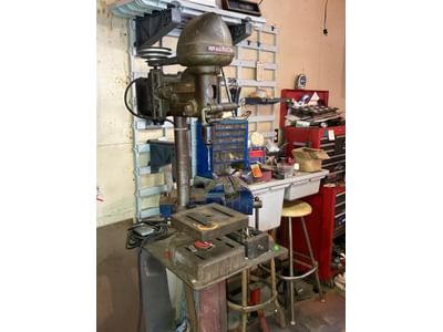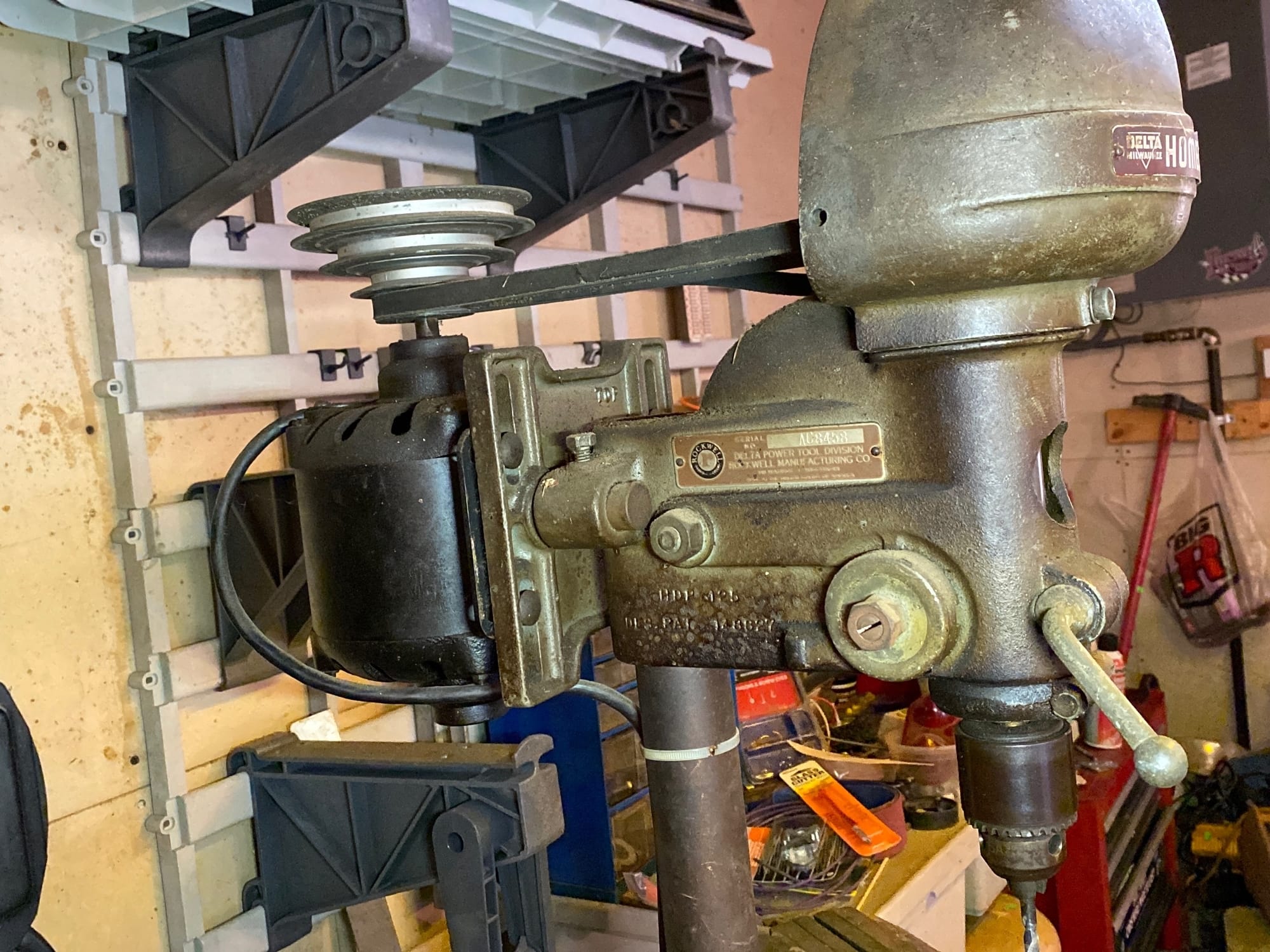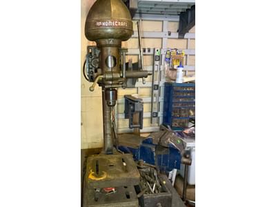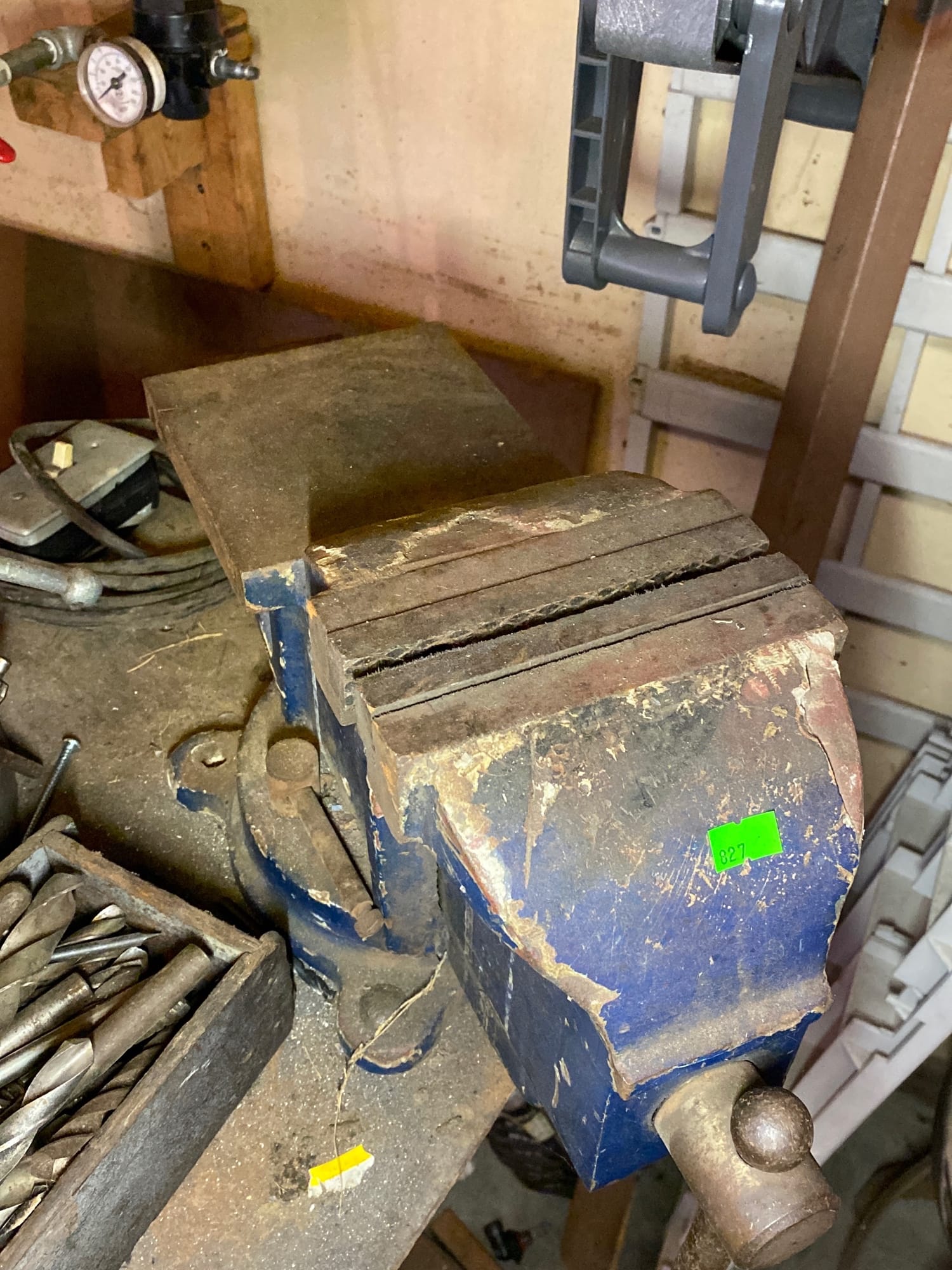 827 Drill bits, Delta homecraft drill press benchtop 33in and China 6in vise mounted on cast iron pedestal 34in tall