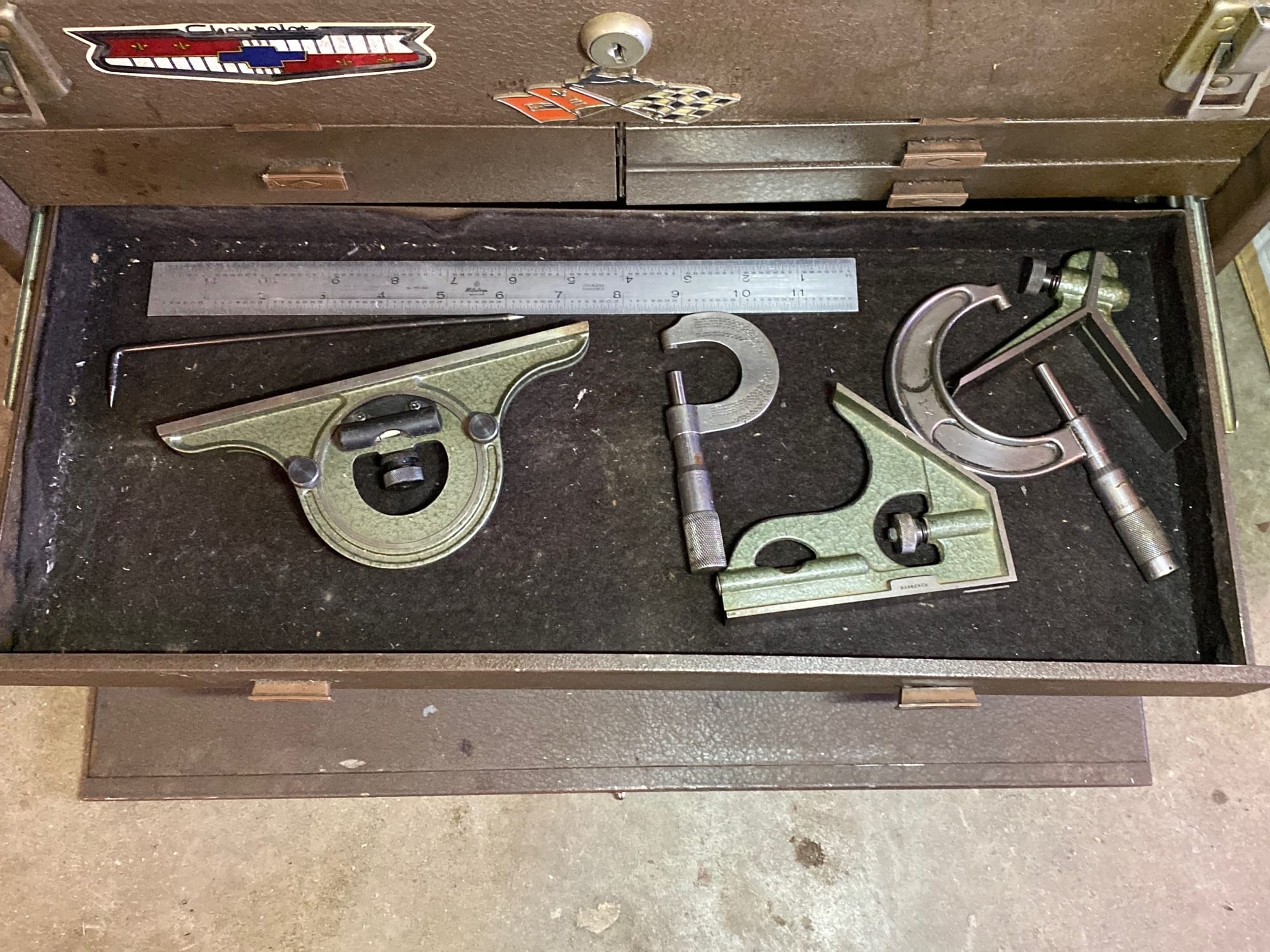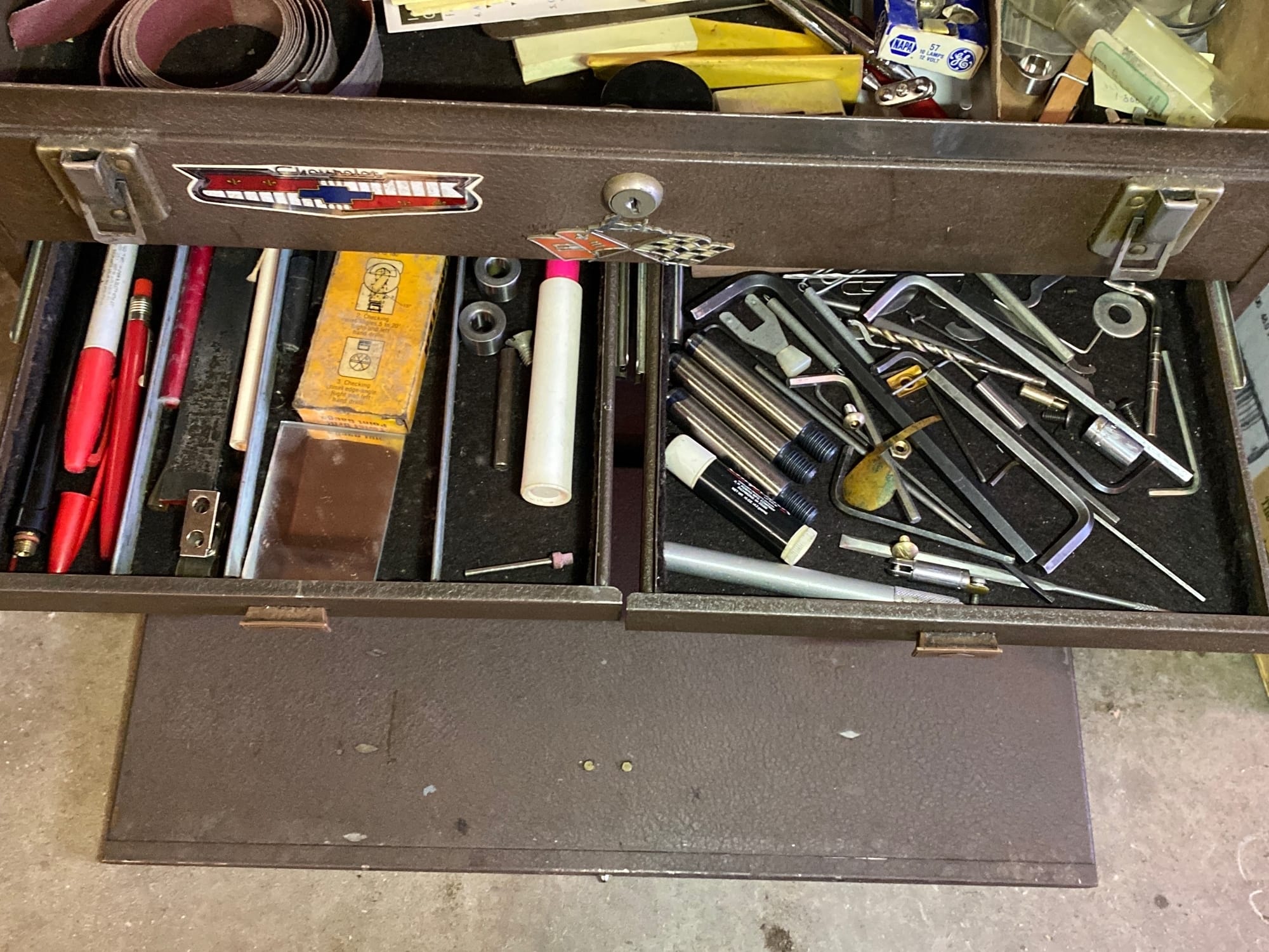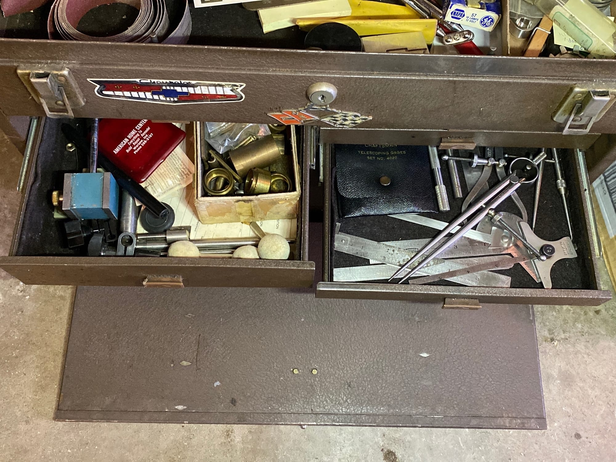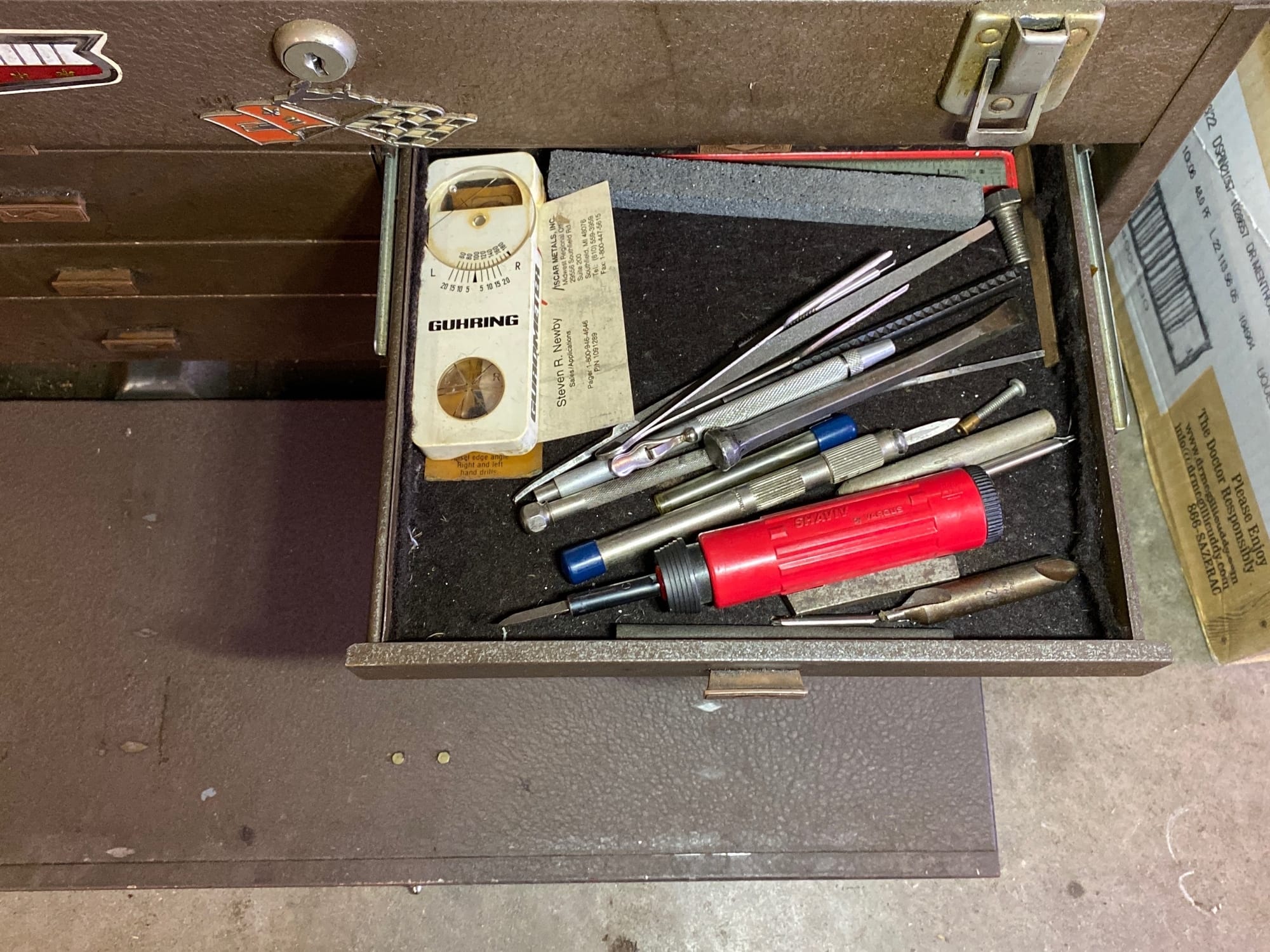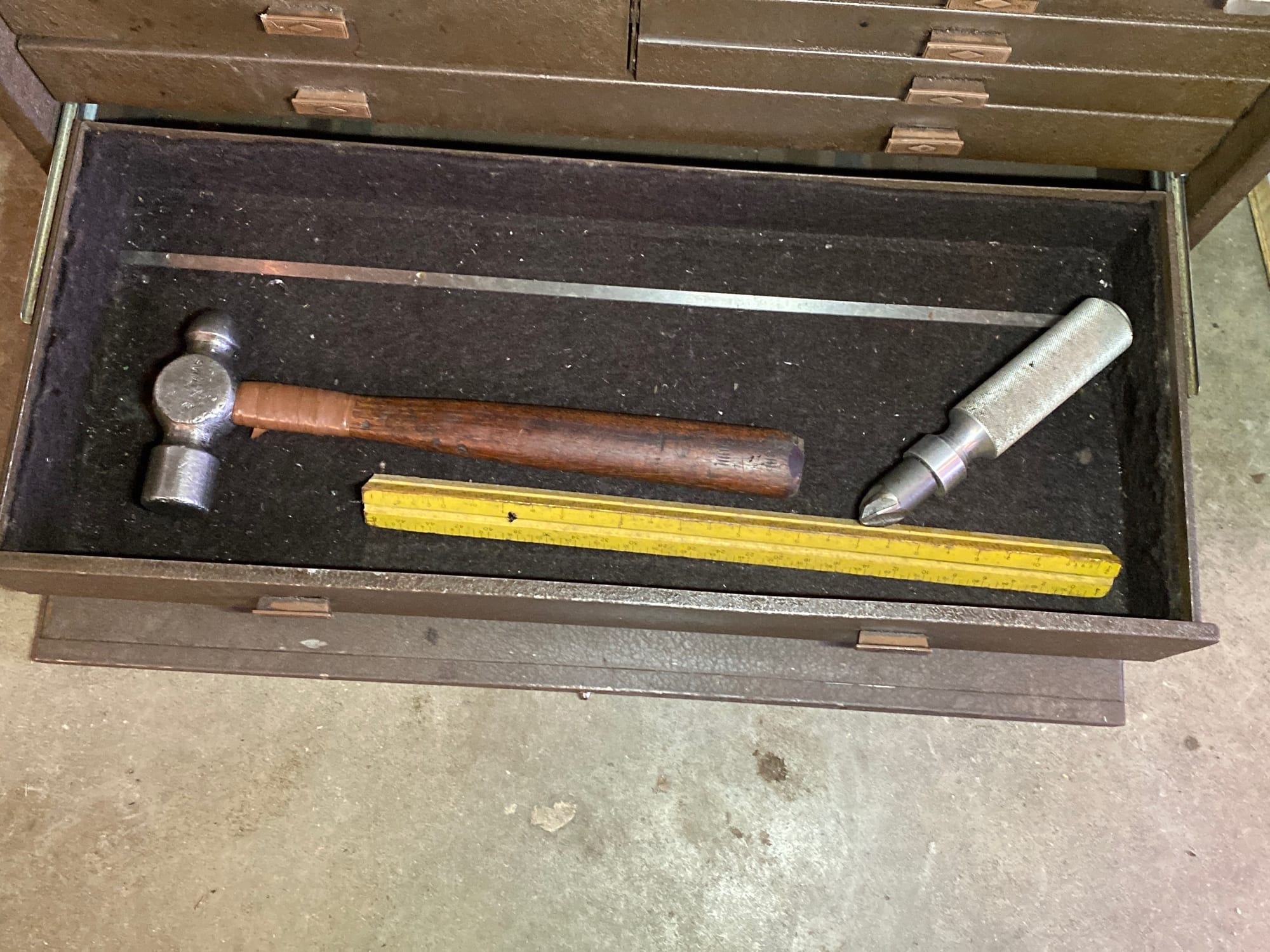 854 Kennedy machinist tool chest with contents inc. measuring devices, tools, hardware and misc. 20x8.5x14