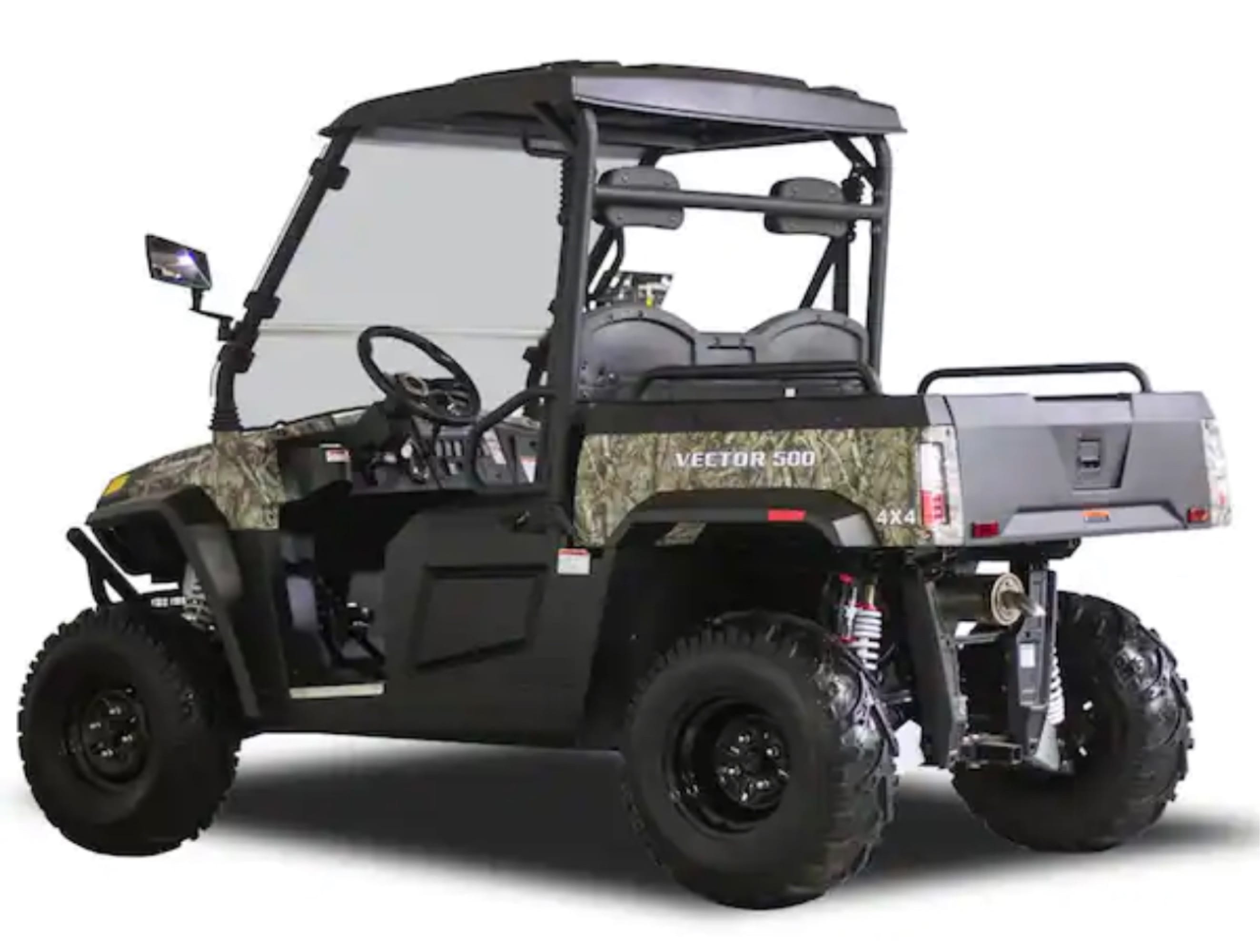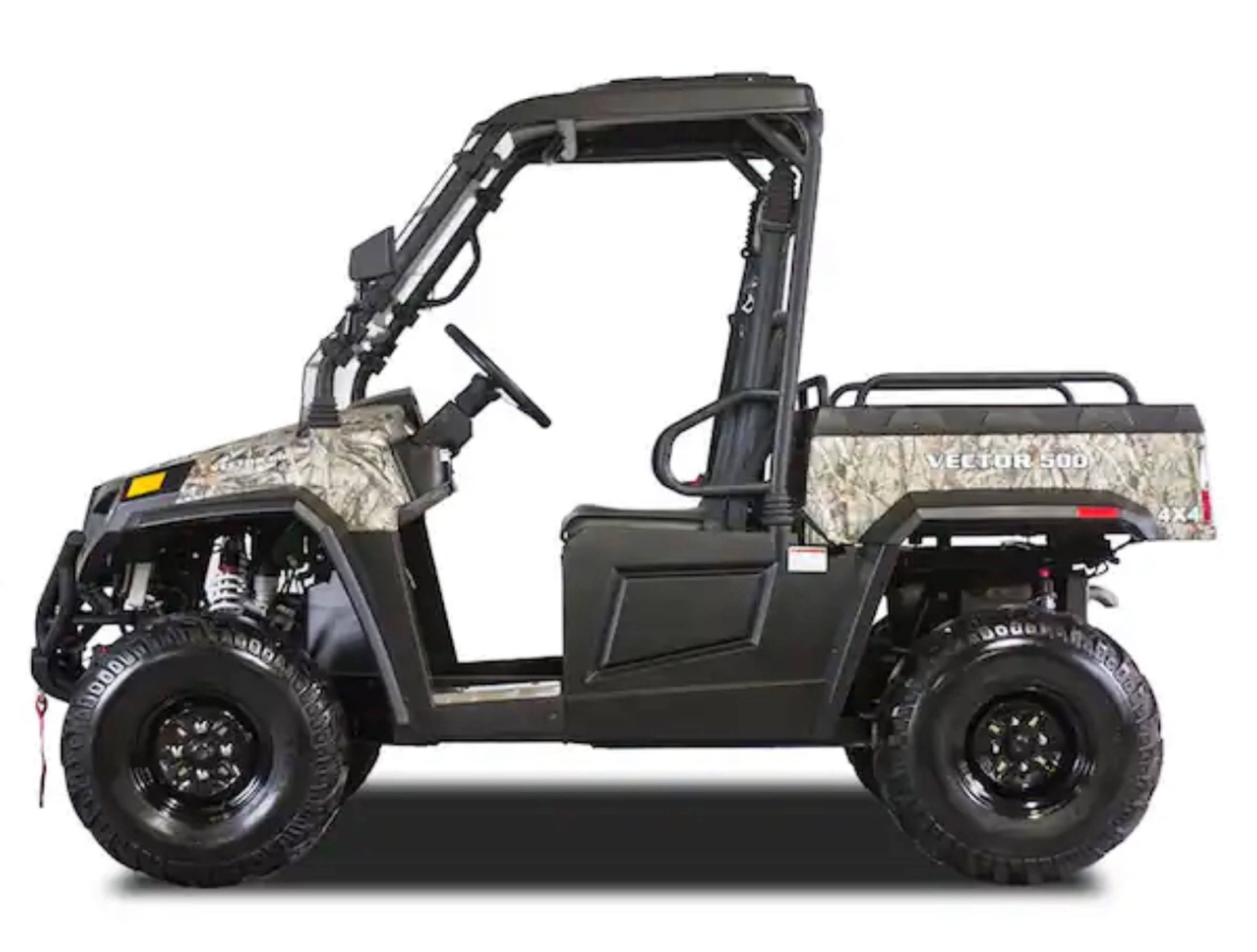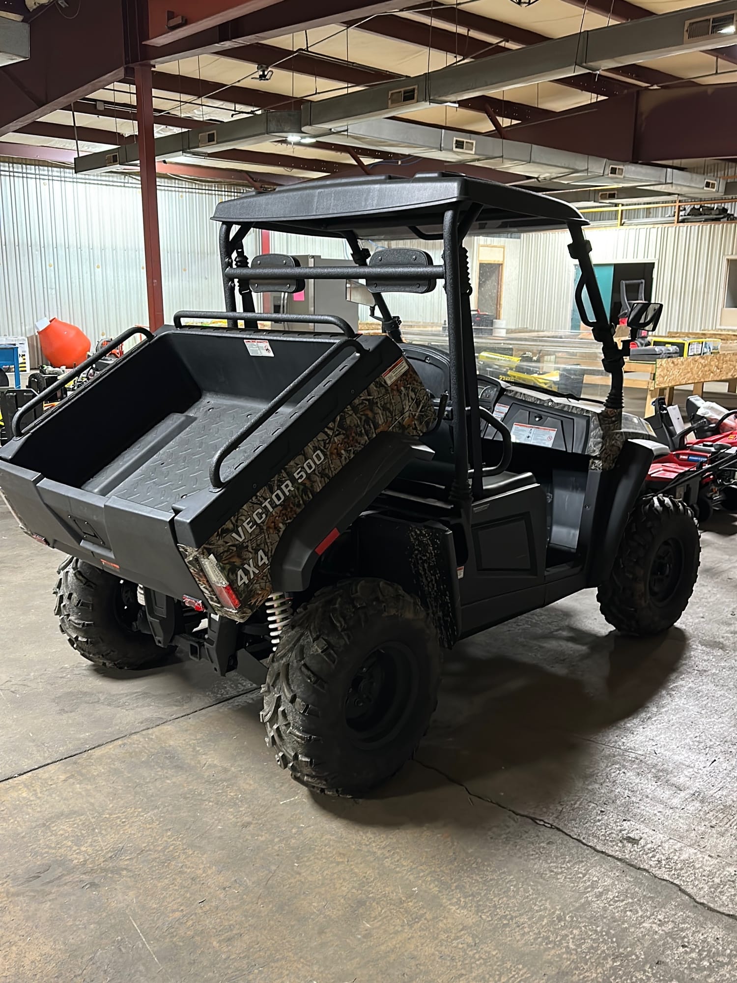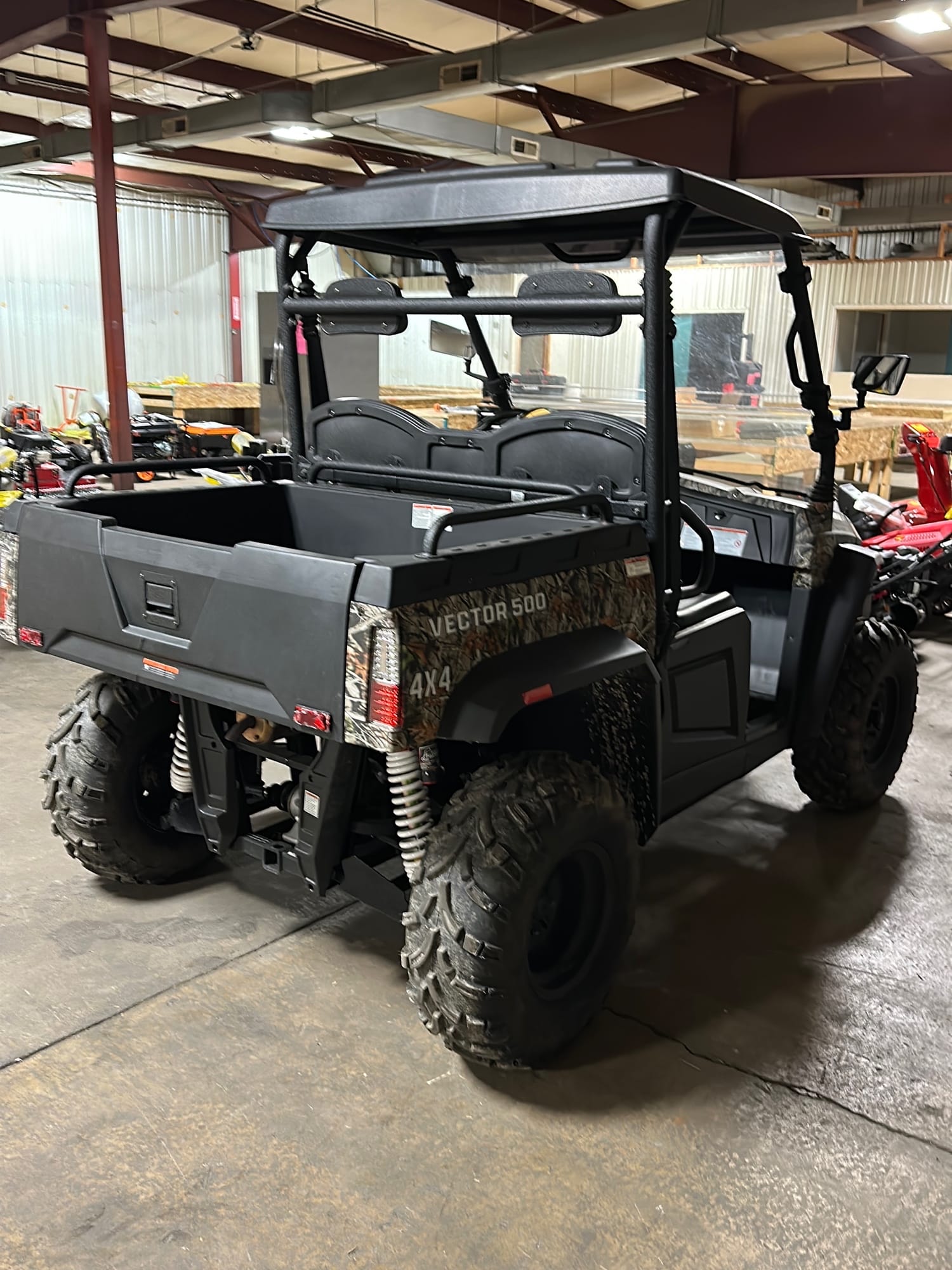 6 Vector 500 UTV 4X4, 471cc, Outside Mirrors, Tilt Wheel, In Camo, Manufacture Date 05/20/2022, 93 Miles, Runs Good, Front Mounted Winch, Manual Dump Bed, Windshield, Does Not Come With Title