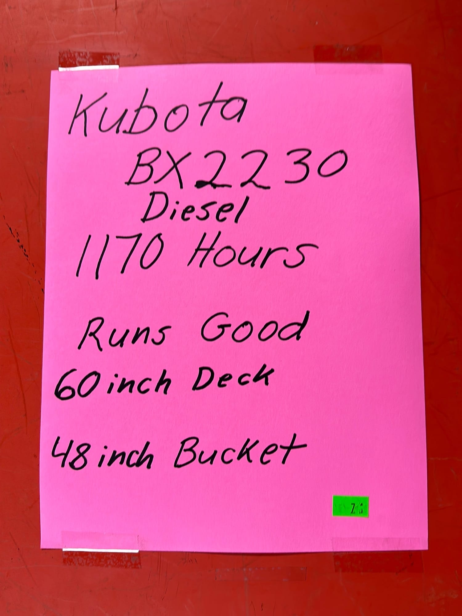 7 Kubota BX2230 0.9 L three-cylinder Diesel Sub Compact Tractor ONLY 1170 HOURS!!! 4X4, Power Steering, 3 Point Hitch With 540 PTO Differential Lock, Cruise Control, Headlights, Turn Signals, 4 Ways, 60" Mower Deck, 48” Bucket, Runs Good, Has Keys