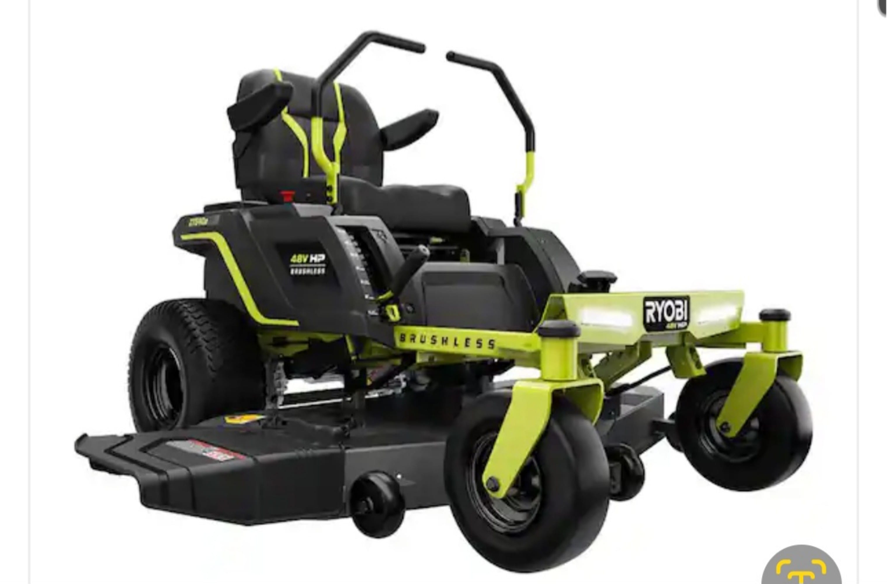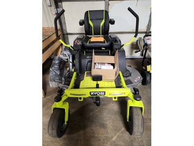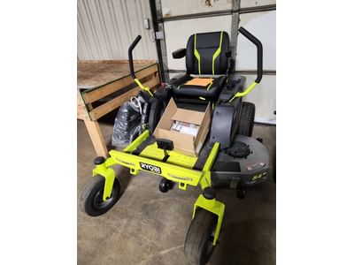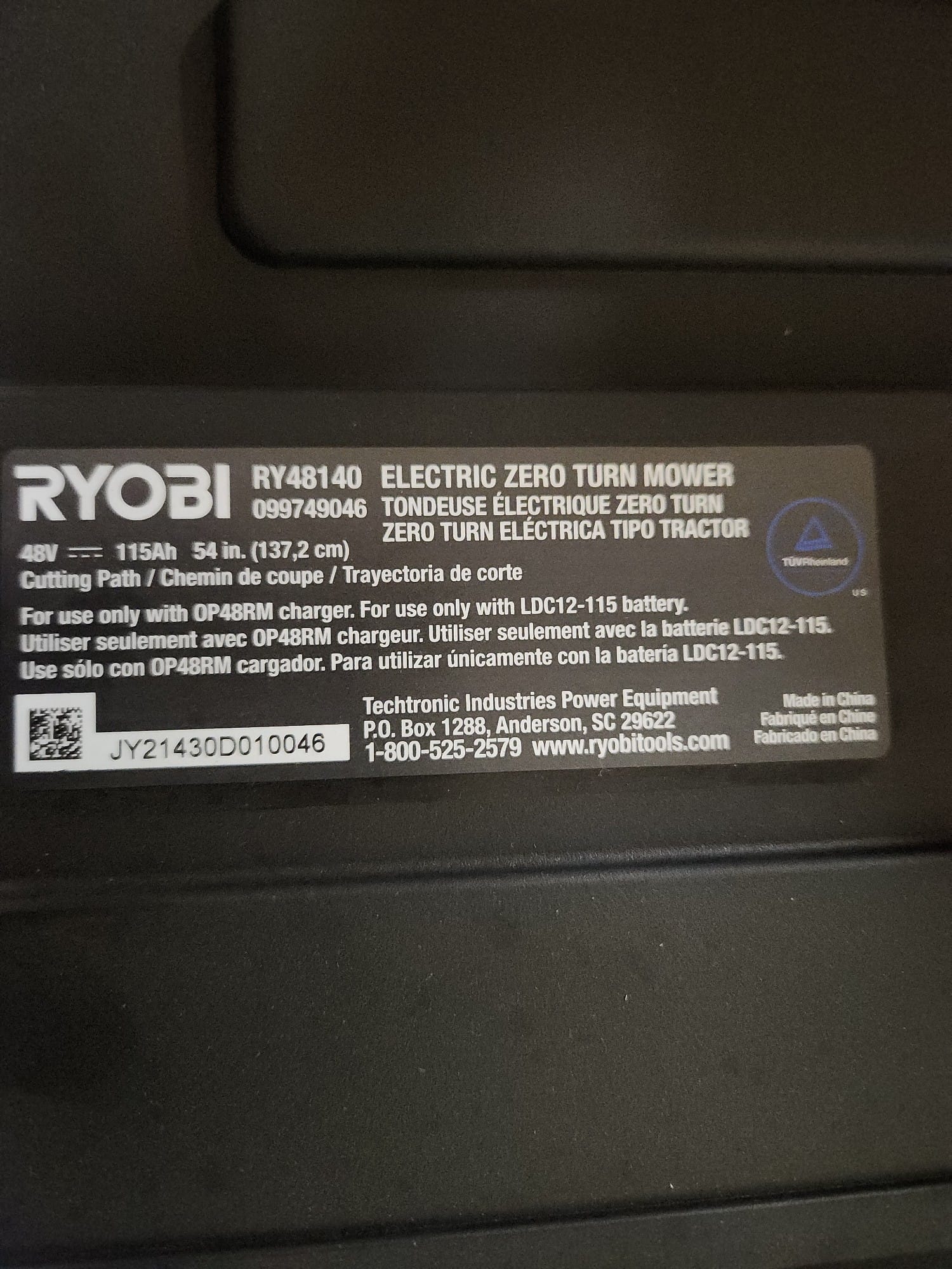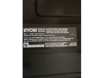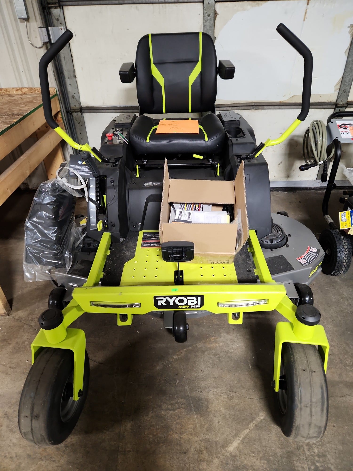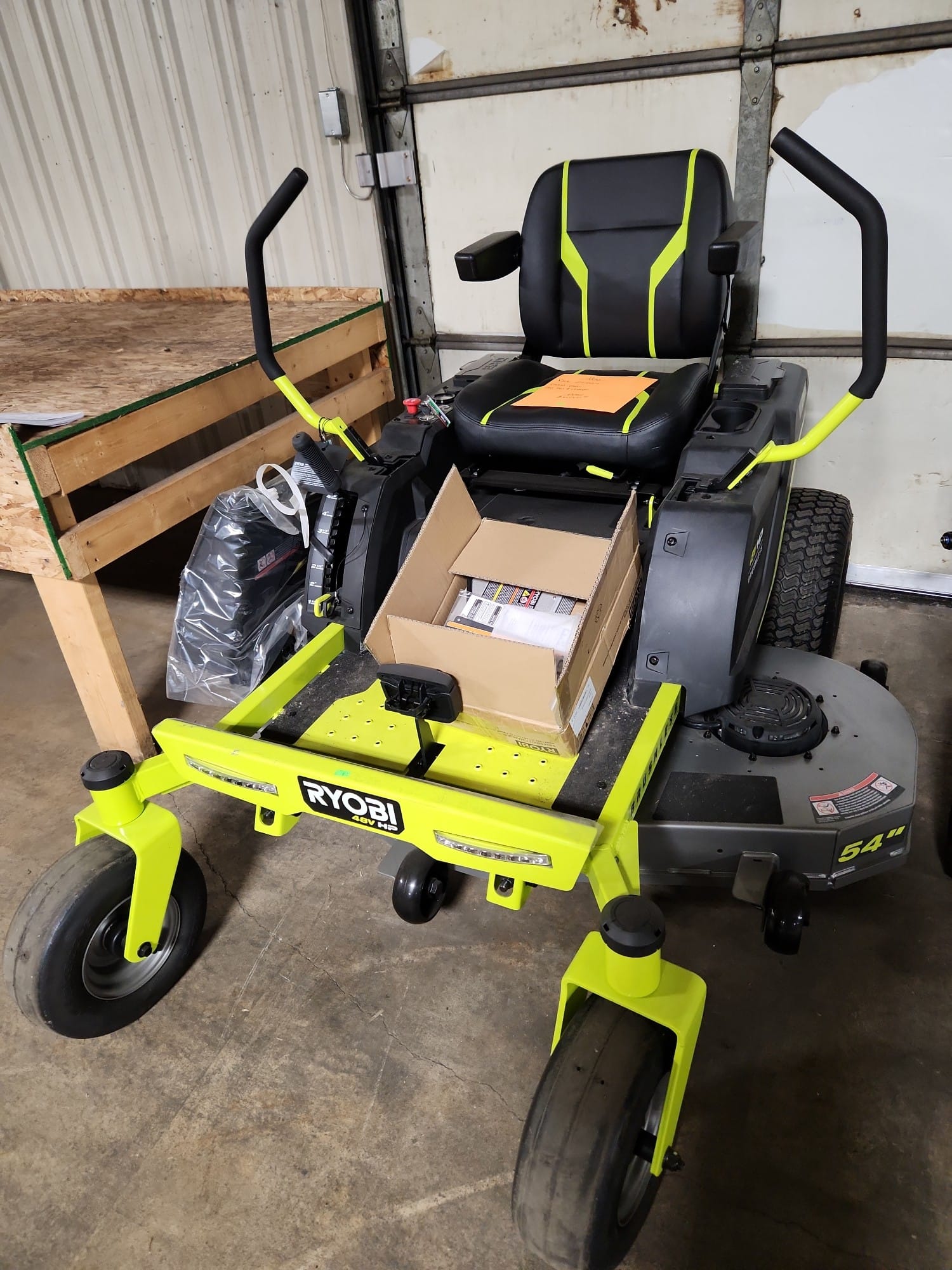 8 Ryobi ELECTRIC ZERO TURN MOWER 48V HP ZT540E HAS KEY AND CHARGER HAS CRACK IN PLASTIC
