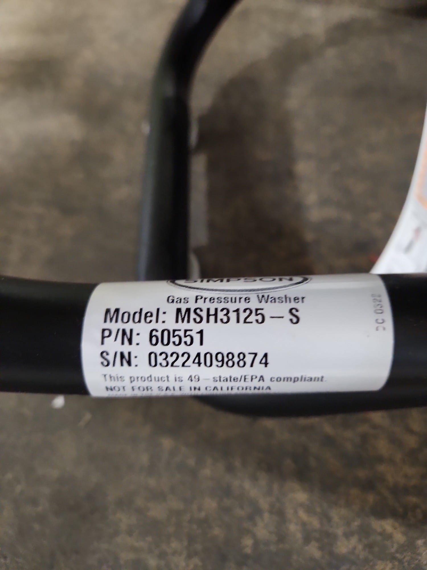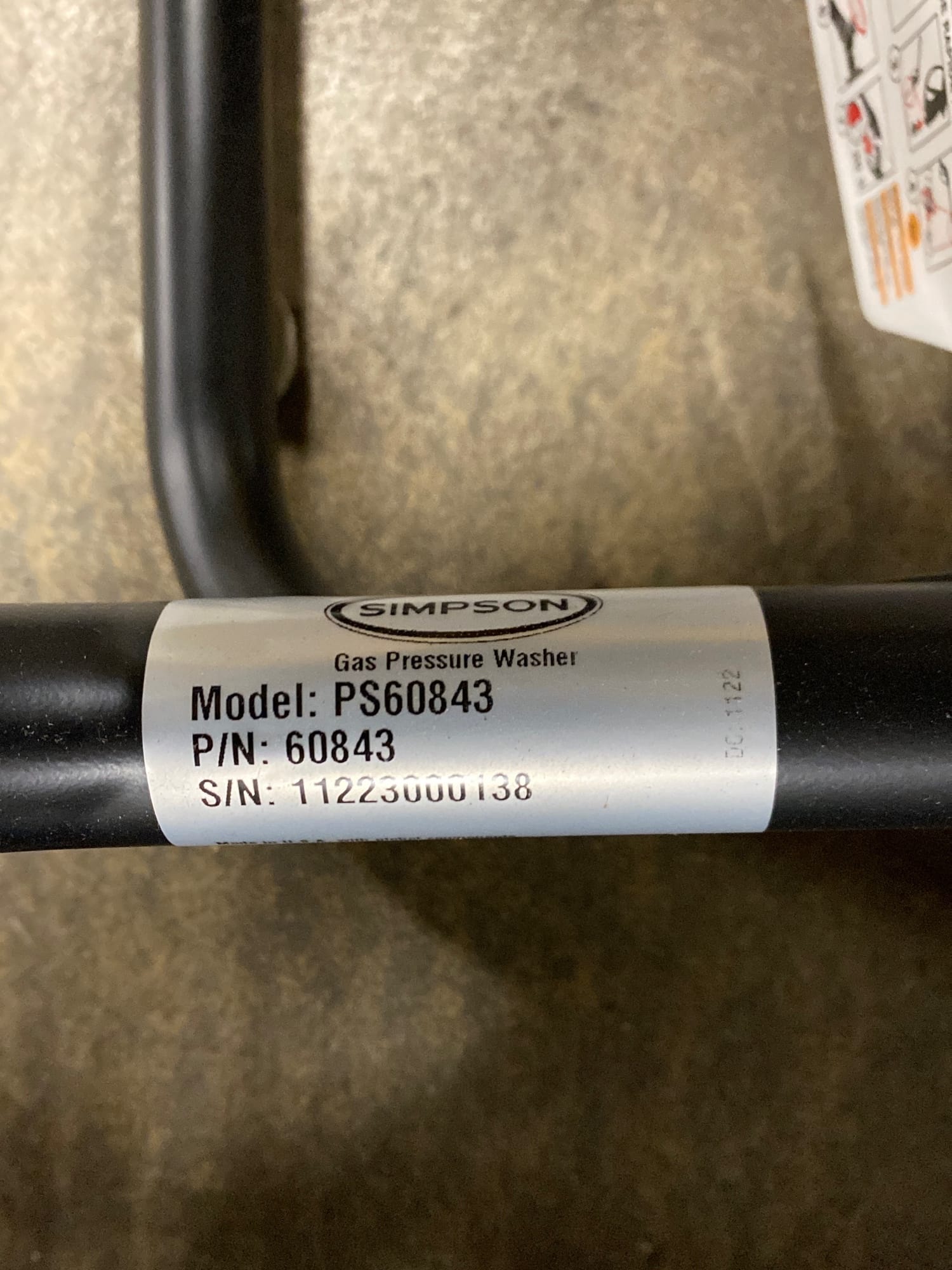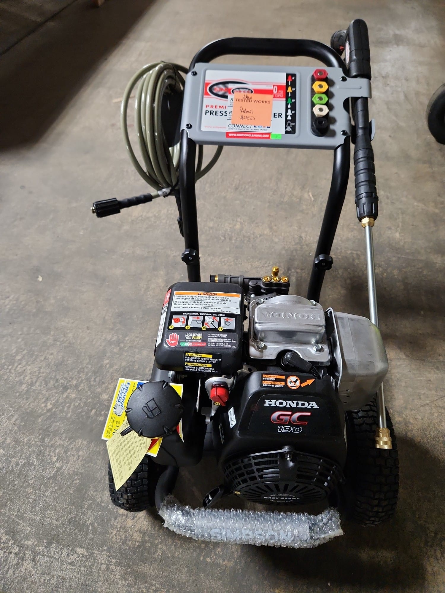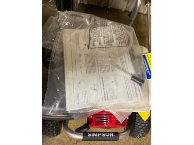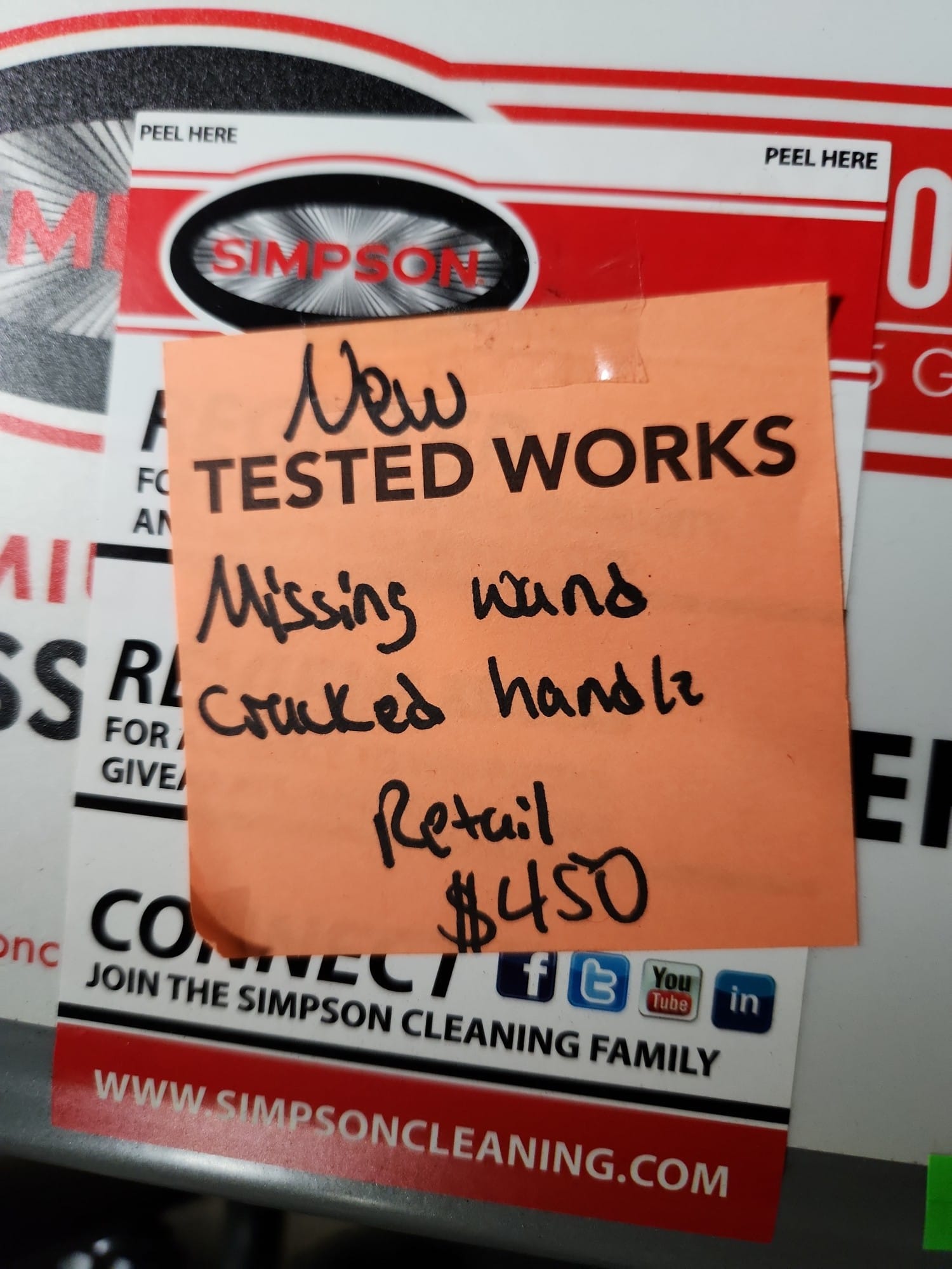 10 "Simpson Gas Pressure Washer, 2.5 GPM, Honda GC190 Engine, Includes Spray Gun and Extension Wand, 5 QC Nozzle Tips, 1/4-in. x 25-ft. MorFlex Hose, (49-State), Black Missing hardware and has crack in wand"