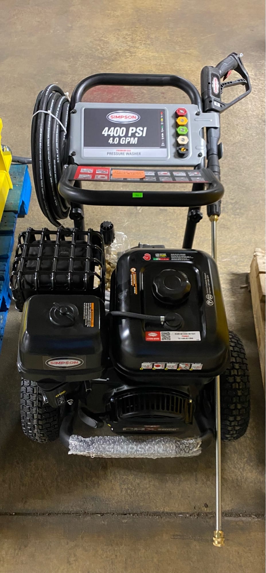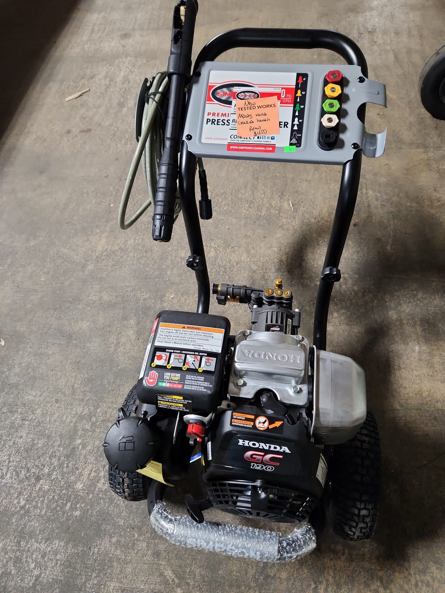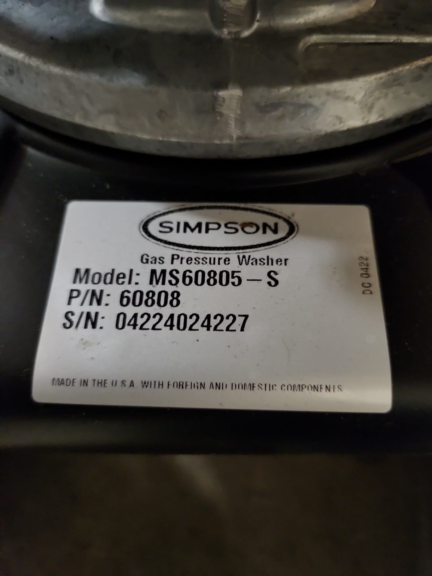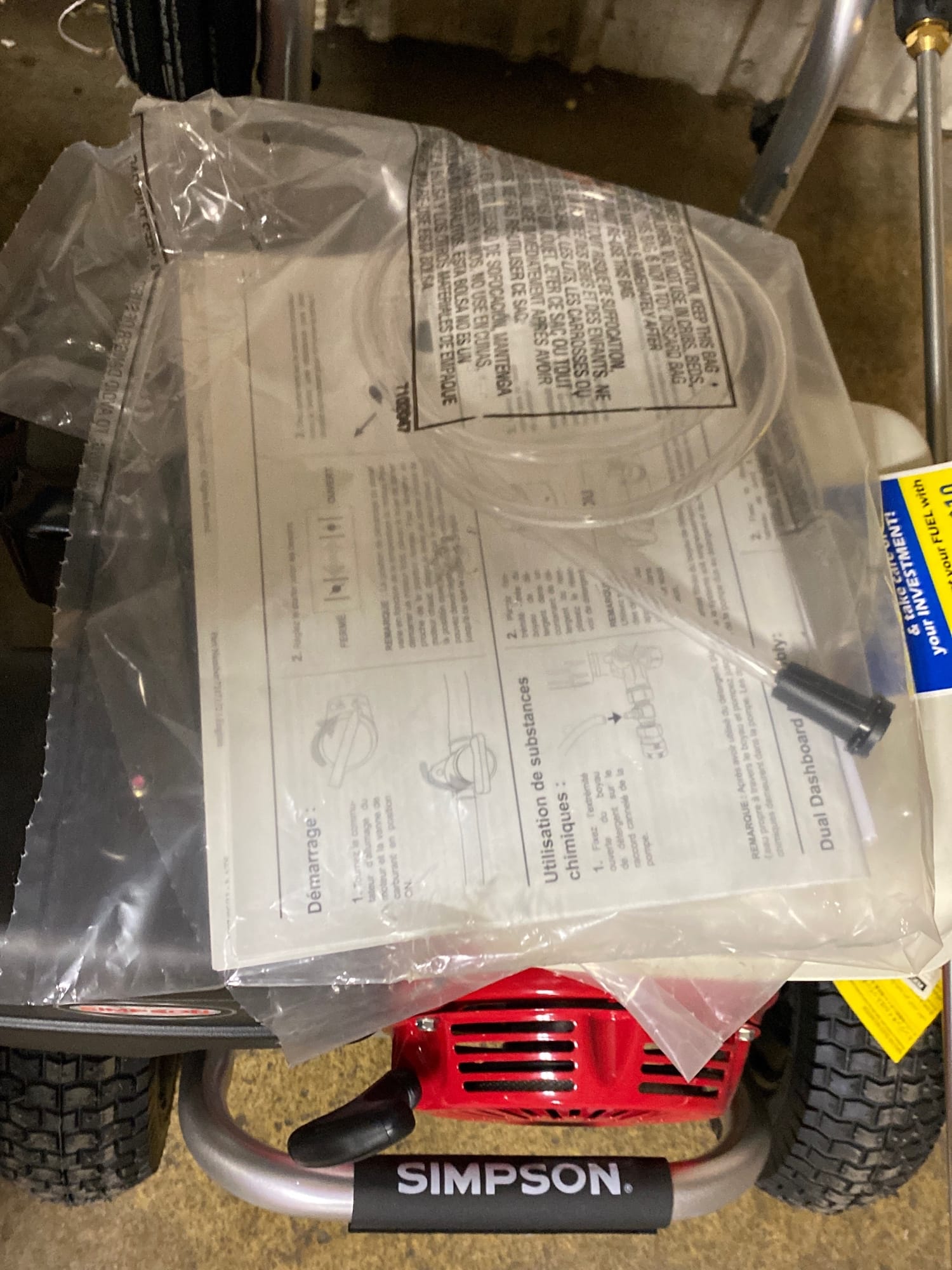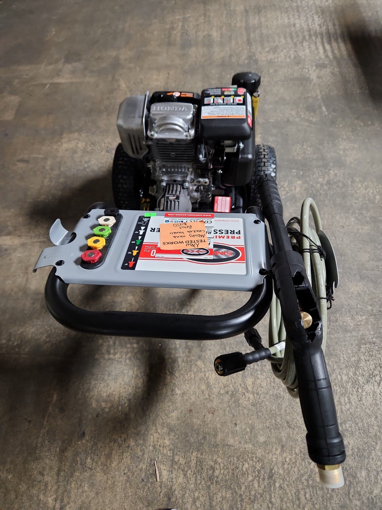 10 "Simpson Gas Pressure Washer, 2.5 GPM, Honda GC190 Engine, Includes Spray Gun and Extension Wand, 5 QC Nozzle Tips, 1/4-in. x 25-ft. MorFlex Hose, (49-State), Black Missing hardware and has crack in wand"