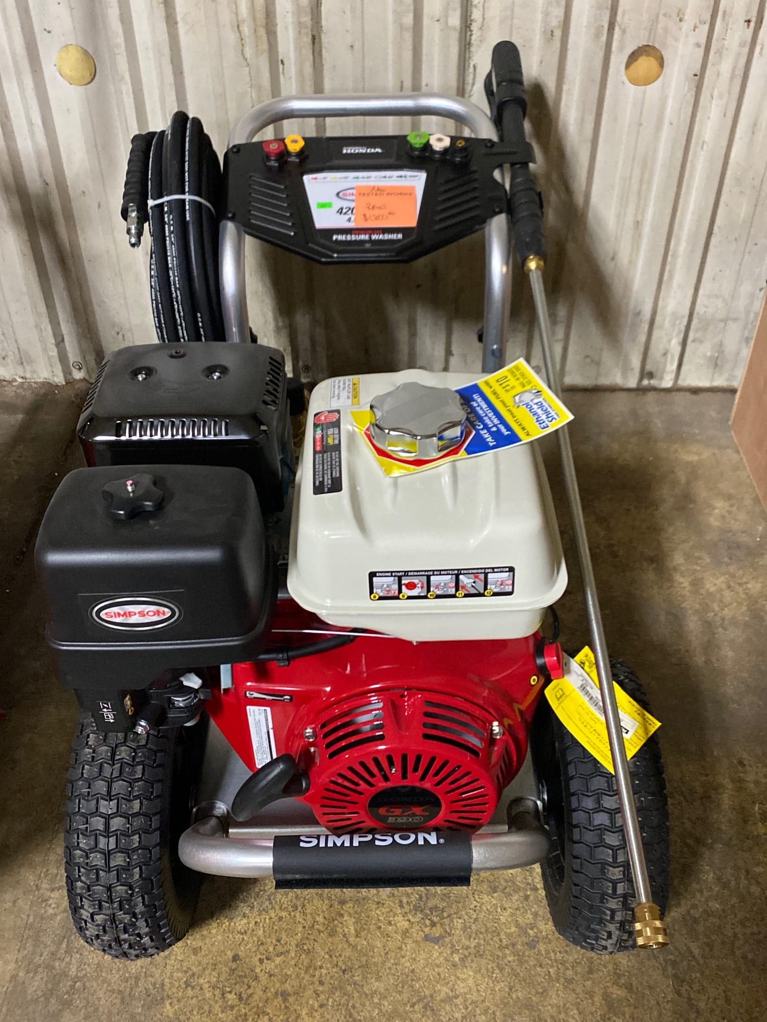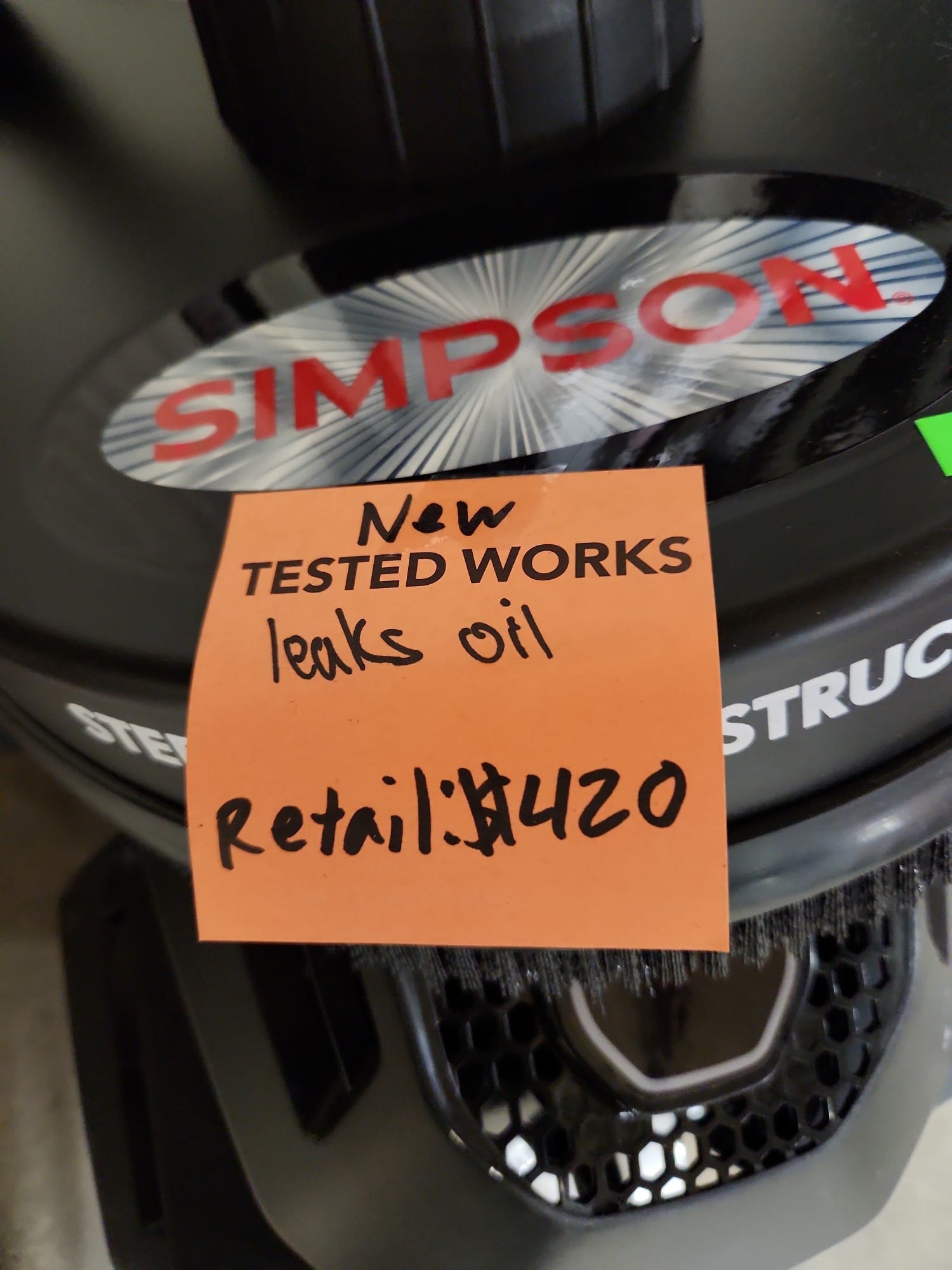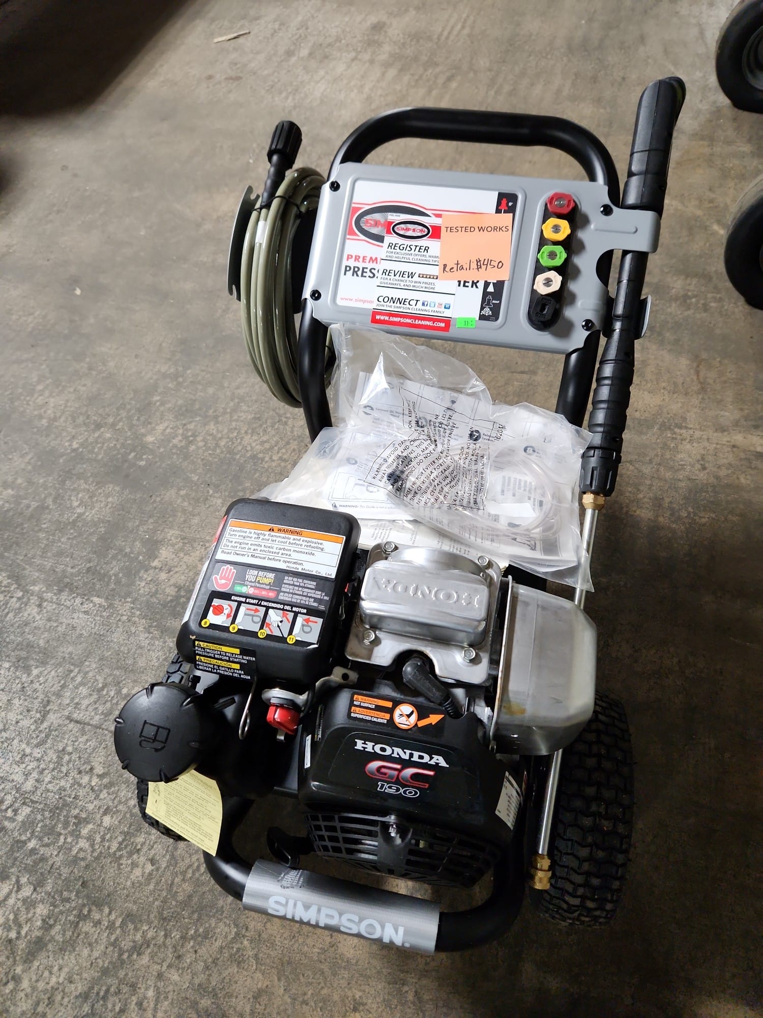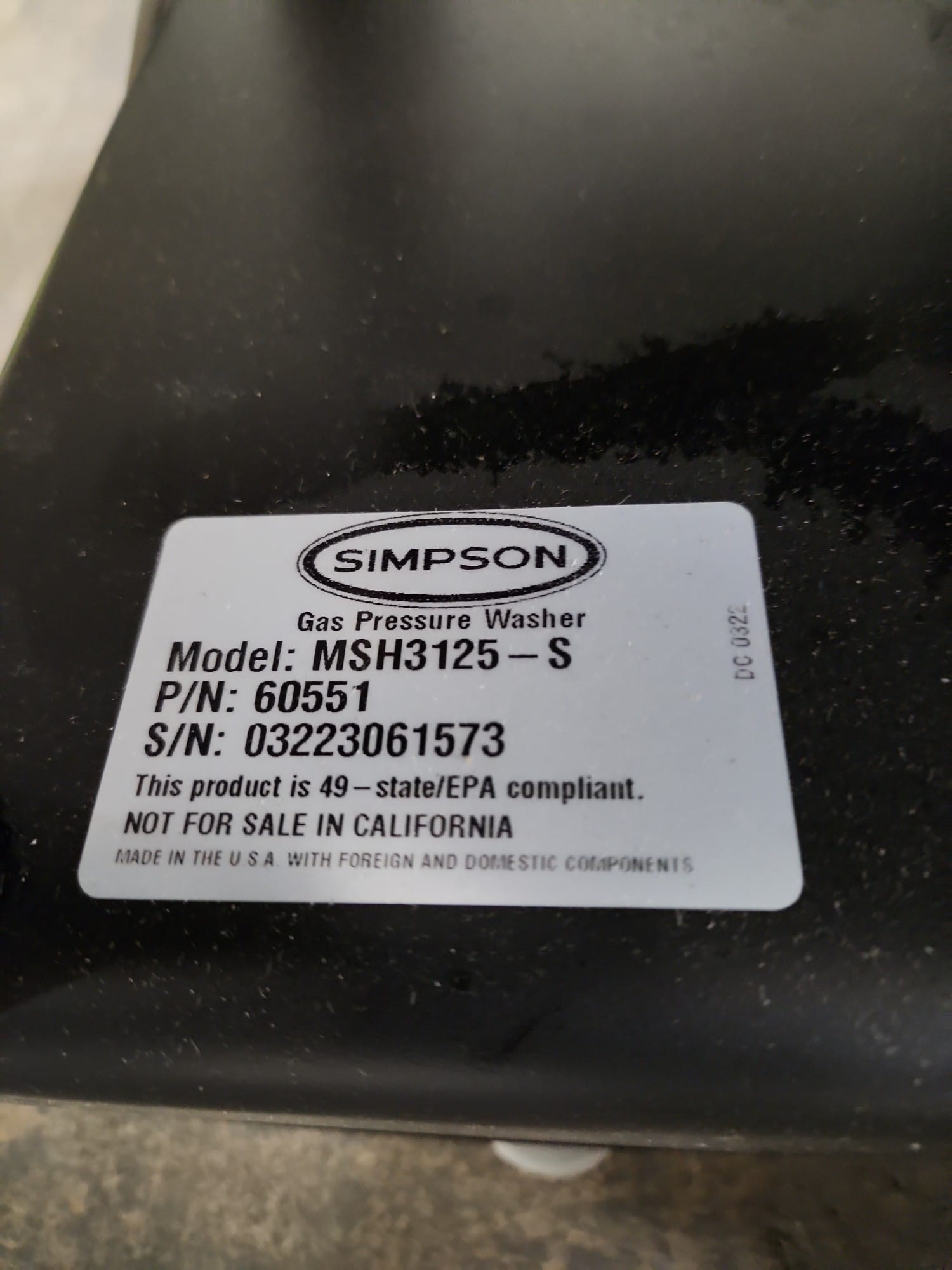 10 "Simpson Gas Pressure Washer, 2.5 GPM, Honda GC190 Engine, Includes Spray Gun and Extension Wand, 5 QC Nozzle Tips, 1/4-in. x 25-ft. MorFlex Hose, (49-State), Black Missing hardware and has crack in wand"