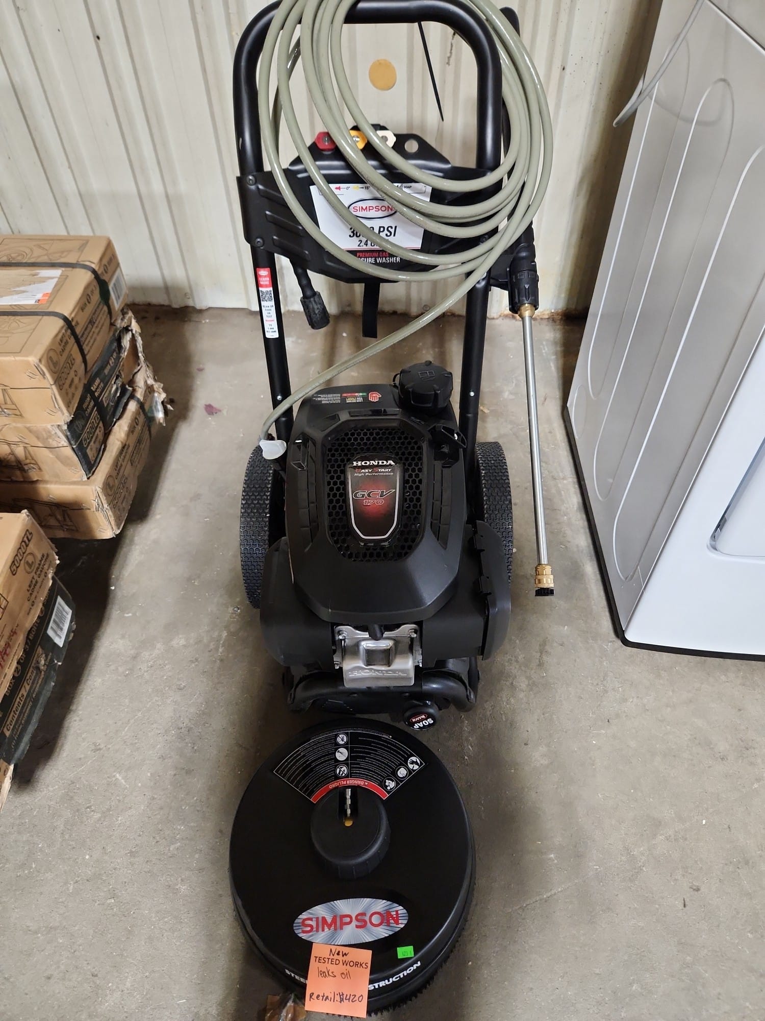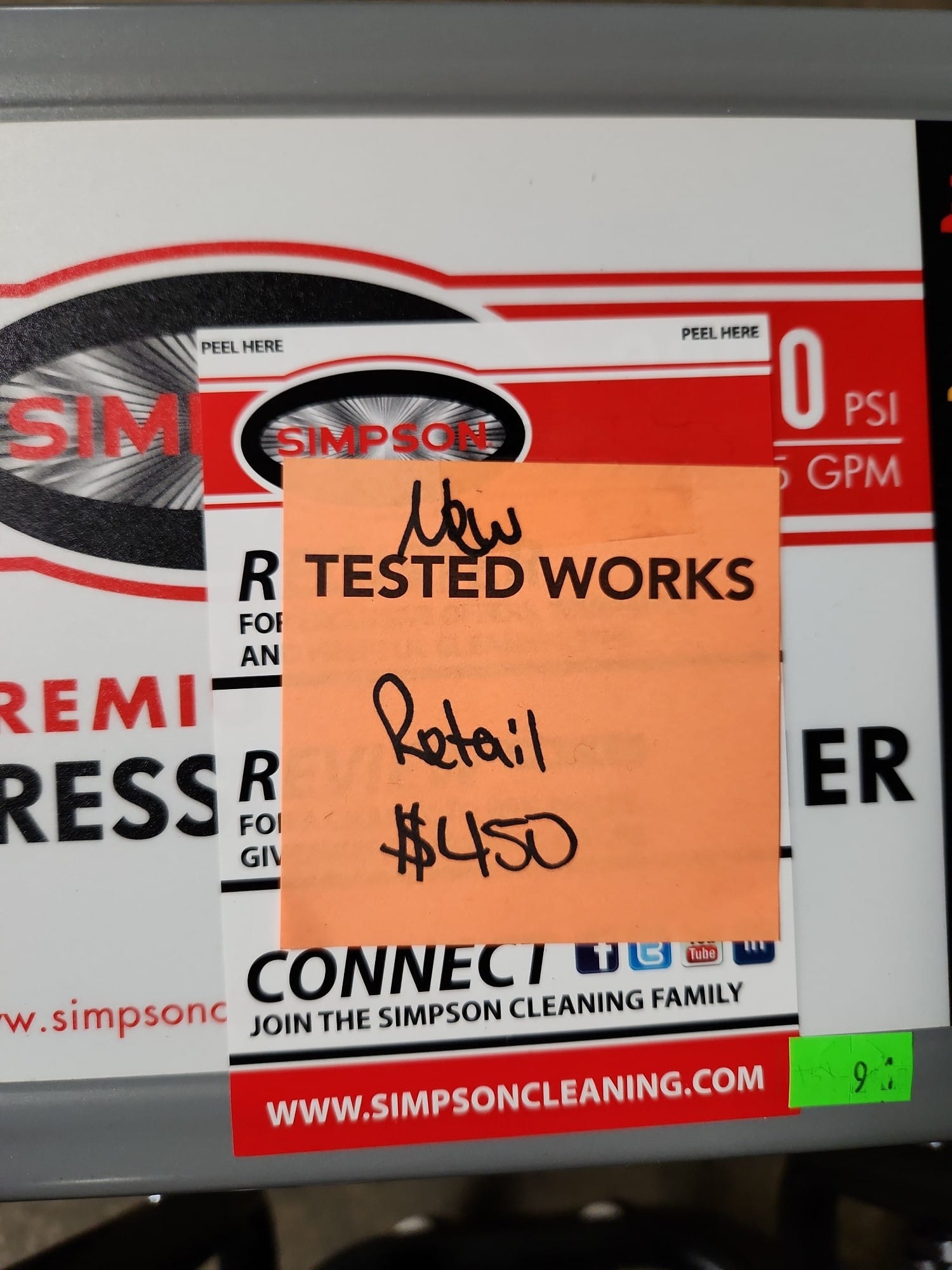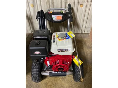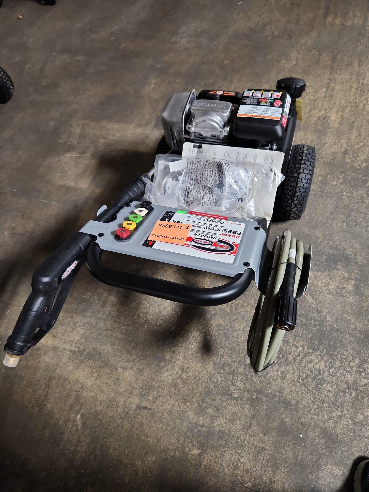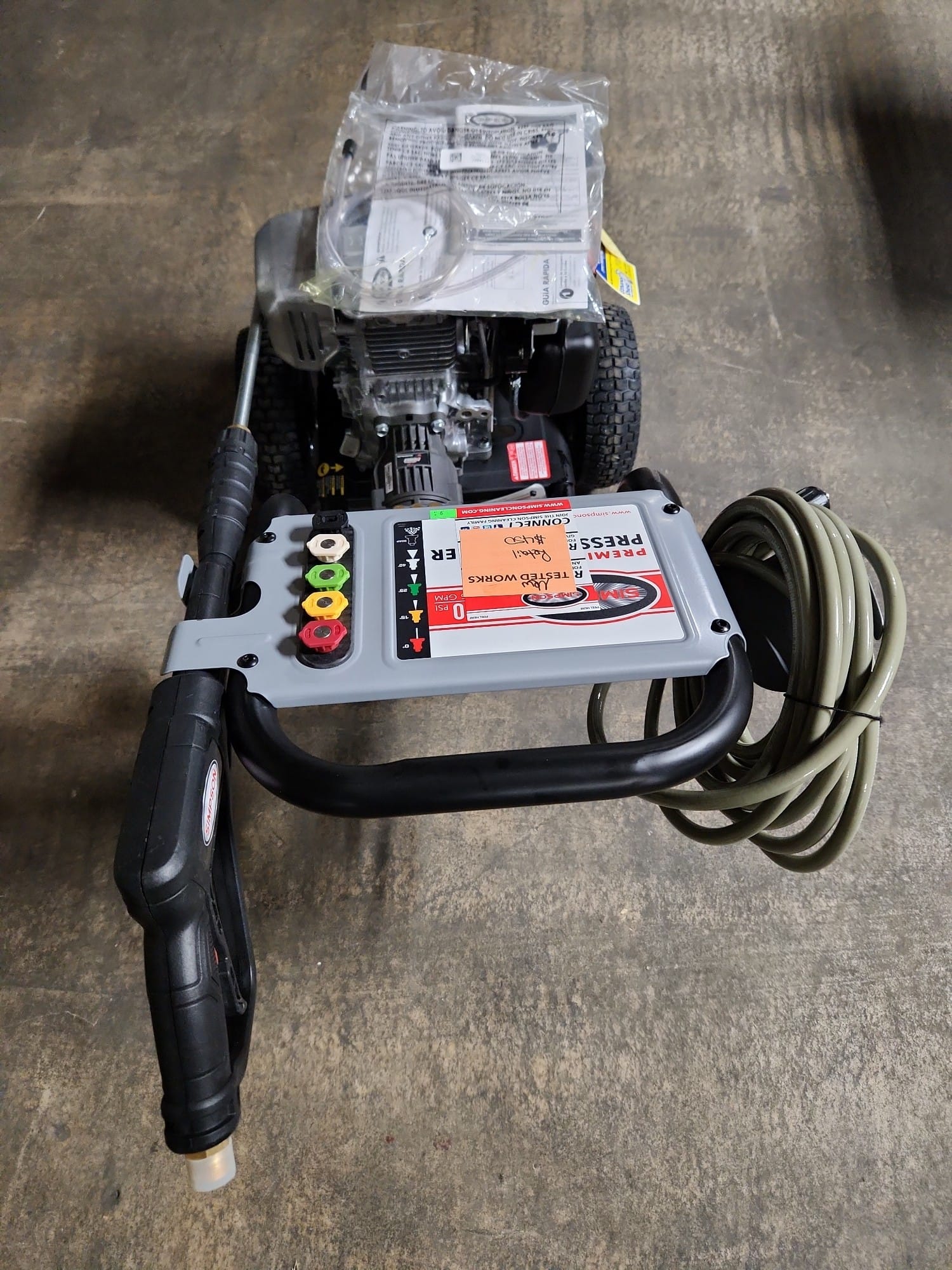 10 "Simpson Gas Pressure Washer, 2.5 GPM, Honda GC190 Engine, Includes Spray Gun and Extension Wand, 5 QC Nozzle Tips, 1/4-in. x 25-ft. MorFlex Hose, (49-State), Black Missing hardware and has crack in wand"