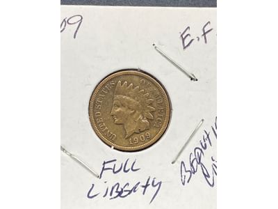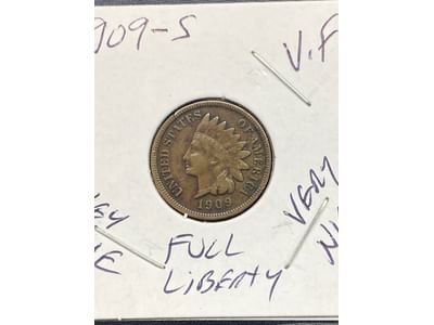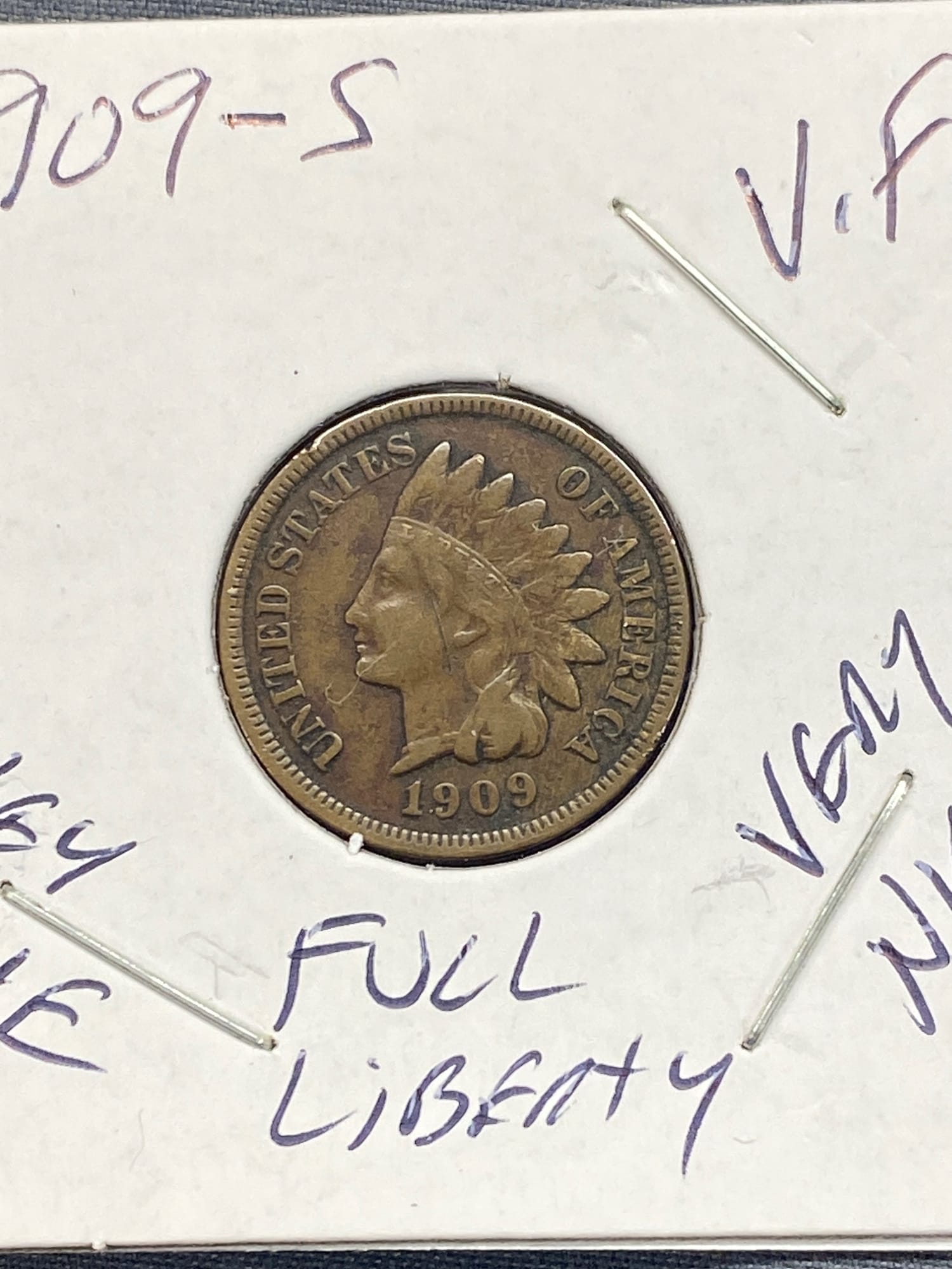 20 1909-S Indian Penny V. F. Full Liberty, Key Date