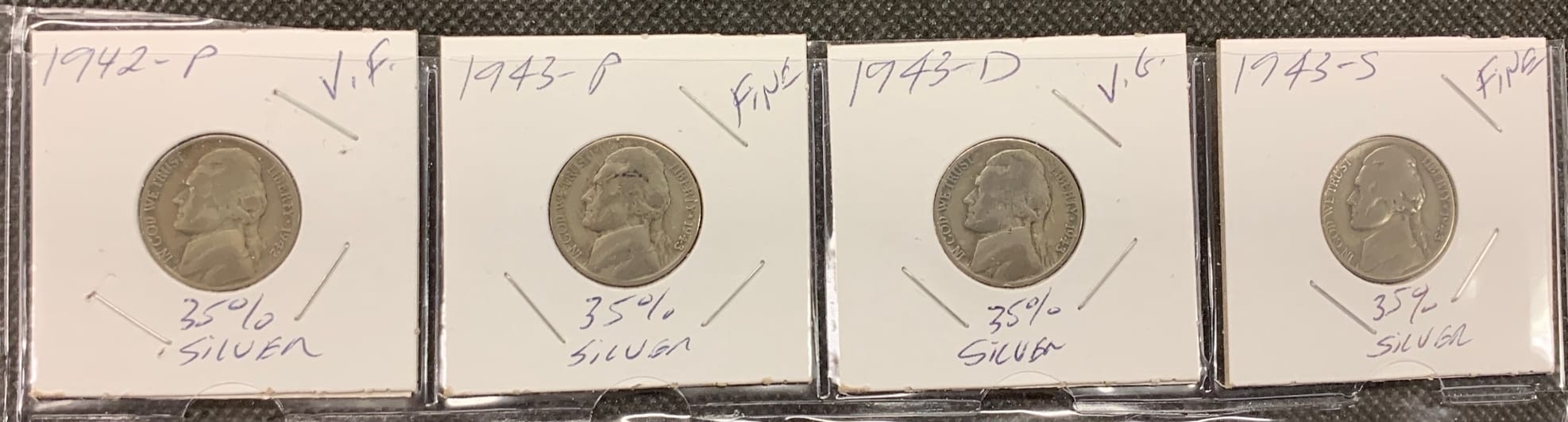 587 4 - Jefferson Nickels, 1942-P, 1943-P, 1943-D, 1943-S
