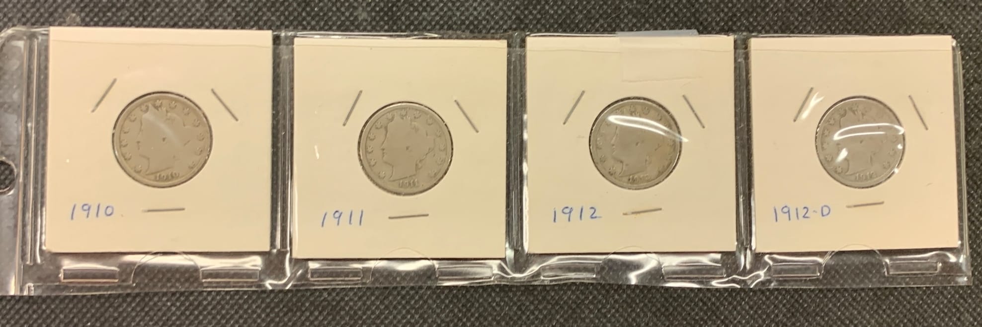 626 4 - Liberty “V” Nickels, 1910, 1911, 1912, 1912-D