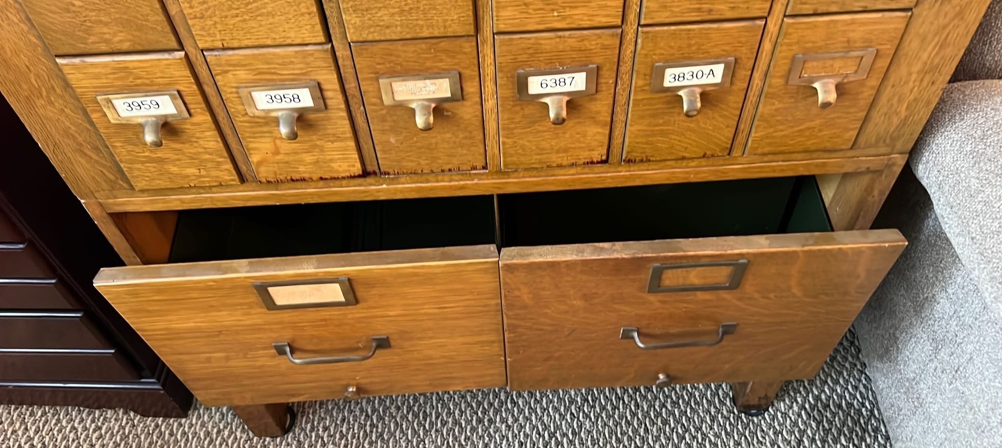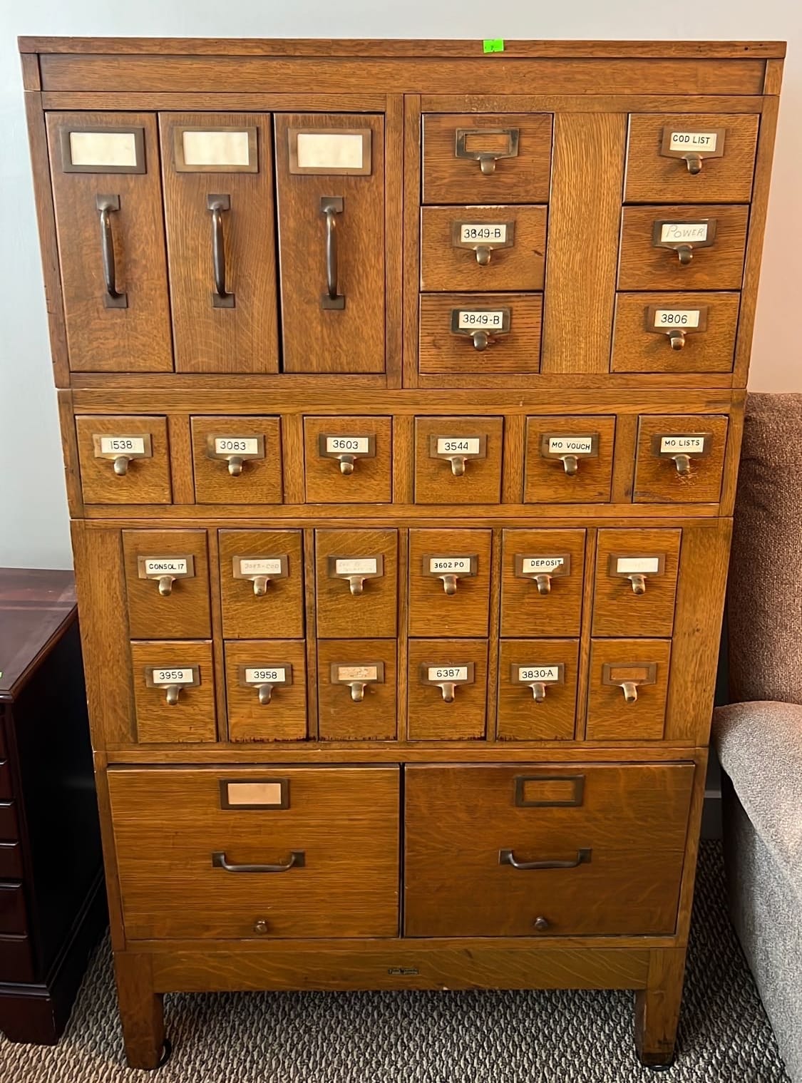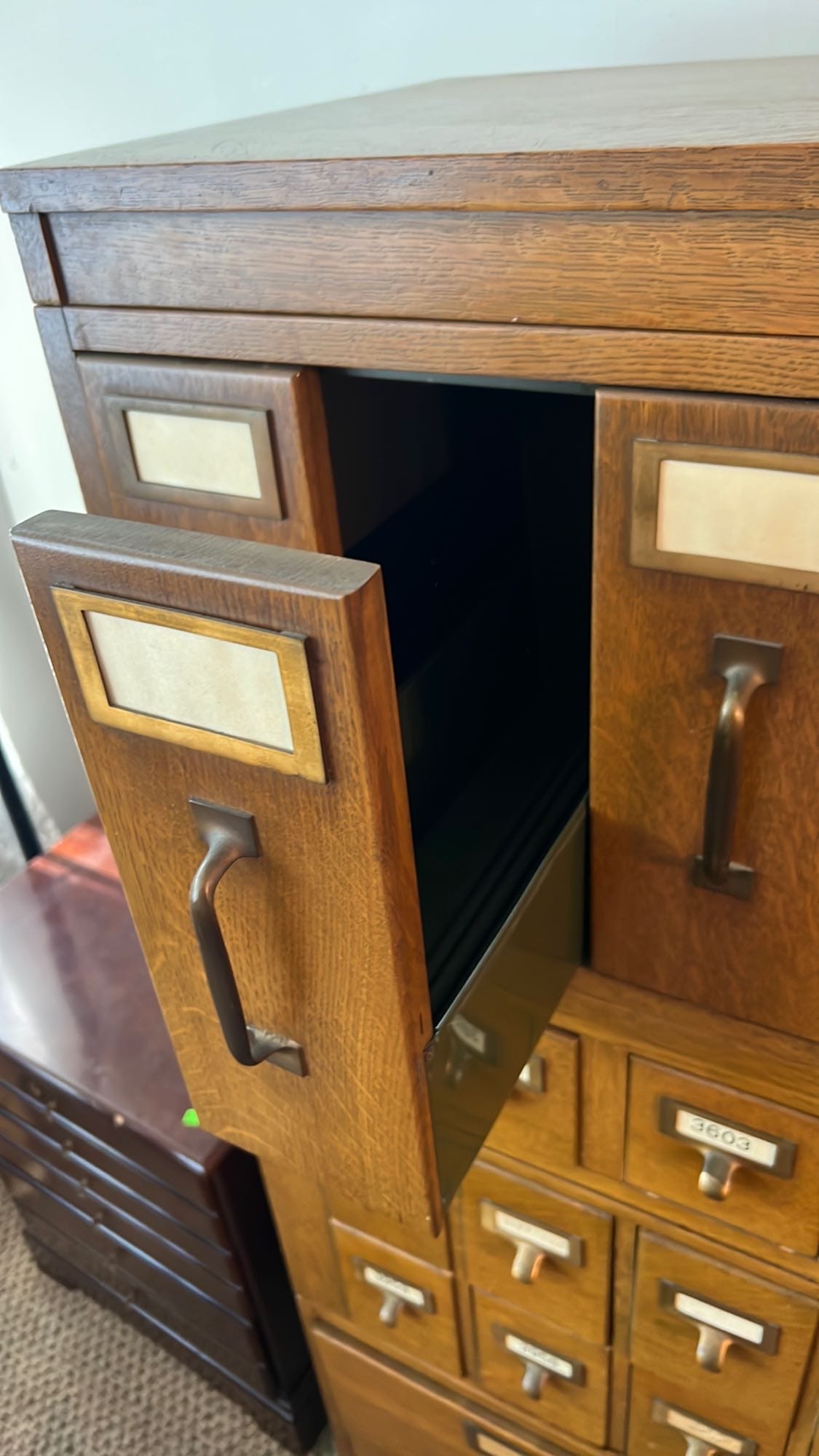 2 Mid-century, modern library, card file cabinet with metal drawers 17”x 33”x 57.5”