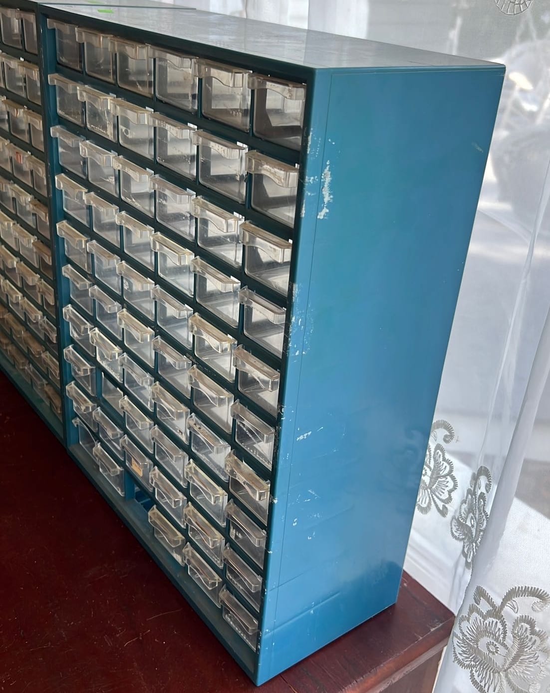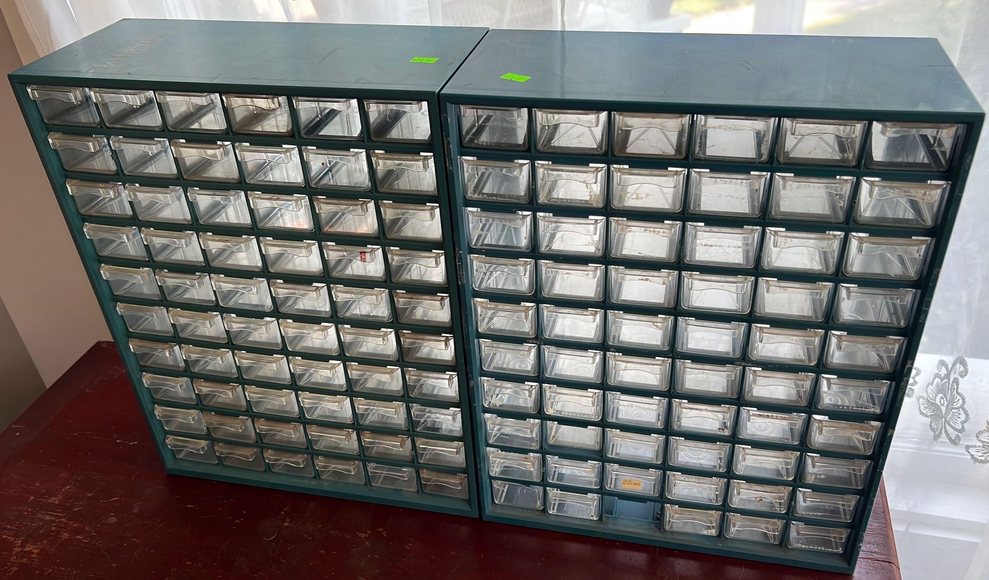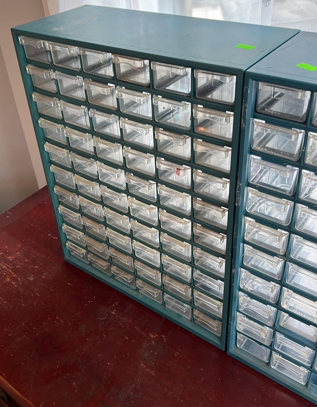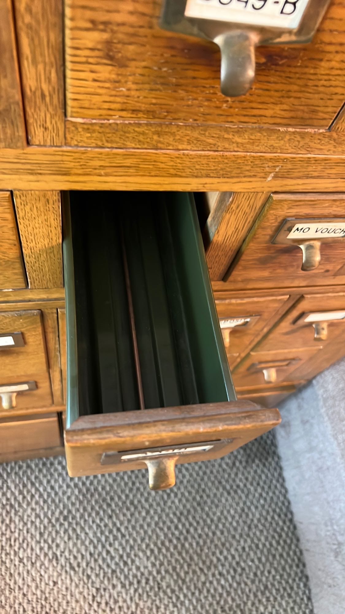 2 Mid-century, modern library, card file cabinet with metal drawers 17”x 33”x 57.5”
