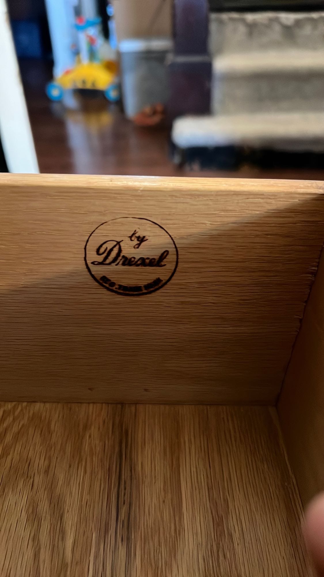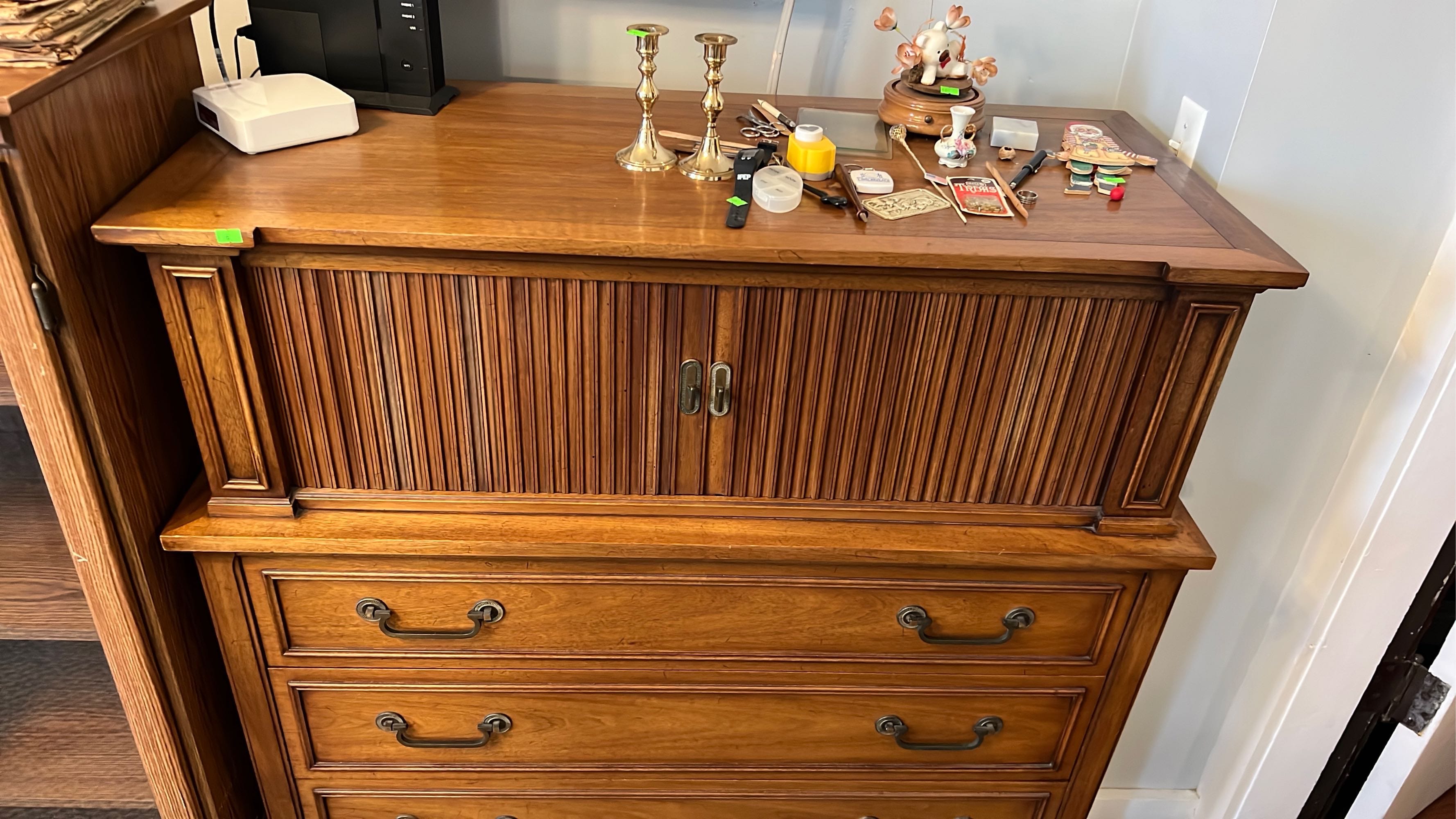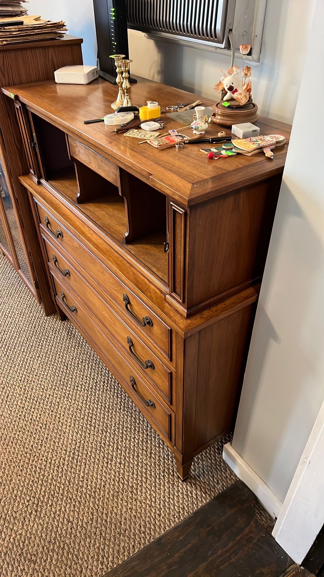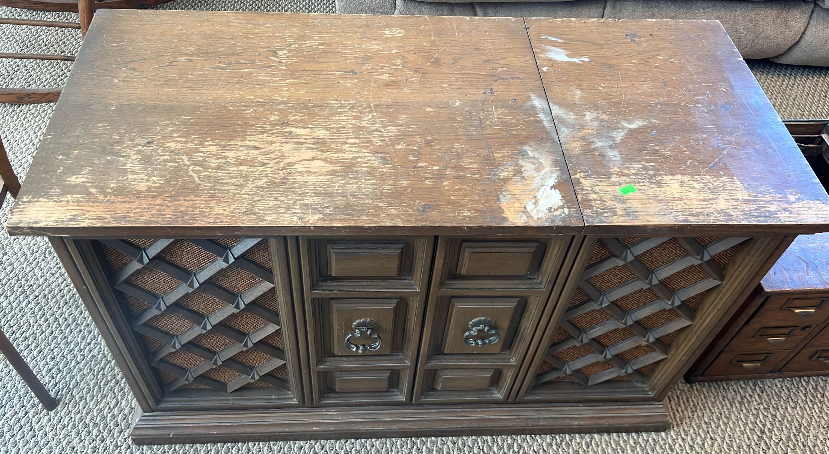 6 Vintage Drexel Dresser with roll open door storage 20”x44”x43.5”, contents not included