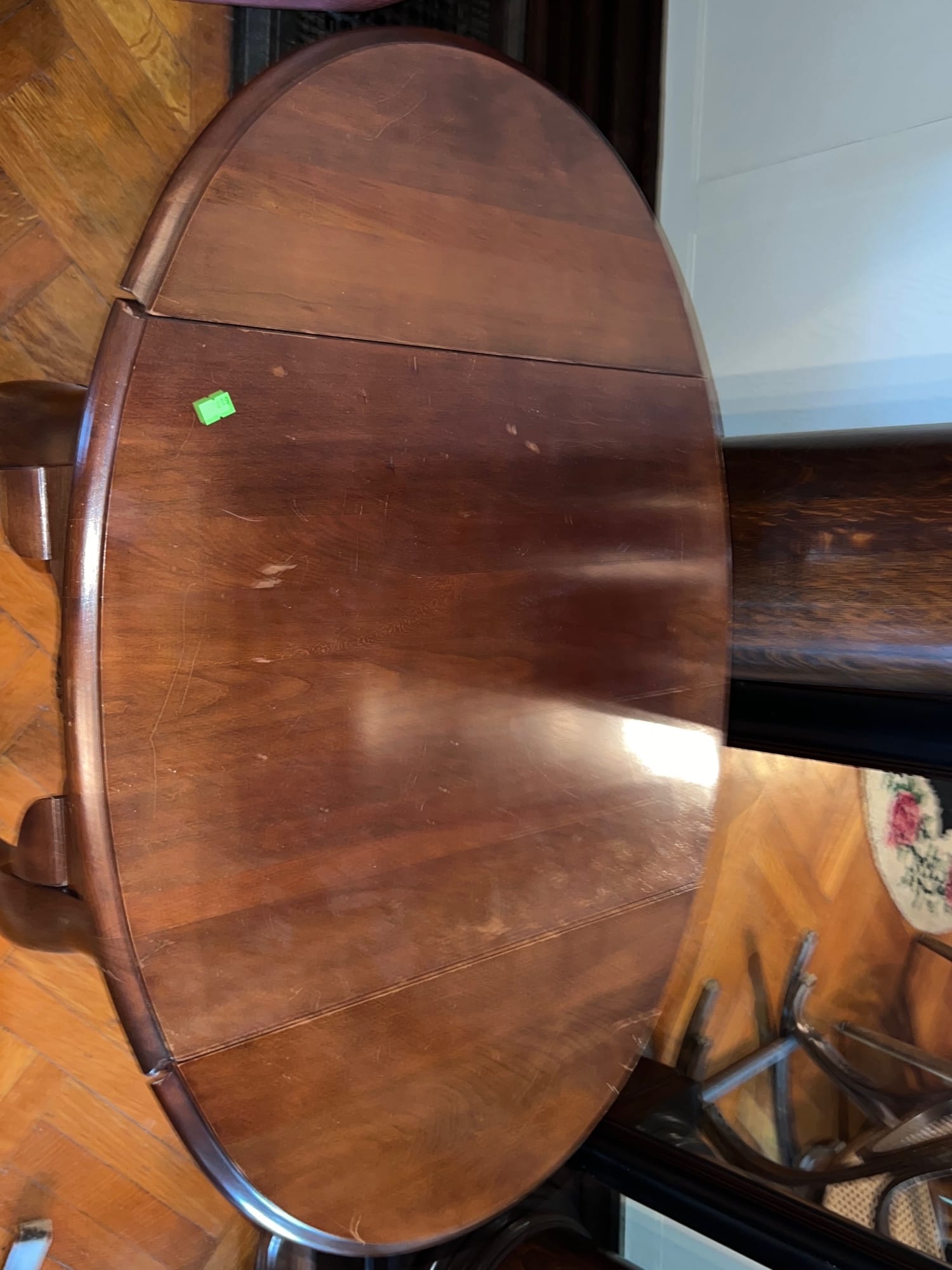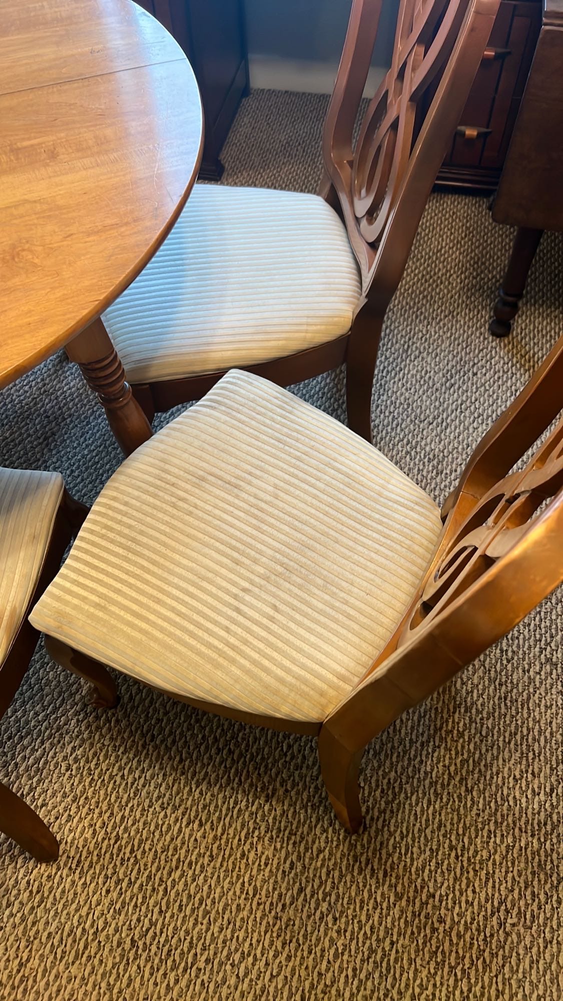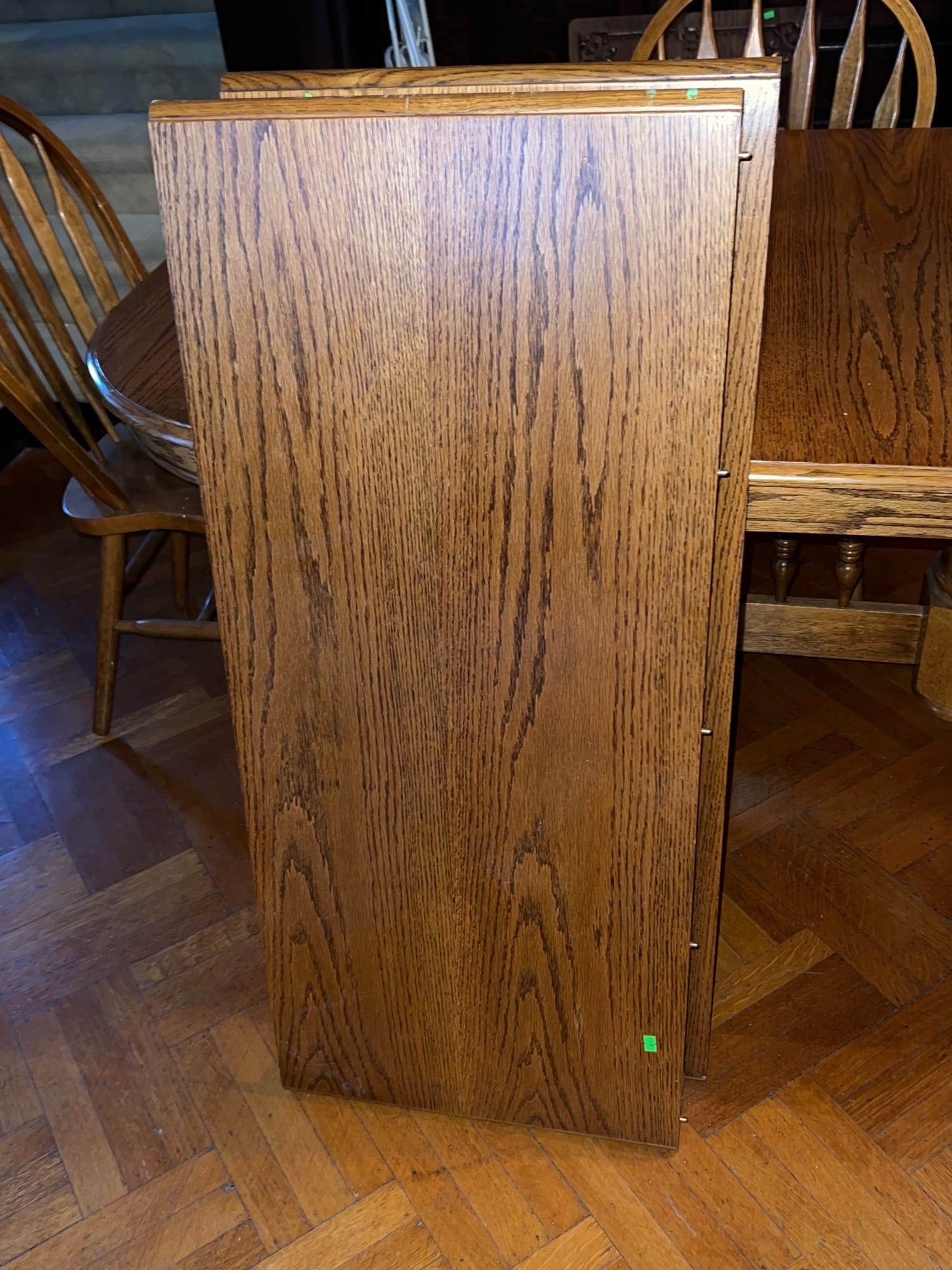 8 Oak Table (top has some bubble damage) 60”x29.25”x42” with Two Leaves 18” each & Three Chairs 17.5” wide Seat height 17.5”
