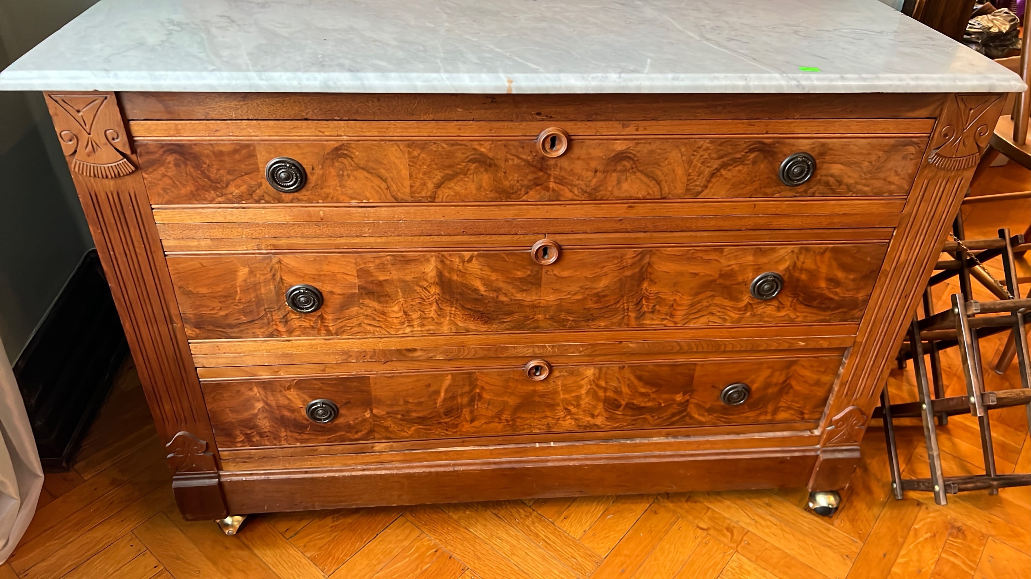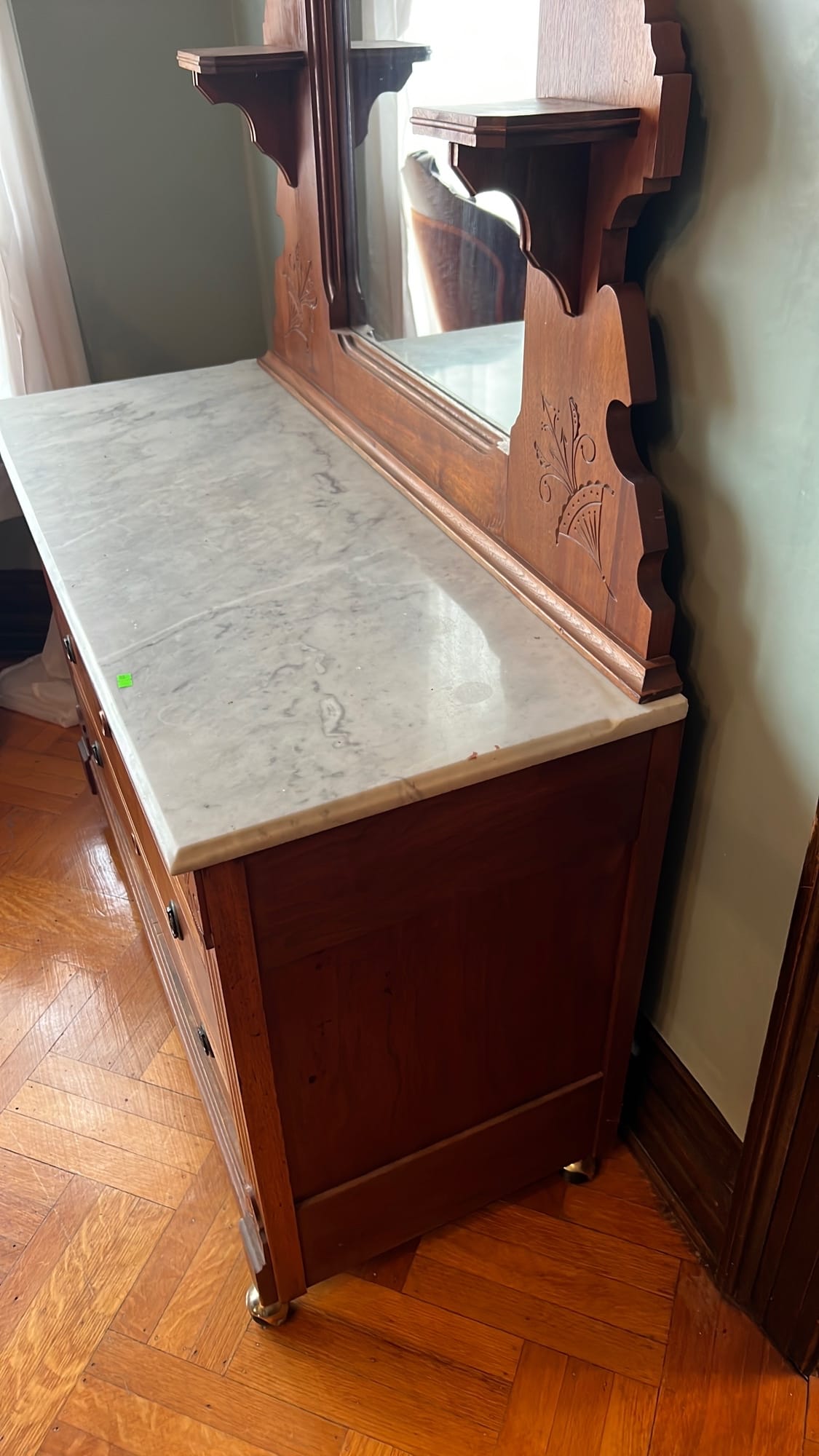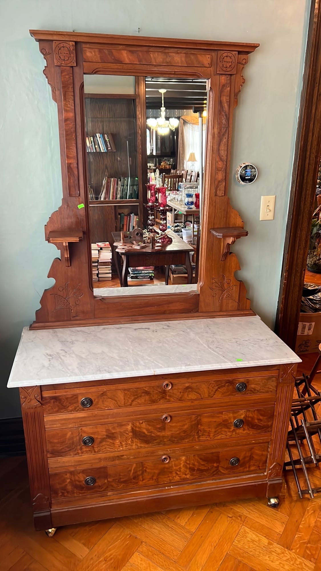 20 Antique Three Drawer Marble Top Dresser on wheels with high back Mirror 43.5”x75”x18.25”