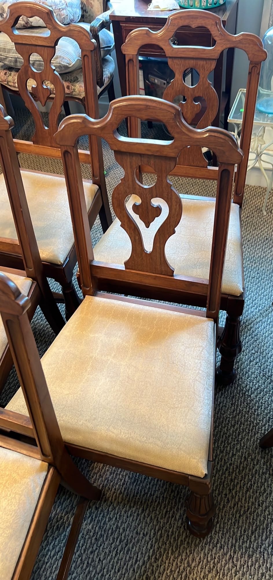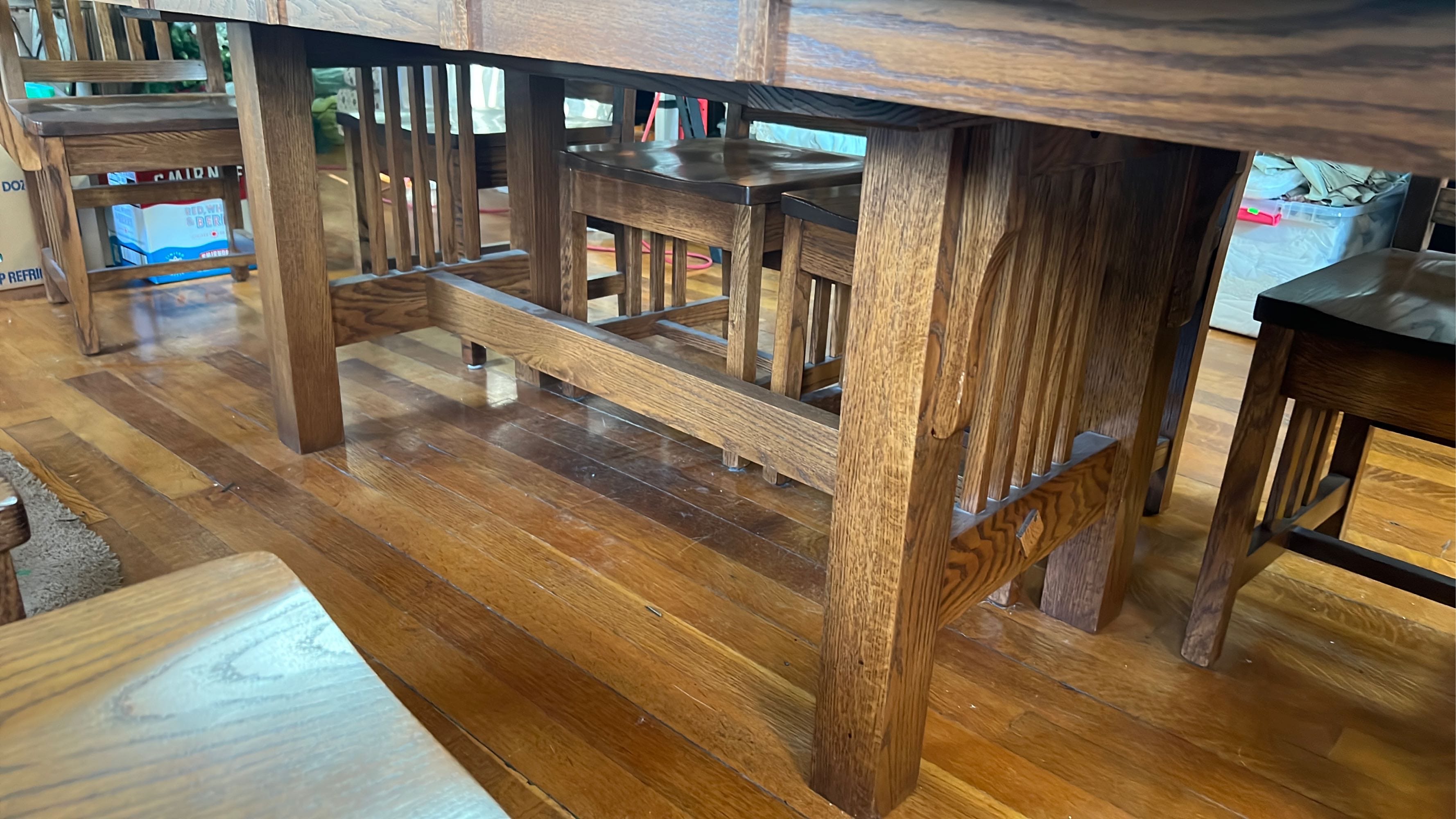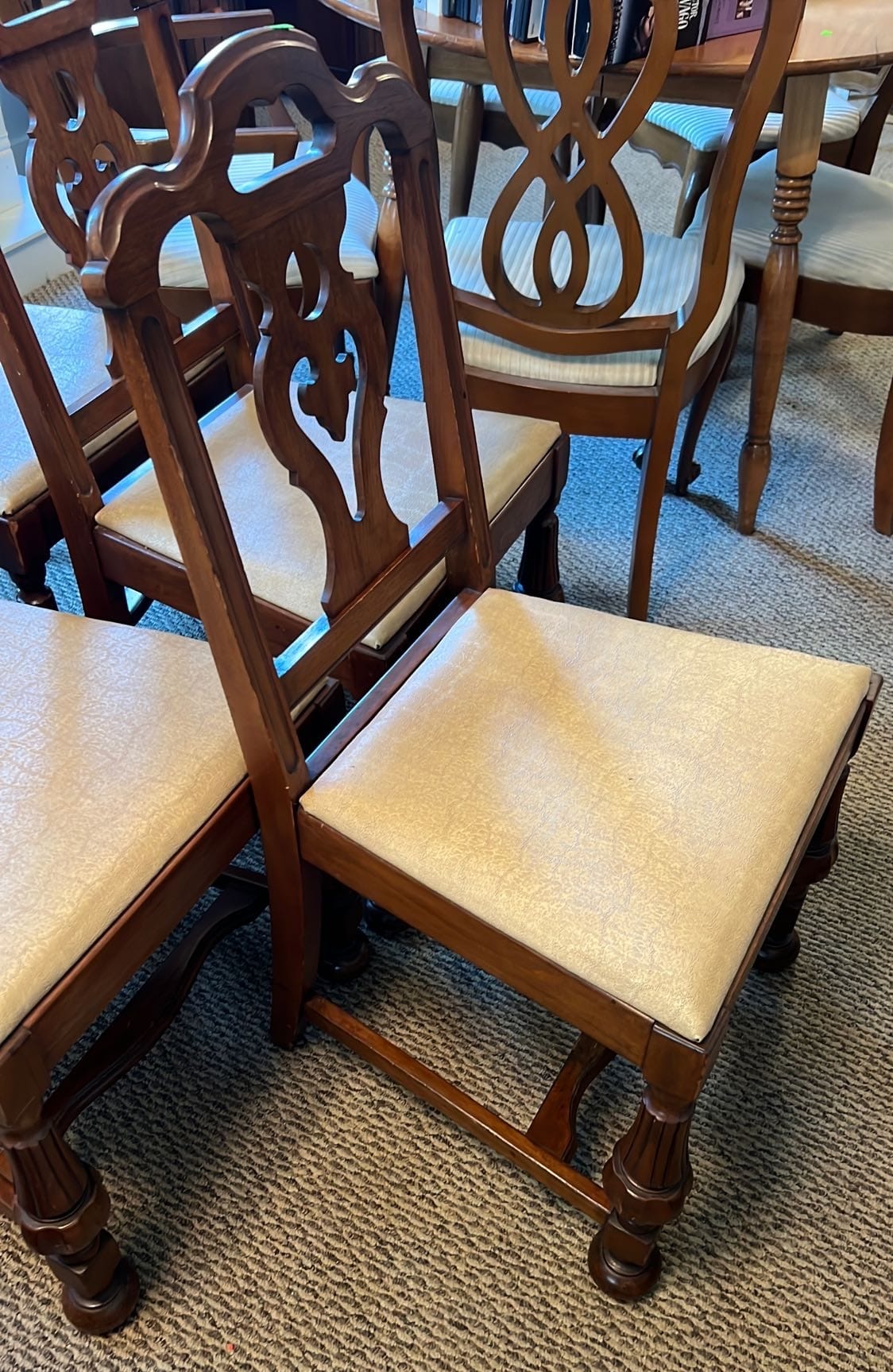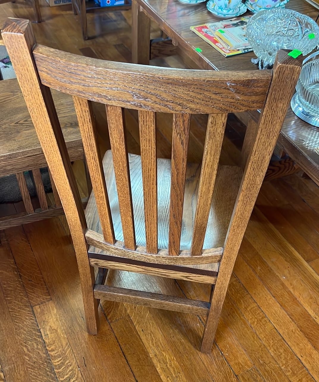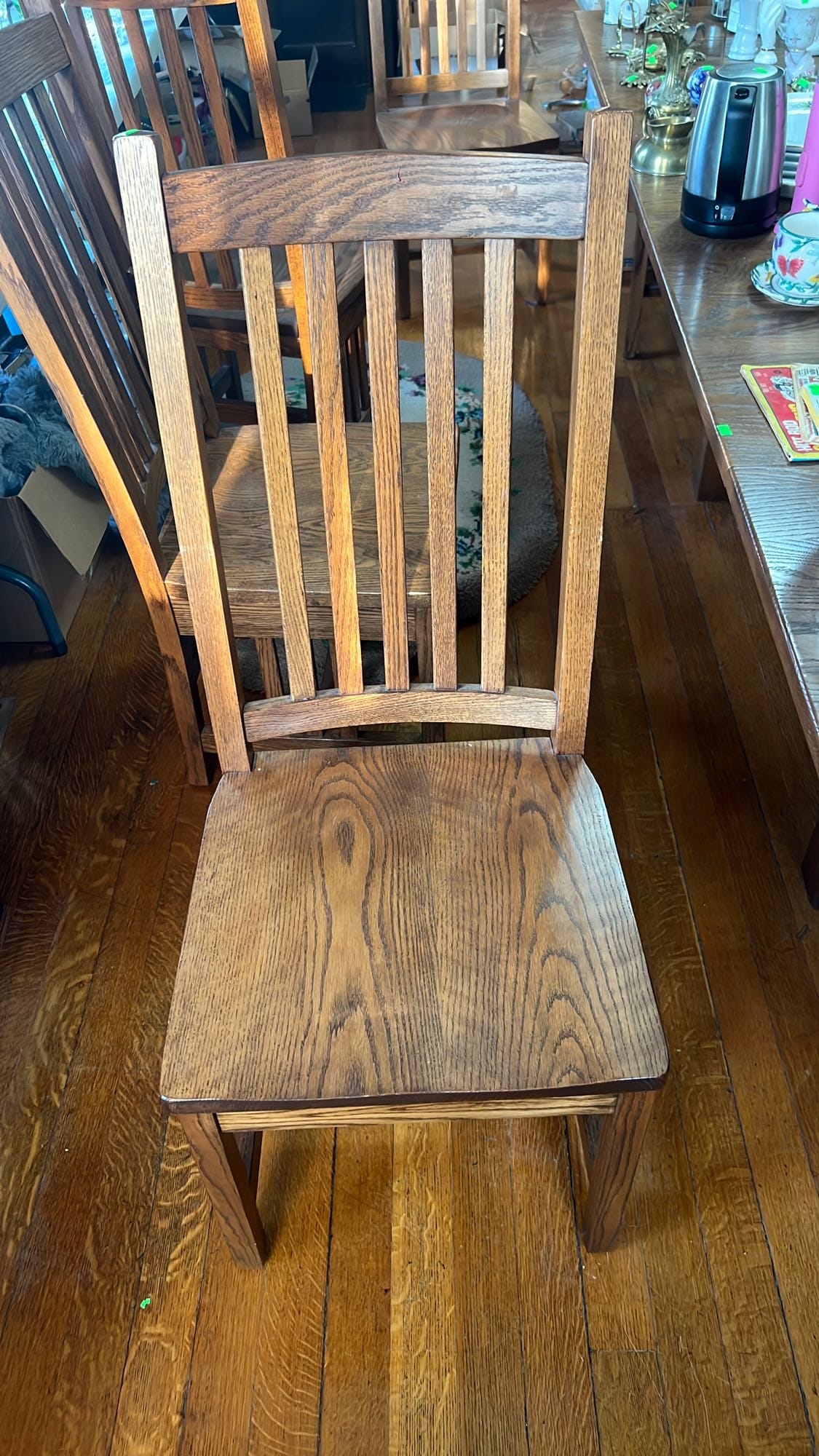 22 Oak Dining table with 4 - 12” leaves 42”x119”x 30” ; 2- captains chairs, 8- dining chairs, contents not included