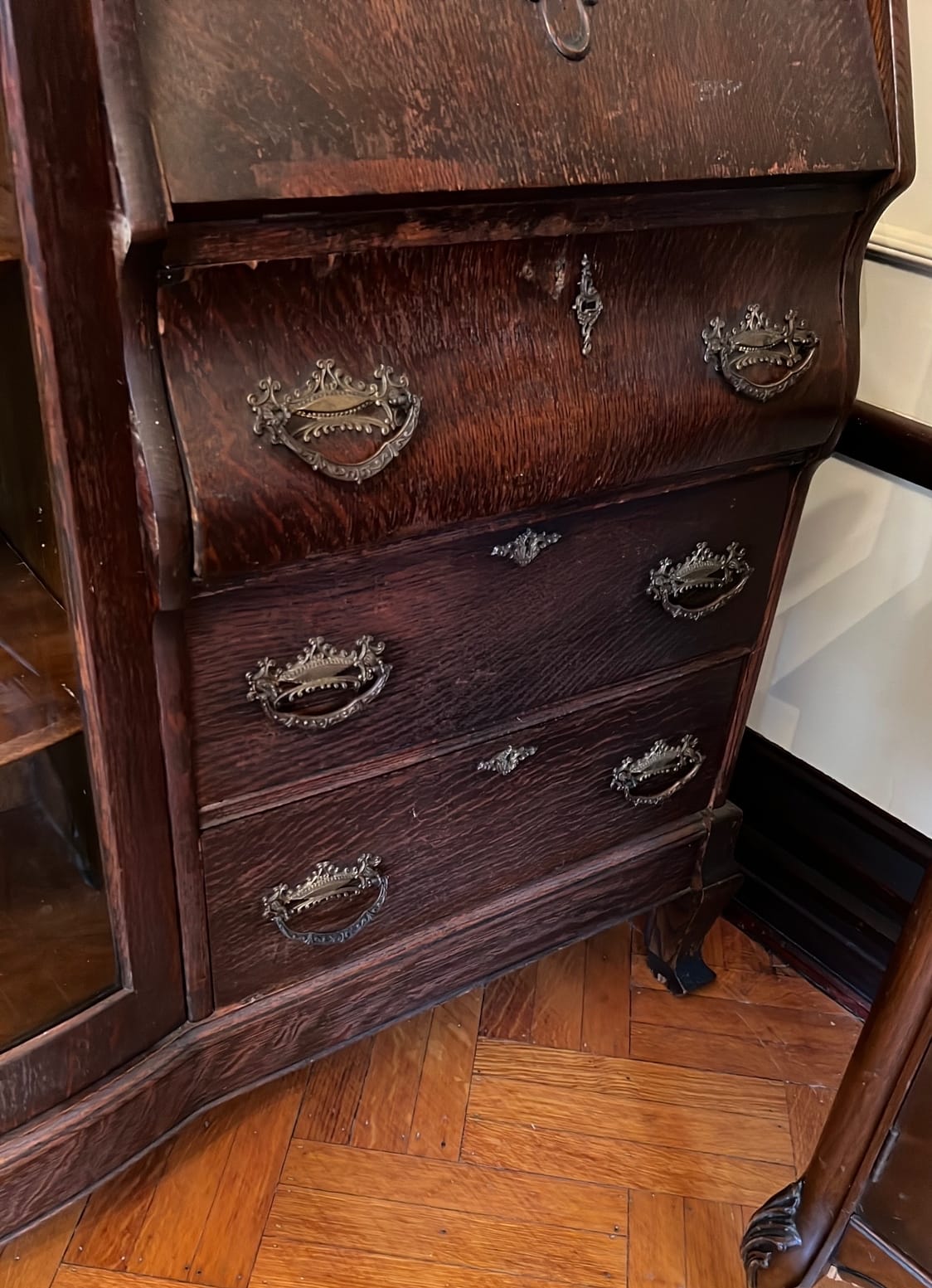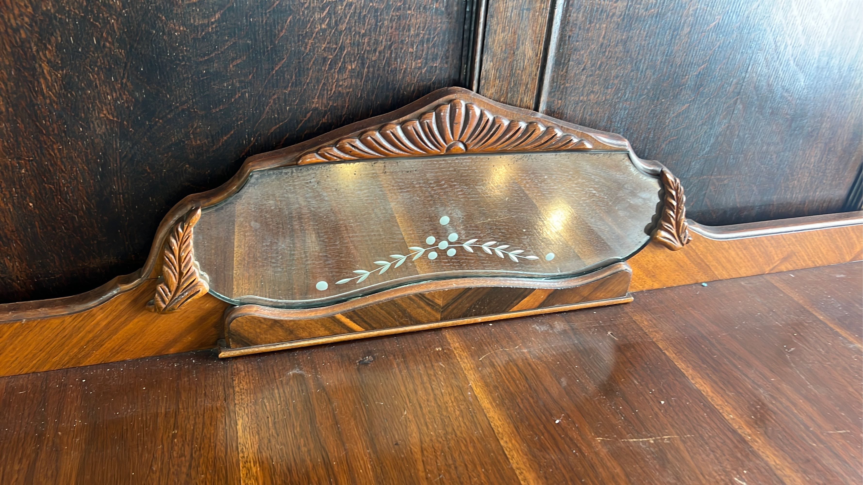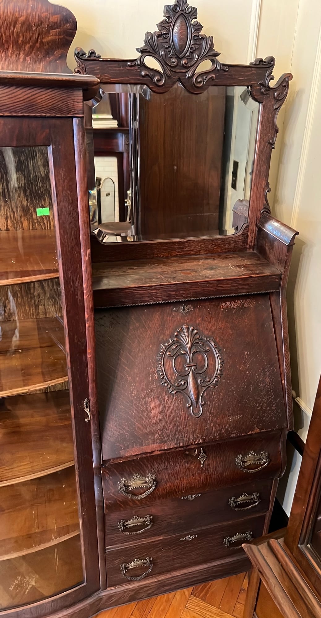 26 Antique Ornate Drop Front Side by Side Secretary with Beveled Mirror 41.5”x68”x14”