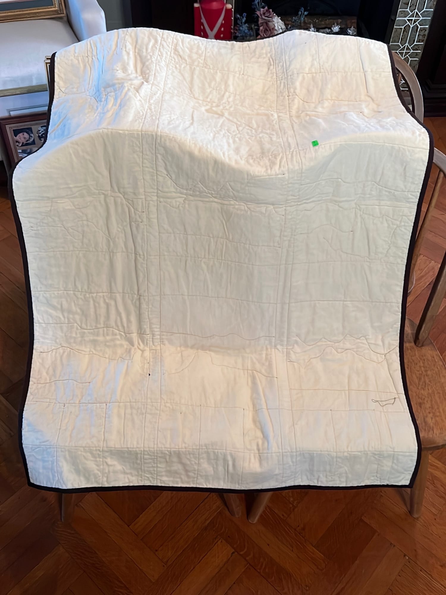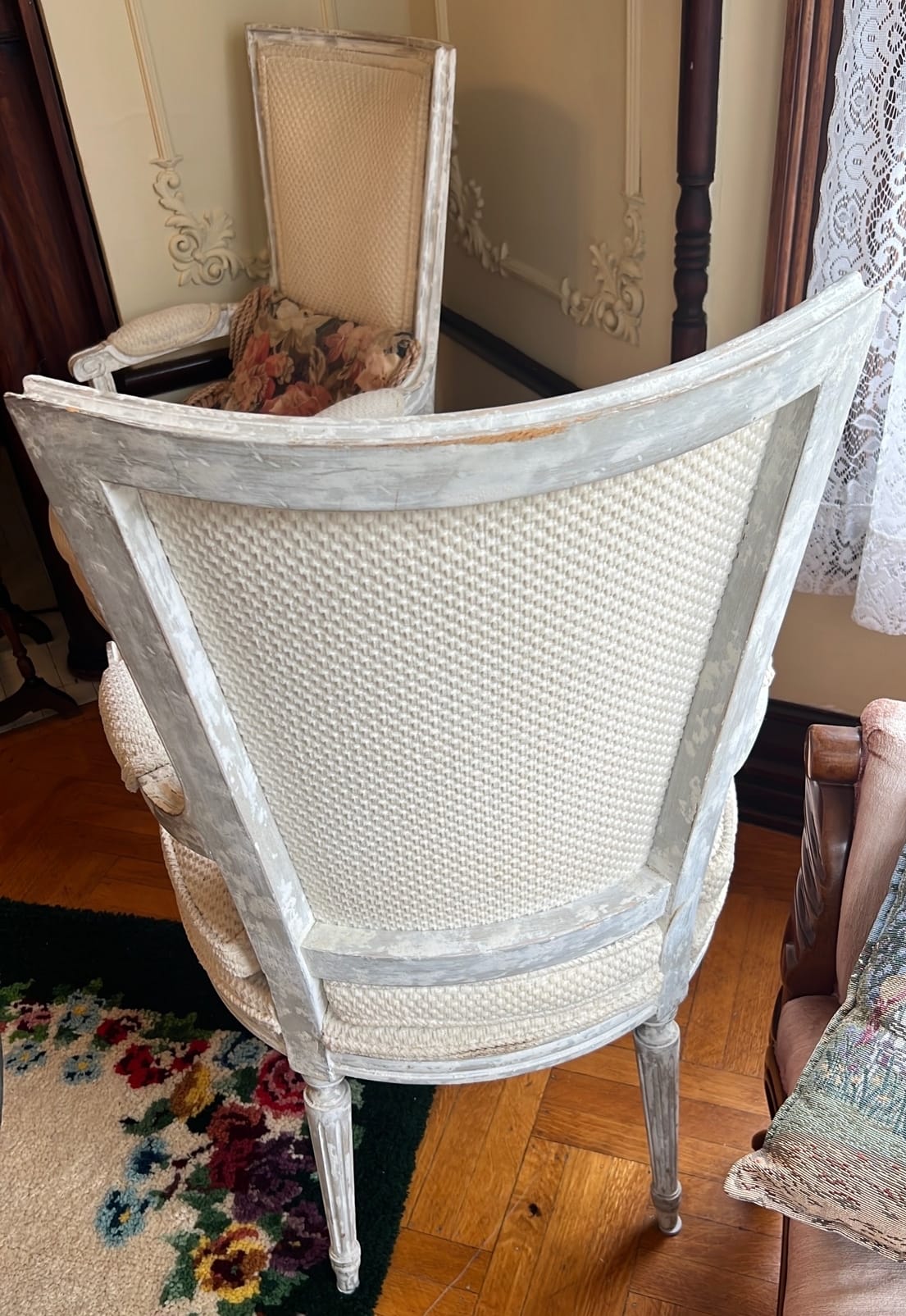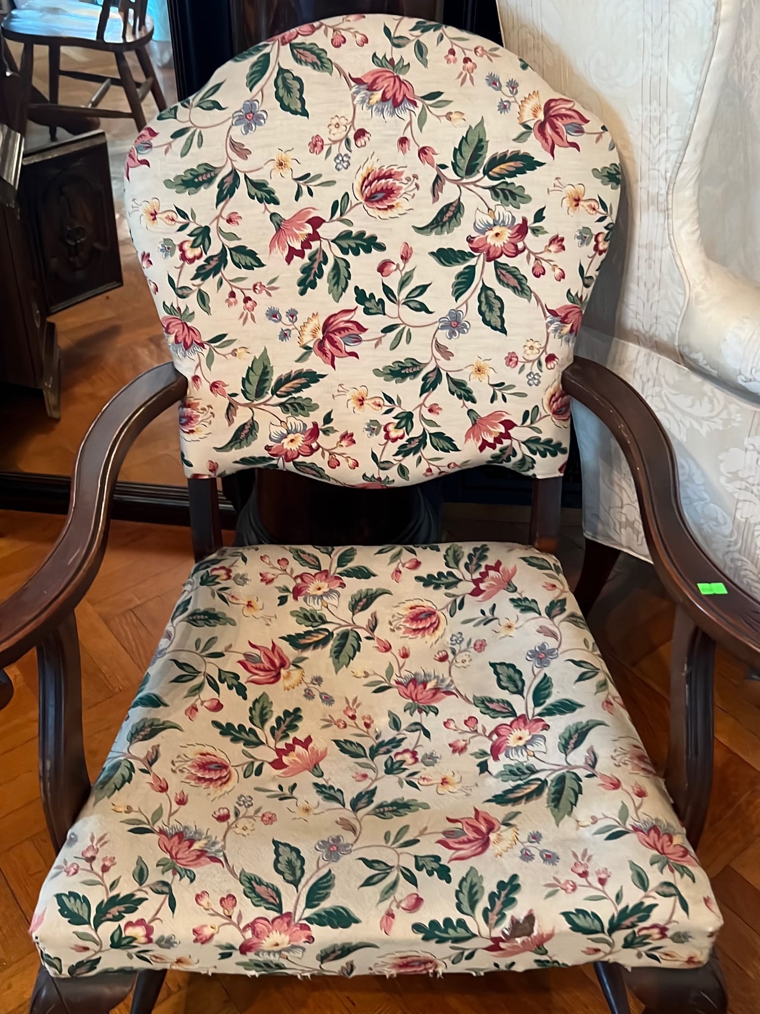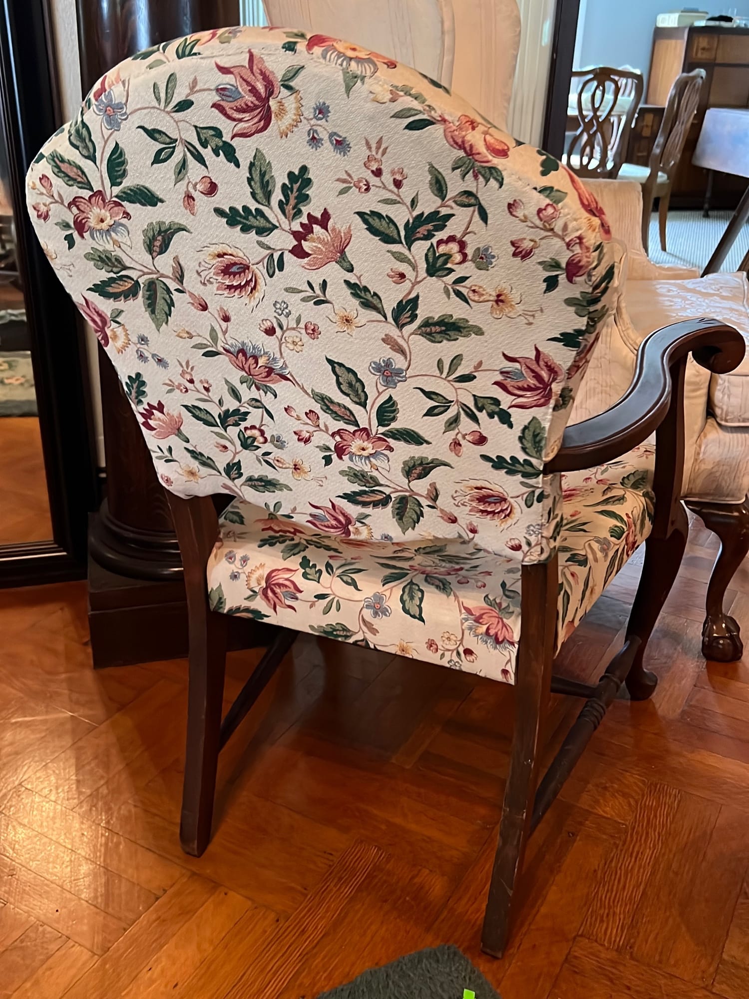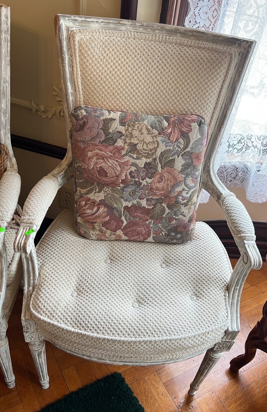 34 Pair of Ivory Vintage Chairs with Floral Pillows 23.5” wide Seat height 20.5”
