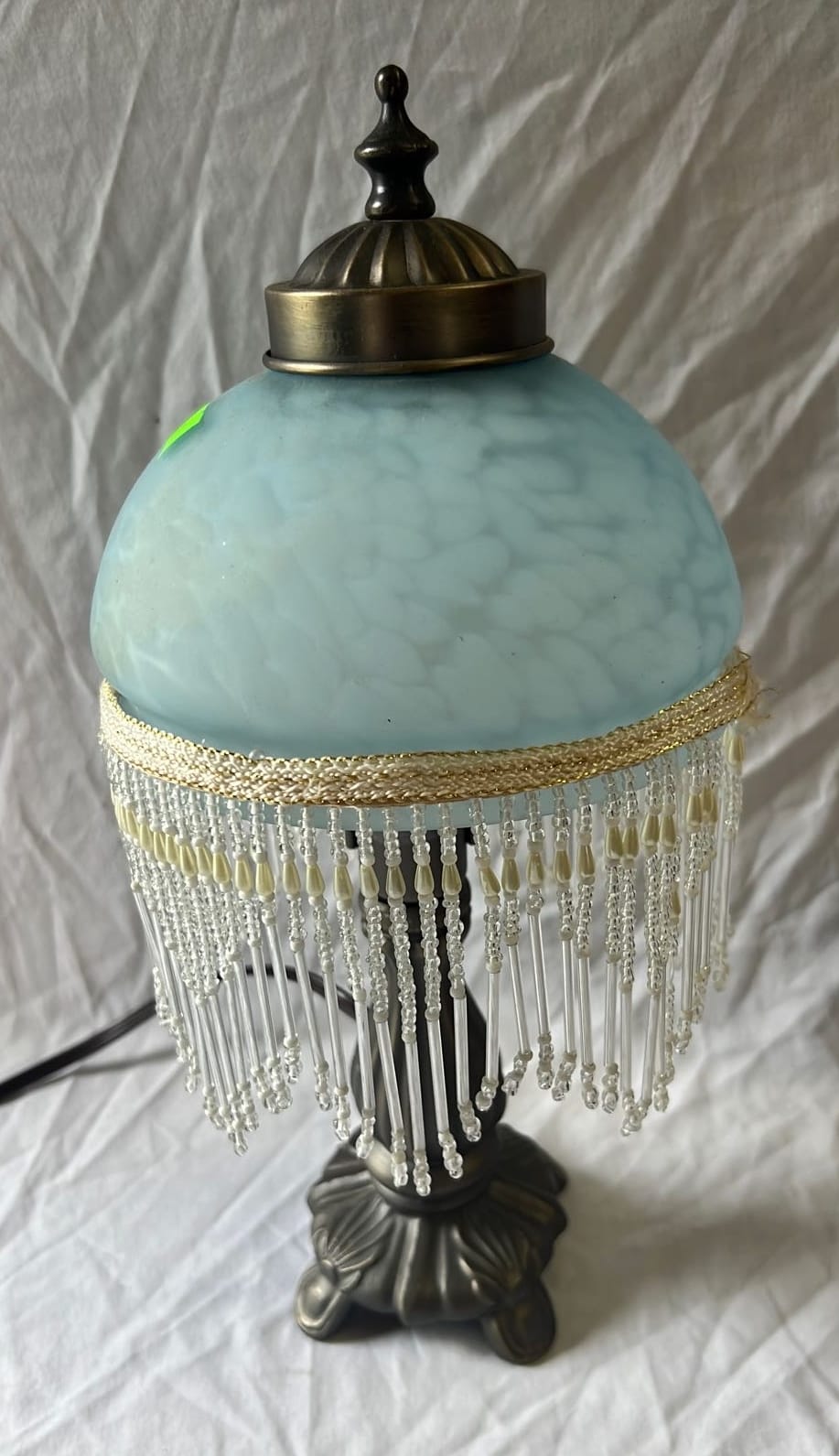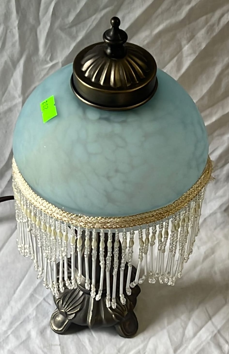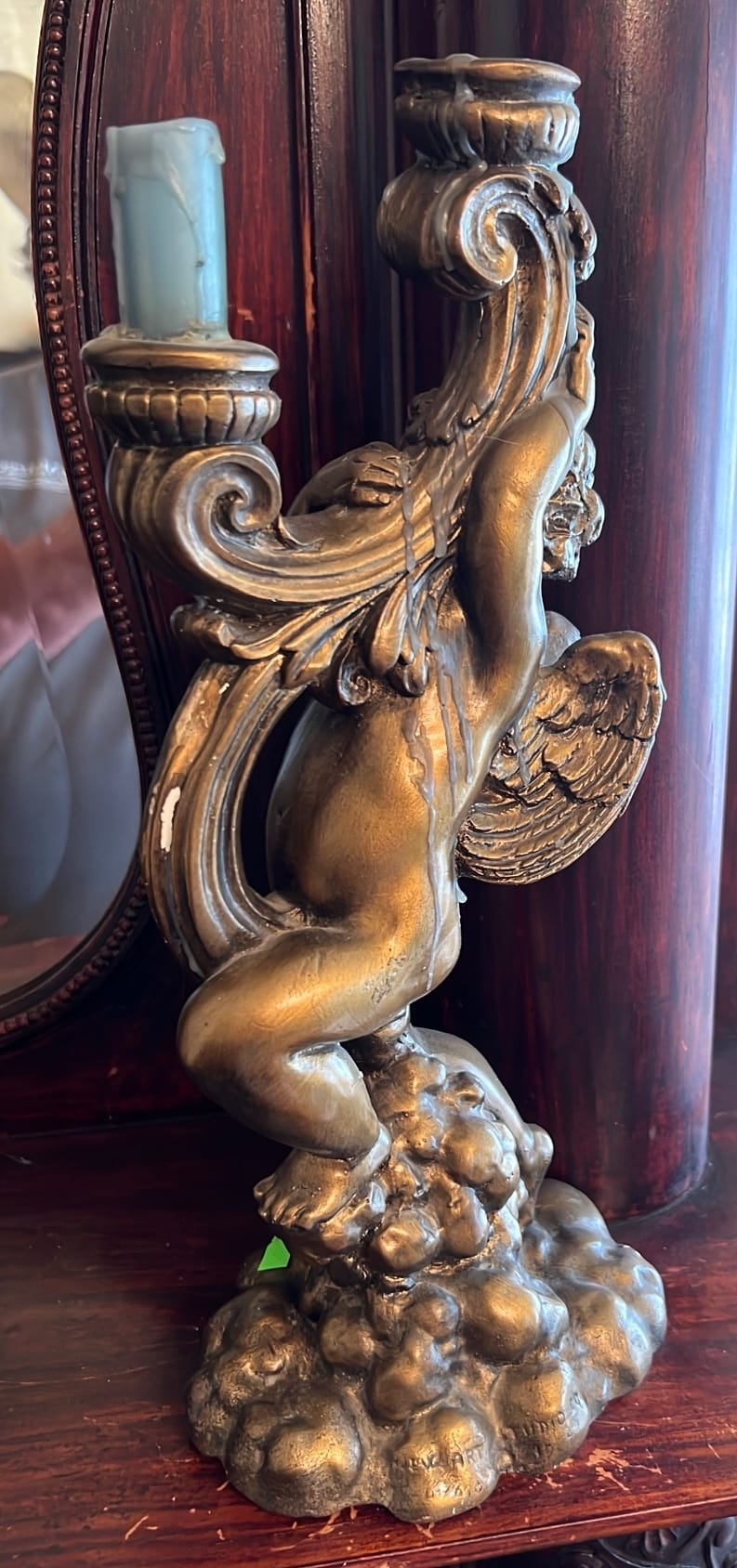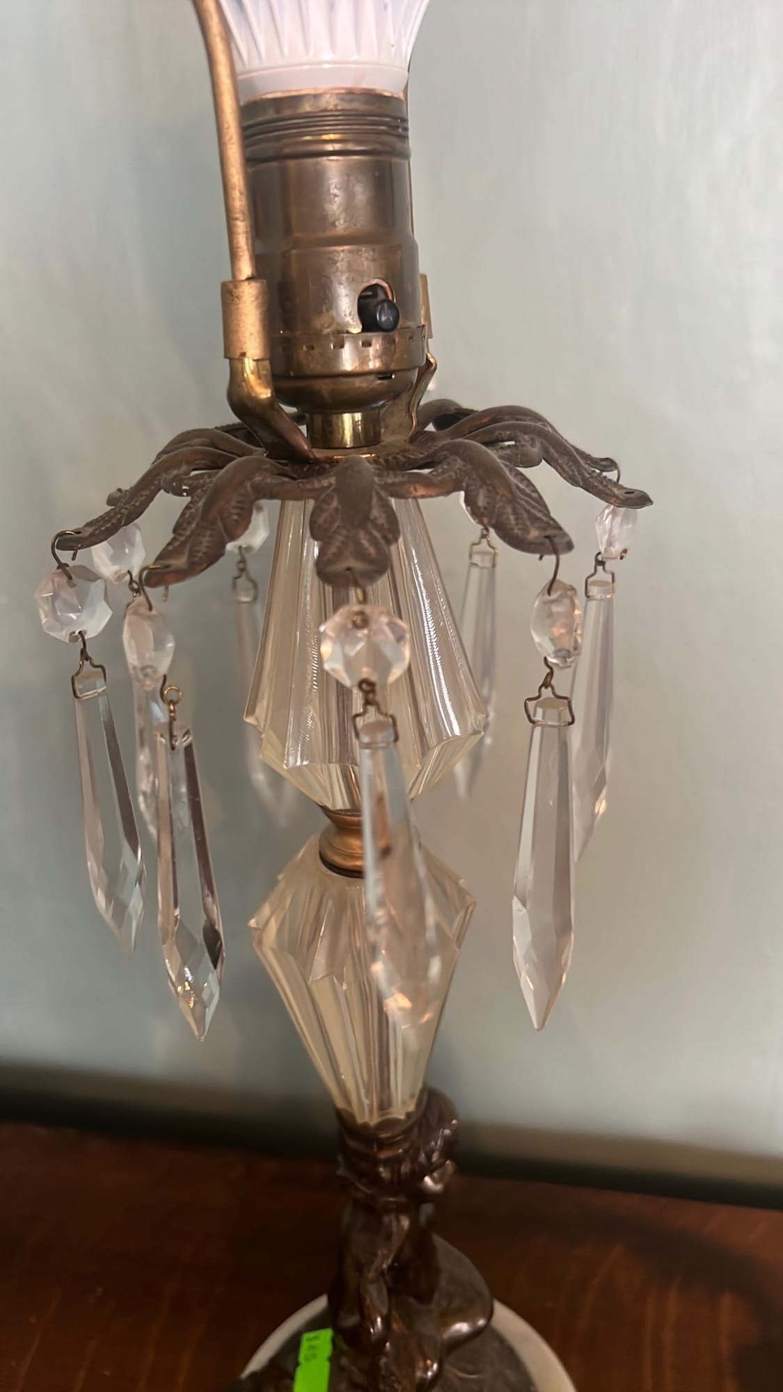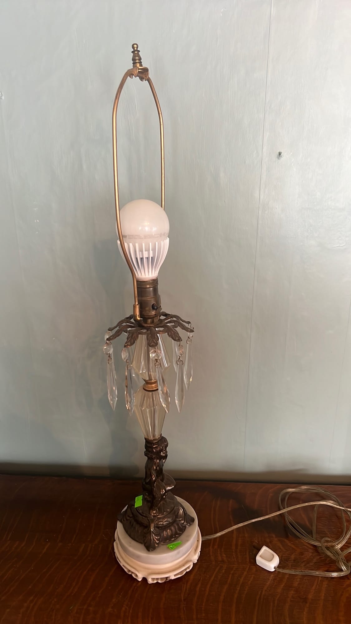 145 Vintage Table Lamp with Prisms, Metal Cherub, Marble Base 28”