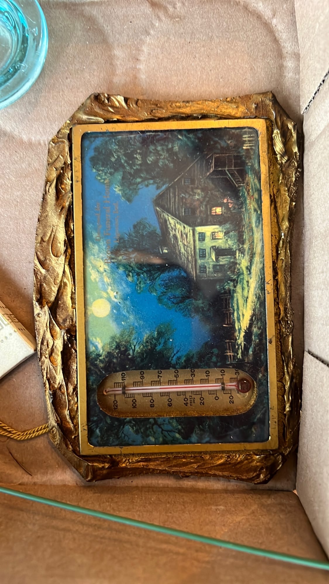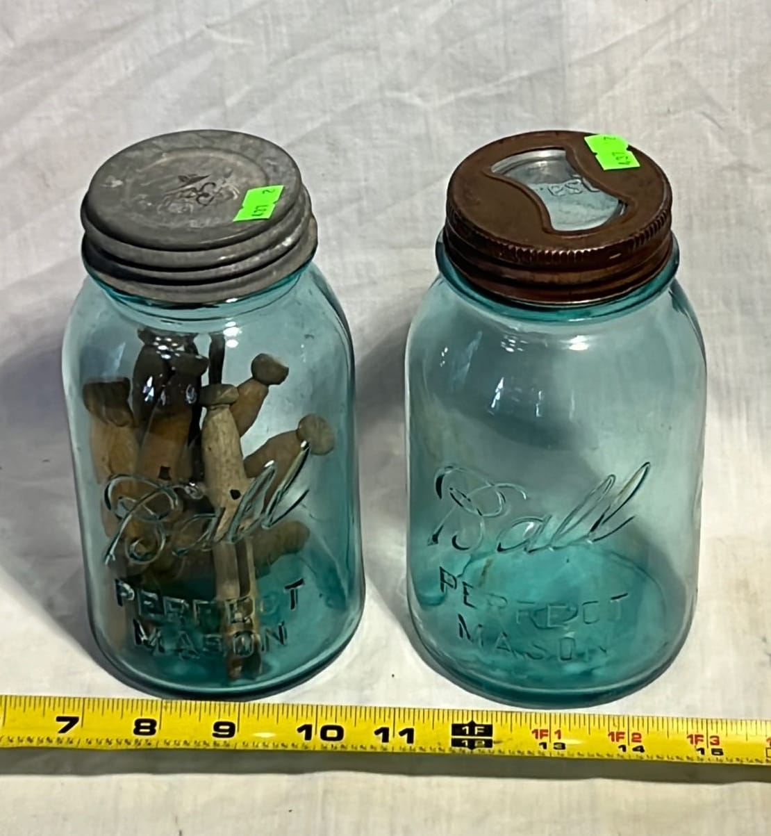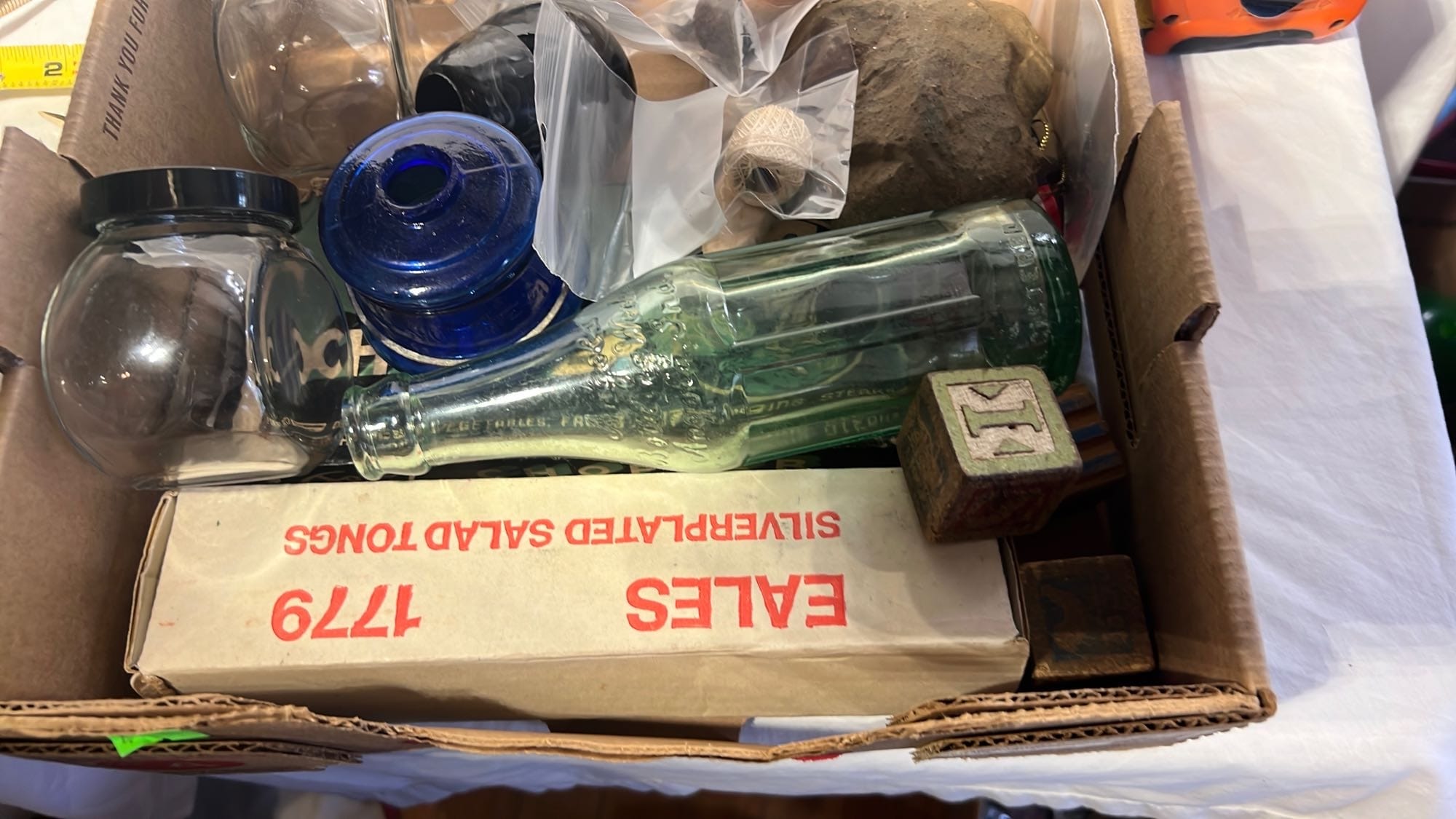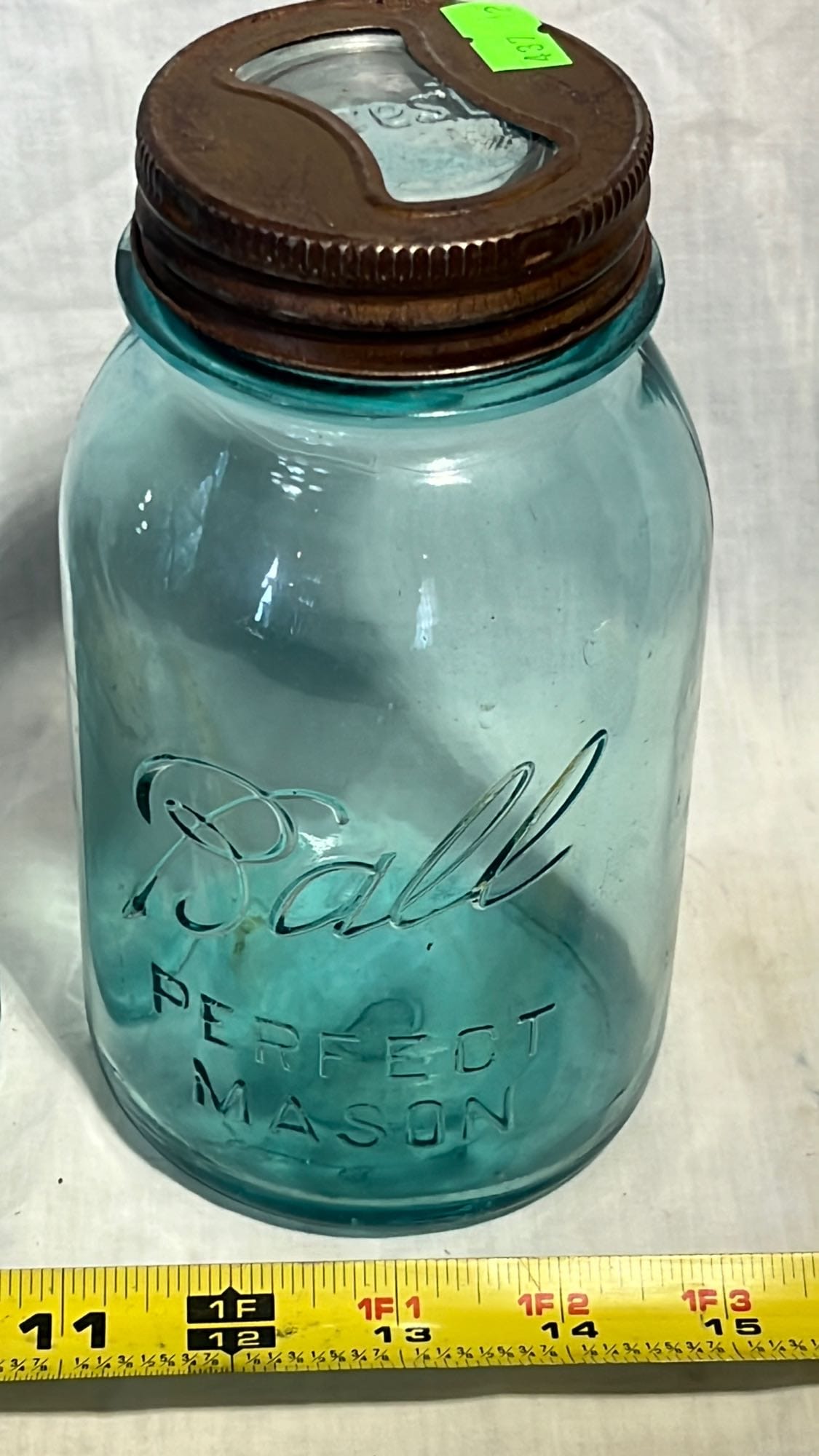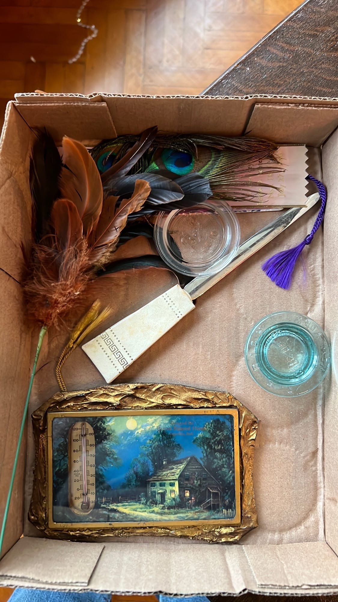 106 Gibson Blue Glass Lid 2.5” • Clear Ball No. 10 Lid 2.25” • Vintage Letter Opener • Brown Funeral Home Thermometer Advertisement 6.5” • Peacock Feathers 16”