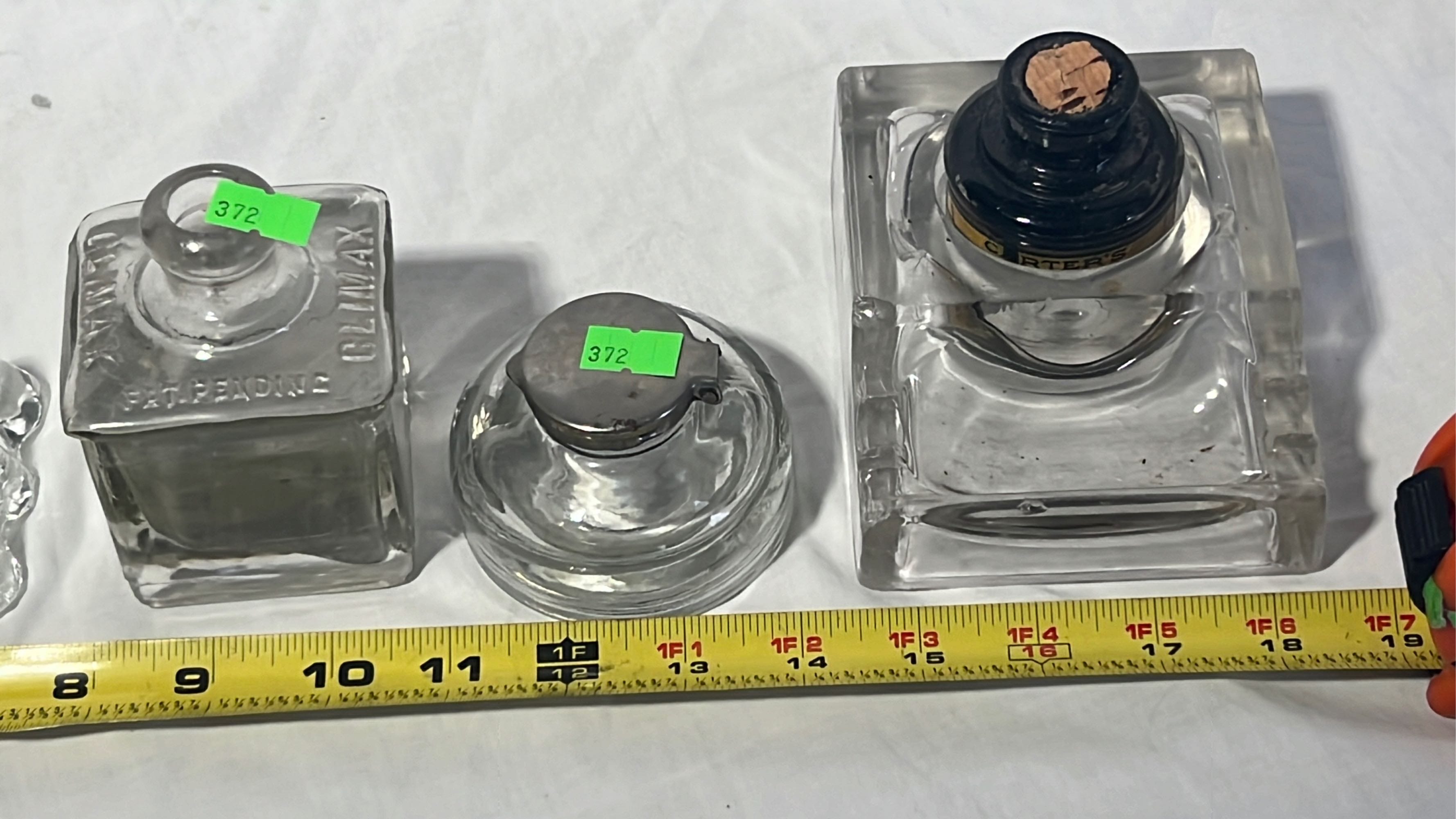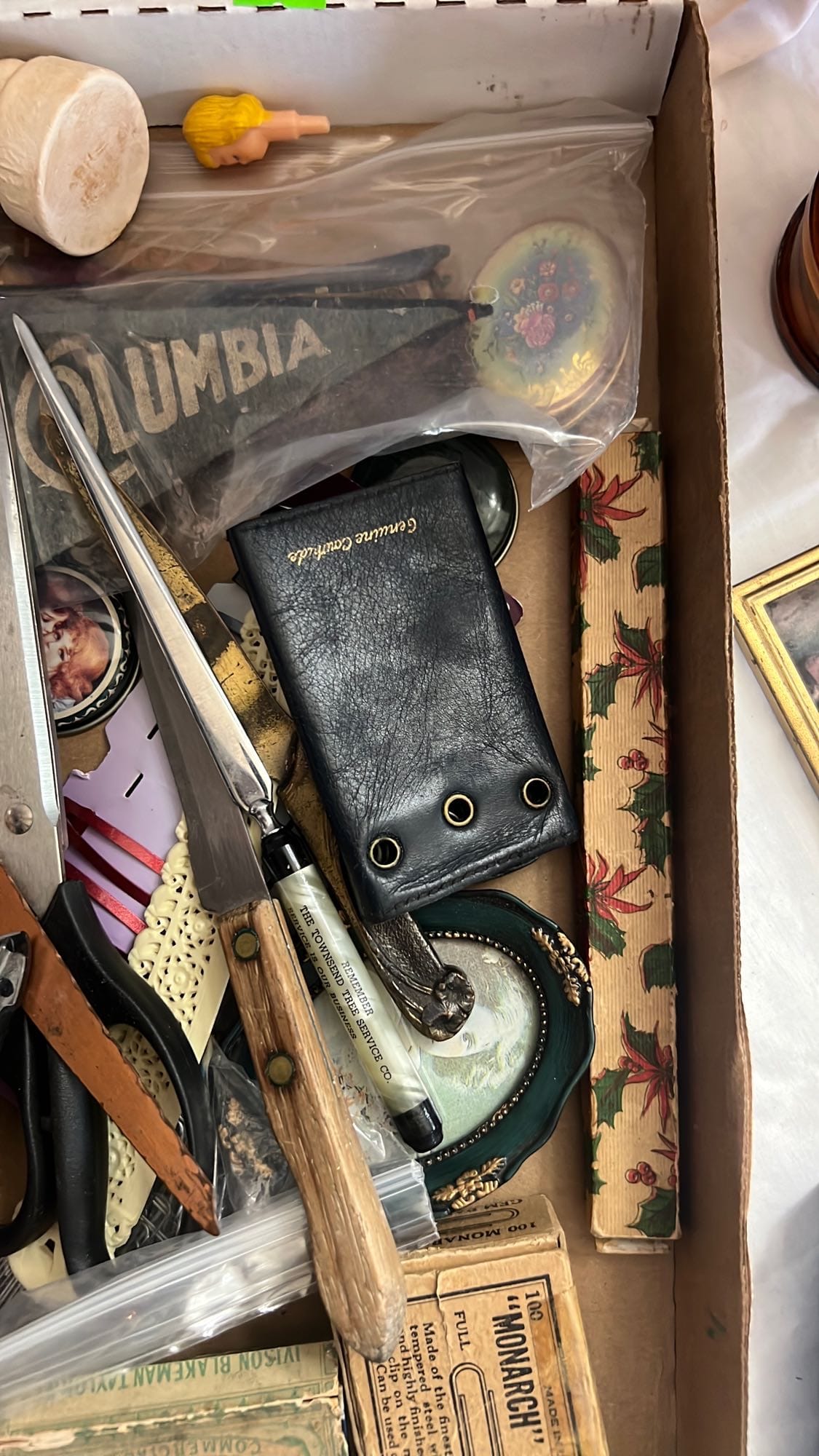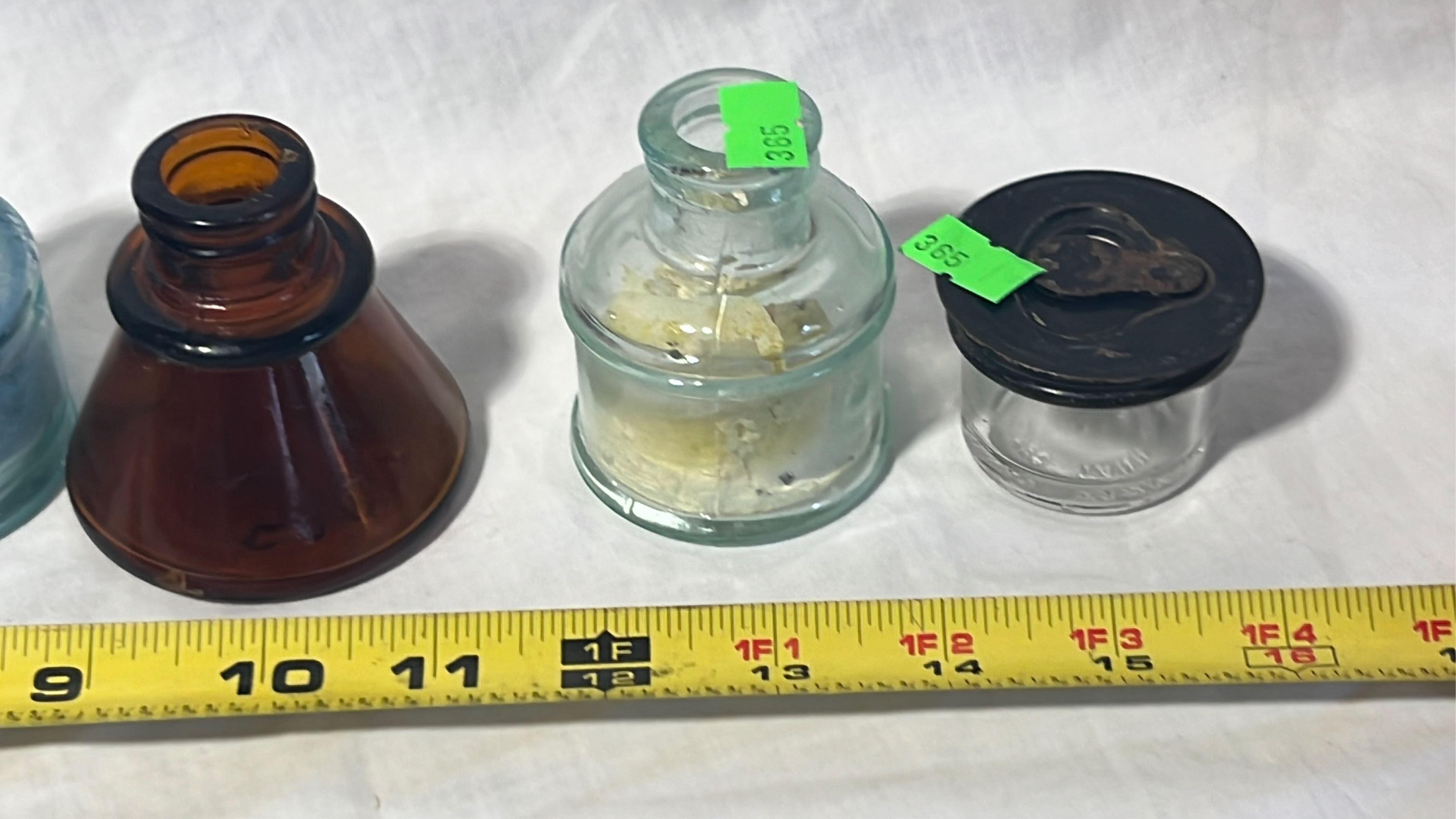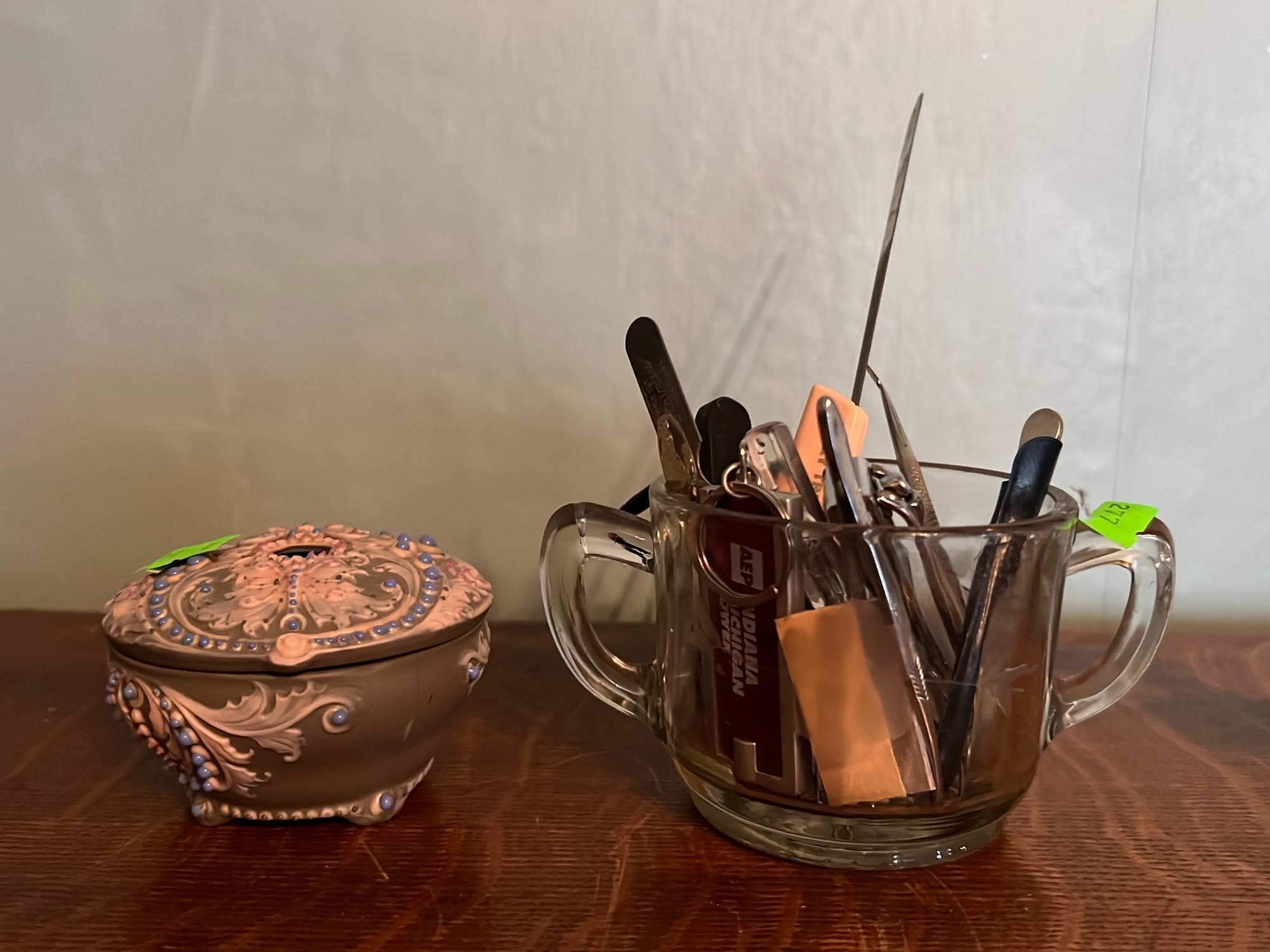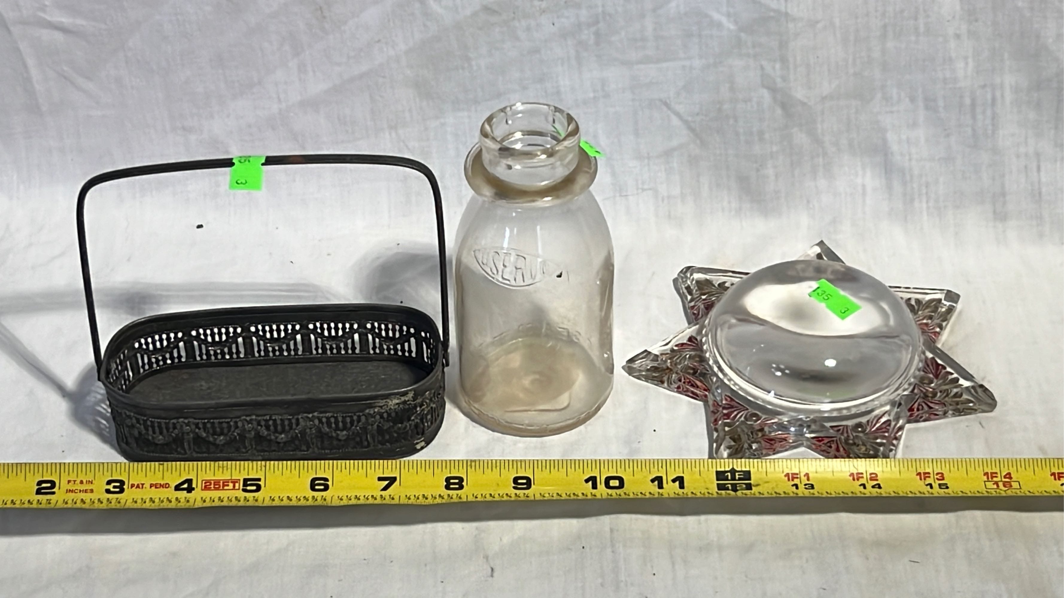 106 Gibson Blue Glass Lid 2.5” • Clear Ball No. 10 Lid 2.25” • Vintage Letter Opener • Brown Funeral Home Thermometer Advertisement 6.5” • Peacock Feathers 16”