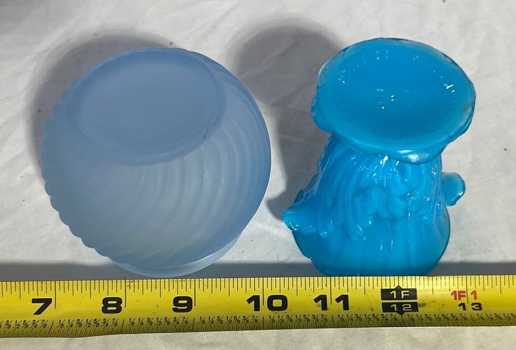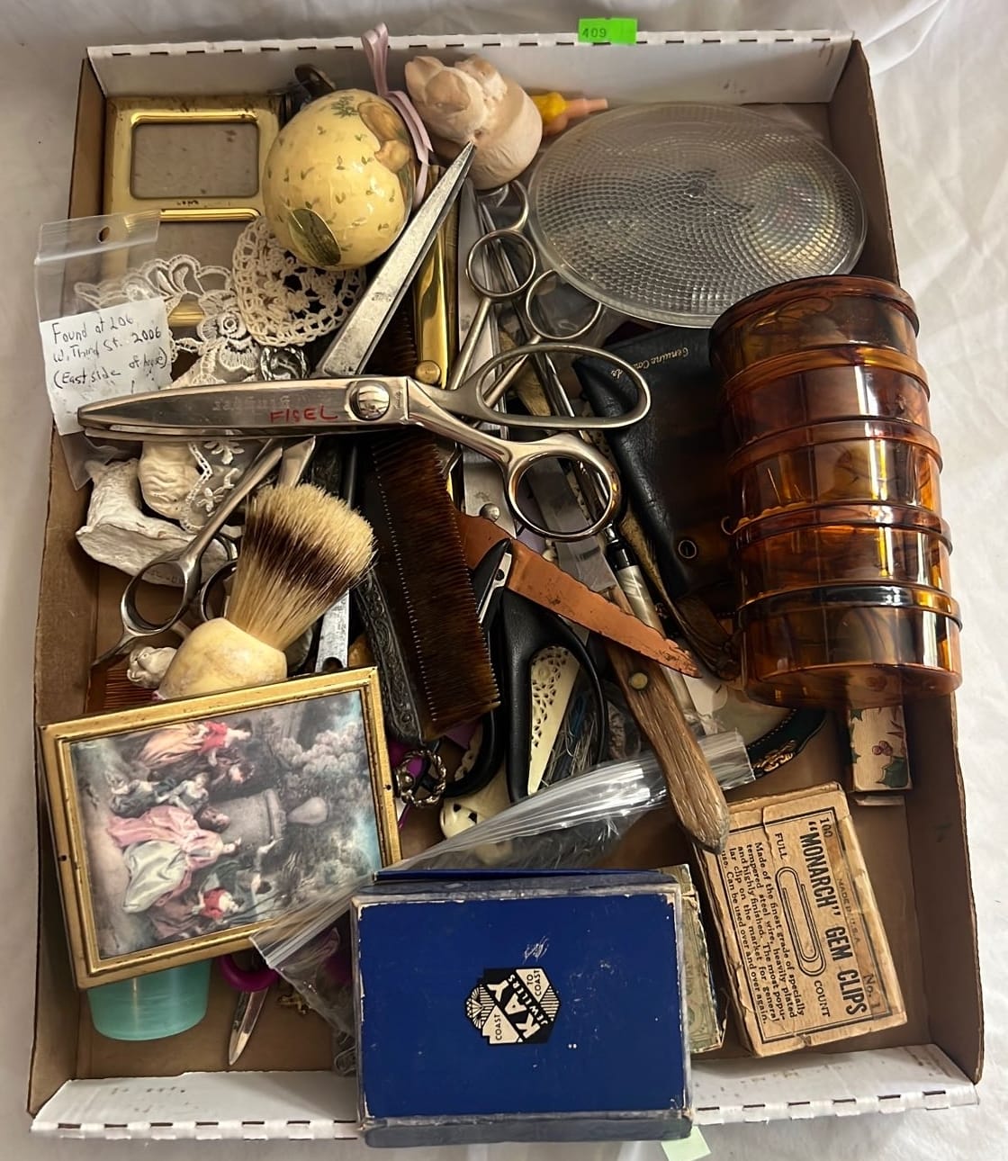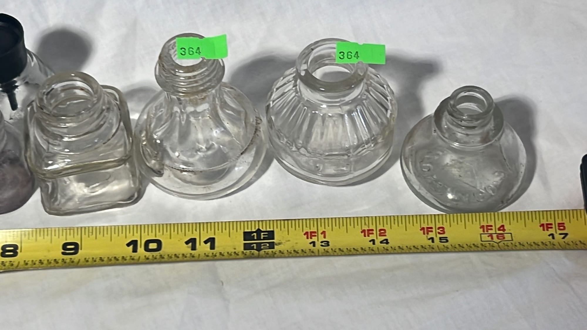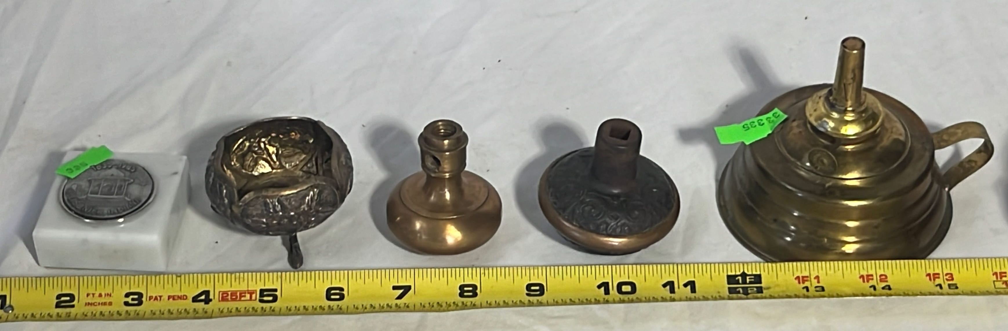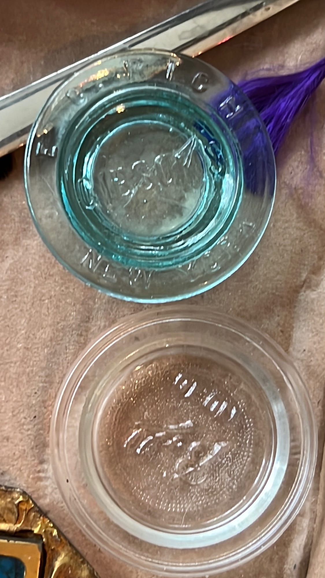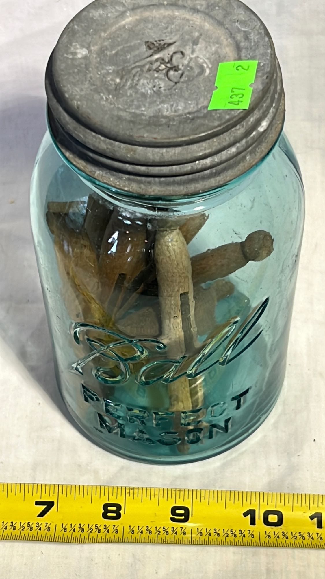 106 Gibson Blue Glass Lid 2.5” • Clear Ball No. 10 Lid 2.25” • Vintage Letter Opener • Brown Funeral Home Thermometer Advertisement 6.5” • Peacock Feathers 16”