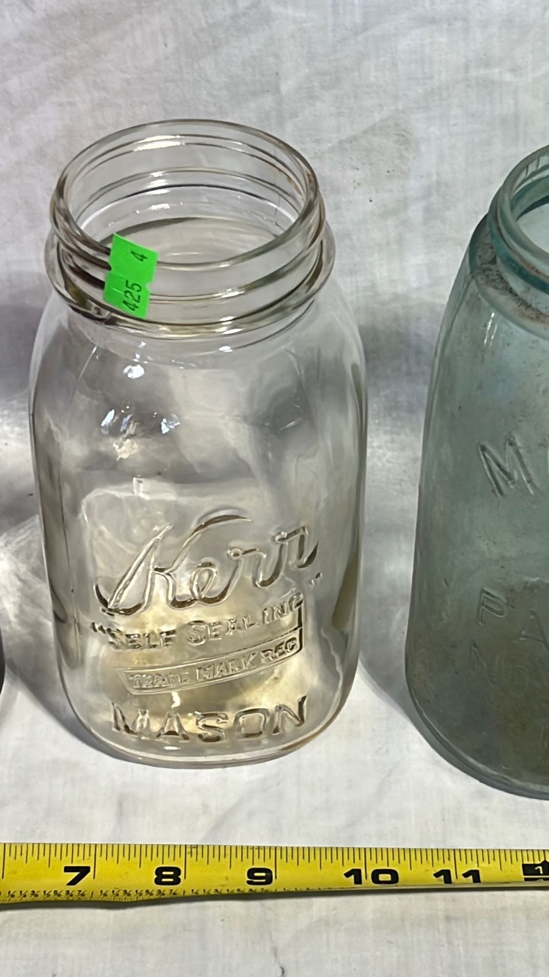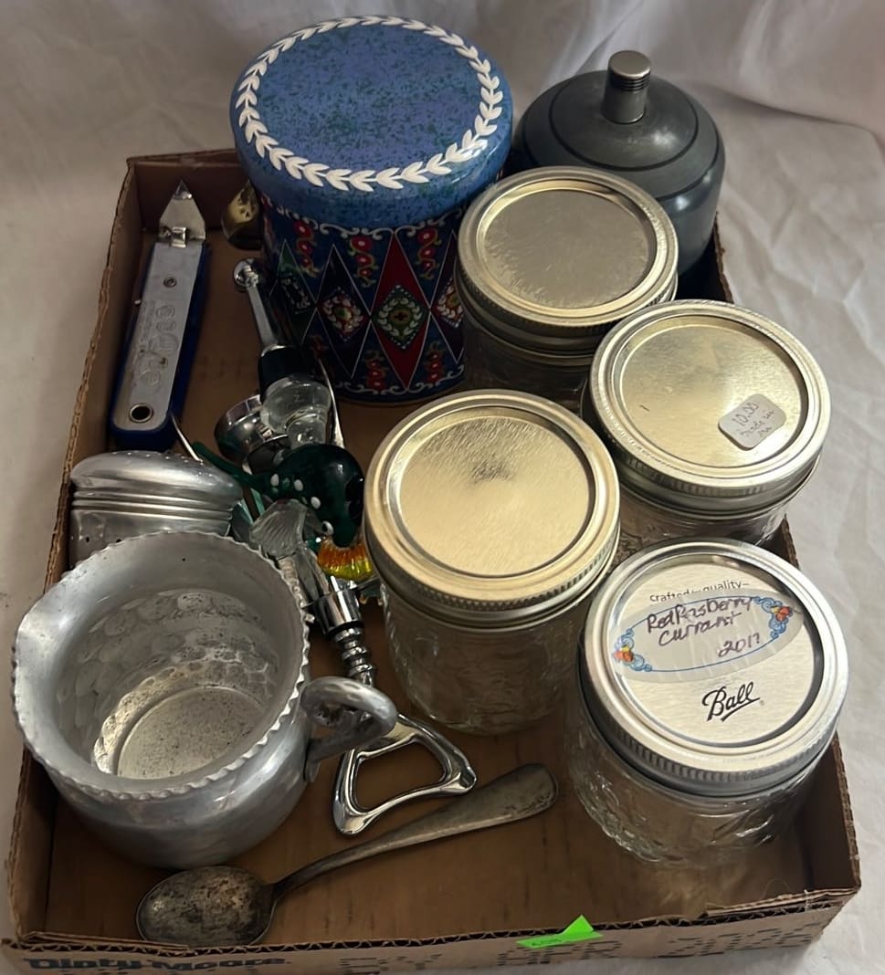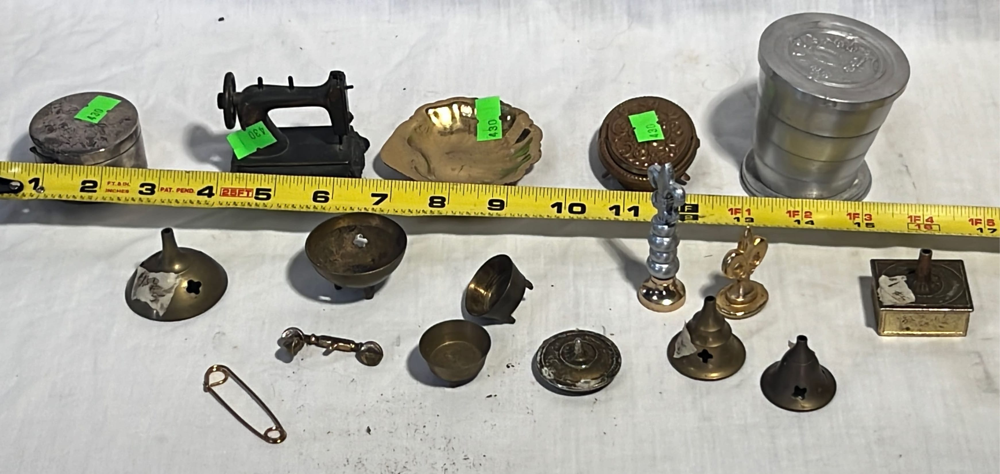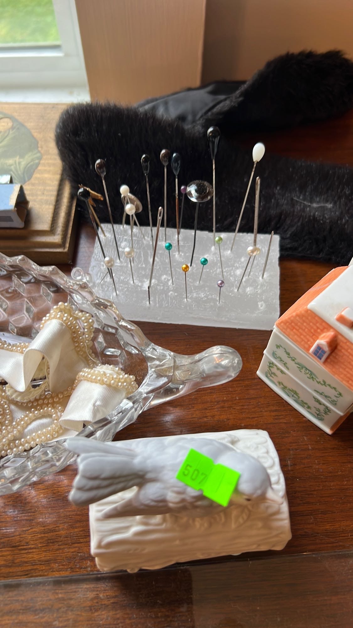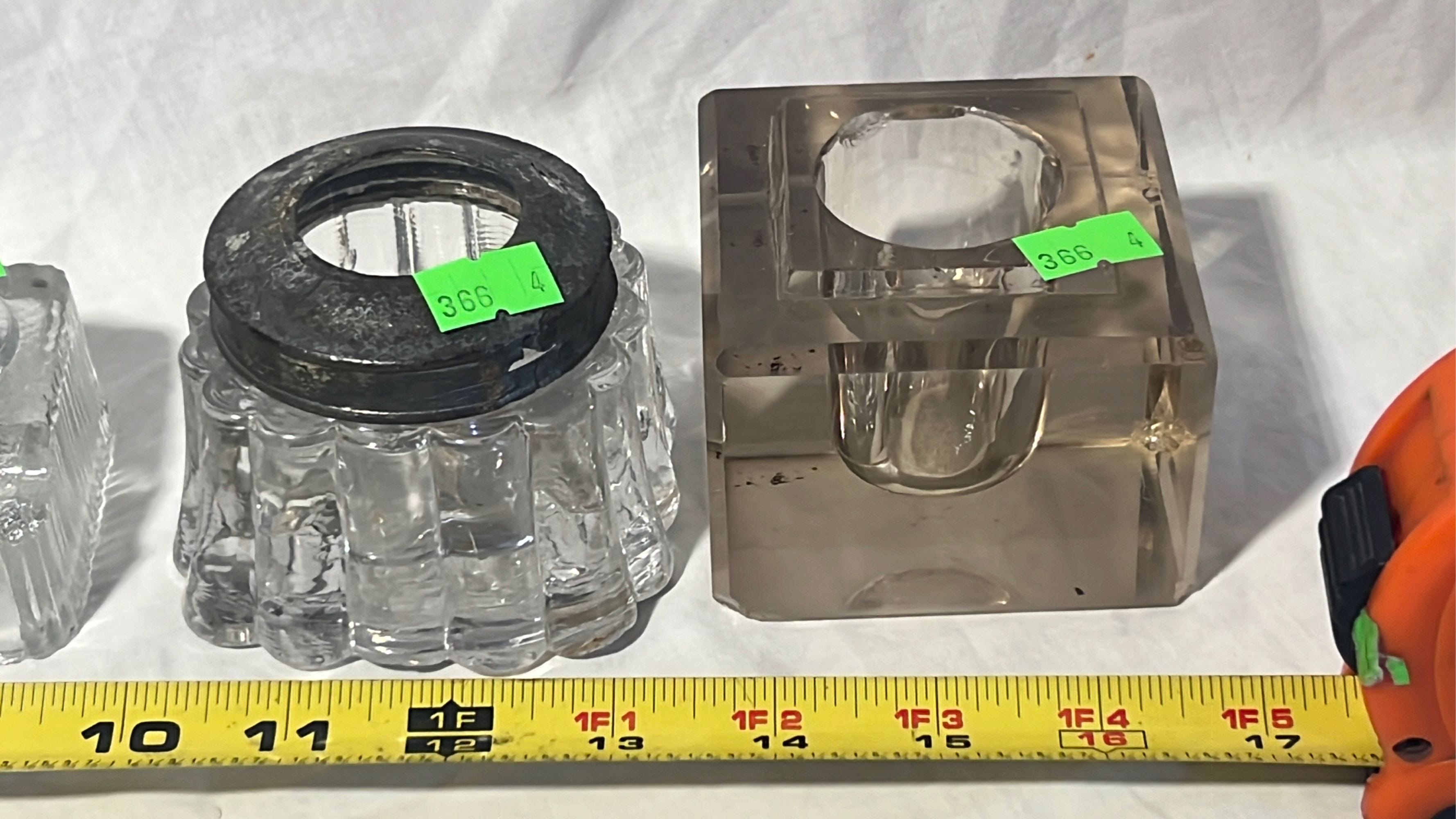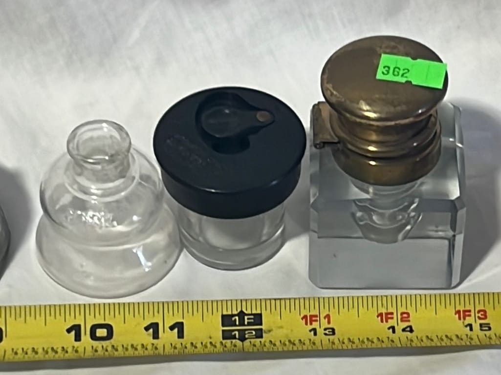 106 Gibson Blue Glass Lid 2.5” • Clear Ball No. 10 Lid 2.25” • Vintage Letter Opener • Brown Funeral Home Thermometer Advertisement 6.5” • Peacock Feathers 16”