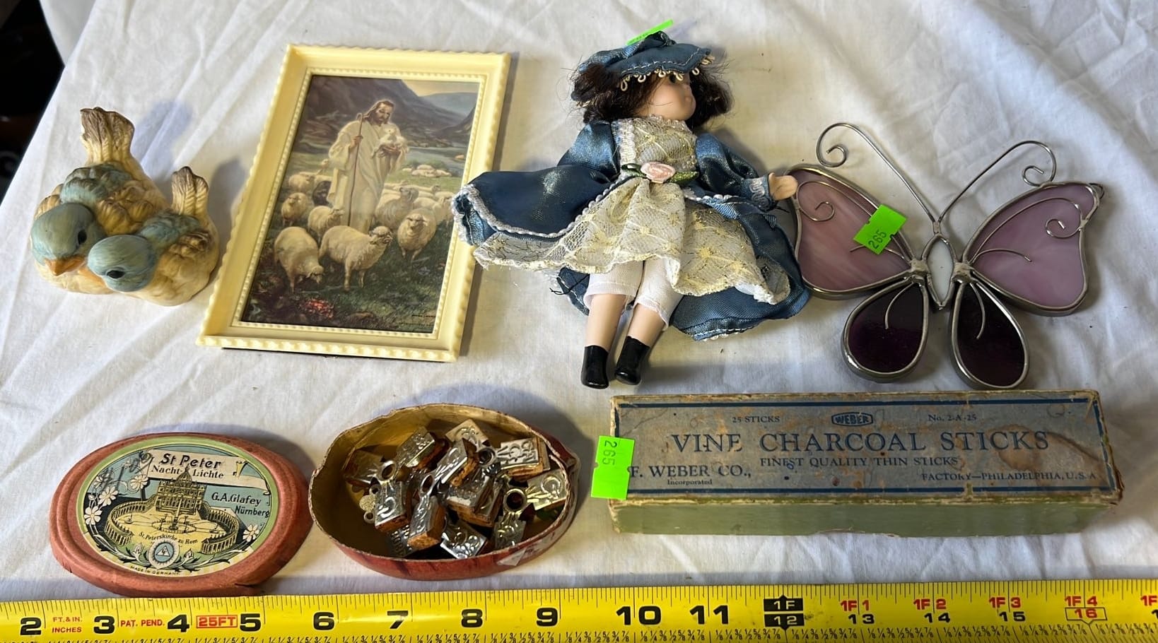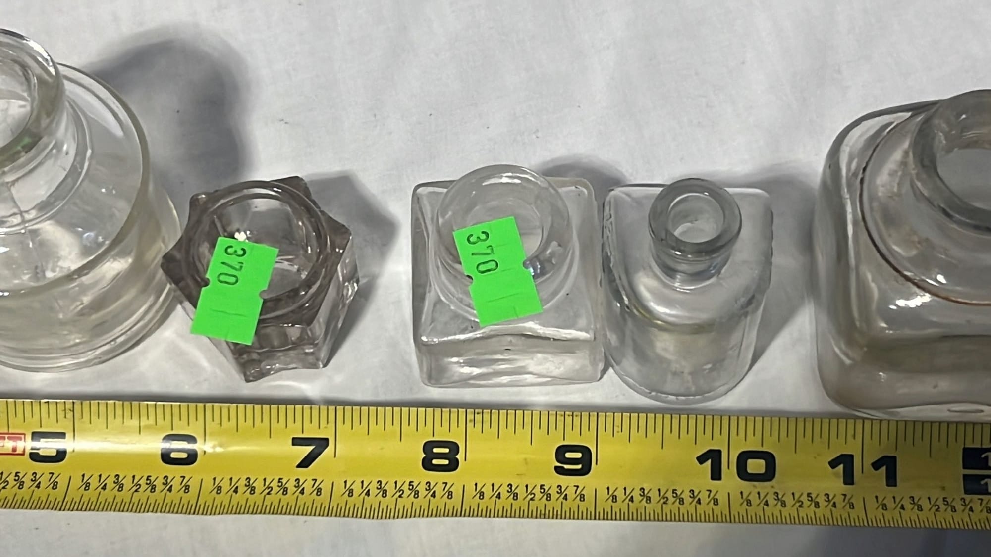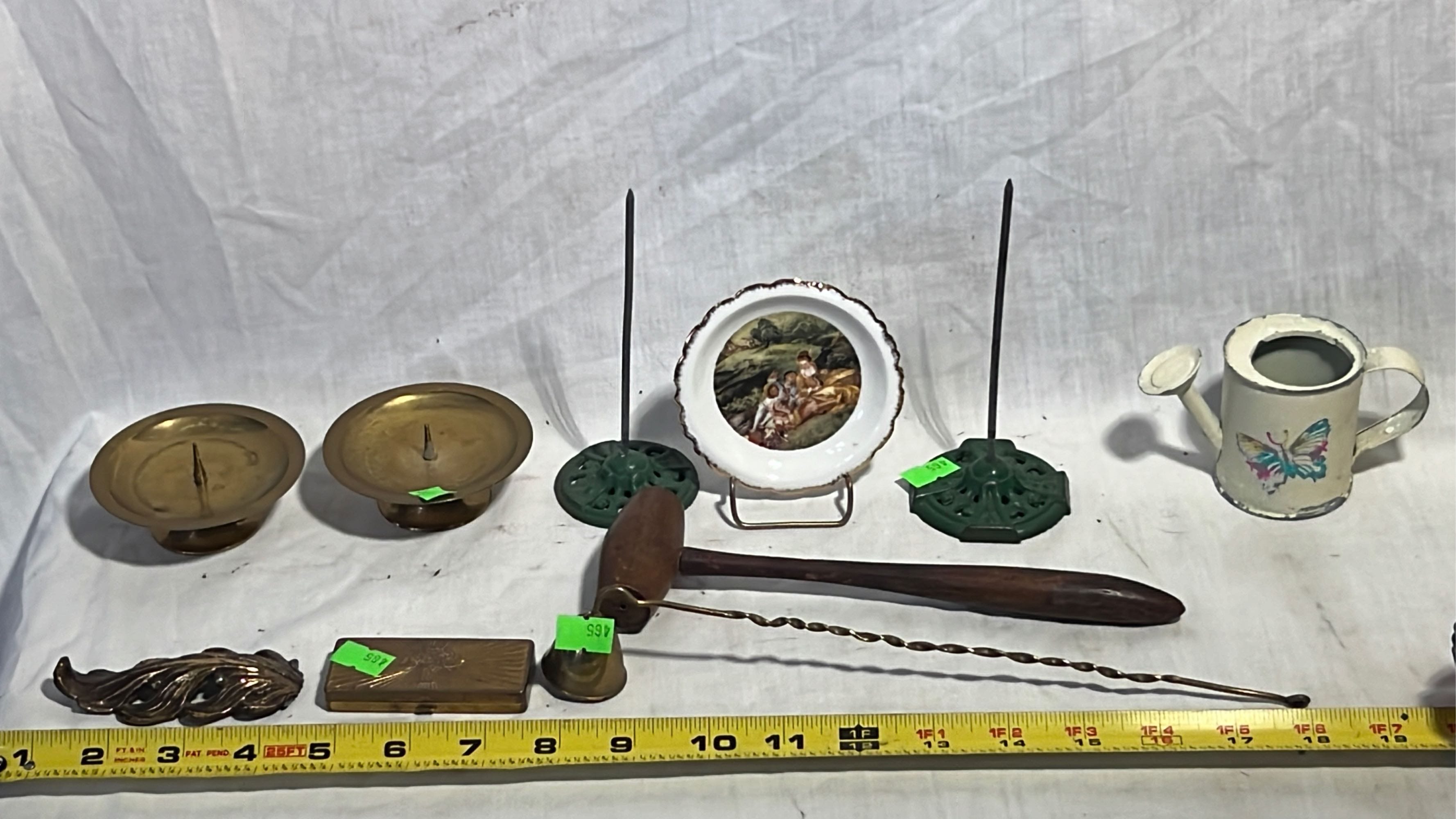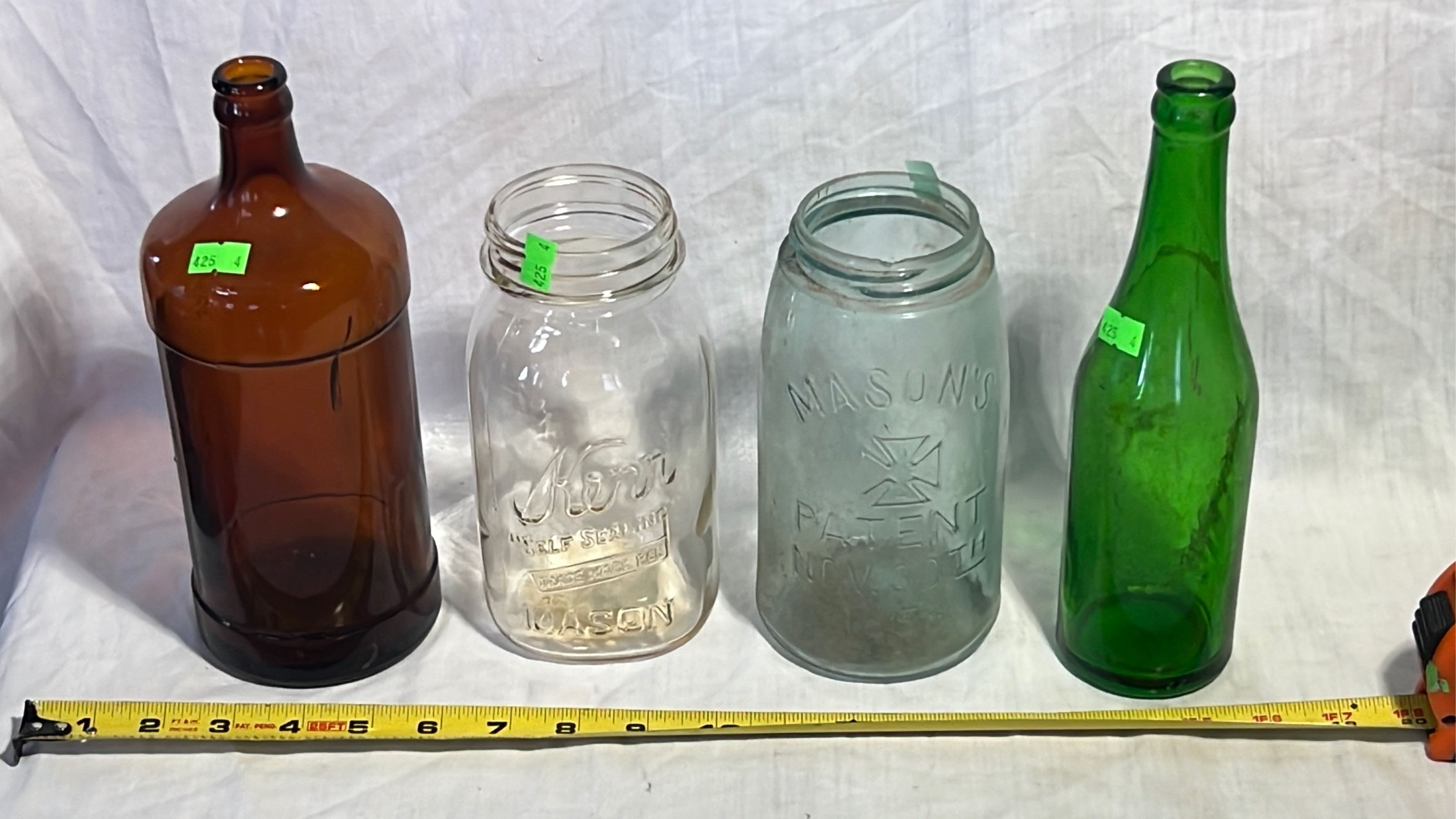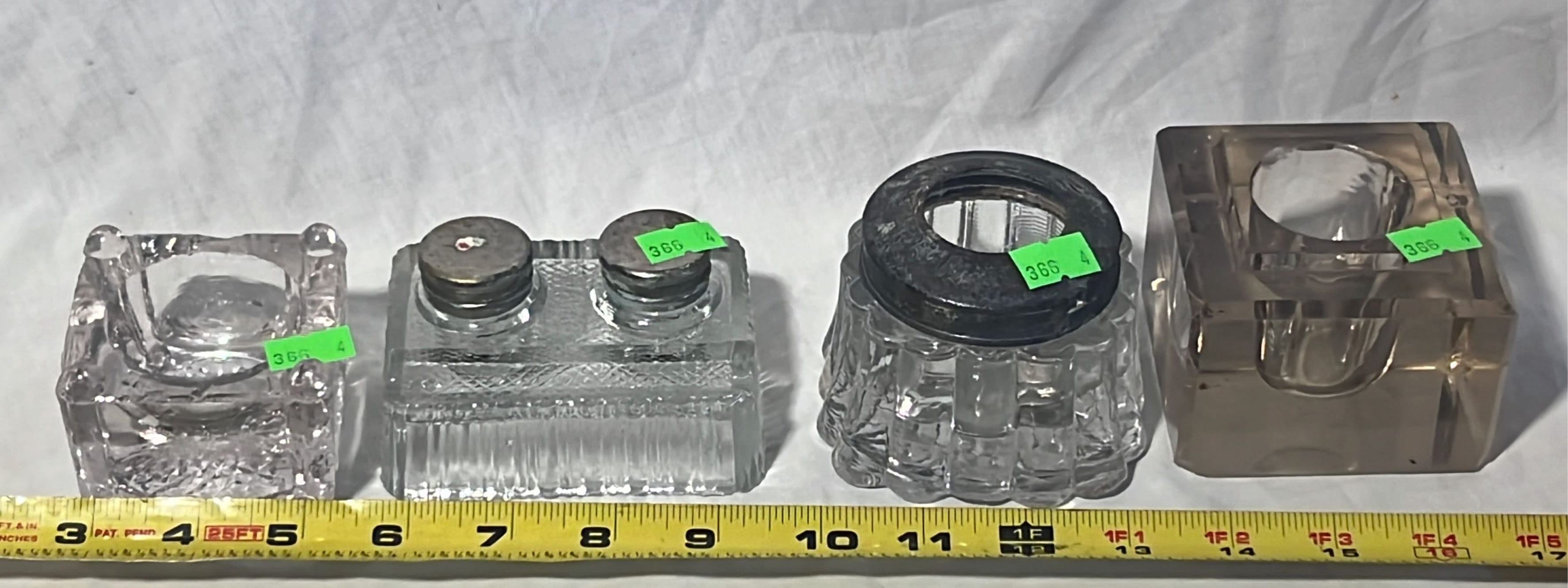 106 Gibson Blue Glass Lid 2.5” • Clear Ball No. 10 Lid 2.25” • Vintage Letter Opener • Brown Funeral Home Thermometer Advertisement 6.5” • Peacock Feathers 16”