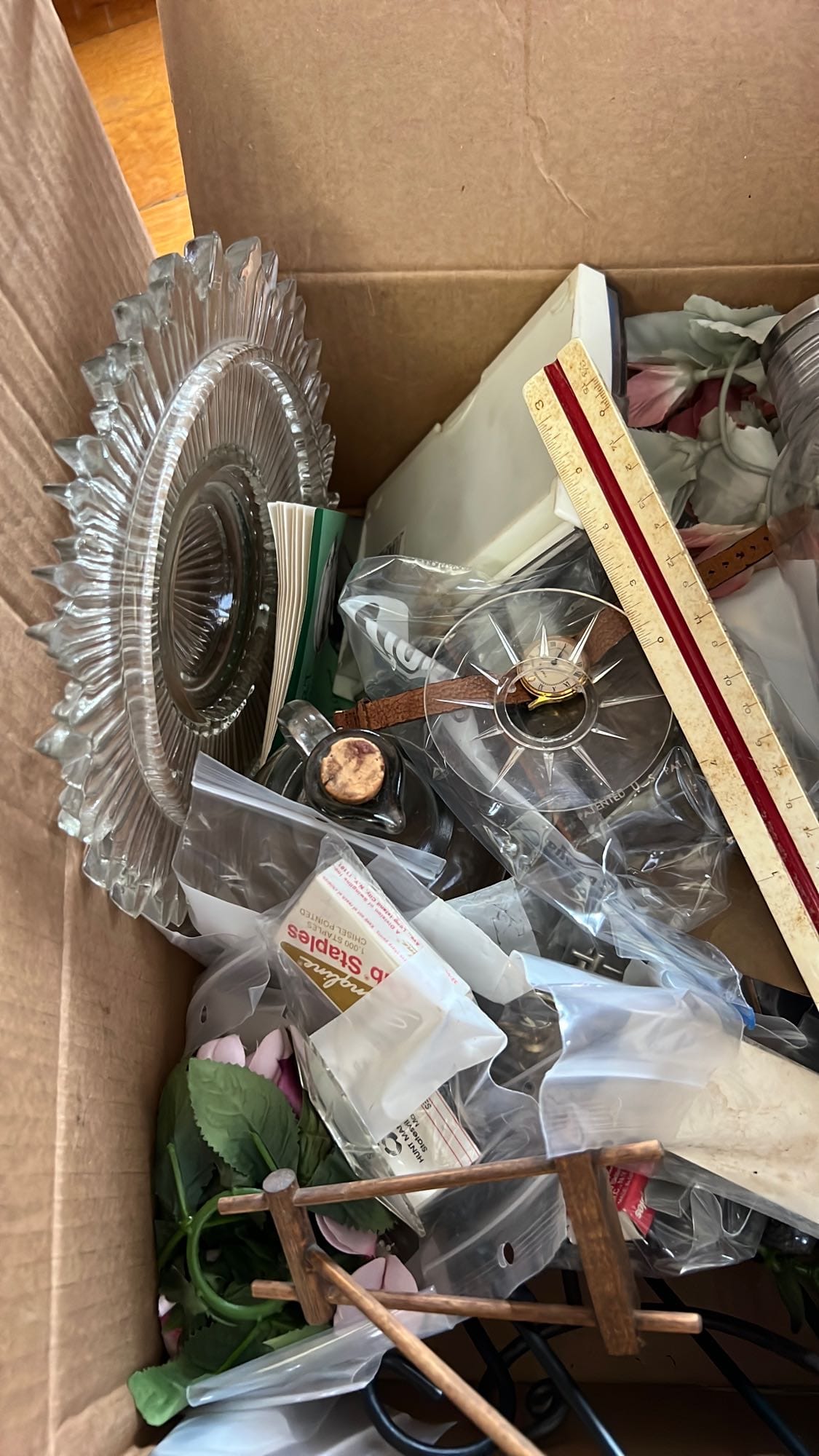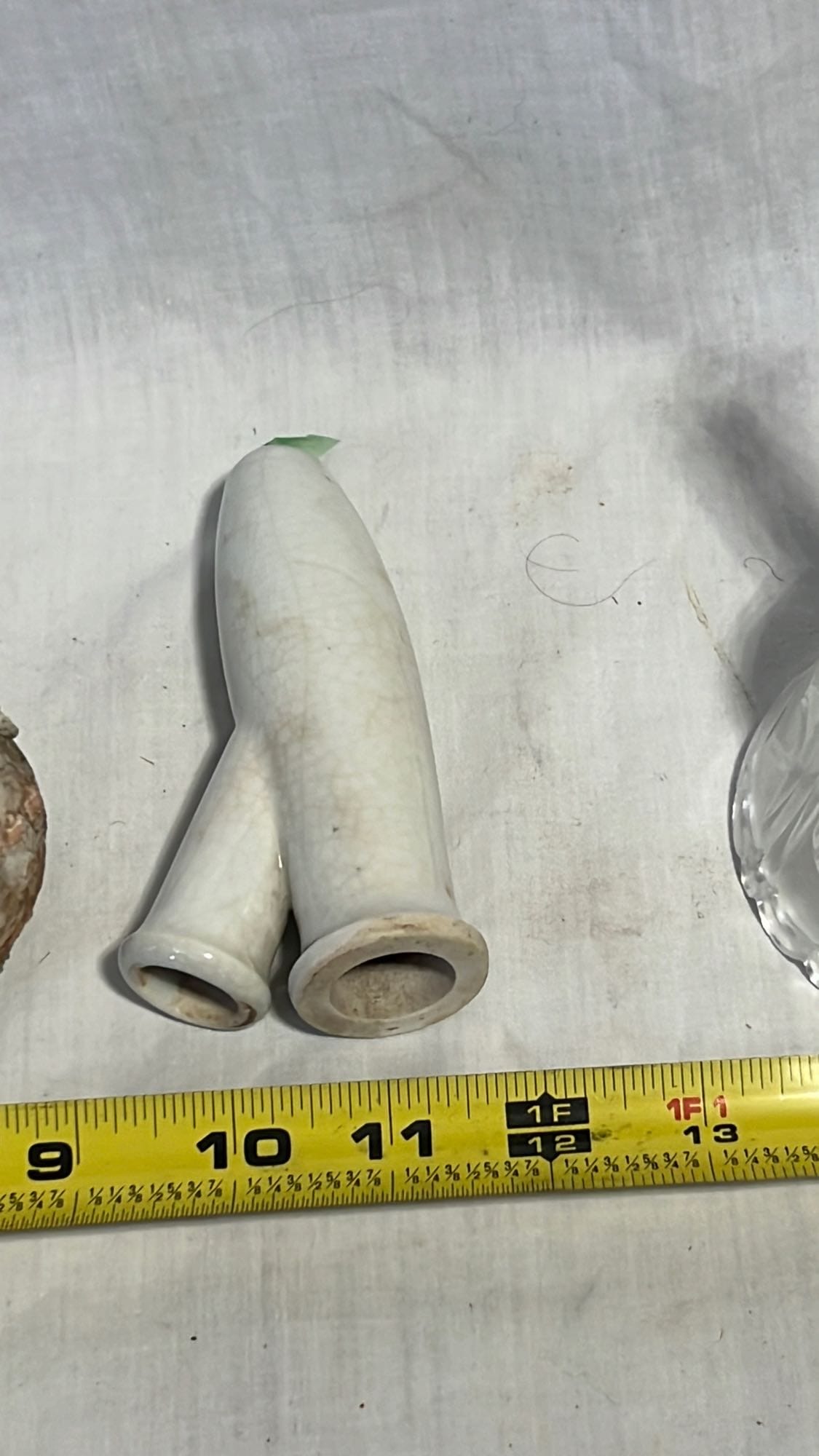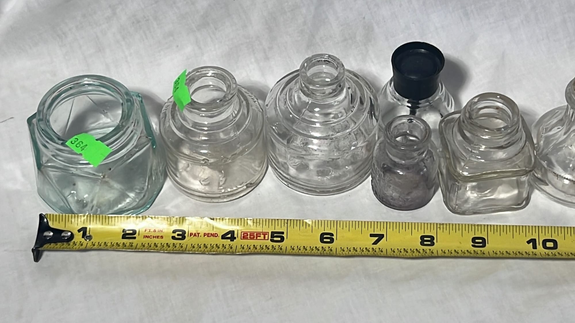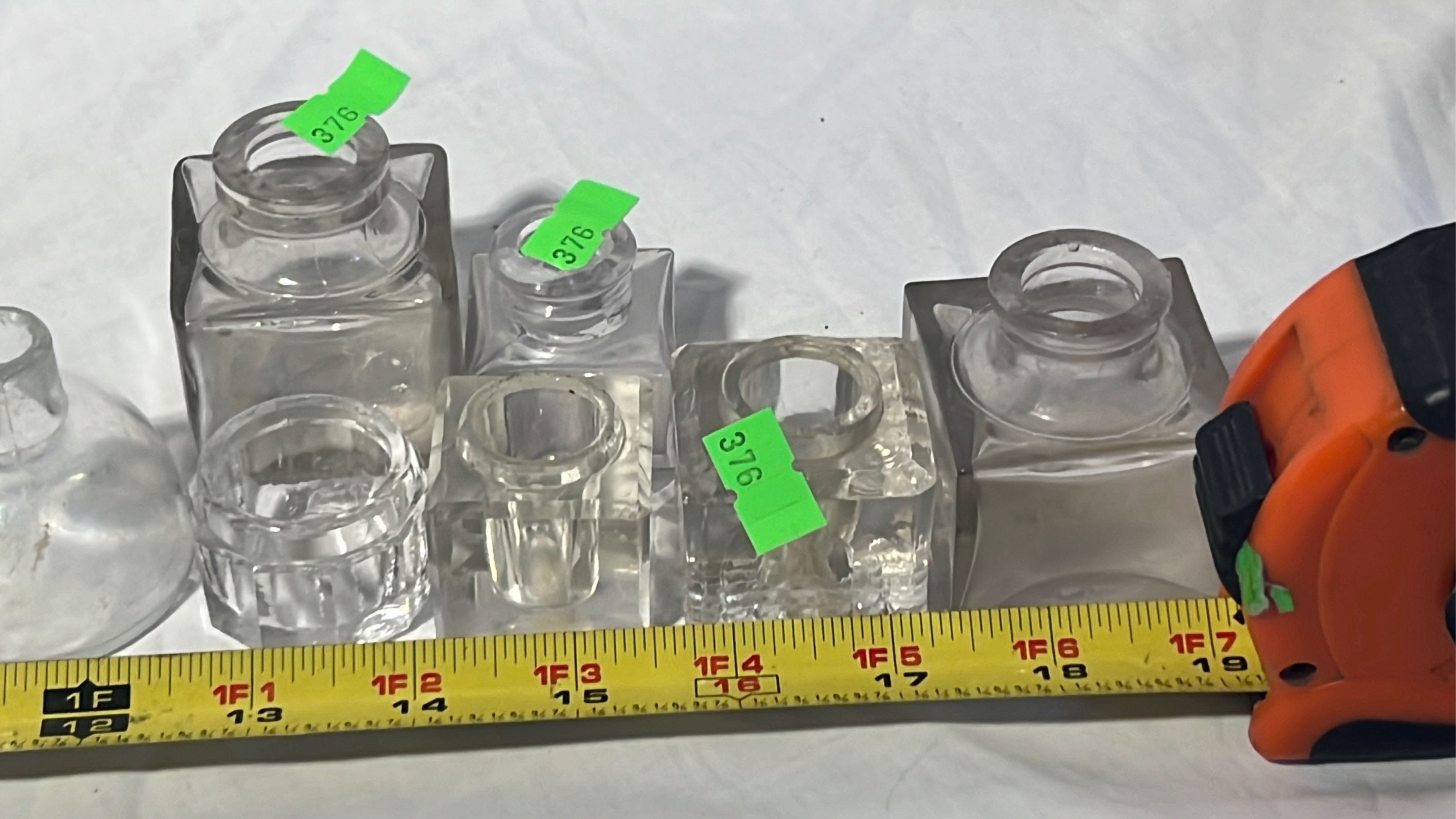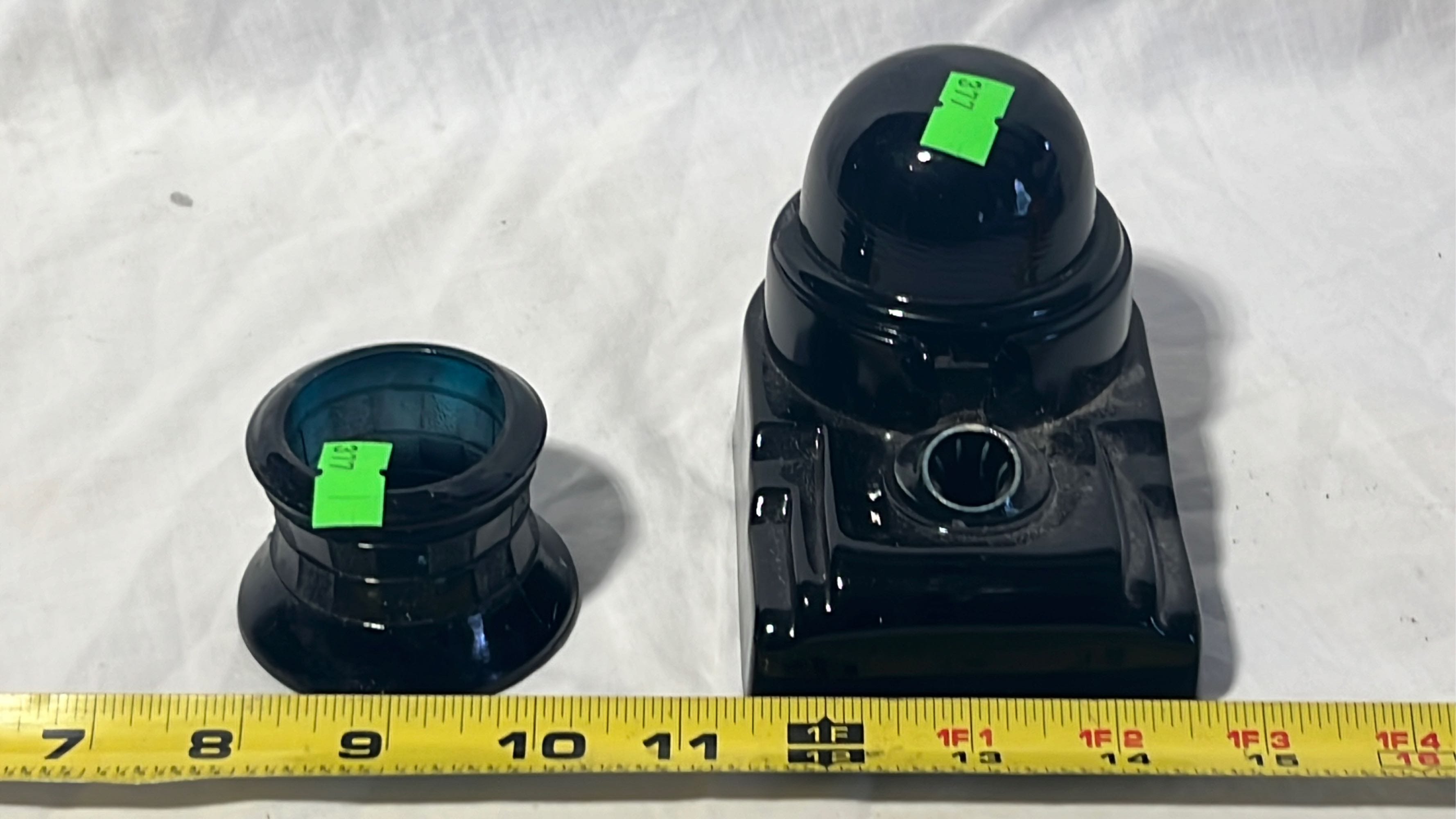 106 Gibson Blue Glass Lid 2.5” • Clear Ball No. 10 Lid 2.25” • Vintage Letter Opener • Brown Funeral Home Thermometer Advertisement 6.5” • Peacock Feathers 16”