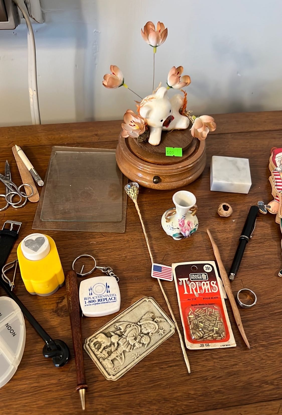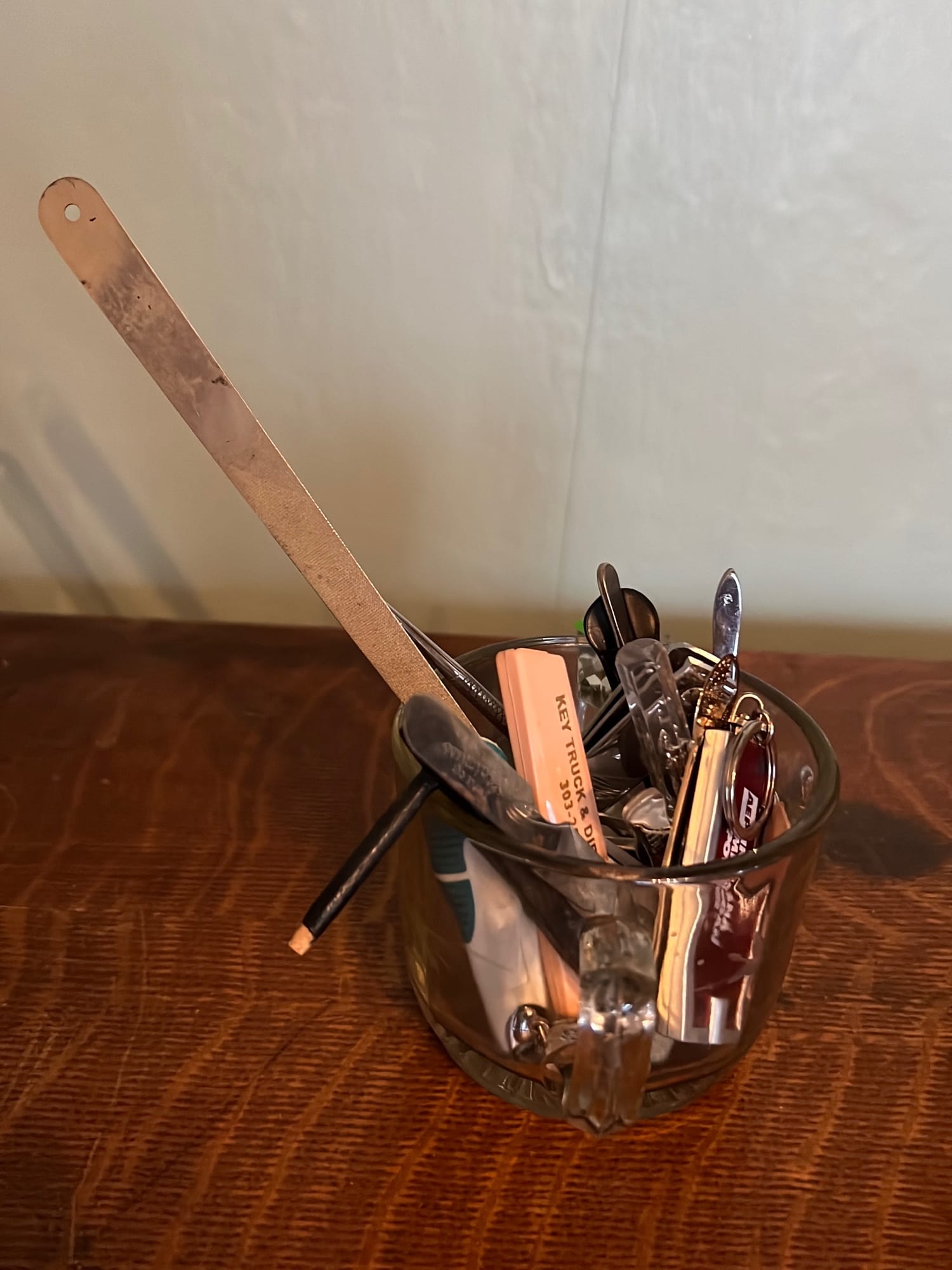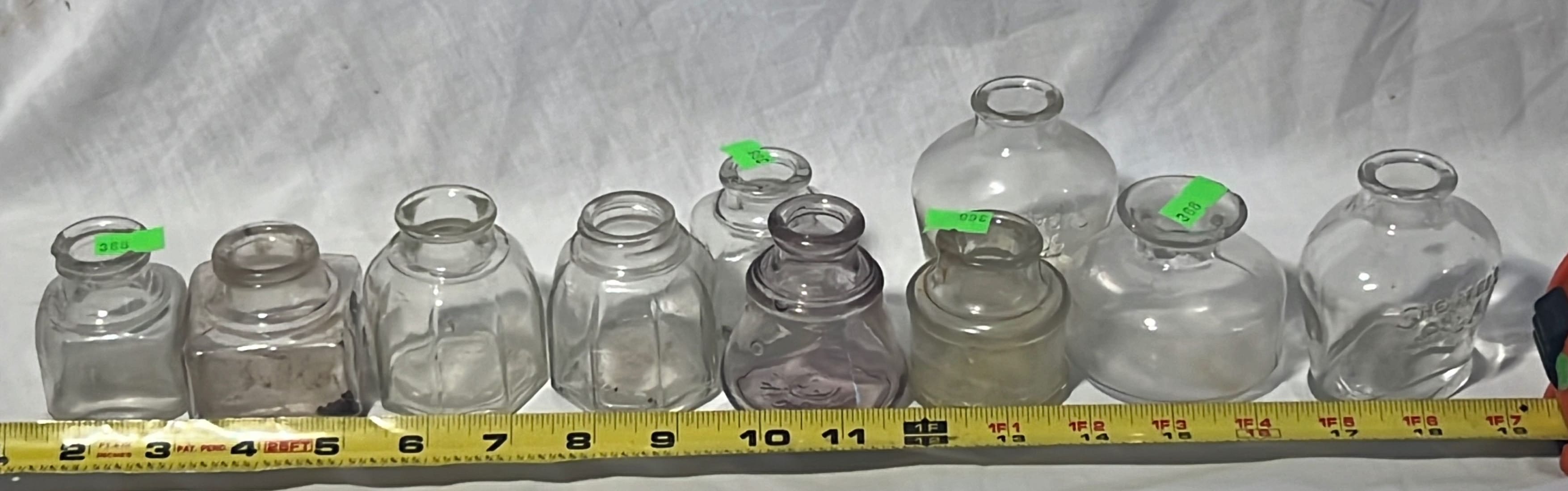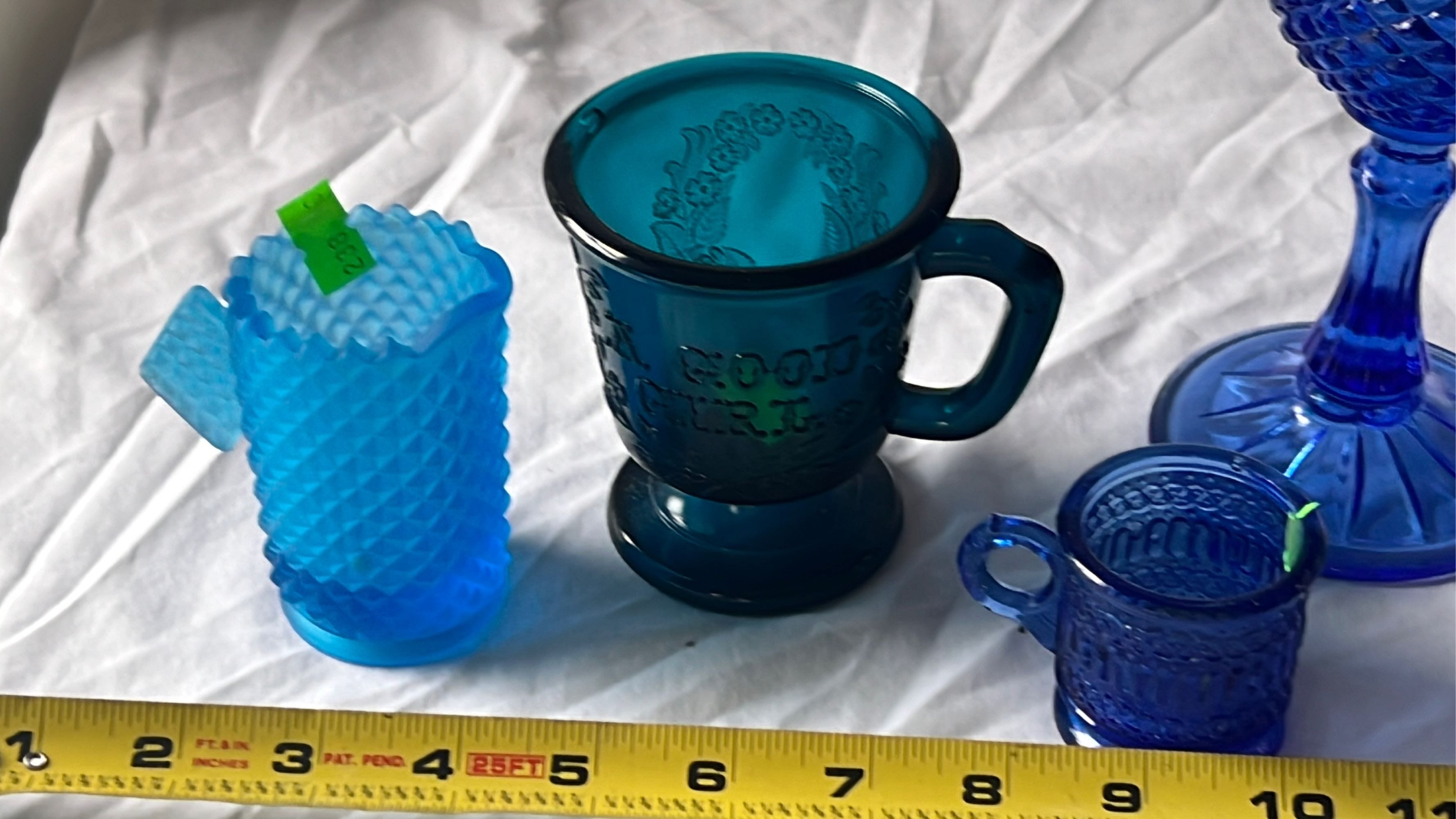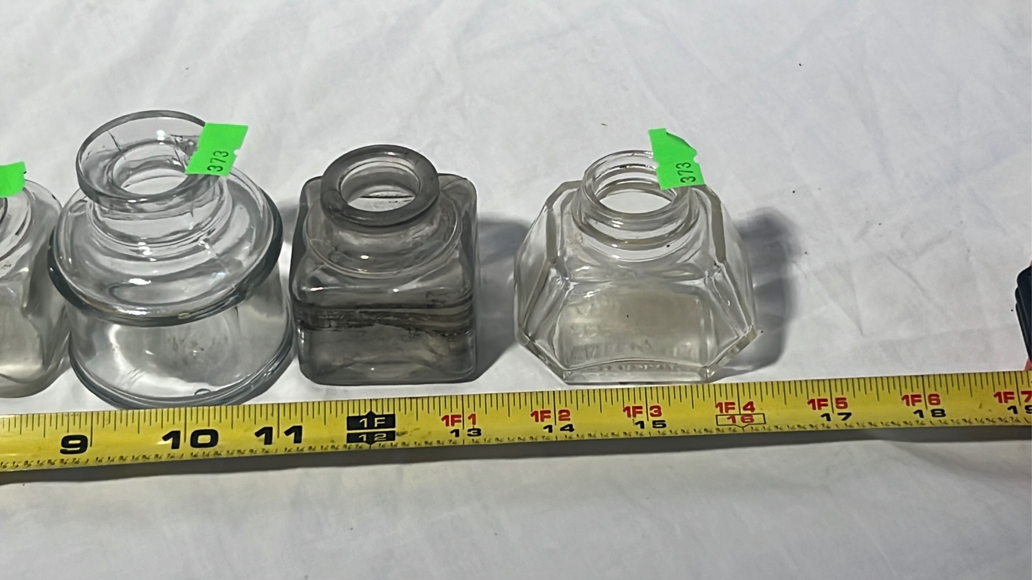 106 Gibson Blue Glass Lid 2.5” • Clear Ball No. 10 Lid 2.25” • Vintage Letter Opener • Brown Funeral Home Thermometer Advertisement 6.5” • Peacock Feathers 16”