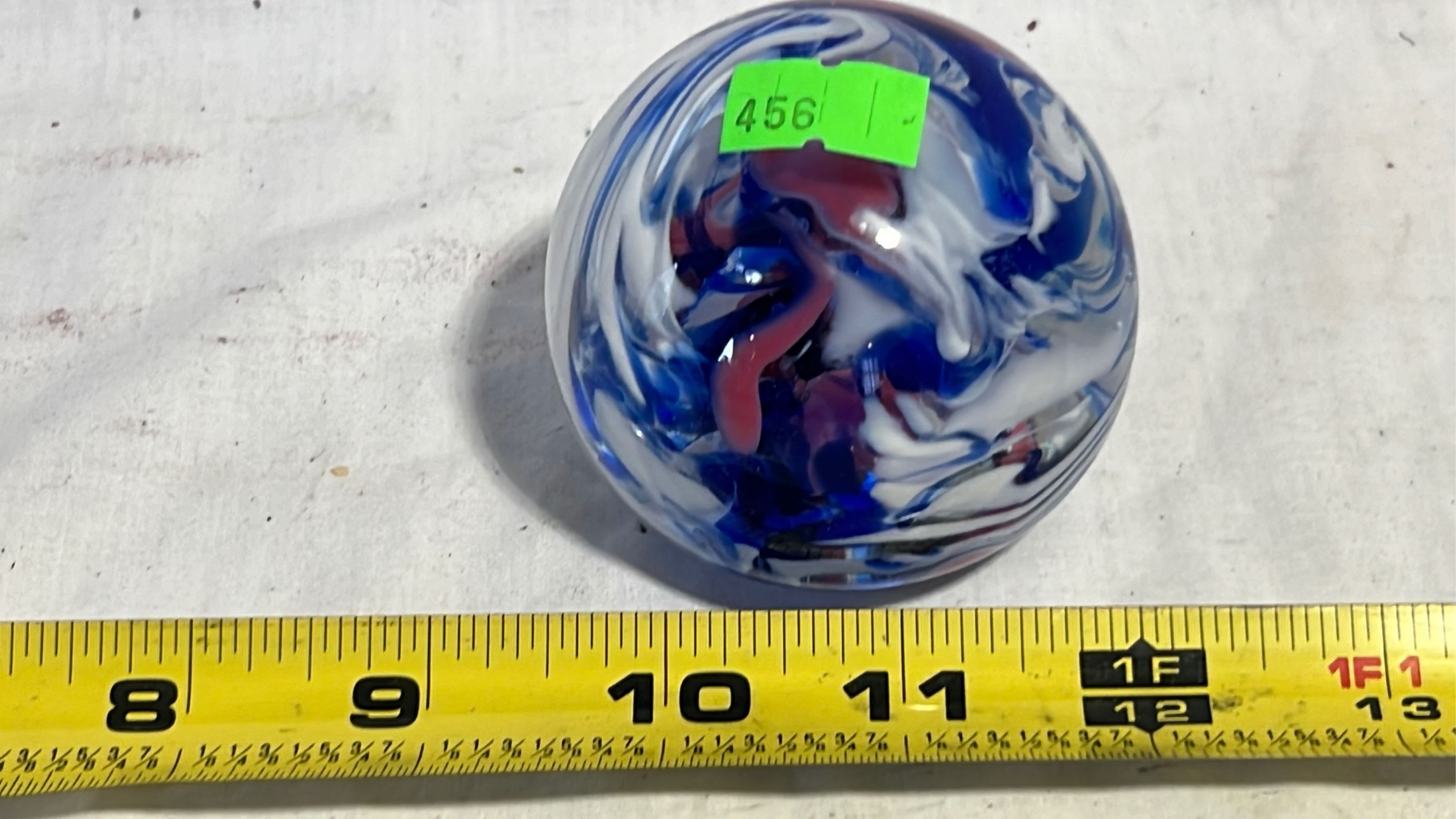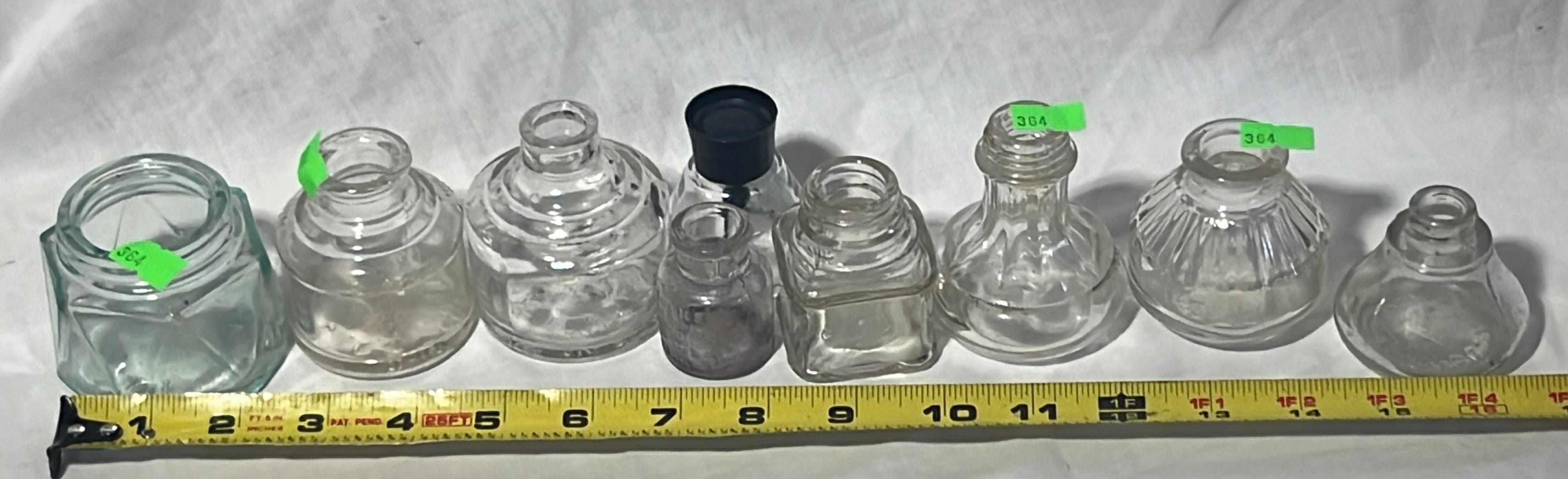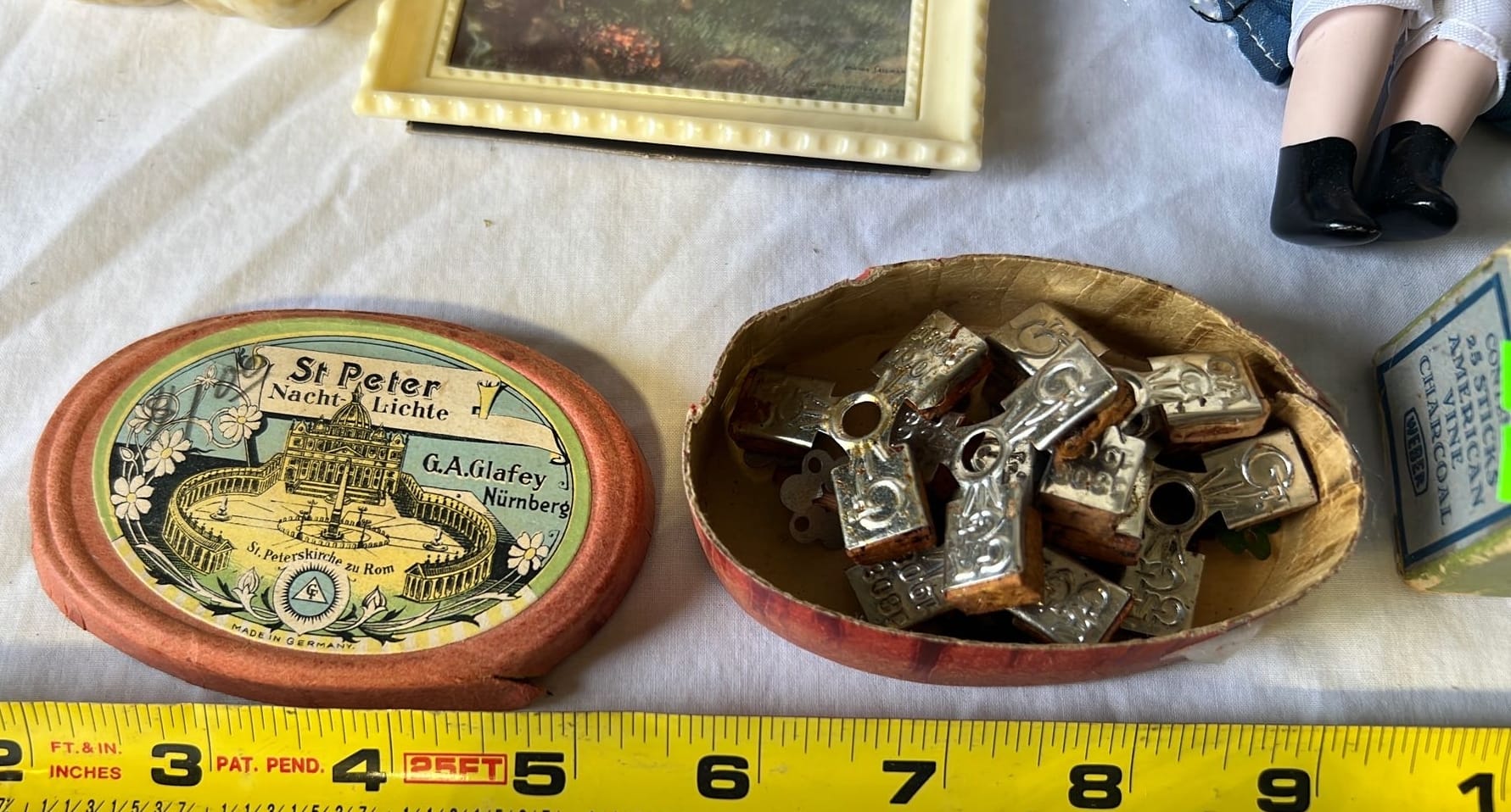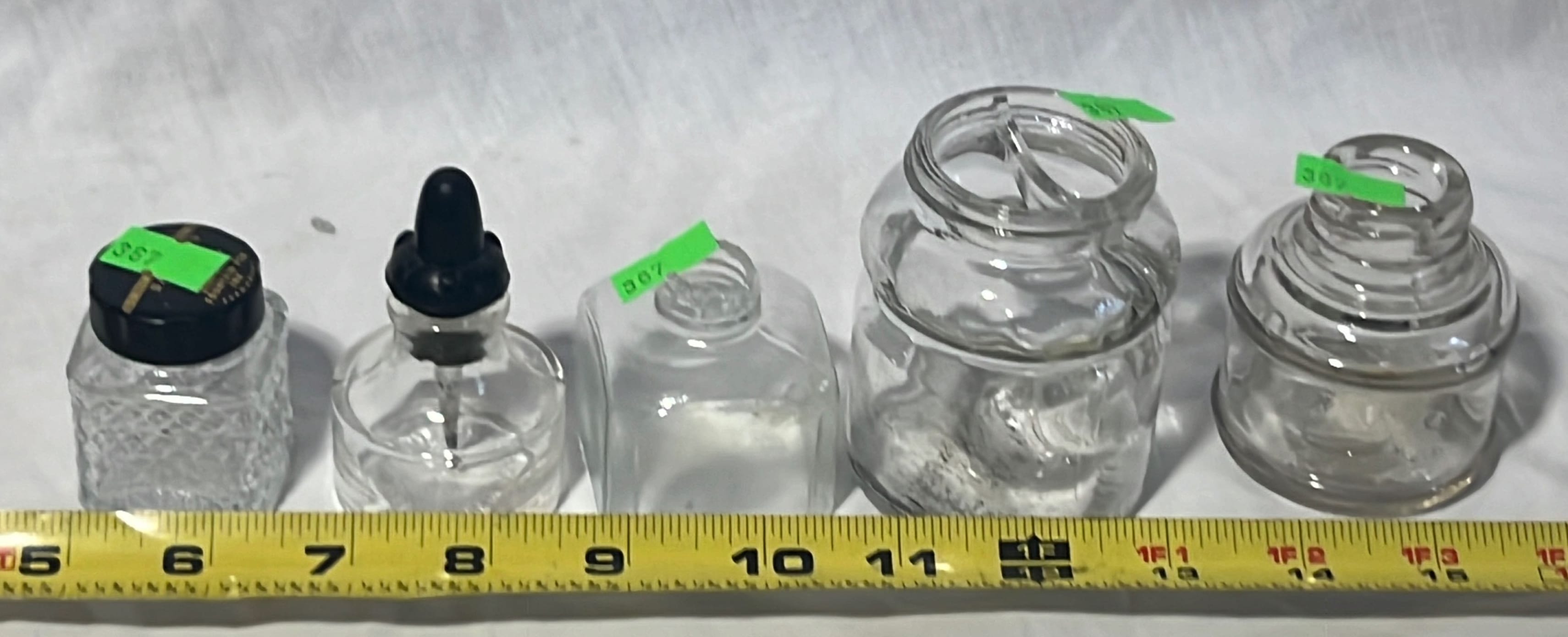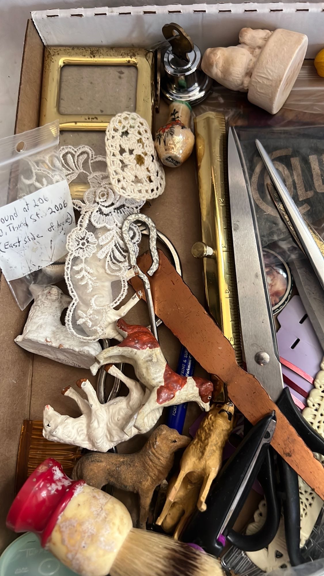 106 Gibson Blue Glass Lid 2.5” • Clear Ball No. 10 Lid 2.25” • Vintage Letter Opener • Brown Funeral Home Thermometer Advertisement 6.5” • Peacock Feathers 16”