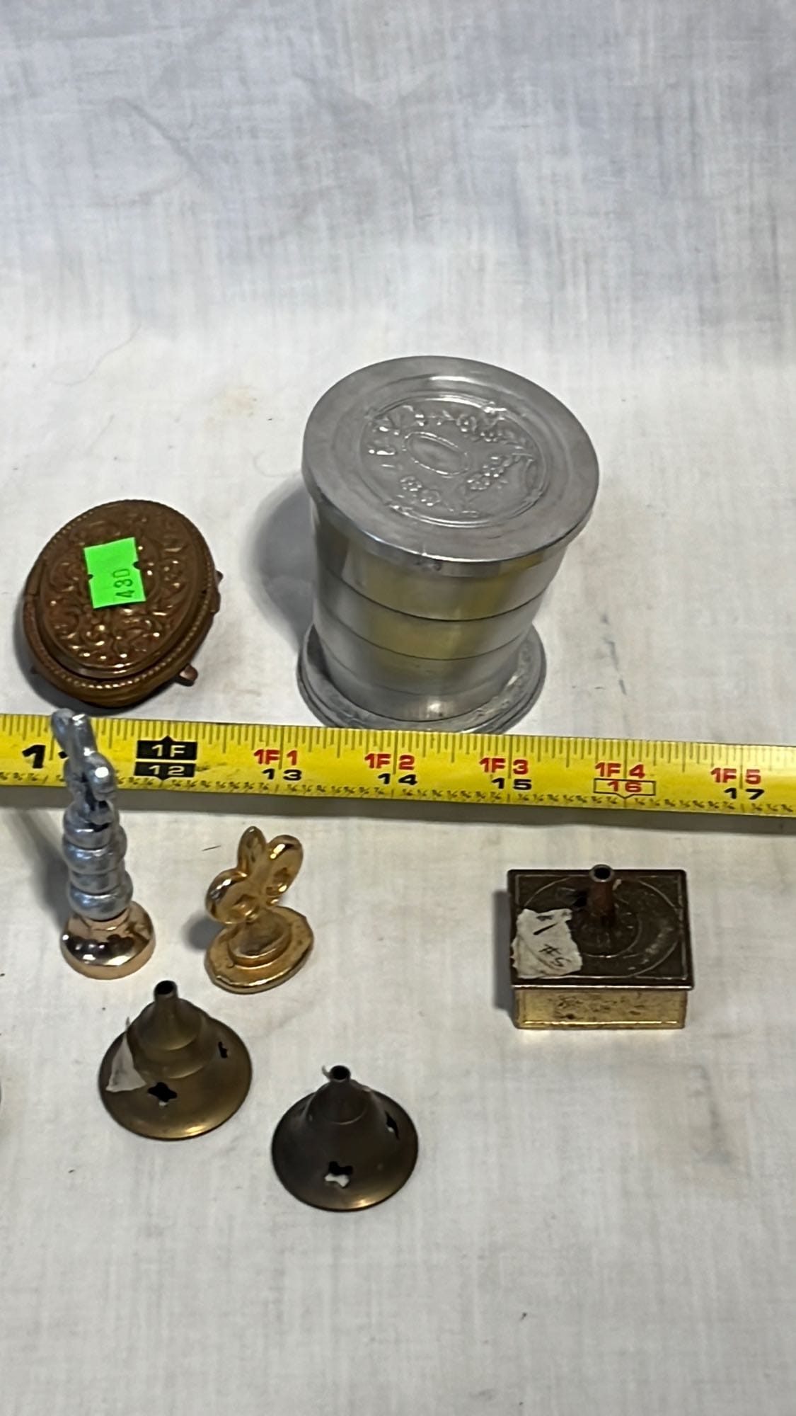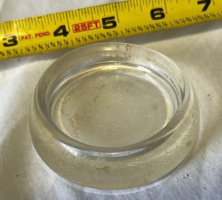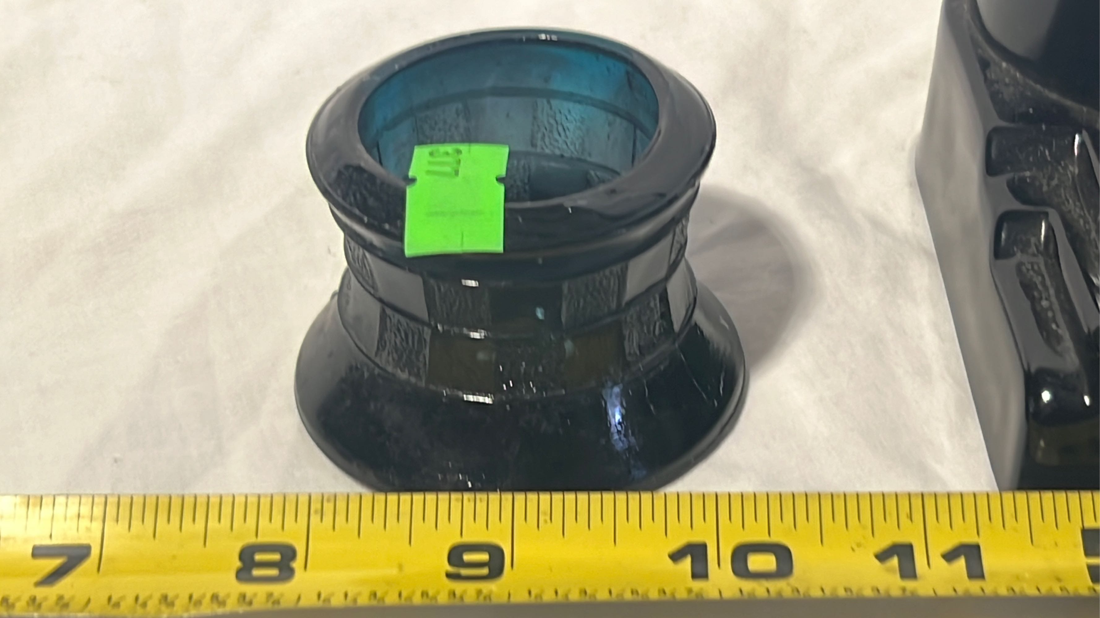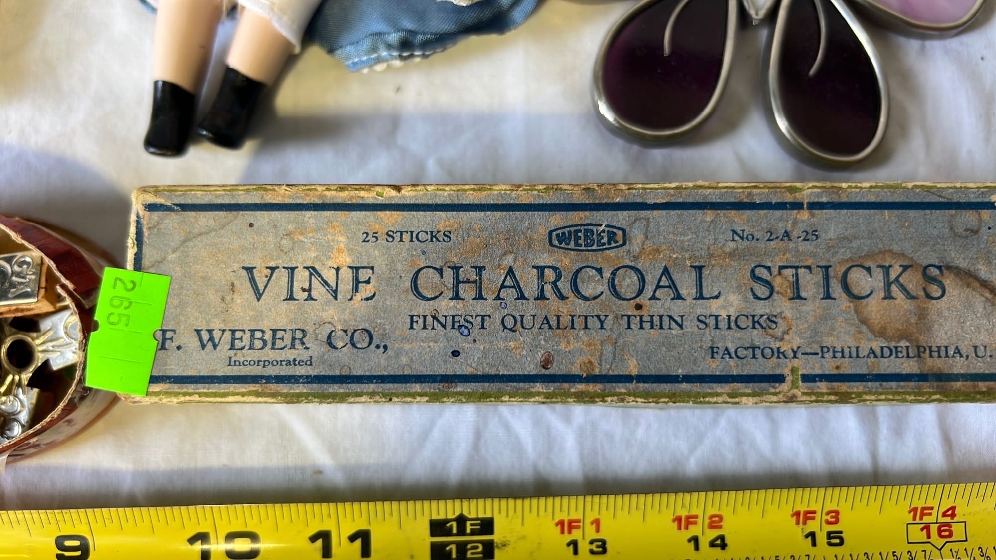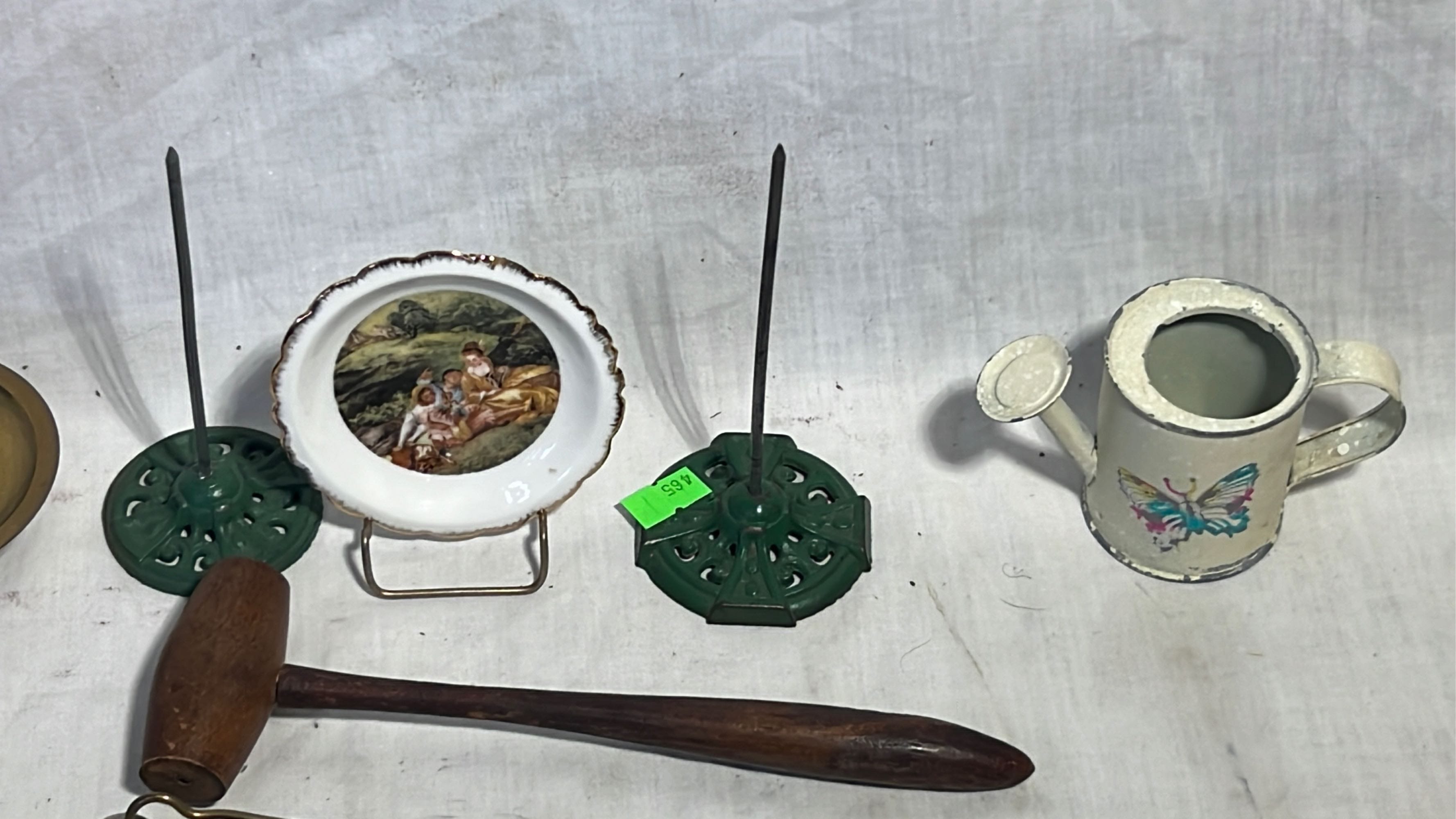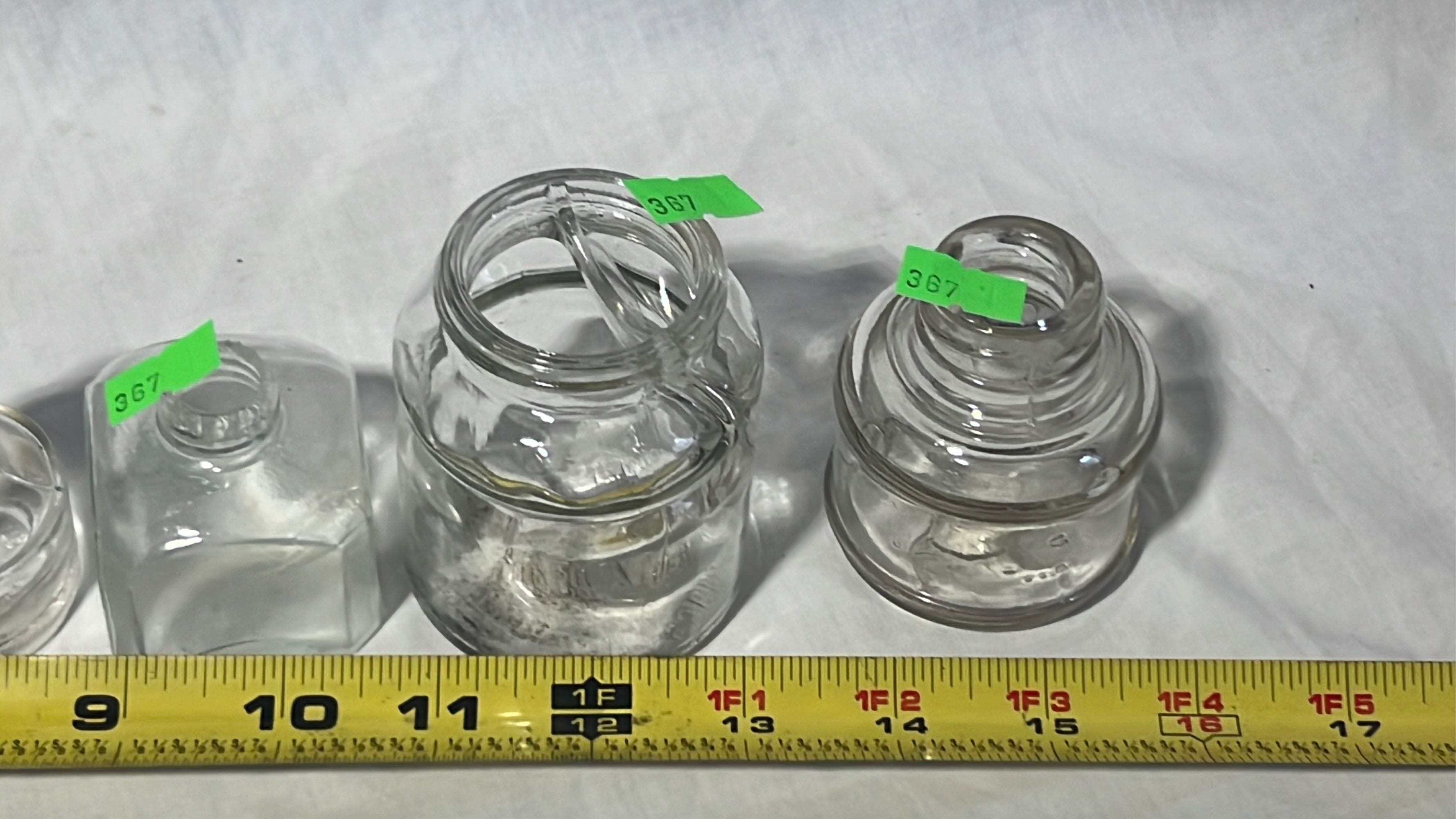 106 Gibson Blue Glass Lid 2.5” • Clear Ball No. 10 Lid 2.25” • Vintage Letter Opener • Brown Funeral Home Thermometer Advertisement 6.5” • Peacock Feathers 16”