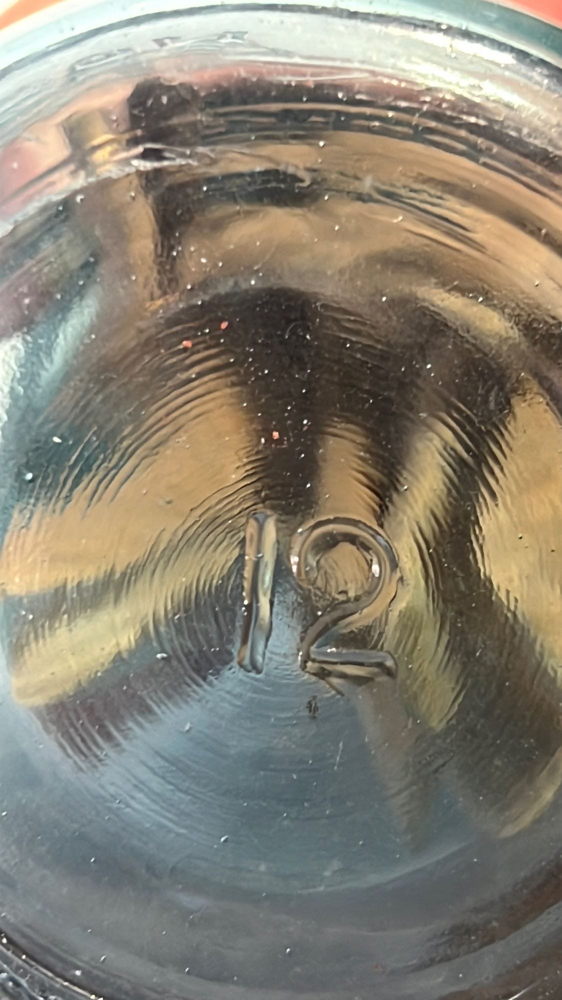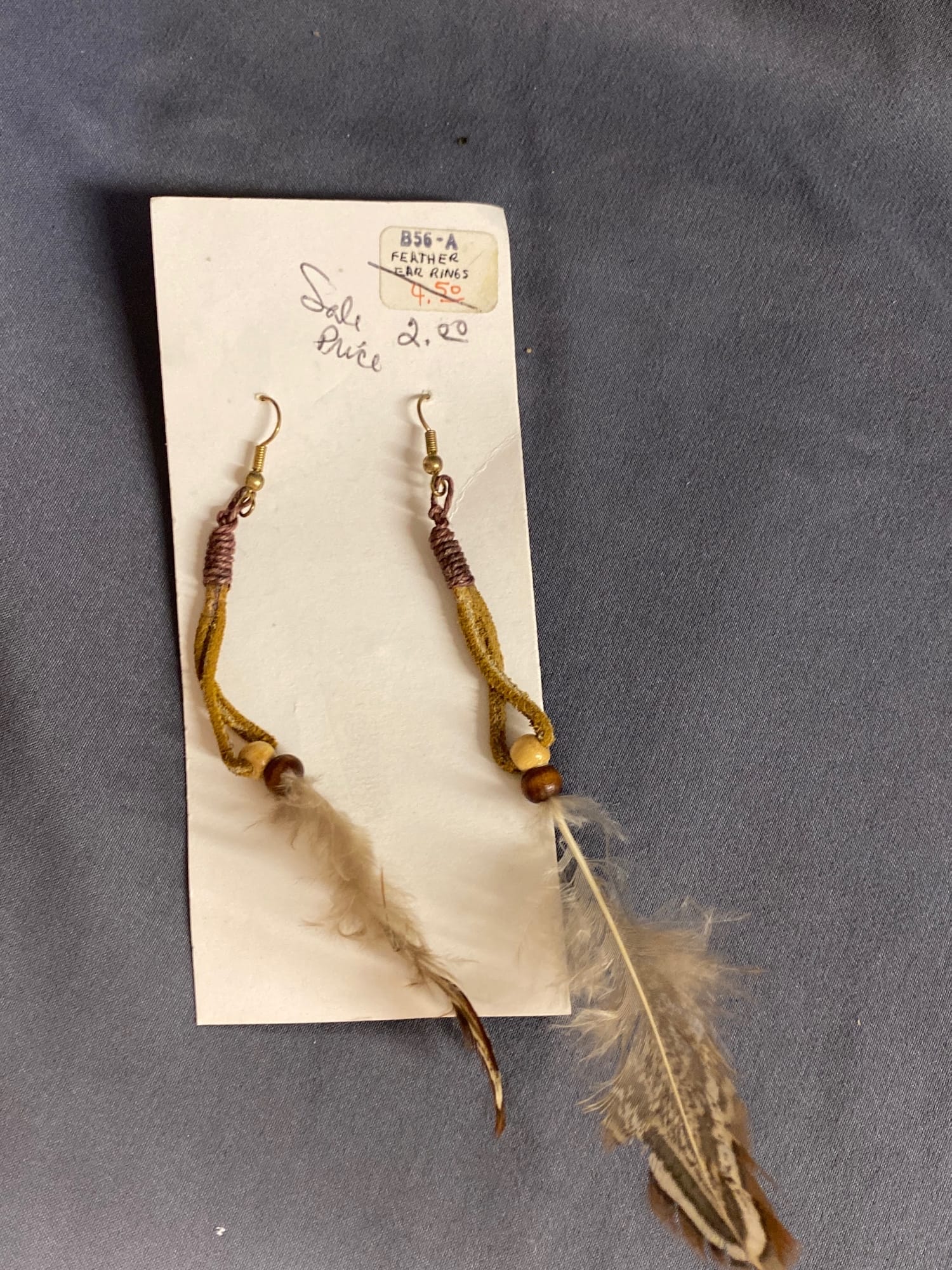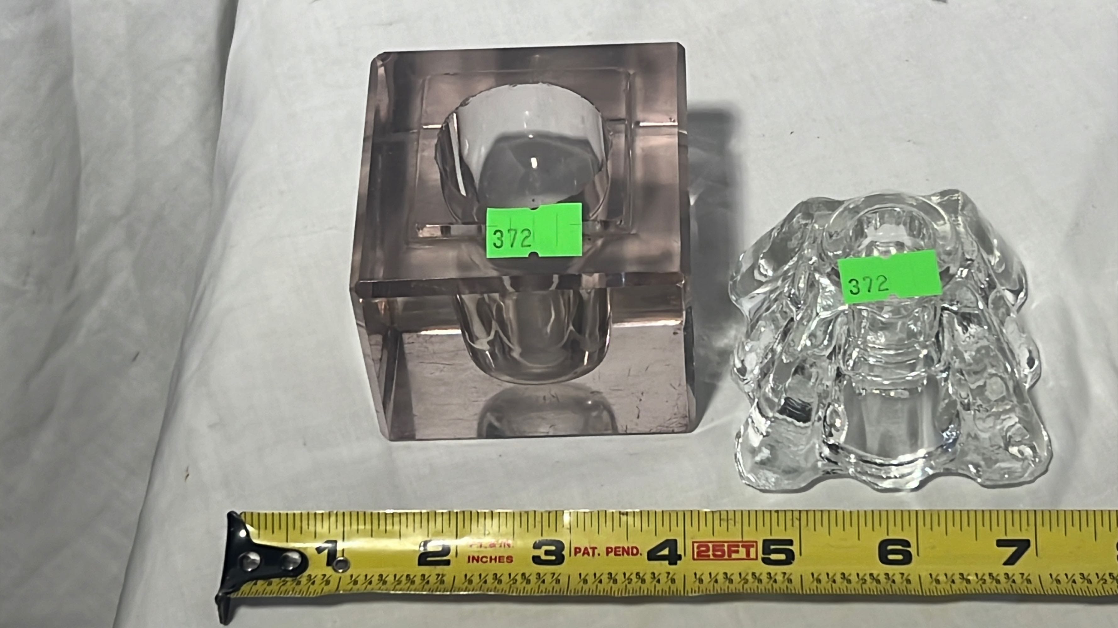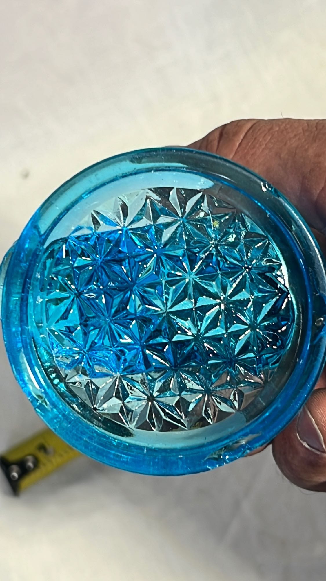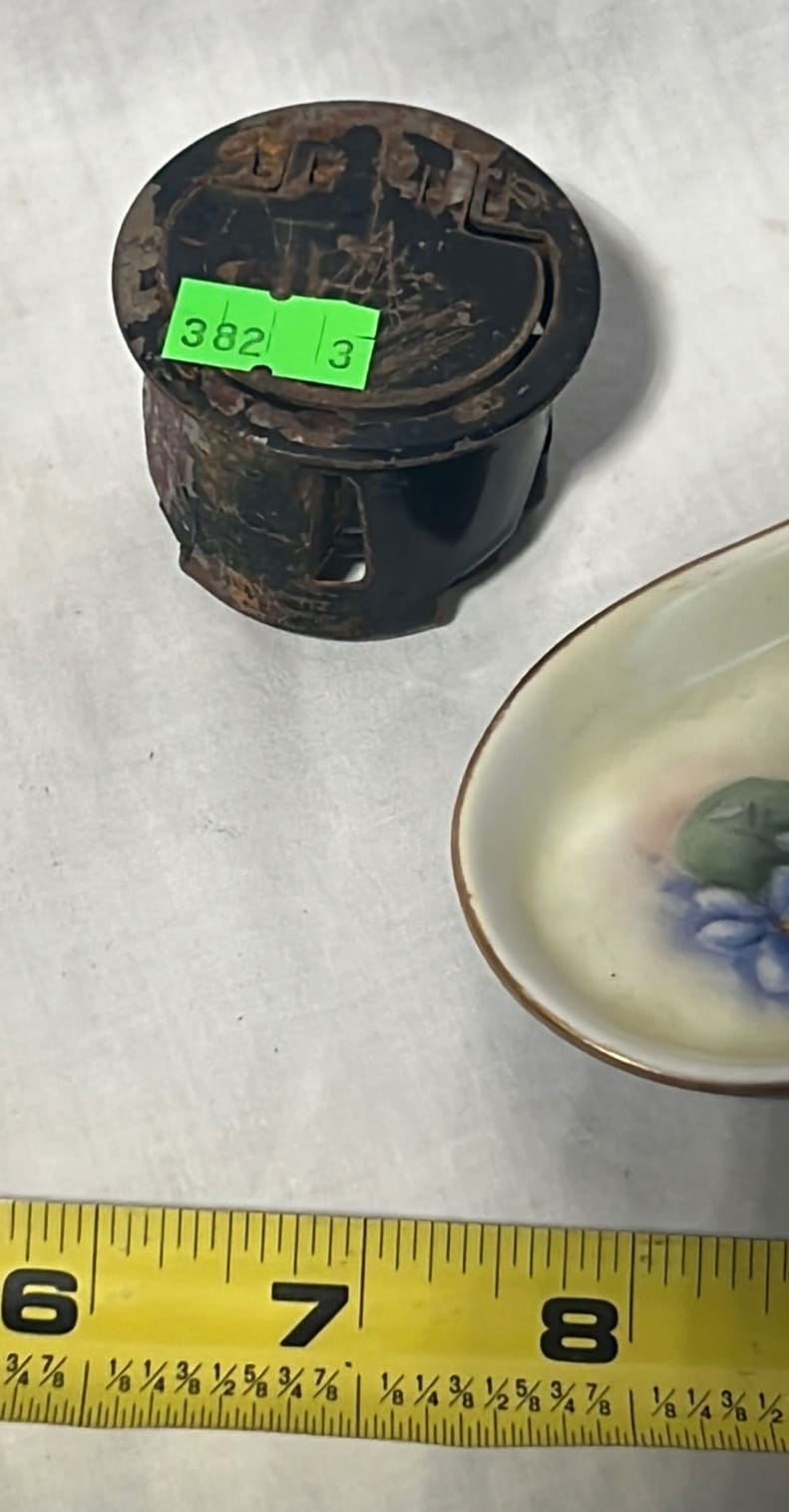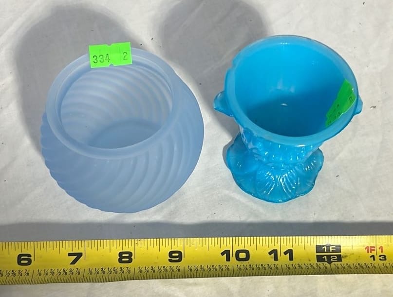 106 Gibson Blue Glass Lid 2.5” • Clear Ball No. 10 Lid 2.25” • Vintage Letter Opener • Brown Funeral Home Thermometer Advertisement 6.5” • Peacock Feathers 16”