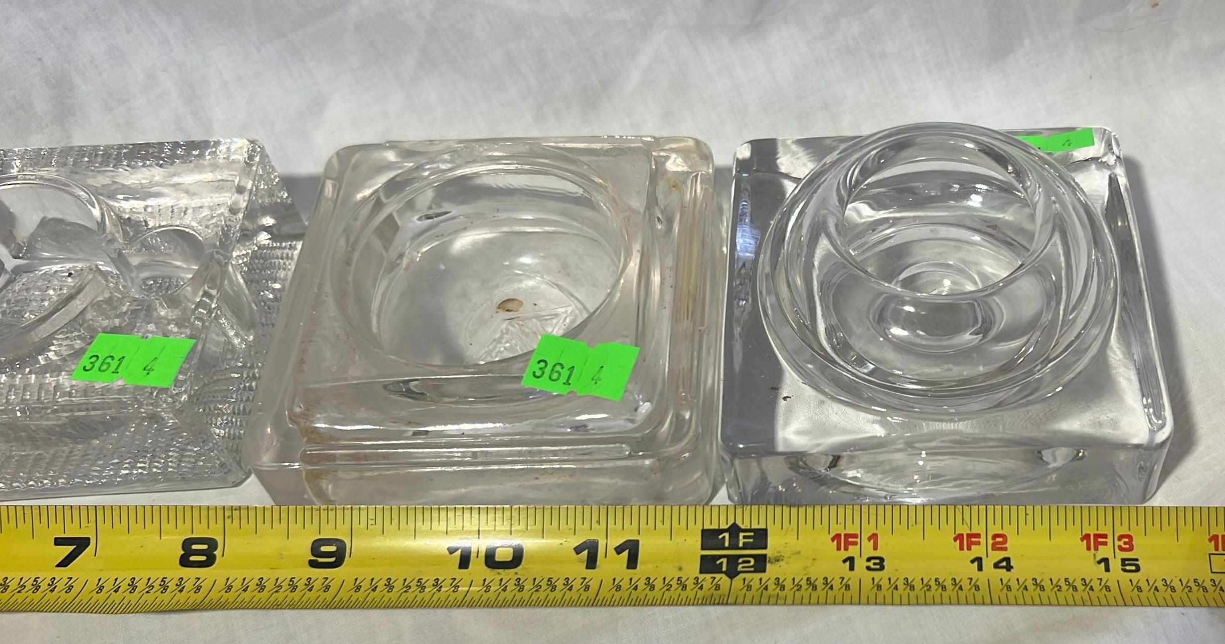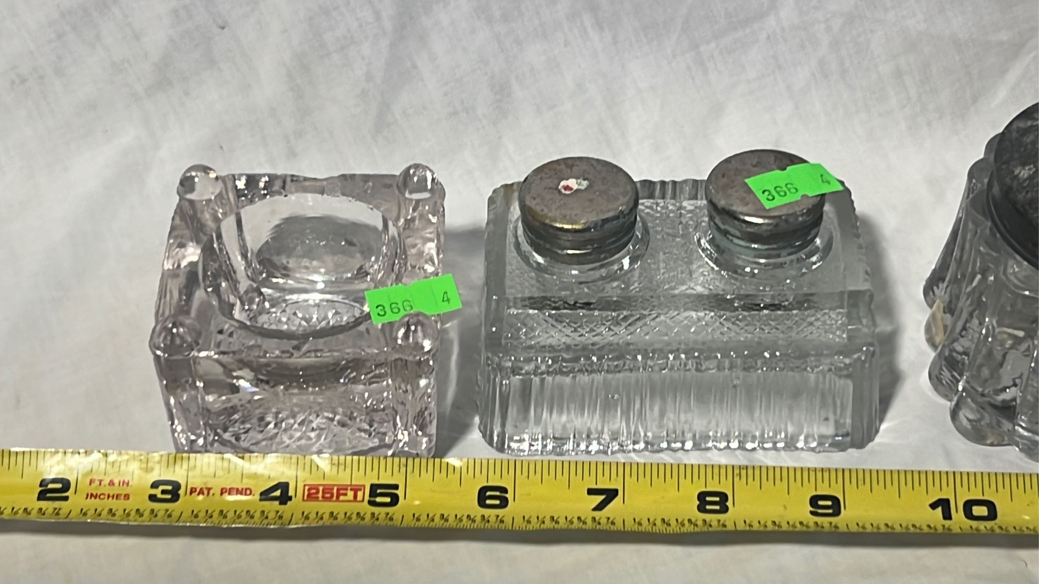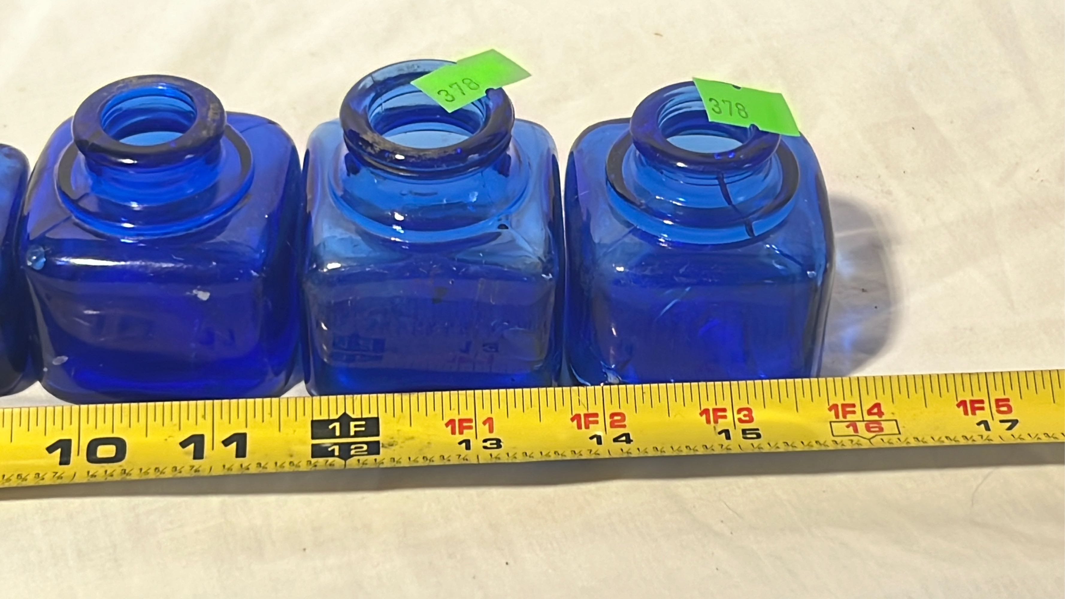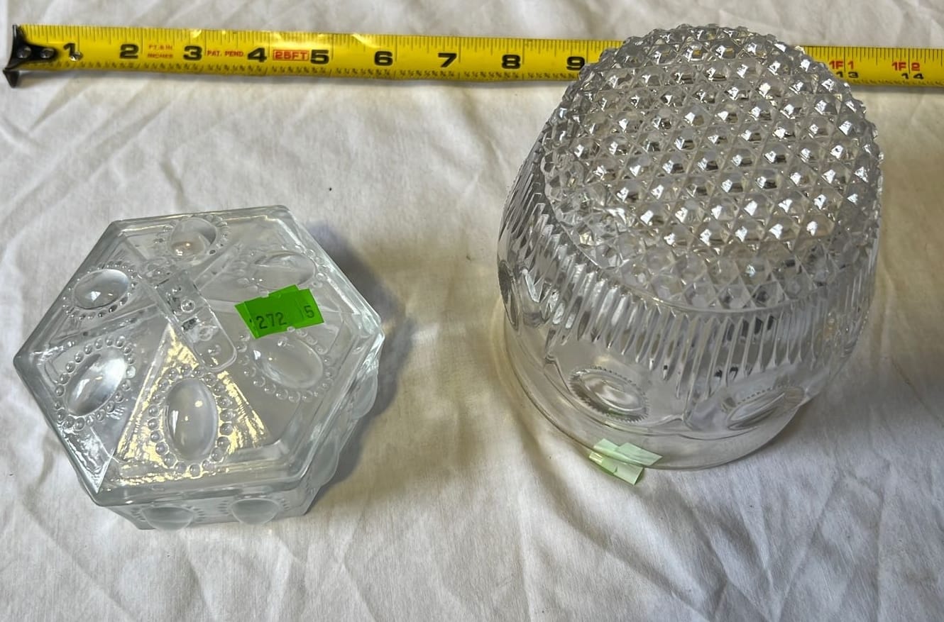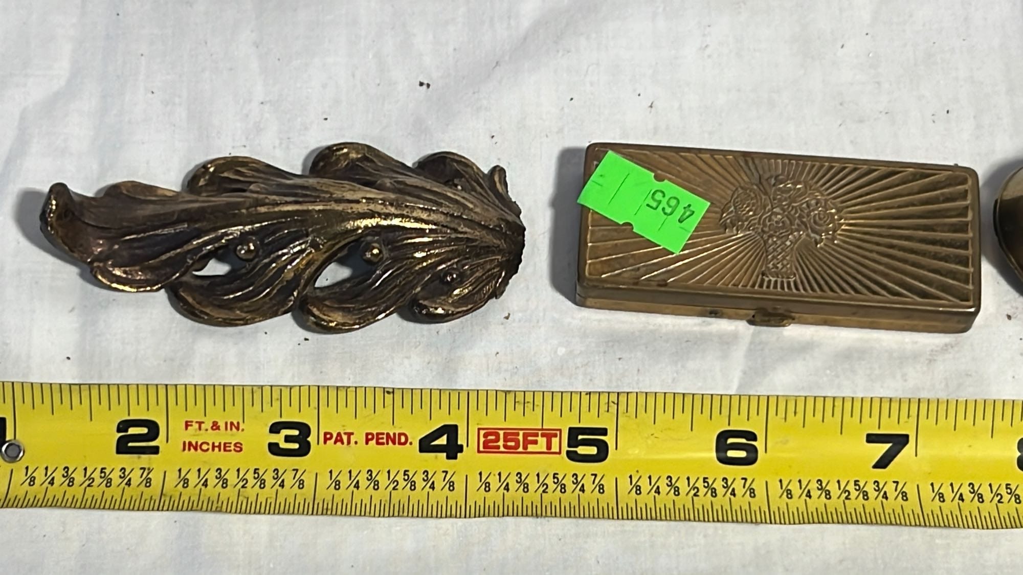 106 Gibson Blue Glass Lid 2.5” • Clear Ball No. 10 Lid 2.25” • Vintage Letter Opener • Brown Funeral Home Thermometer Advertisement 6.5” • Peacock Feathers 16”