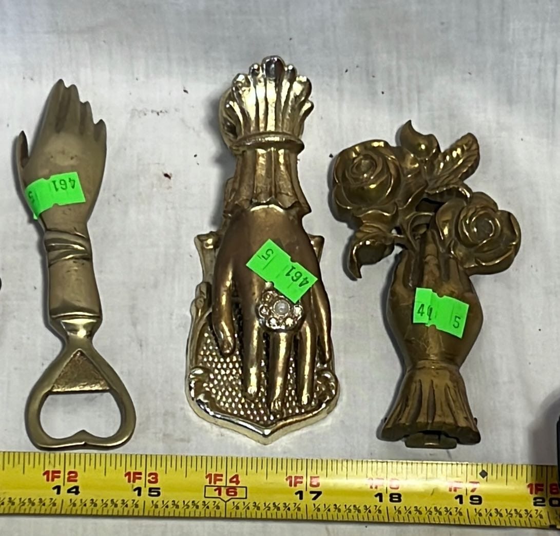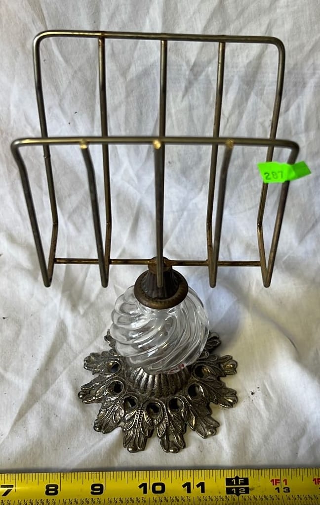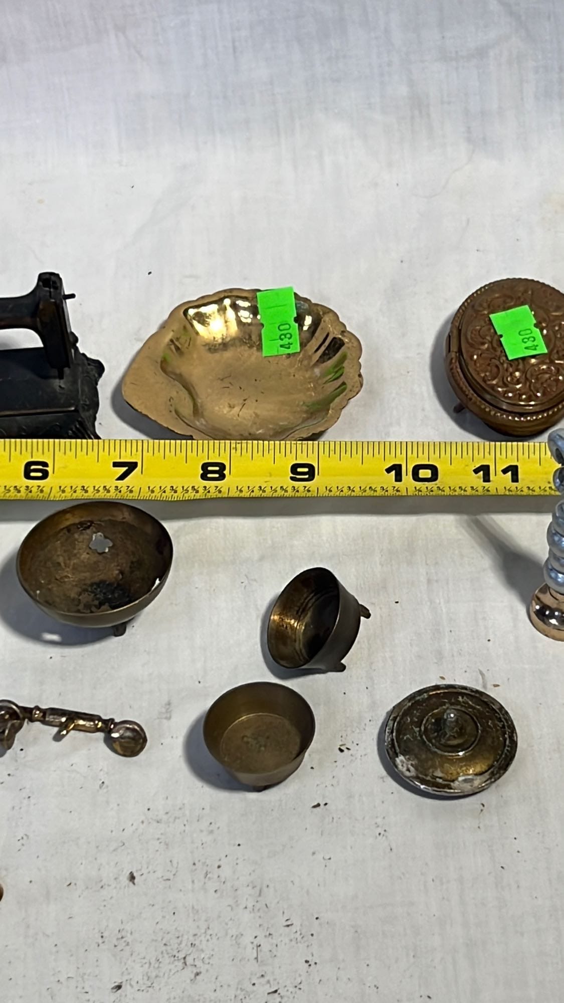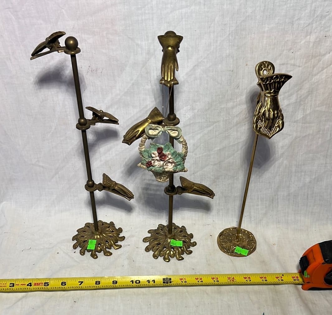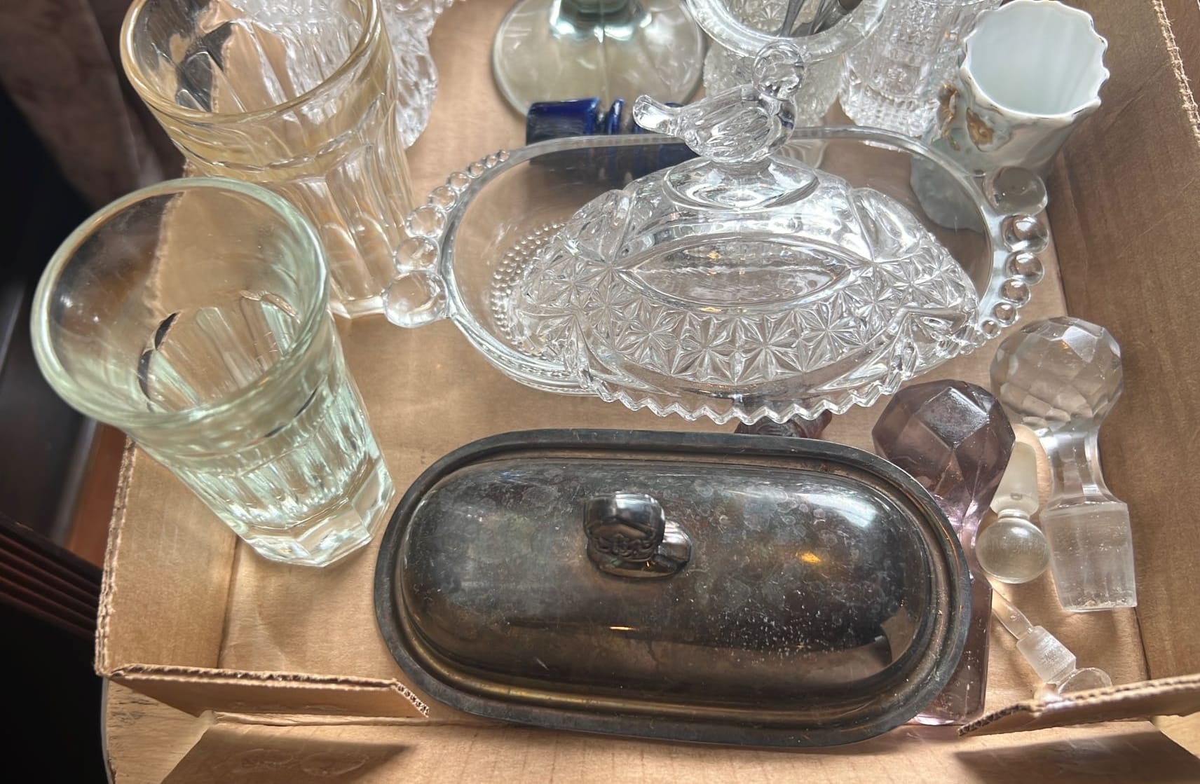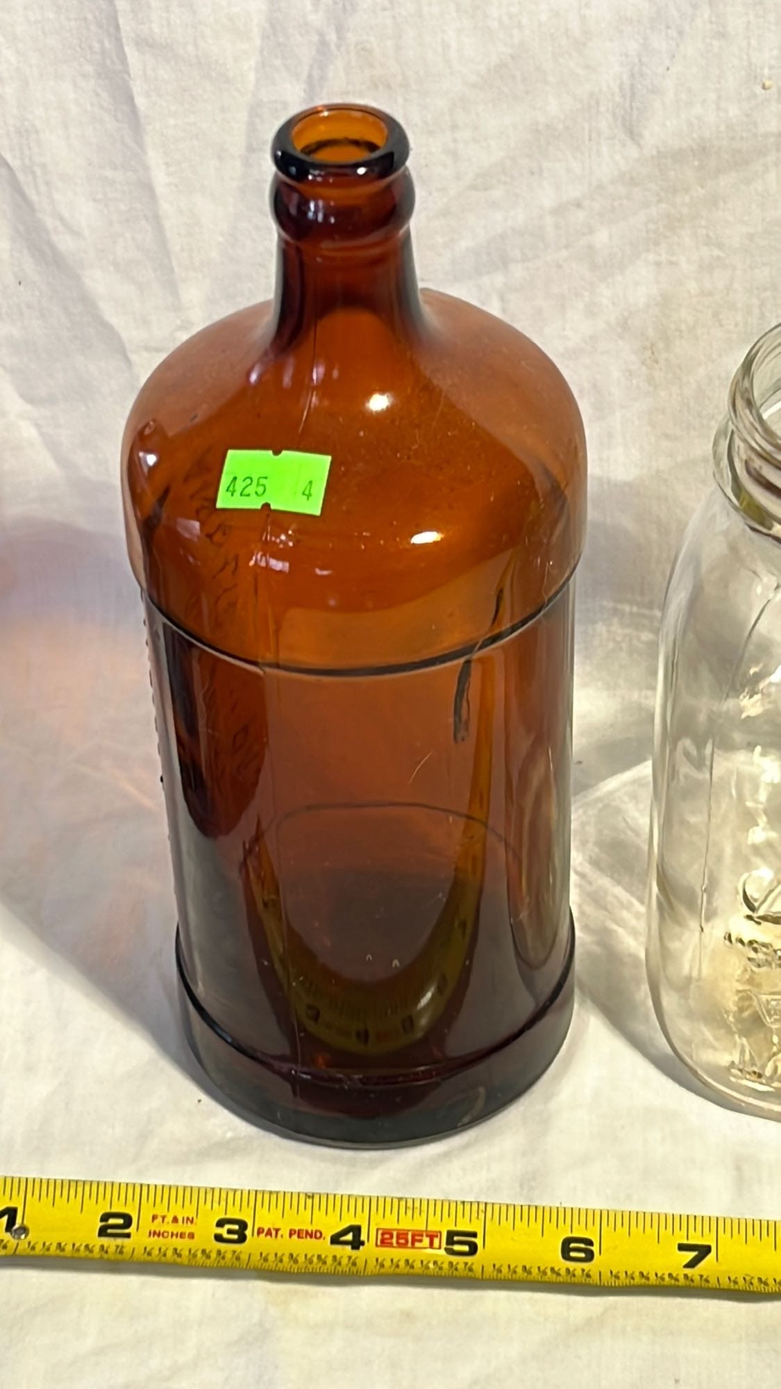 106 Gibson Blue Glass Lid 2.5” • Clear Ball No. 10 Lid 2.25” • Vintage Letter Opener • Brown Funeral Home Thermometer Advertisement 6.5” • Peacock Feathers 16”