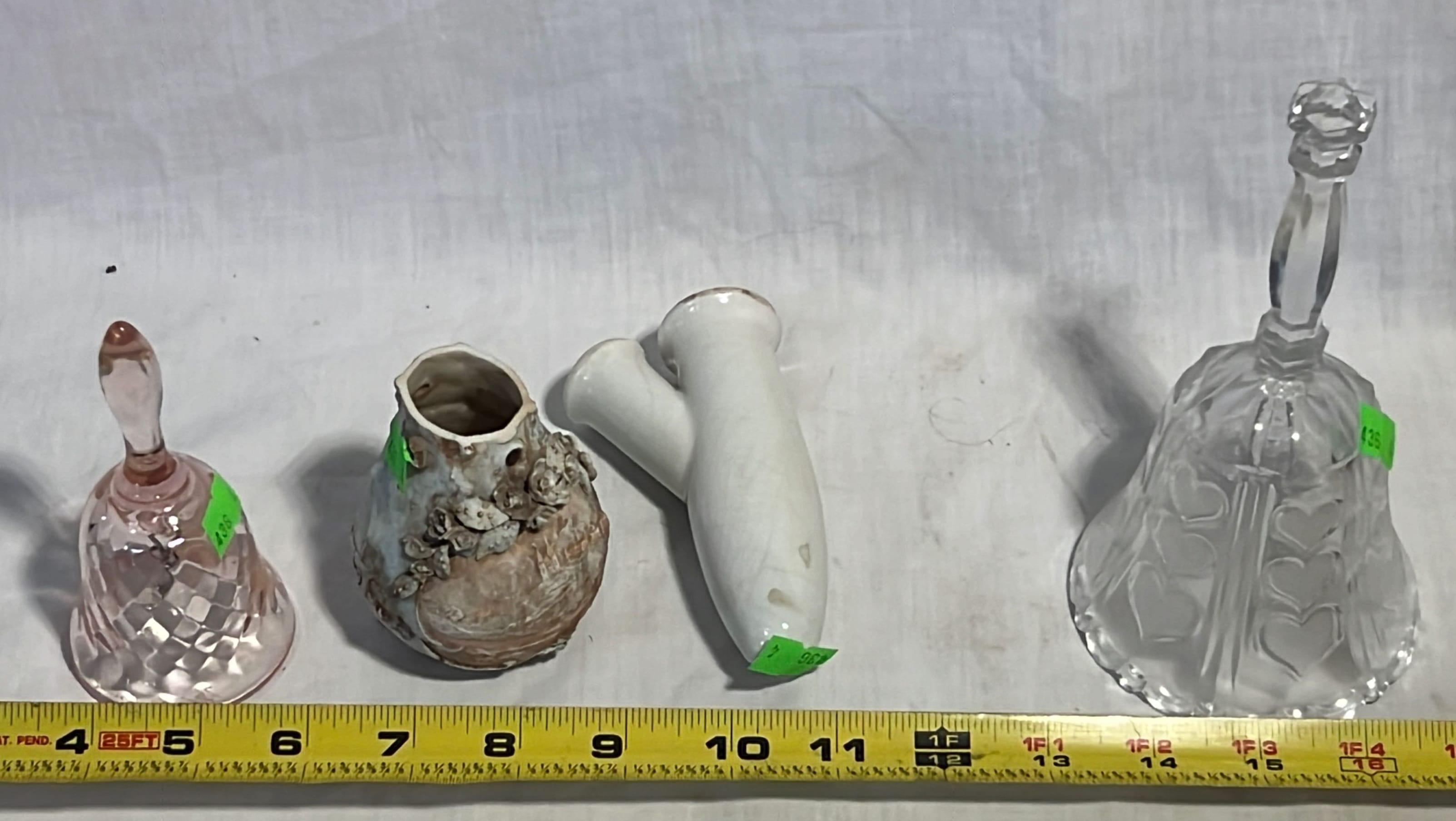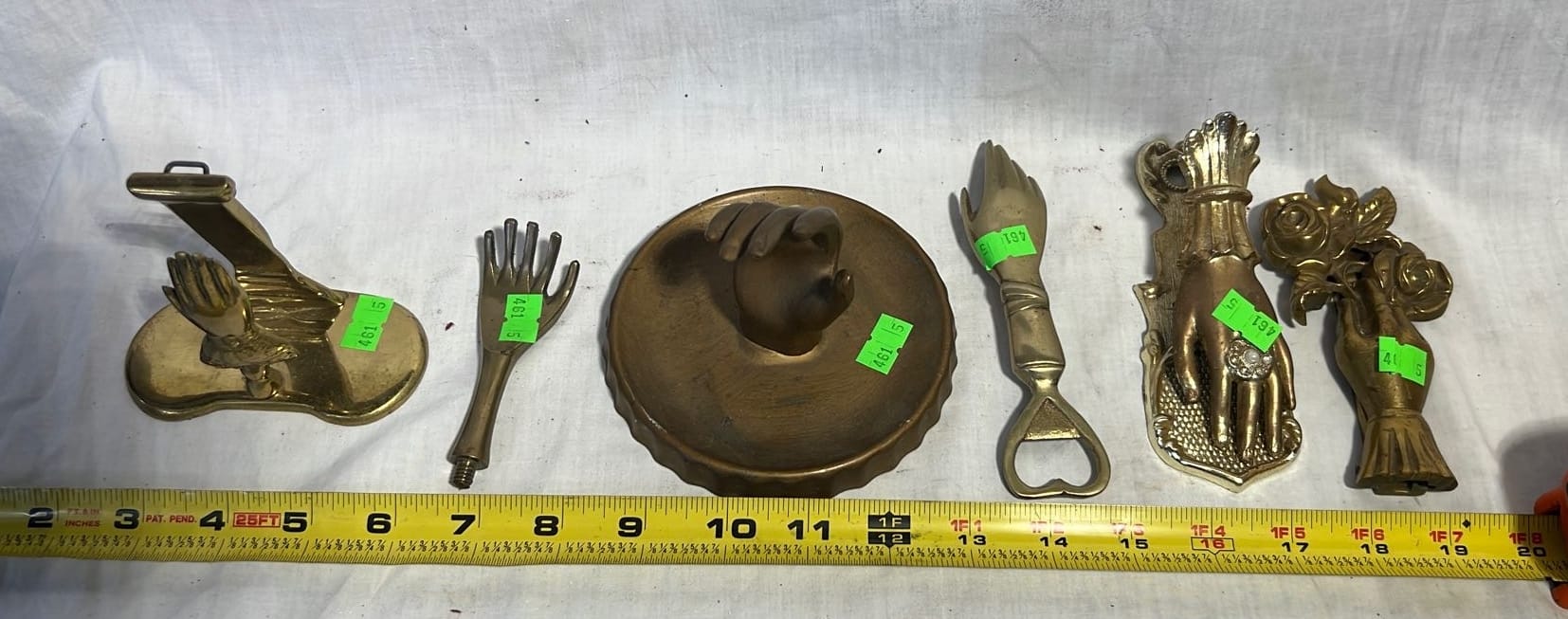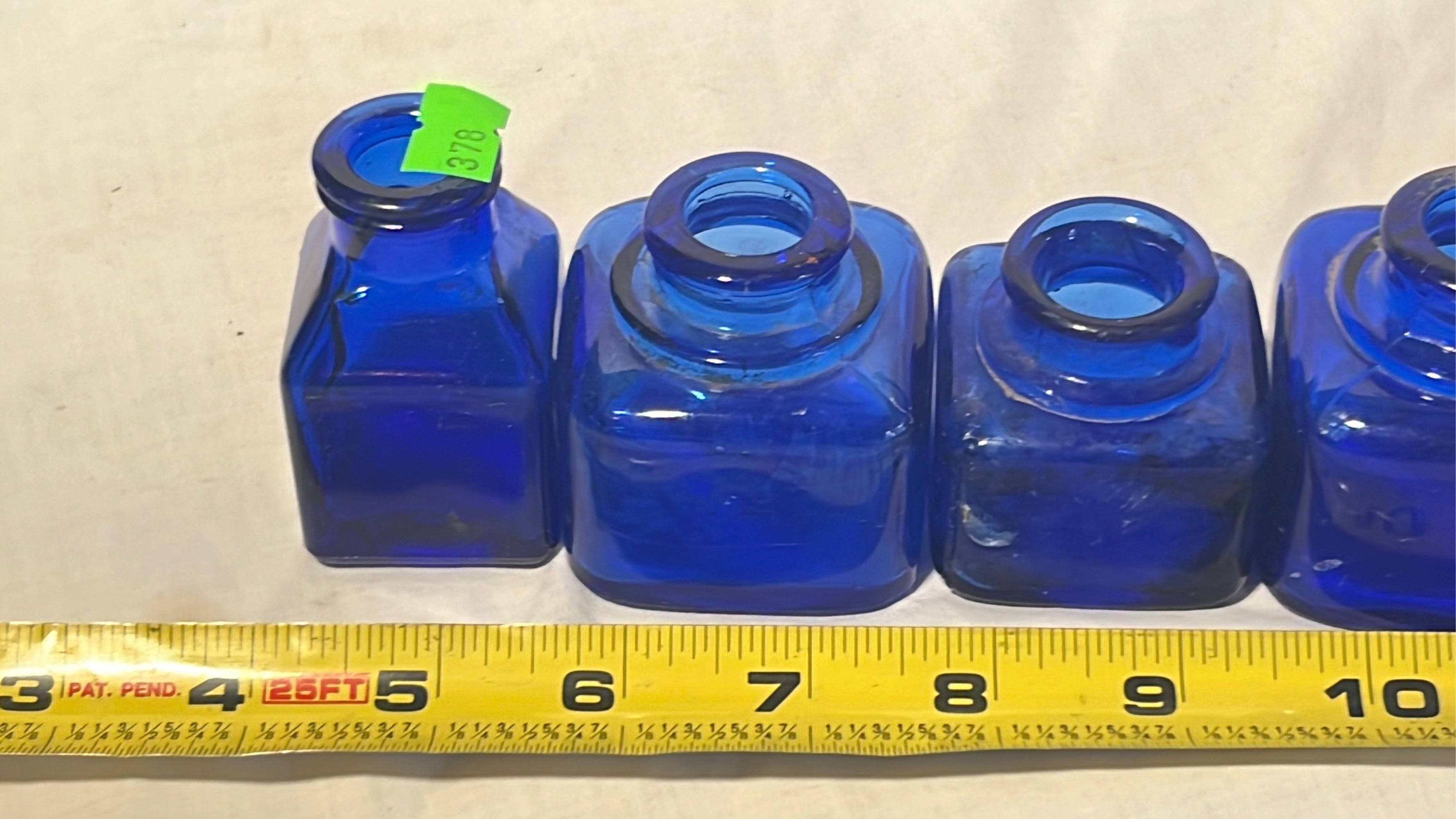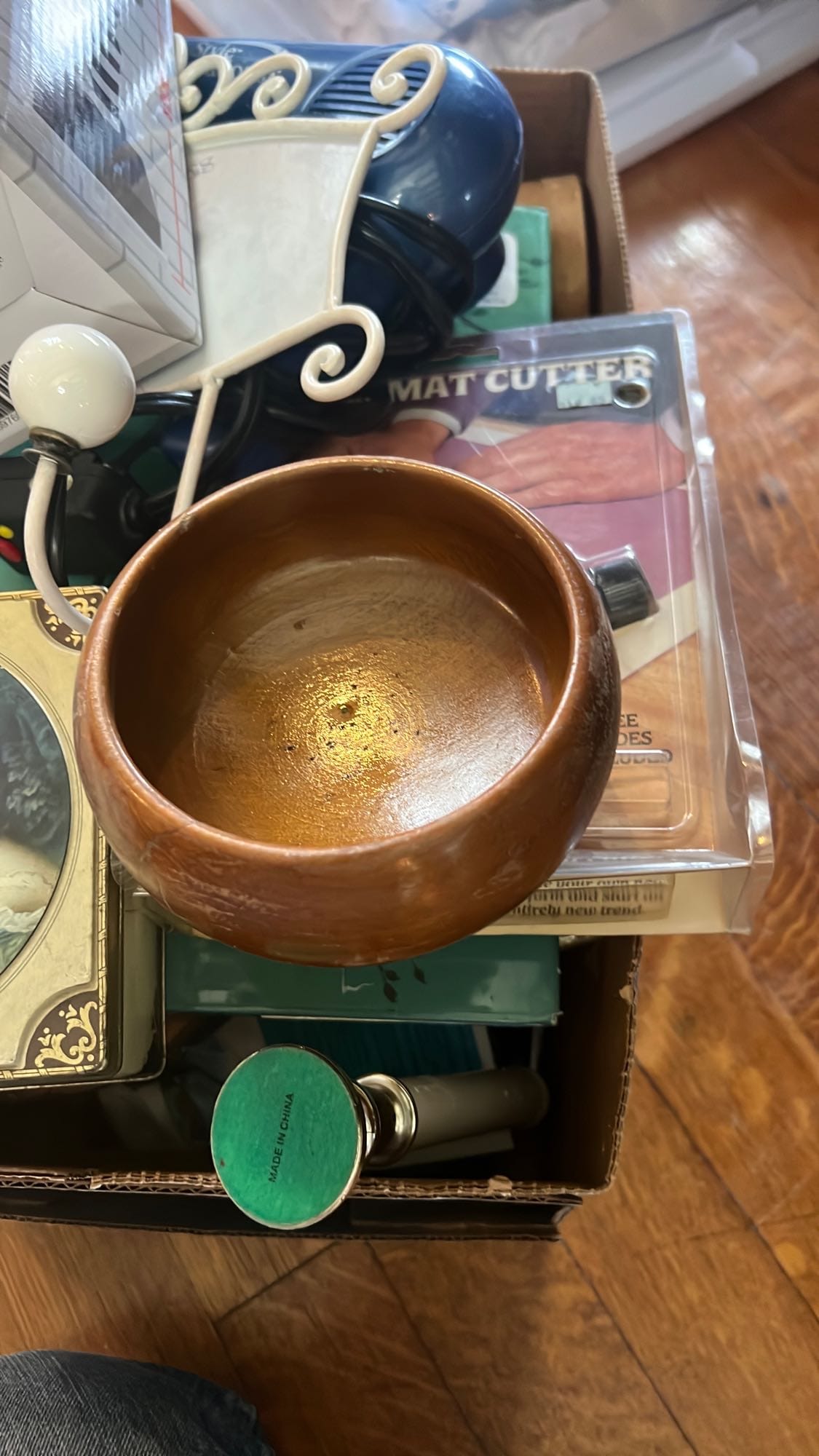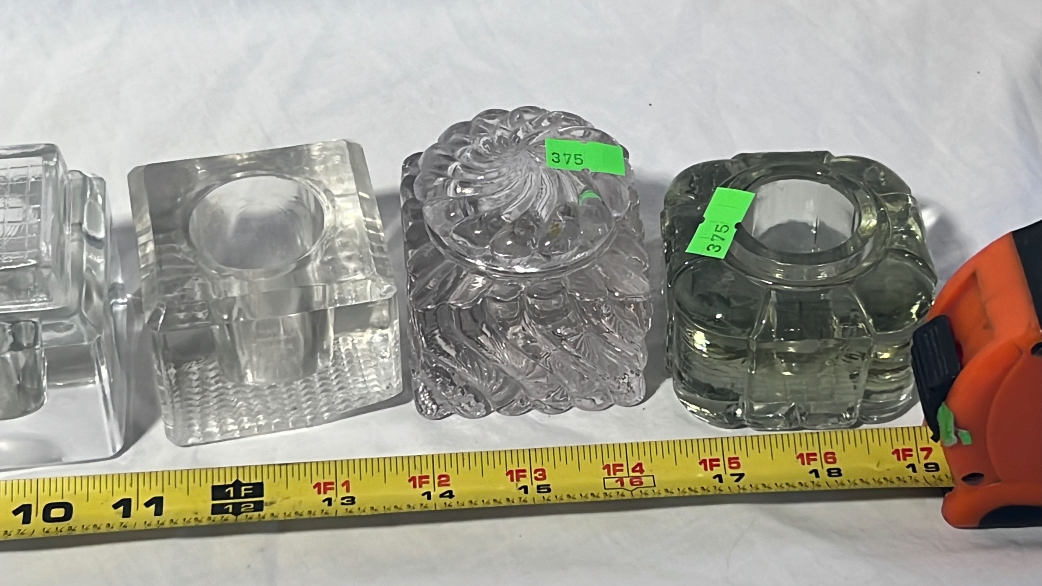 106 Gibson Blue Glass Lid 2.5” • Clear Ball No. 10 Lid 2.25” • Vintage Letter Opener • Brown Funeral Home Thermometer Advertisement 6.5” • Peacock Feathers 16”
